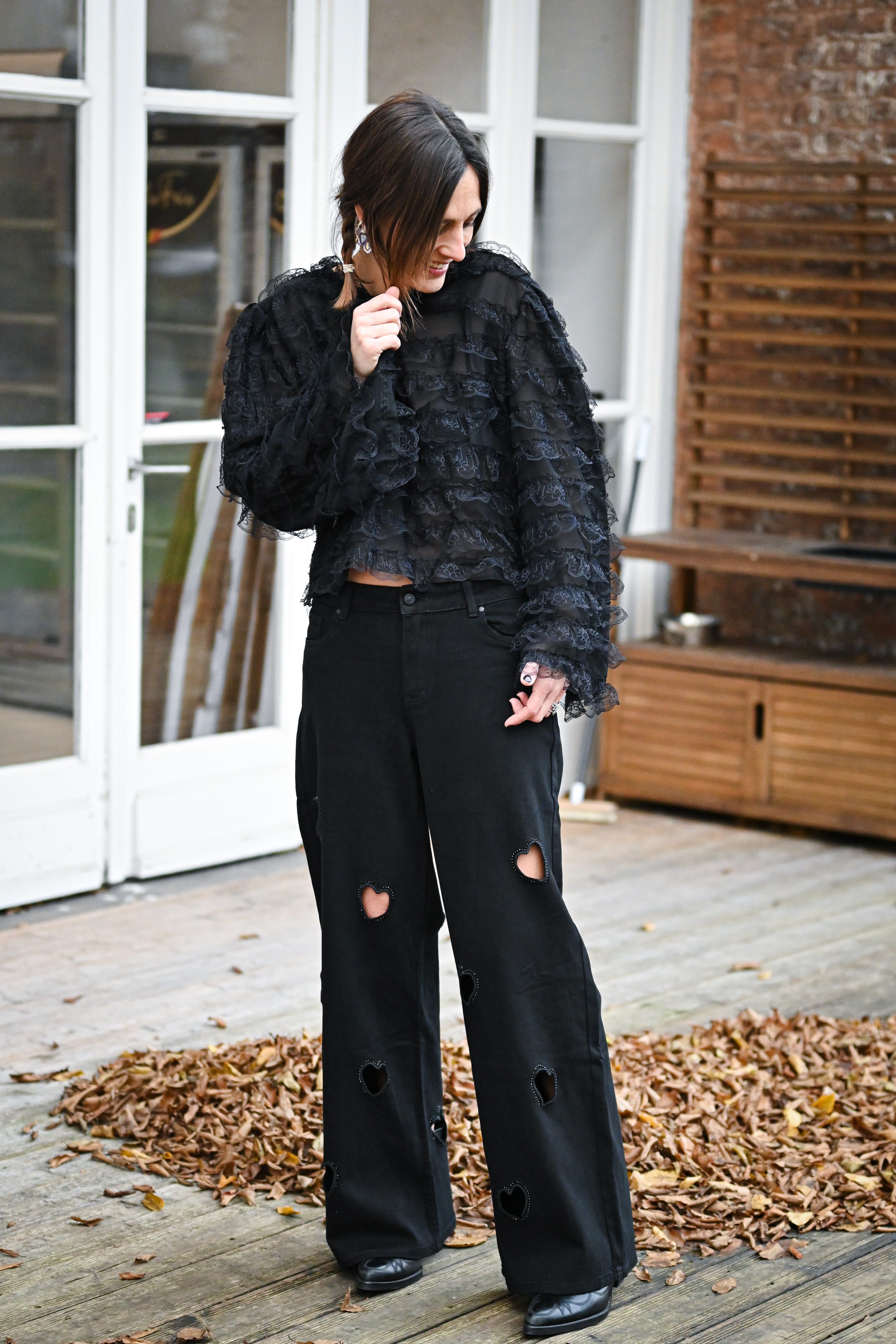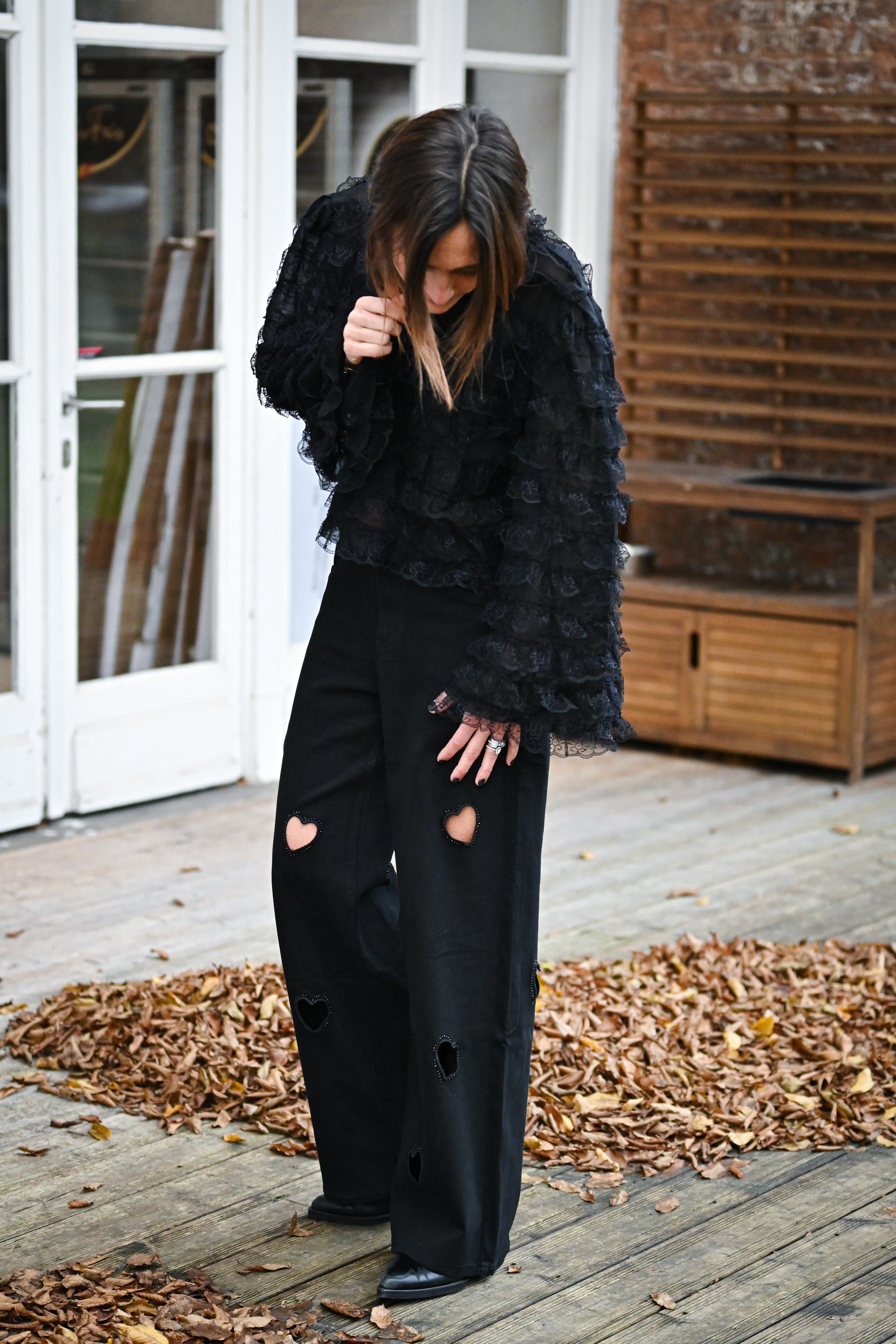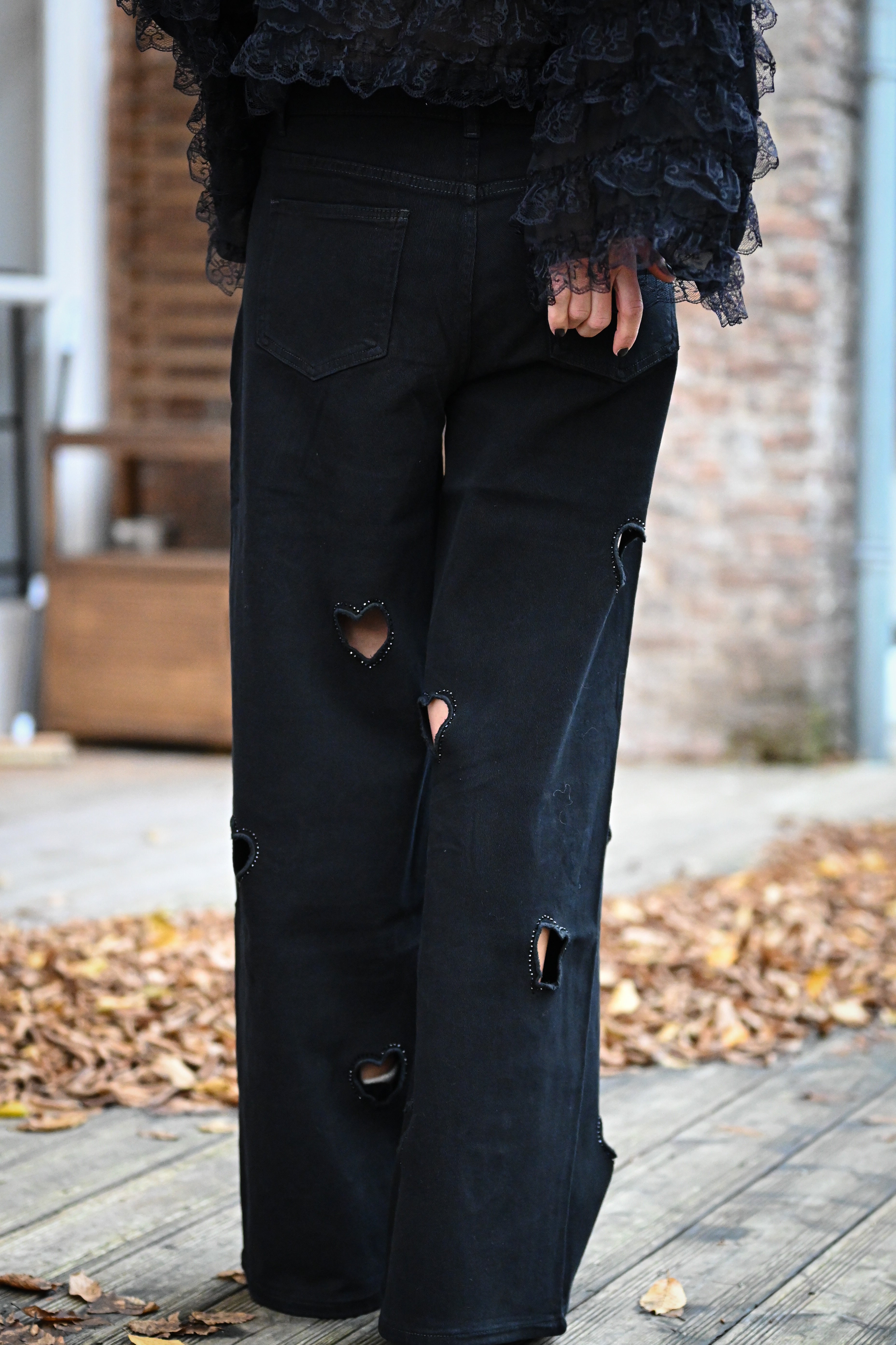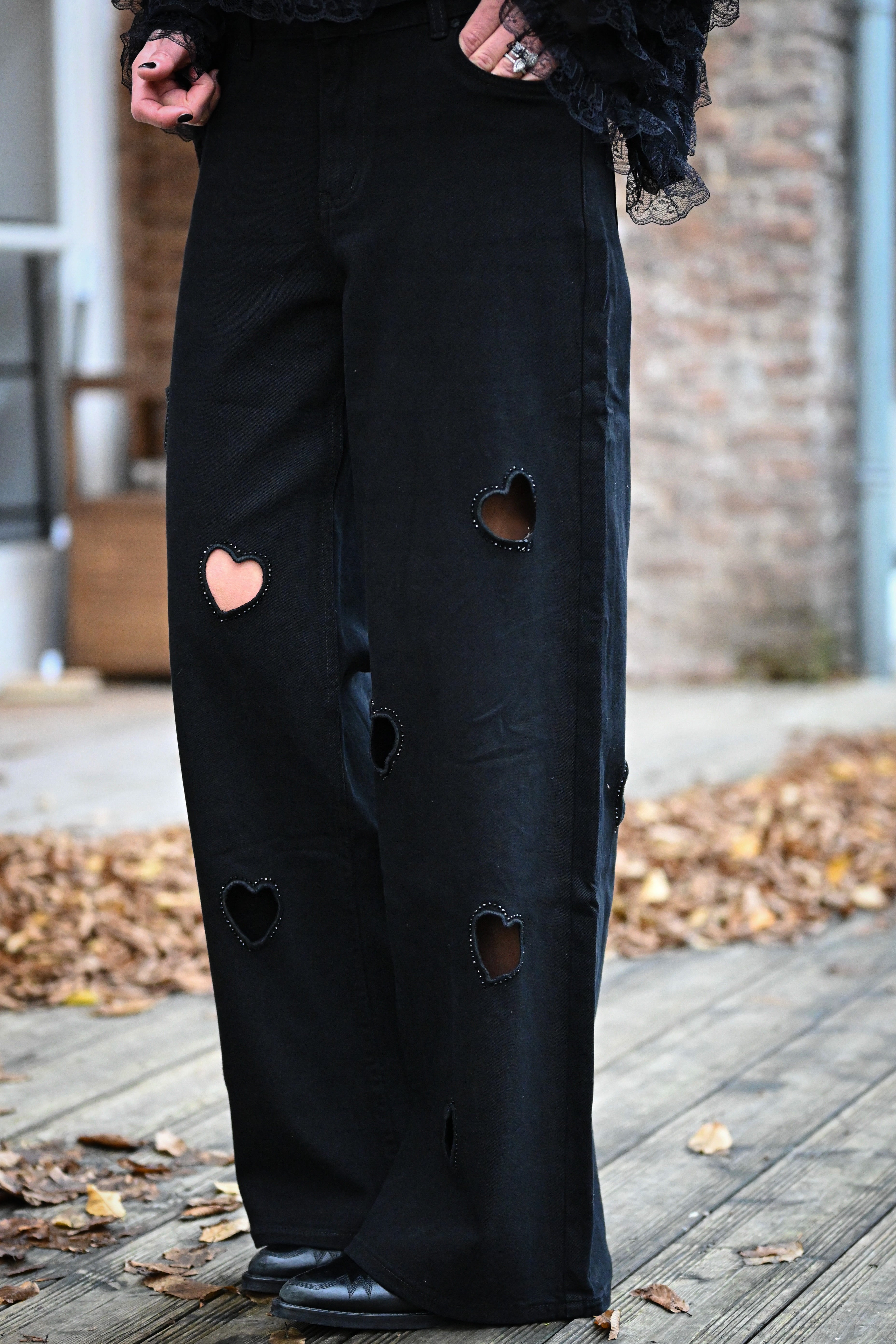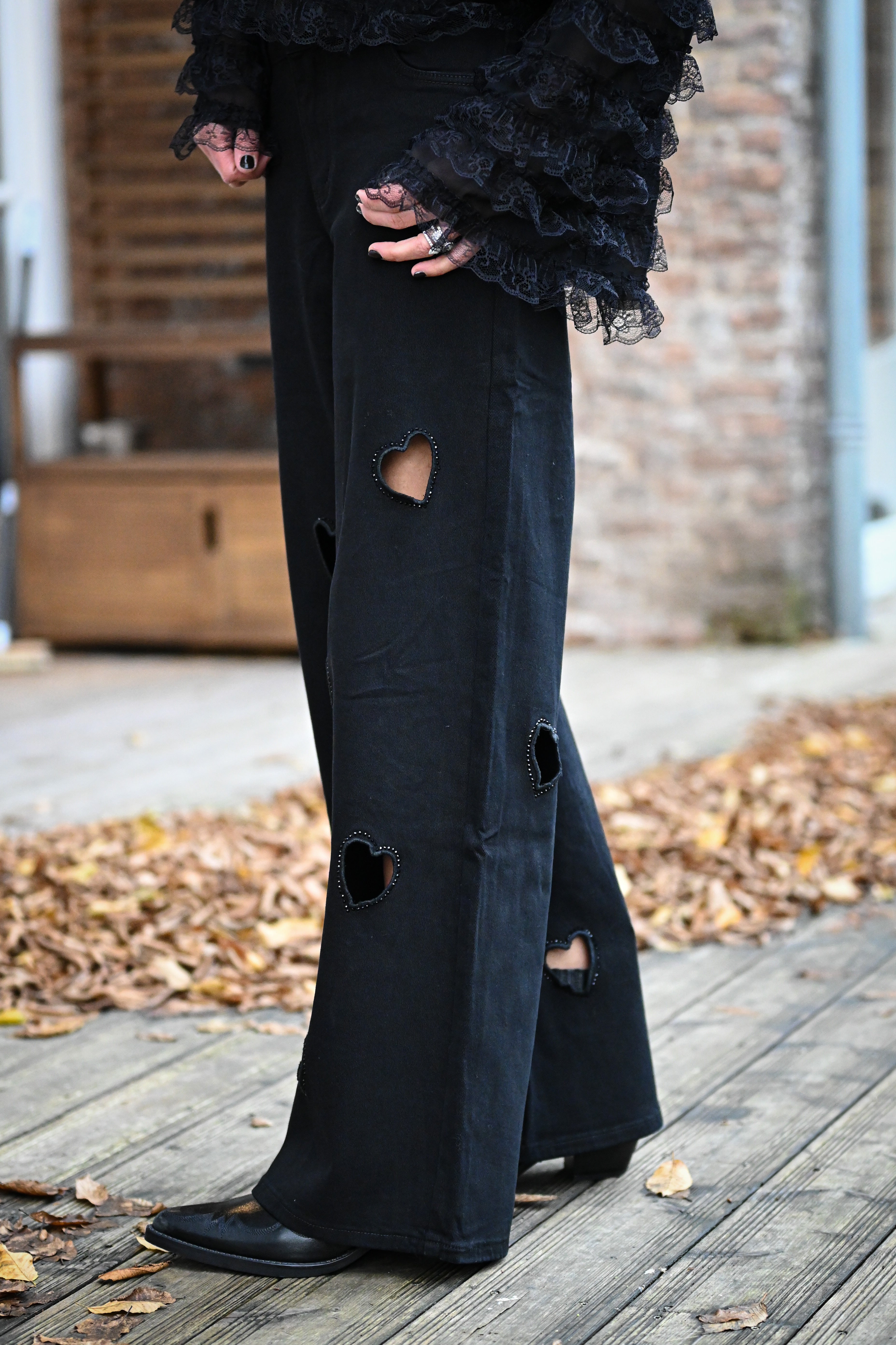 Découvrez le charme du denim avec ces jeans noirs au style unique. Orné de délicats trous en forme de cœurs, ce modèle allie tendance et originalité. Coupe droite et généreuse pour un confort optimal et une silhouette flatteuse. Un incontournable pour celles qui osent l'audace avec élégance.