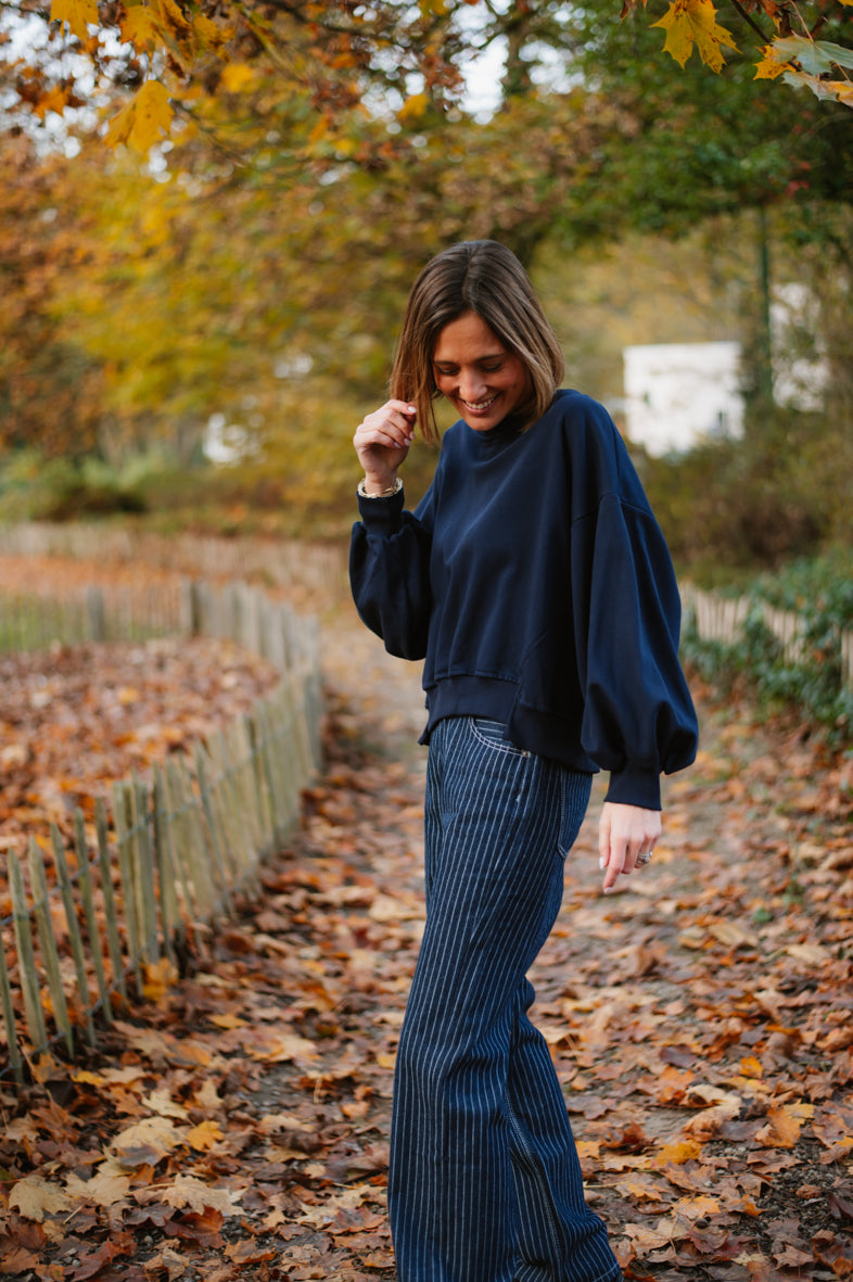 Jeans bleu brut à lignes. Taille haute, et coupe plutôt droite. Il est disponible de la taille 34 à la taille 42. Le mannequin mesure 1m57 et porte la taille 36.