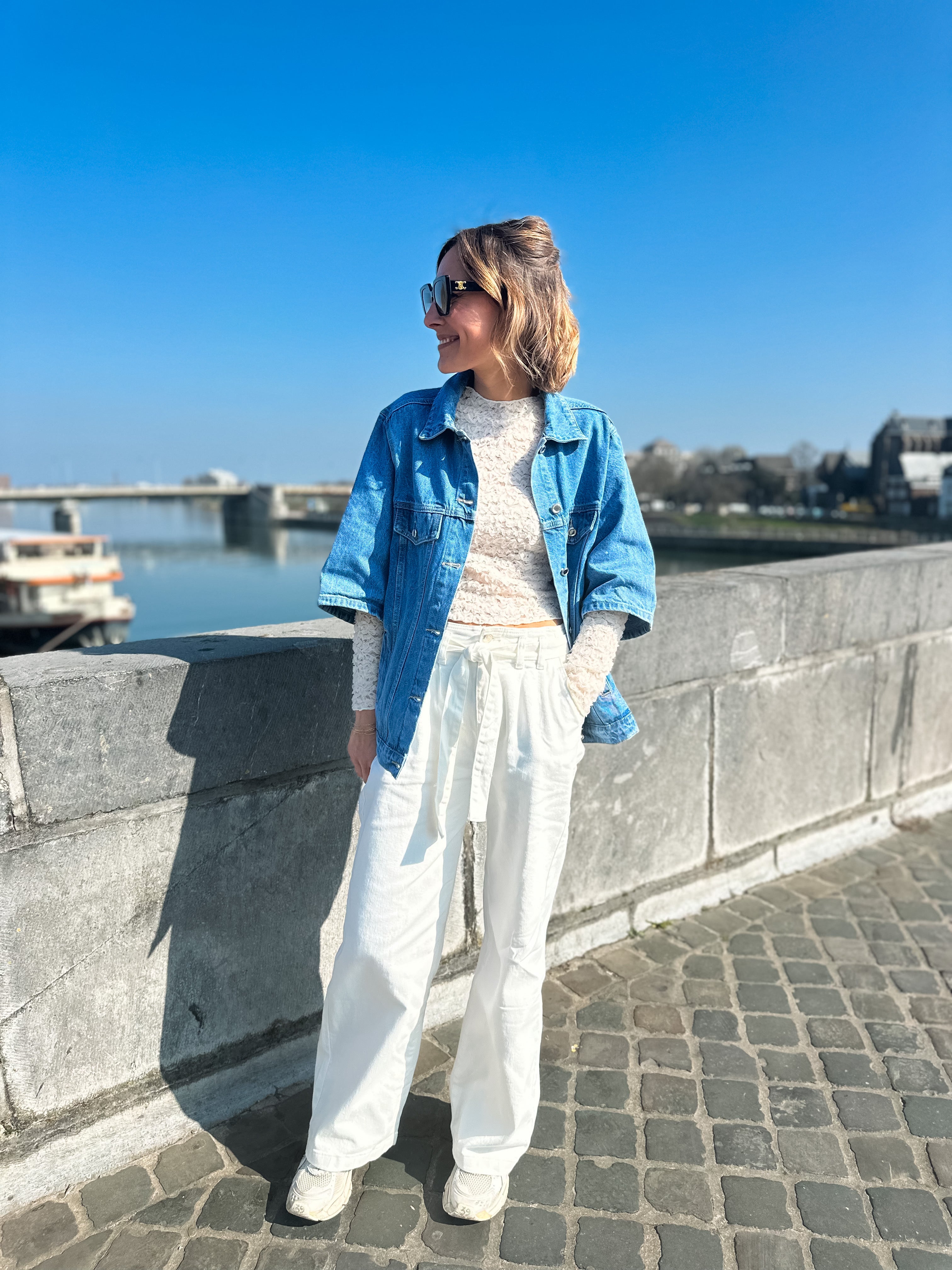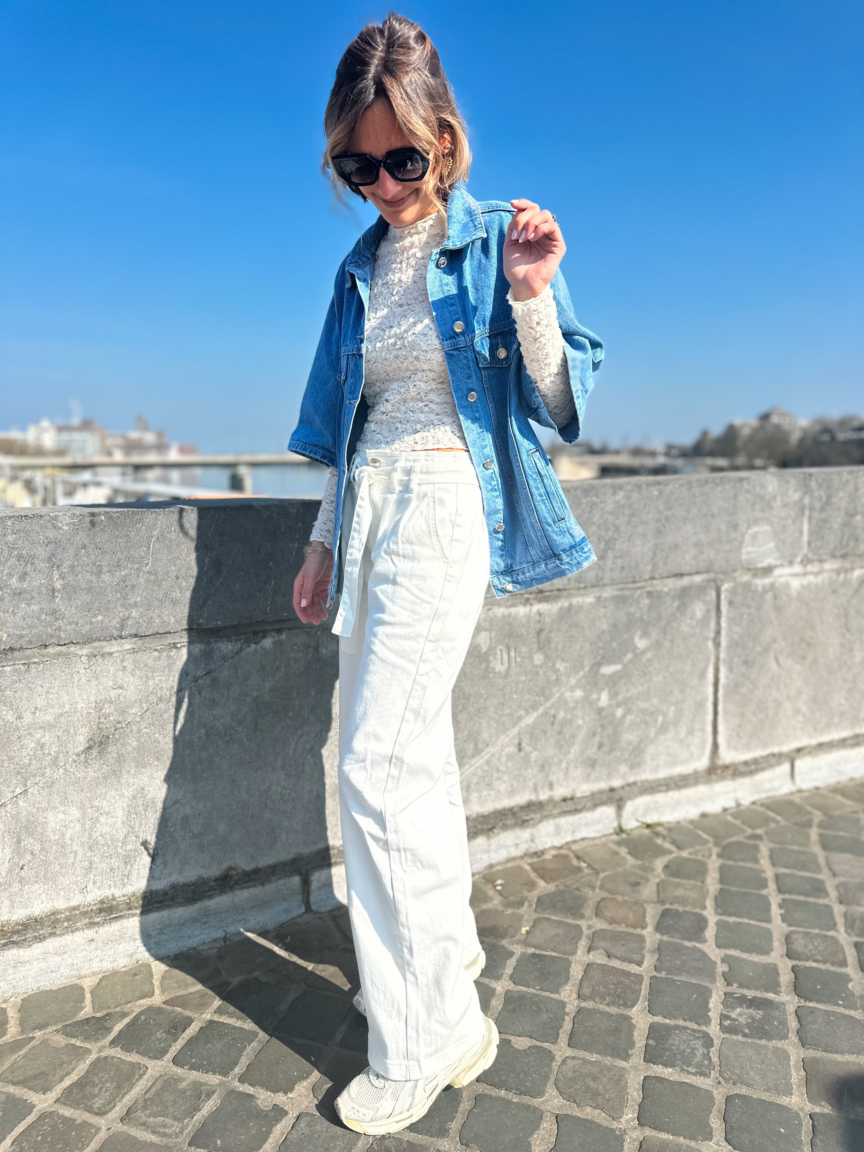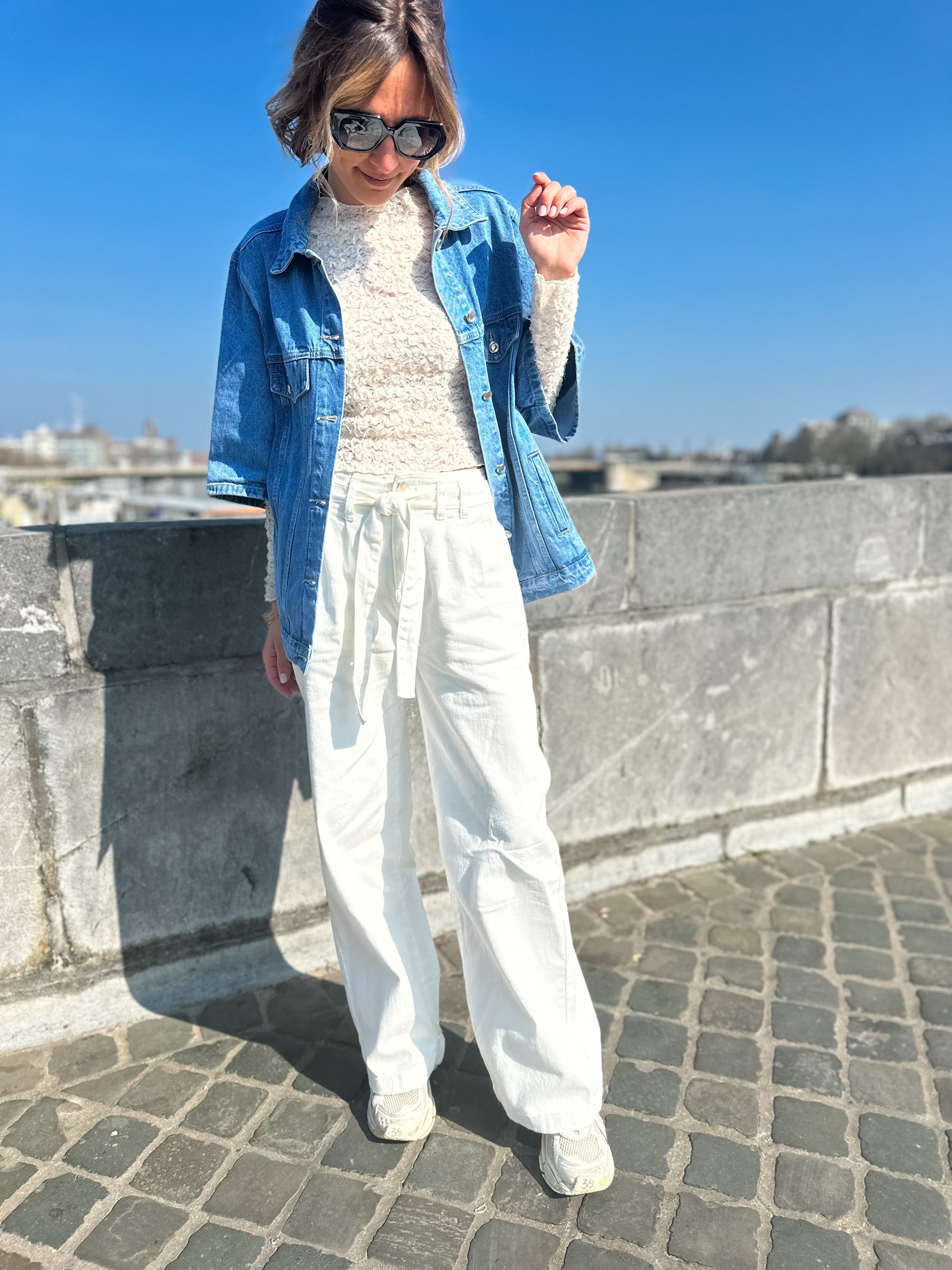 Jeans blanc taille haute, avec une ceinture. Jambe légèrement large, il est disponible de la taille S à la taille L.