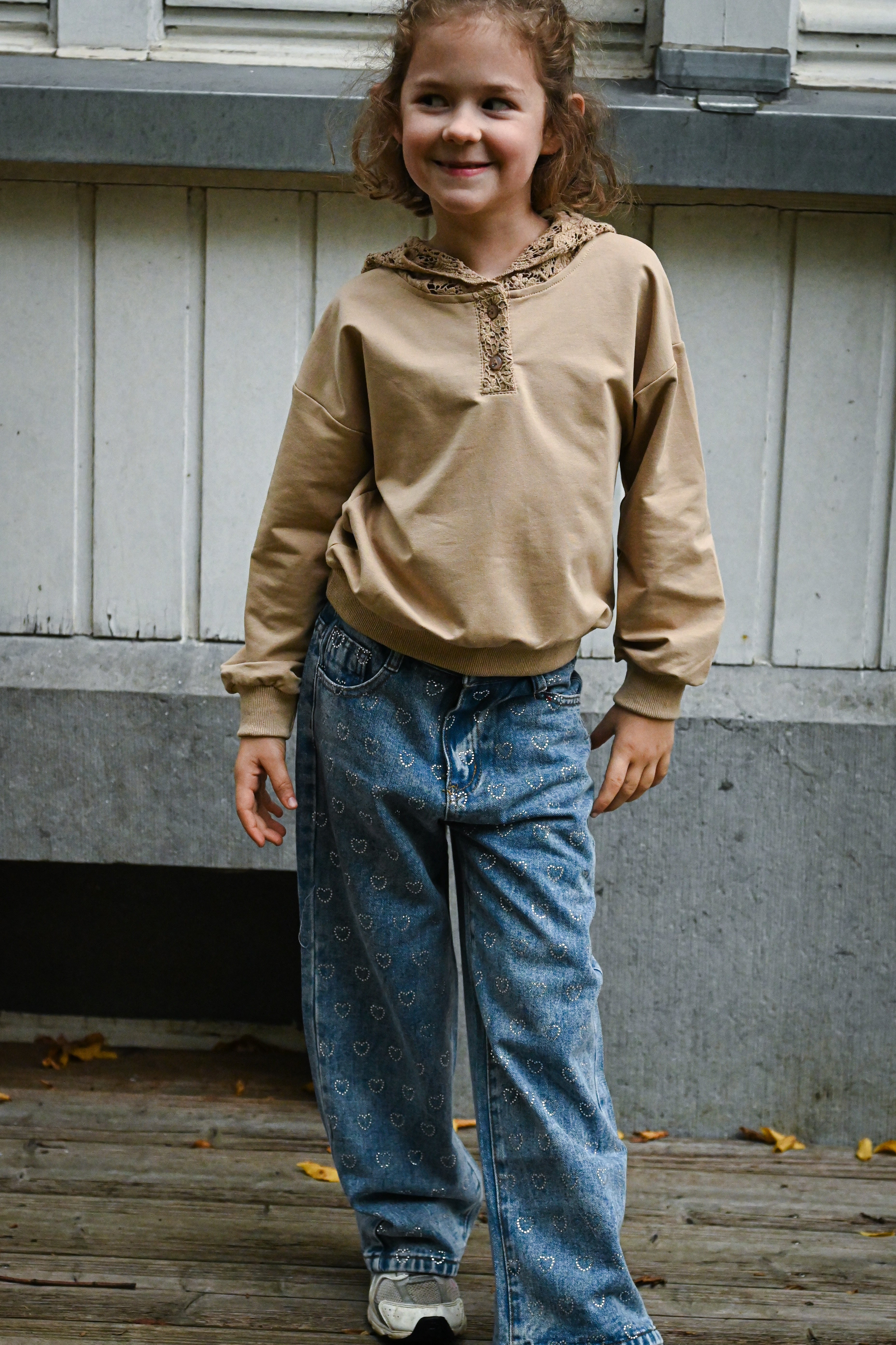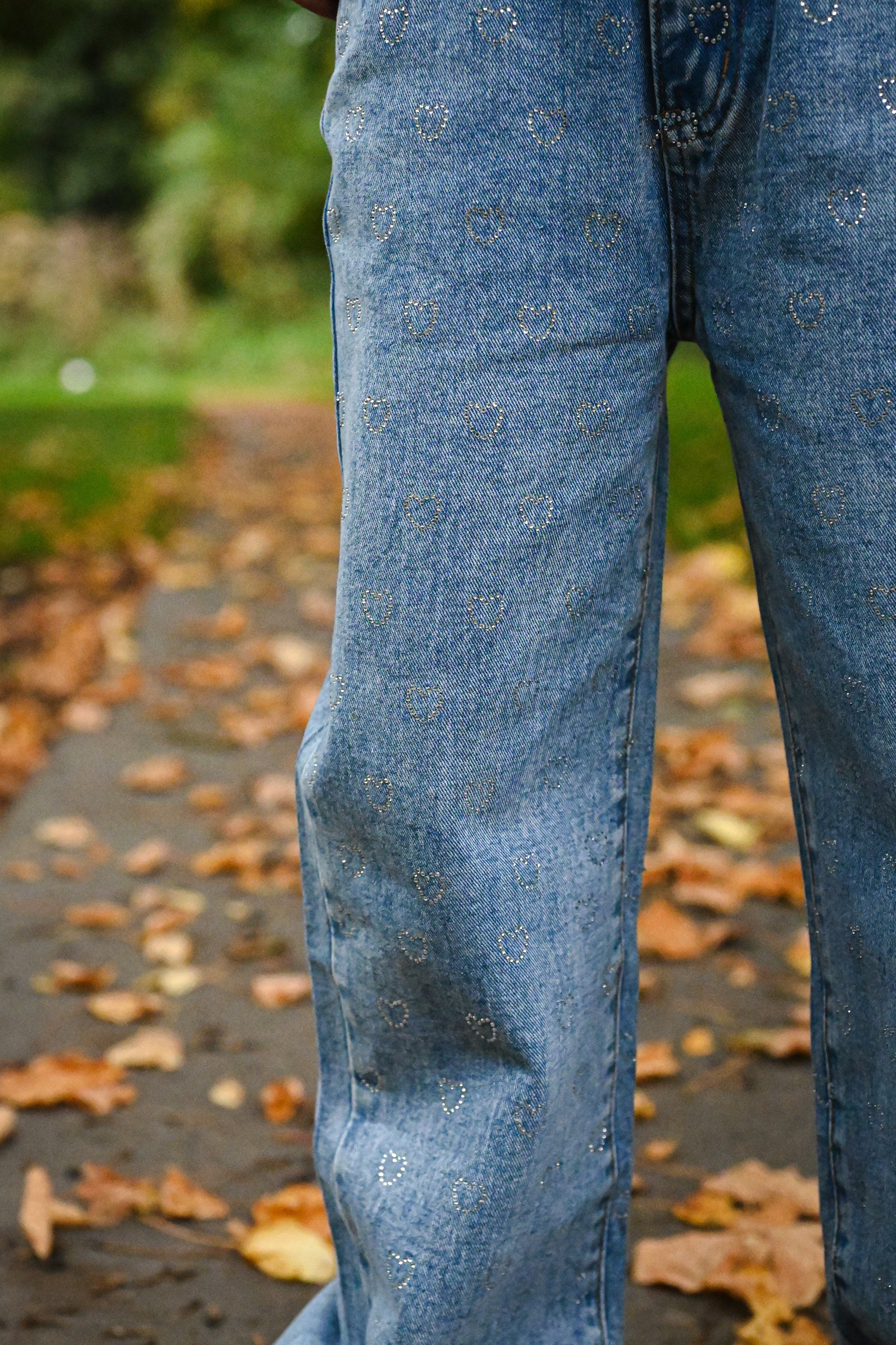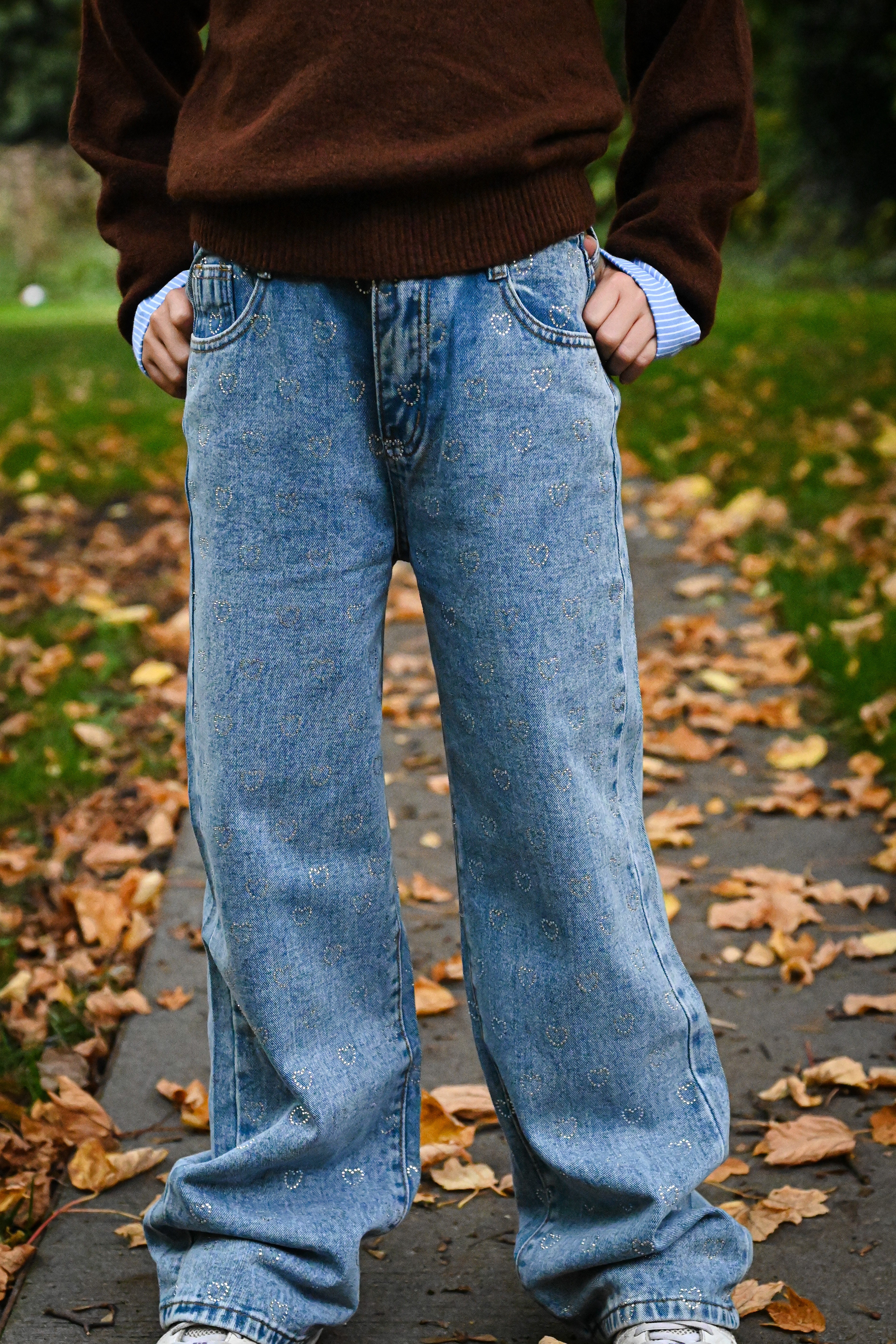 Ce jeans mini bleu est orné de petits cœurs en strass sur toute la partie avant, ajoutant une touche délicate et brillante. Sa coupe droite assure un style classique et confortable à porter. Le jeans est disponible de la taille 4 ans à la taille 14 ans.