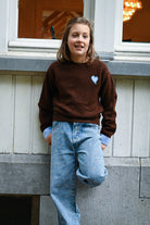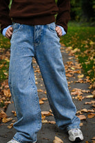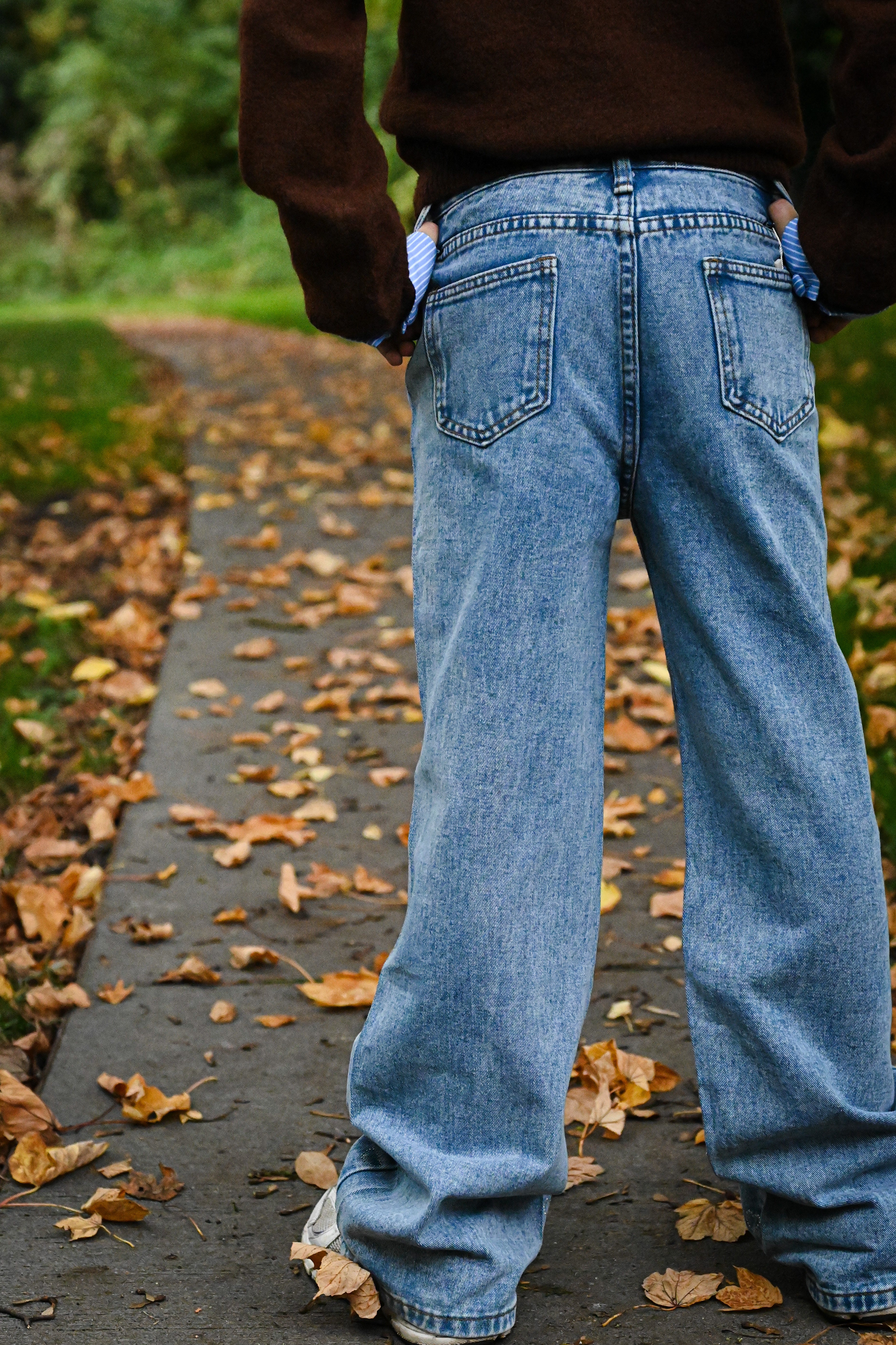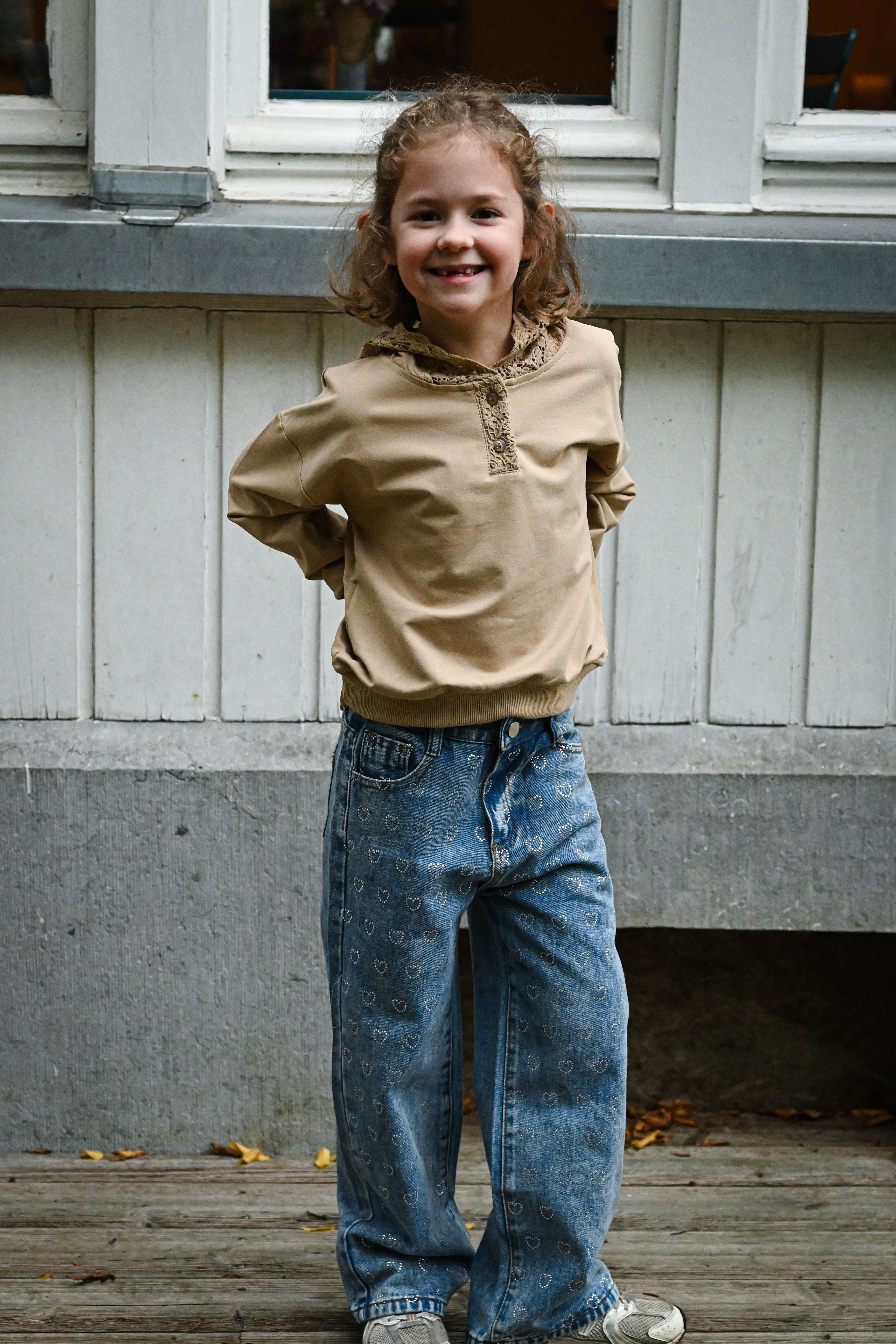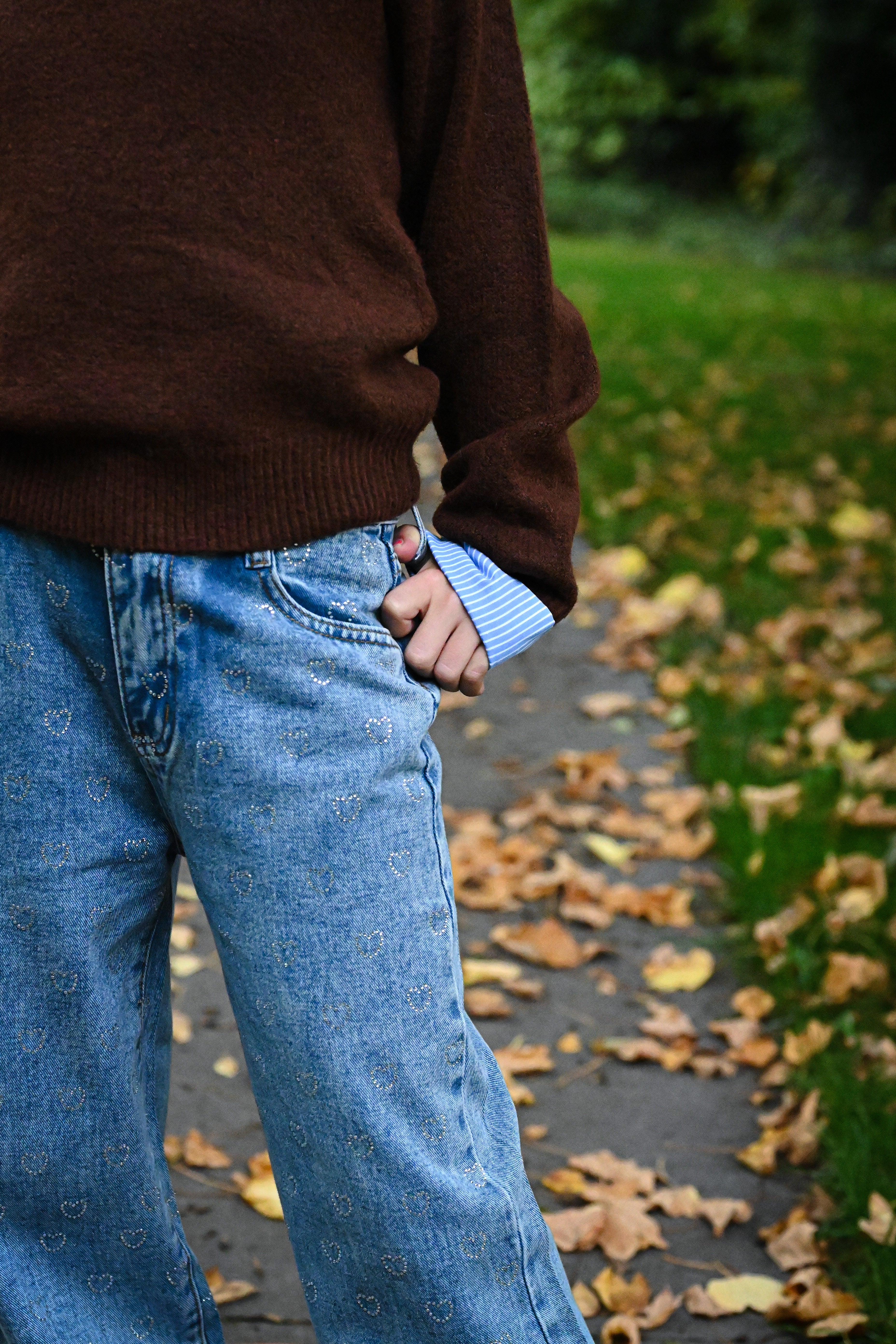 Ce jeans mini bleu est orné de petits cœurs en strass sur toute la partie avant, ajoutant une touche délicate et brillante. Sa coupe droite assure un style classique et confortable à porter. Le jeans est disponible de la taille 4 ans à la taille 14 ans.