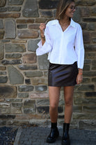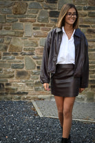 Adoptez l'élégance avec cette jupe courte en simili cuir tressé bordeaux, proposée en tailles S, M et L pour un ajustement parfait.