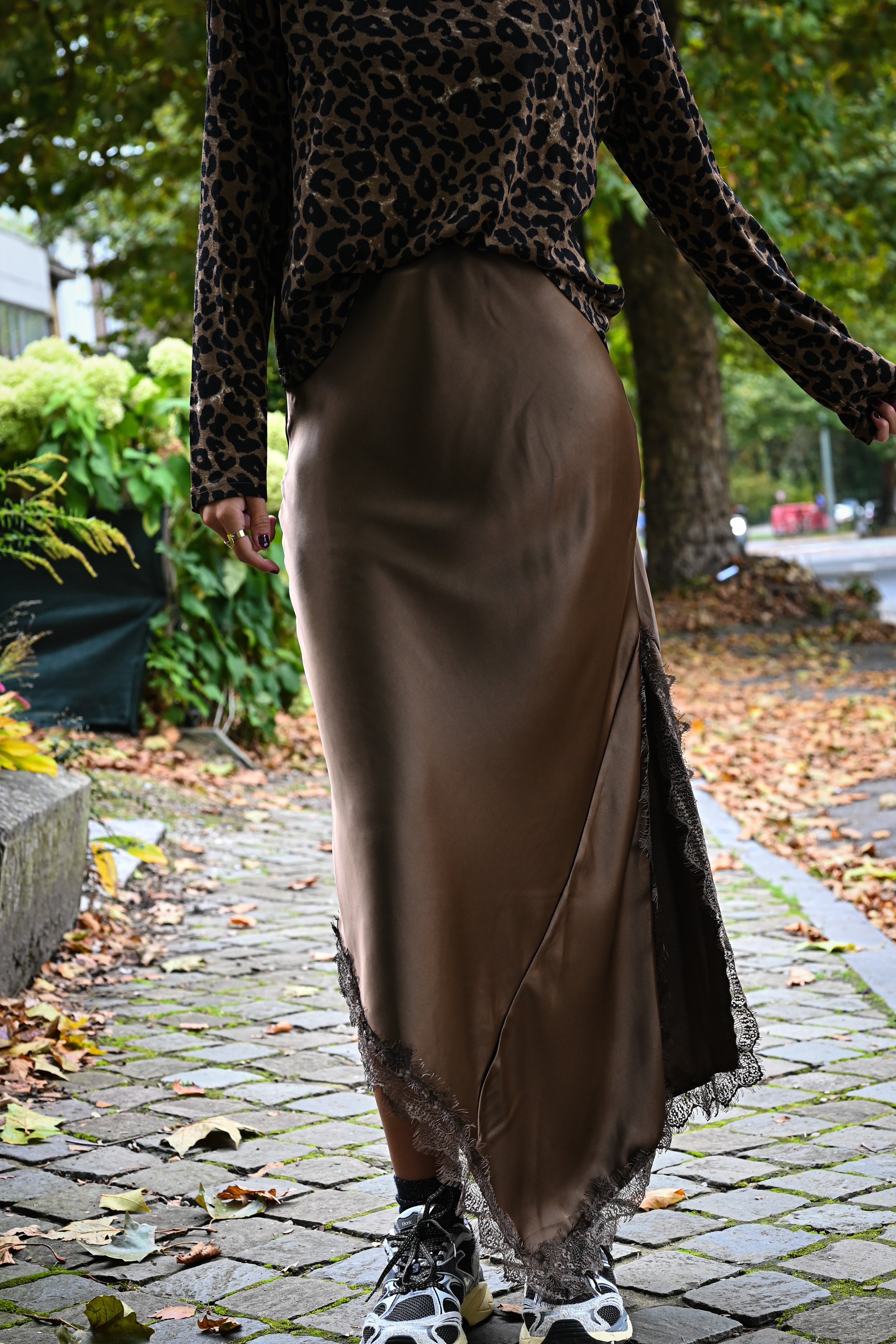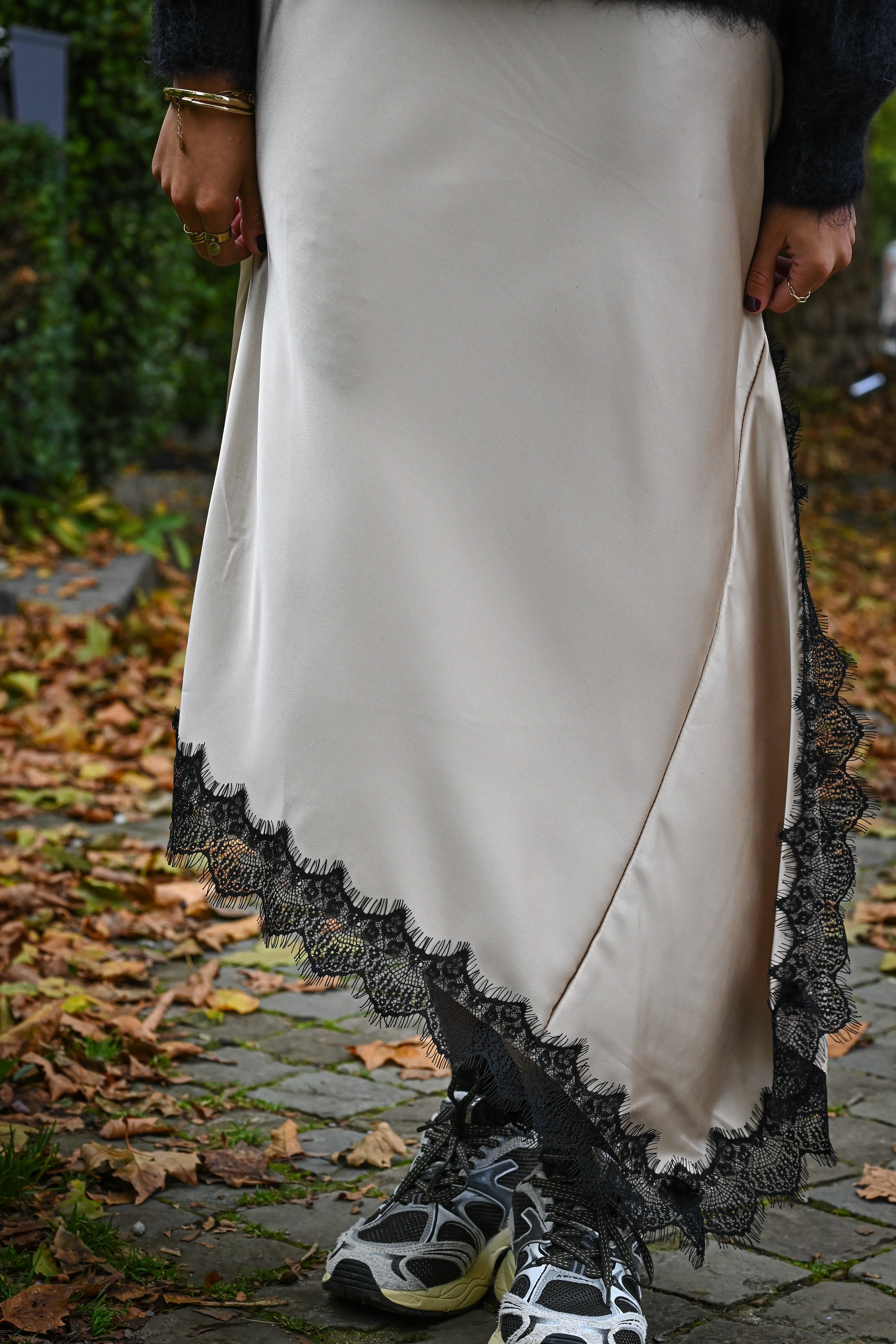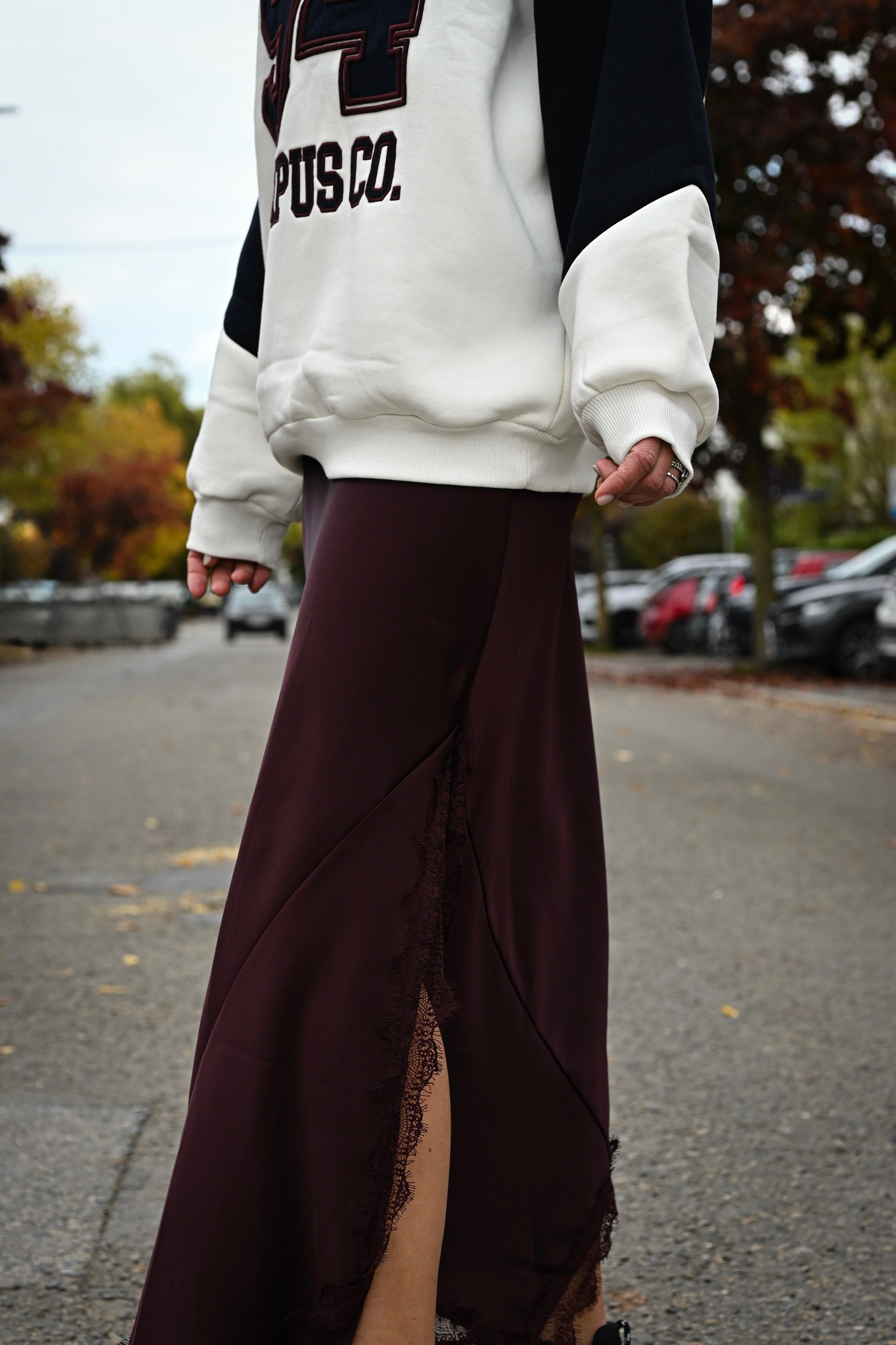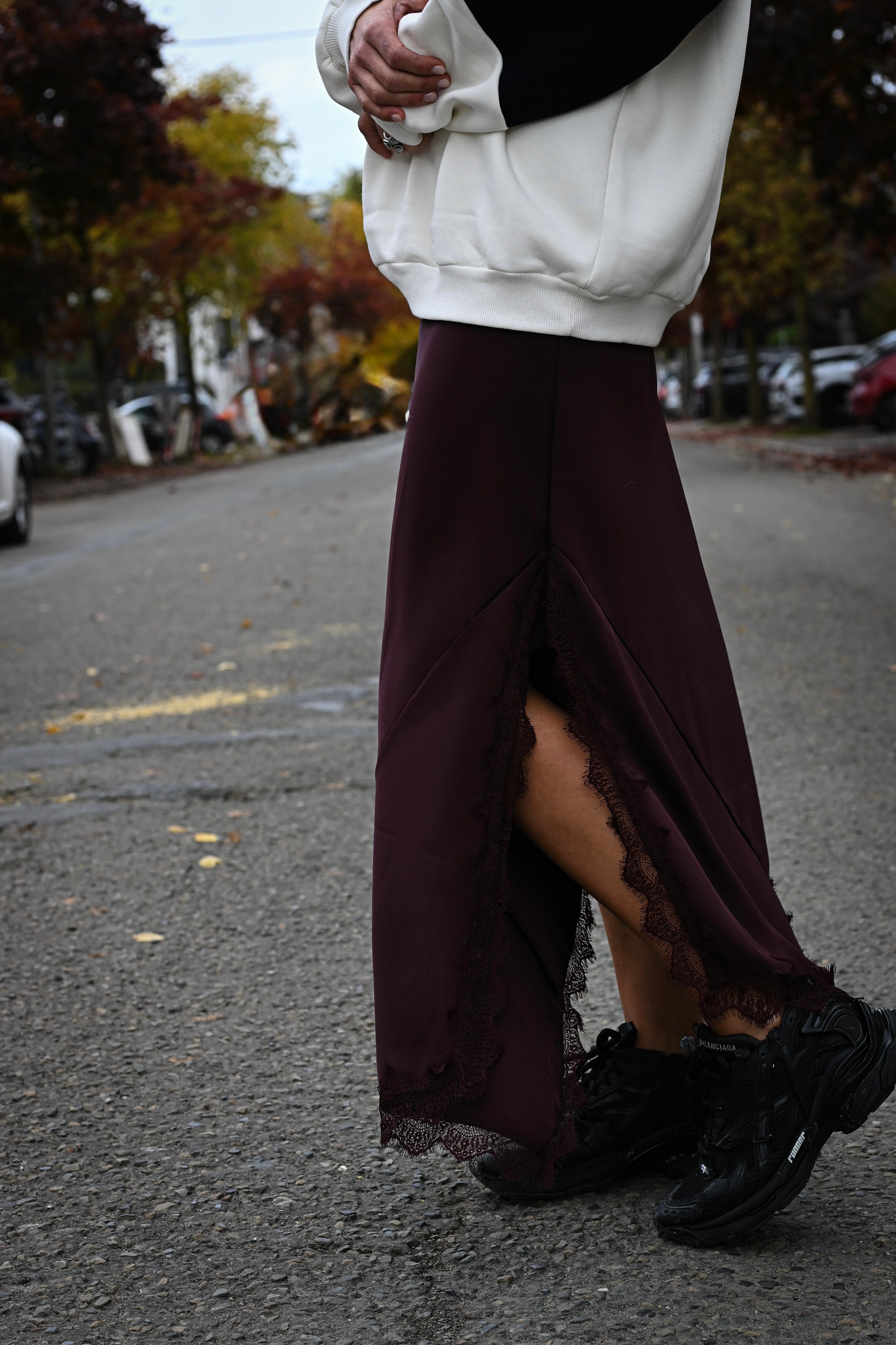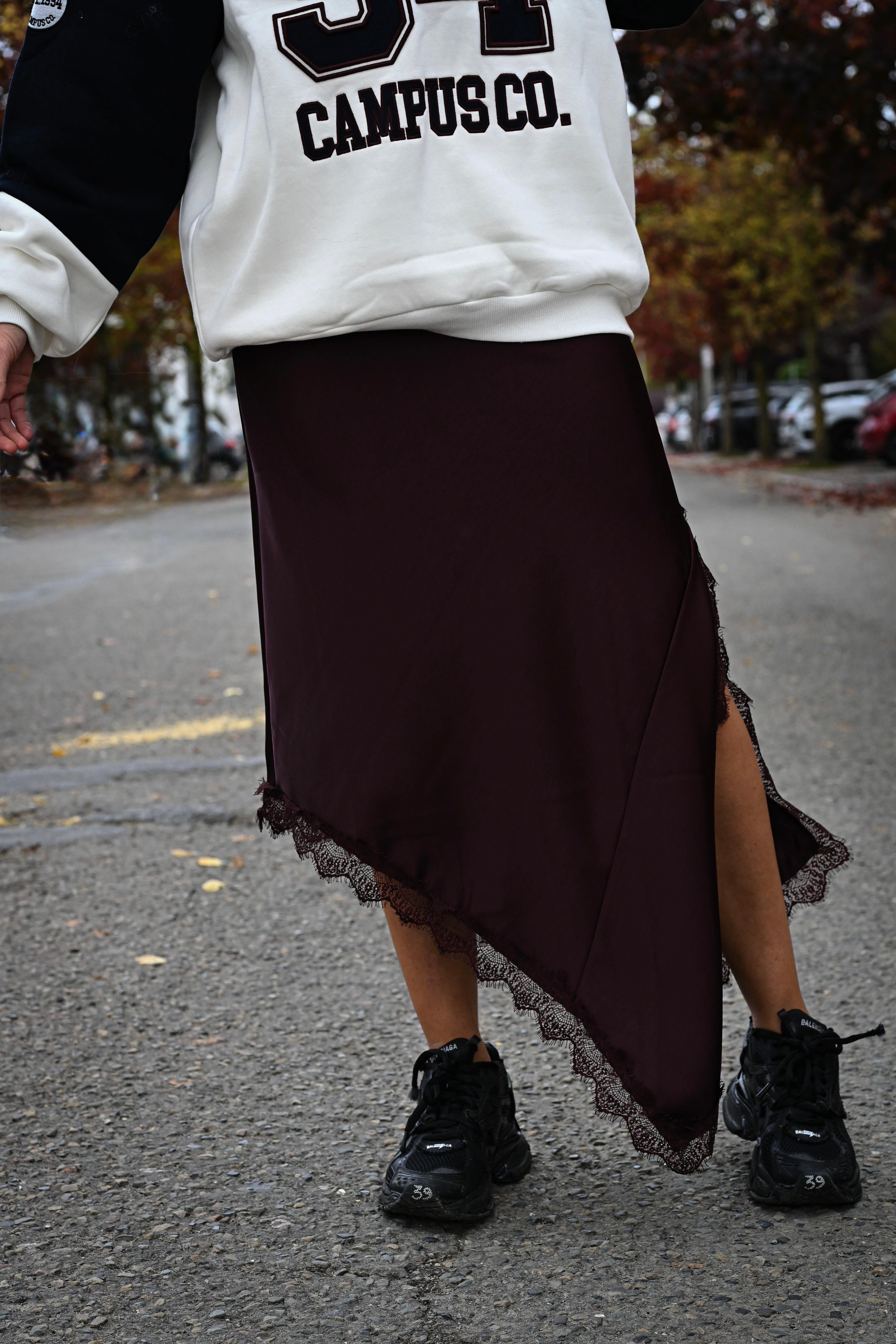 Jupe longue en satin avec une coupe asymétrique élégante, ornée de détails en dentelle. Dotée d’une taille élastiquée, elle s’adapte parfaitement en taille unique. Disponible en beige, chocolat, noir et bordeaux pour une allure raffinée et versatile.