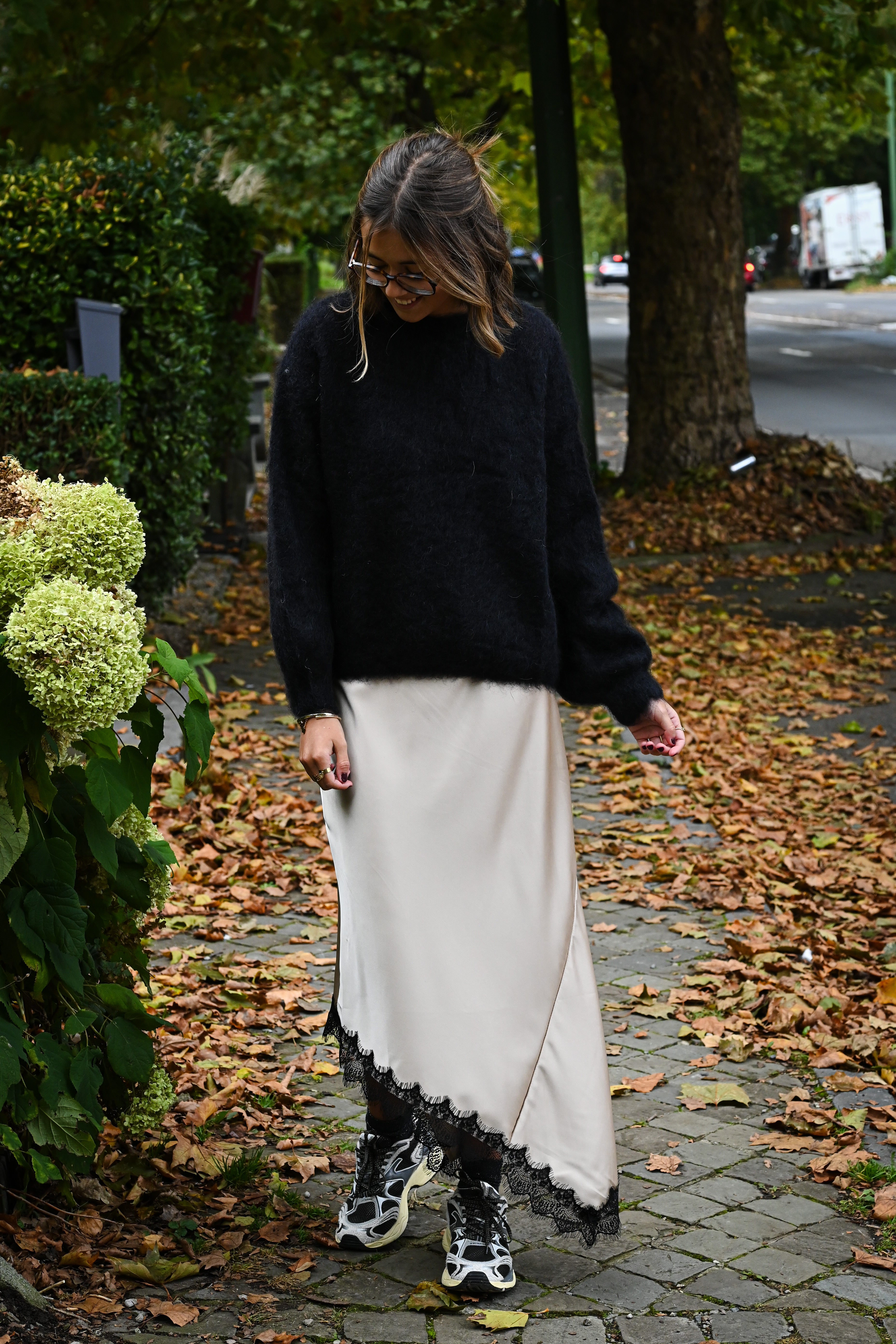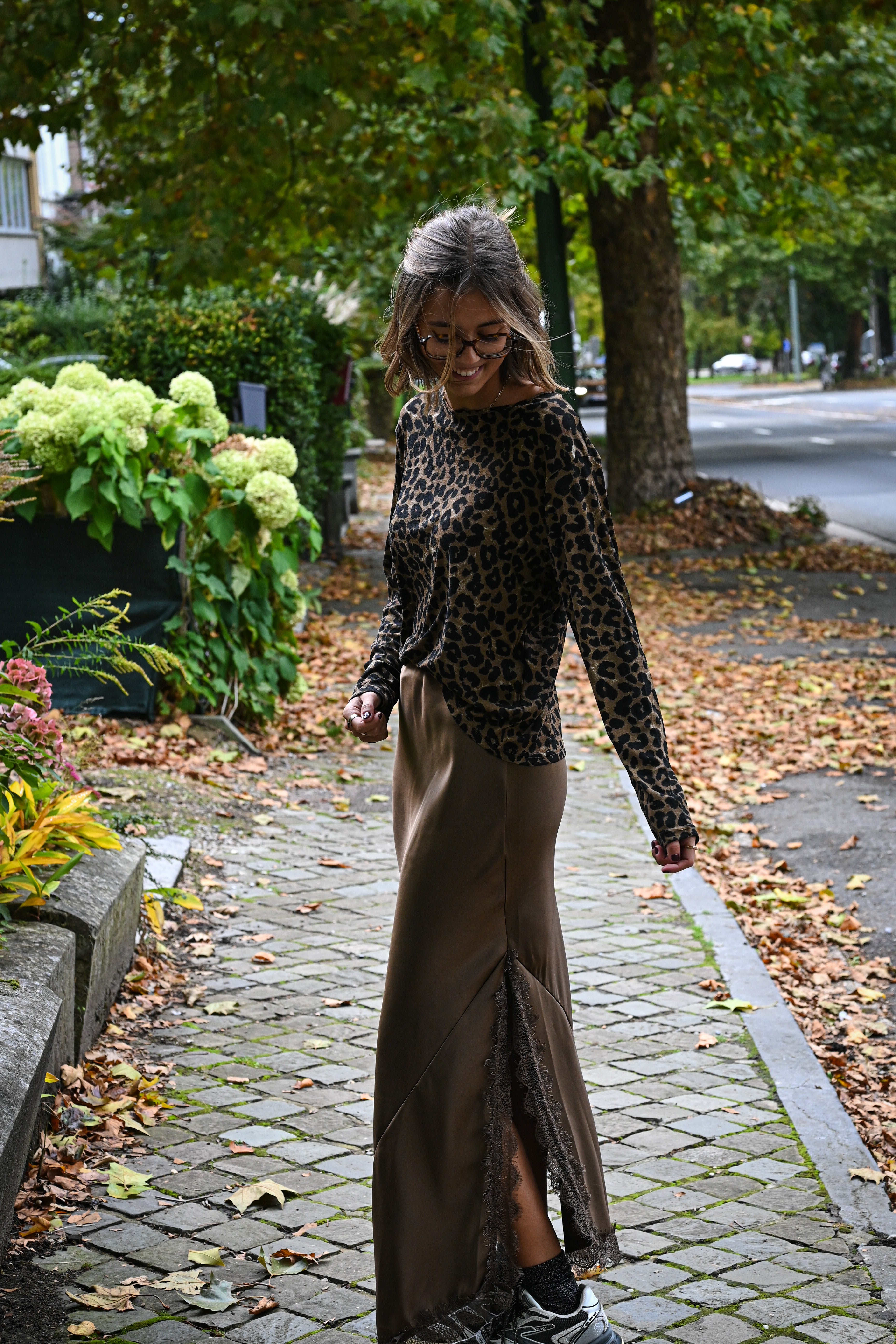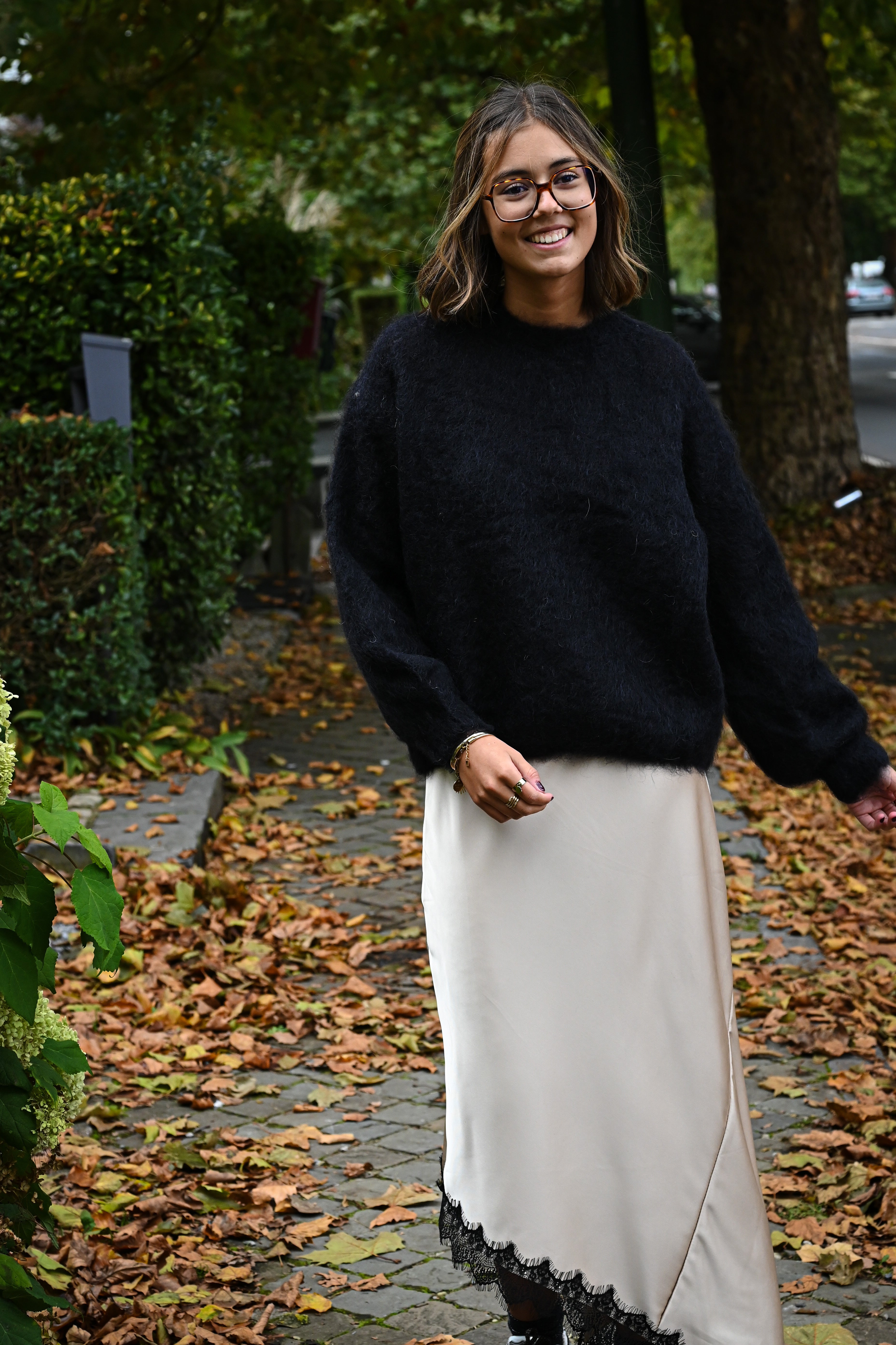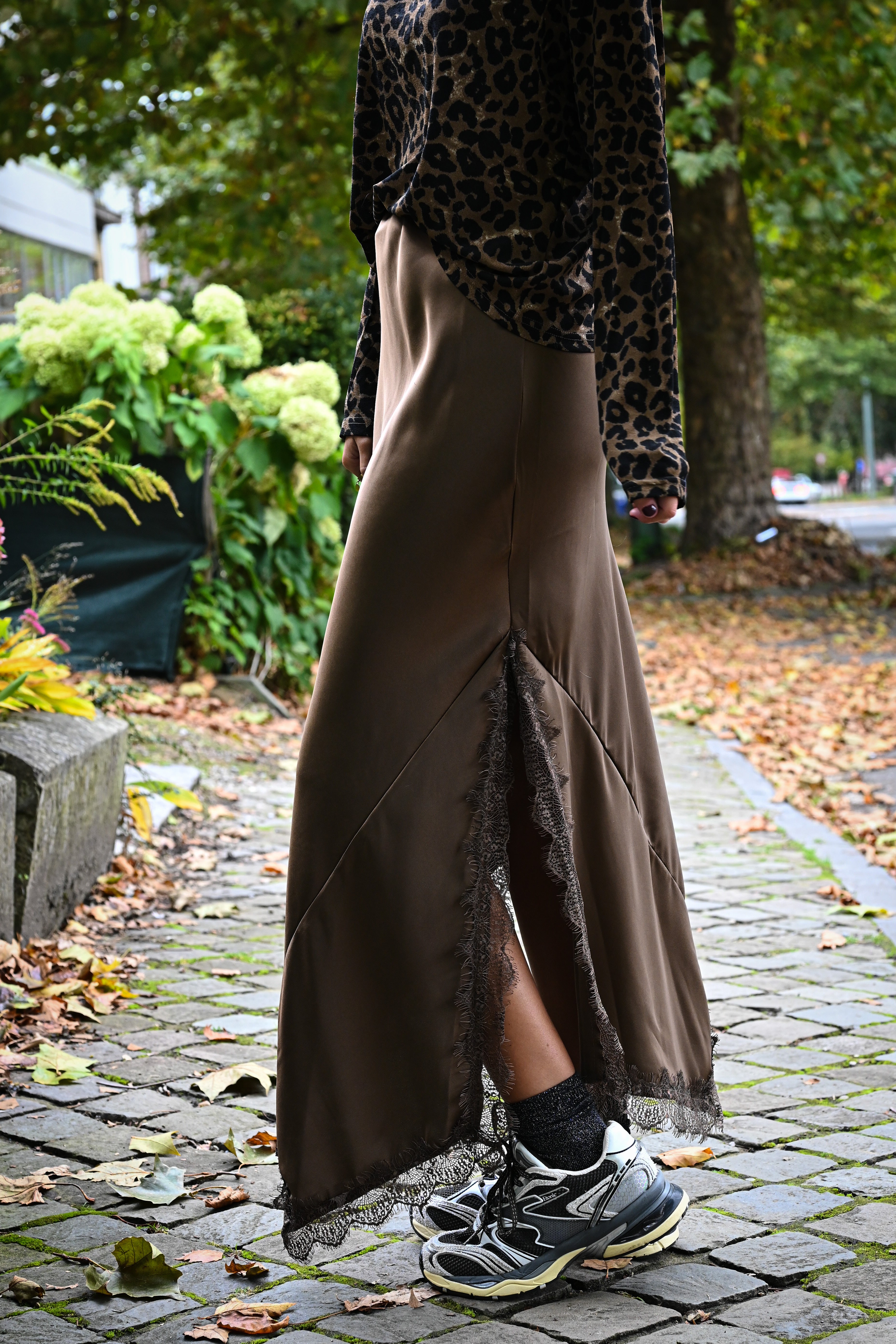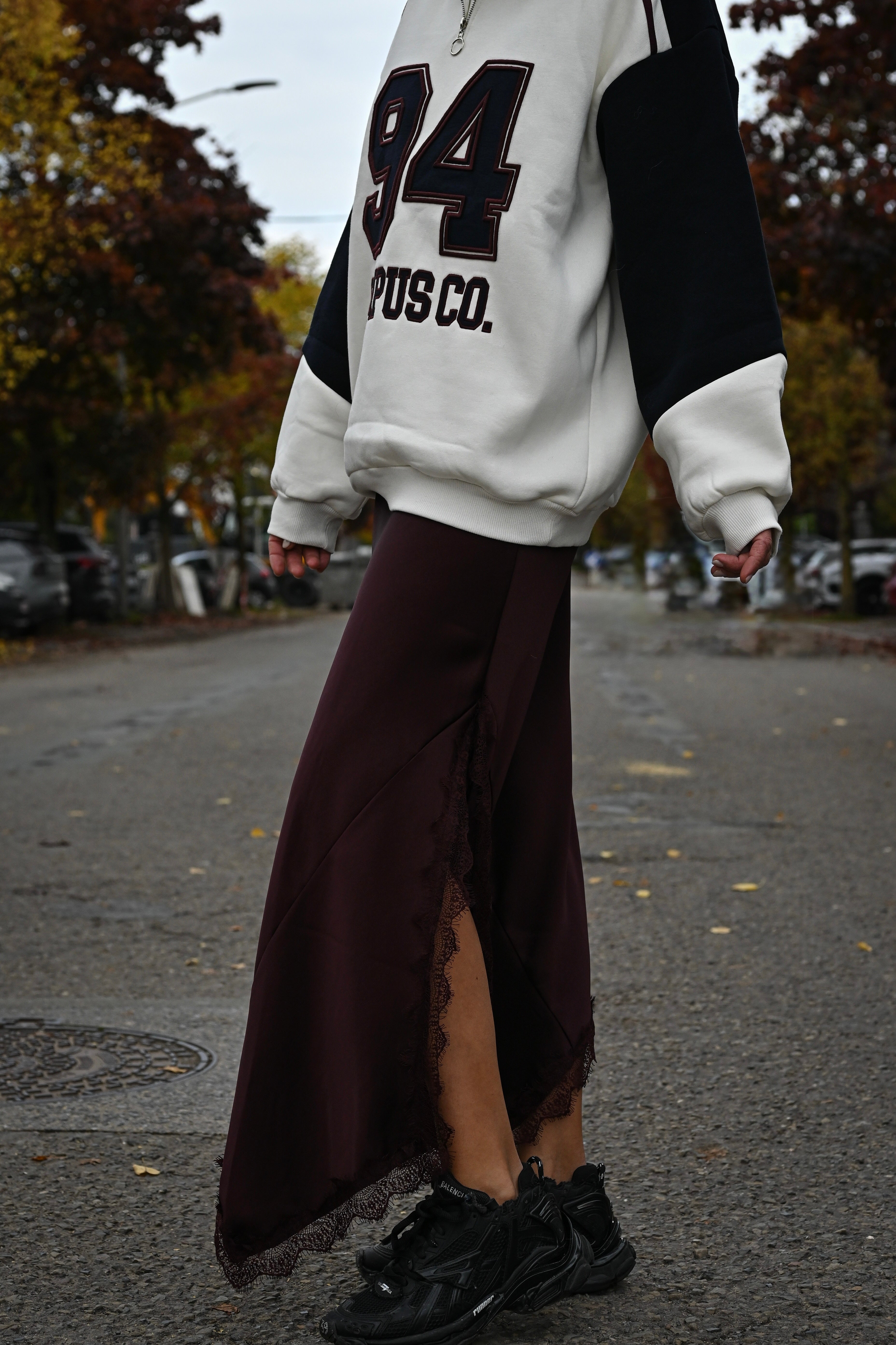 Jupe longue en satin avec une coupe asymétrique élégante, ornée de détails en dentelle. Dotée d’une taille élastiquée, elle s’adapte parfaitement en taille unique. Disponible en beige, chocolat, noir et bordeaux pour une allure raffinée et versatile.