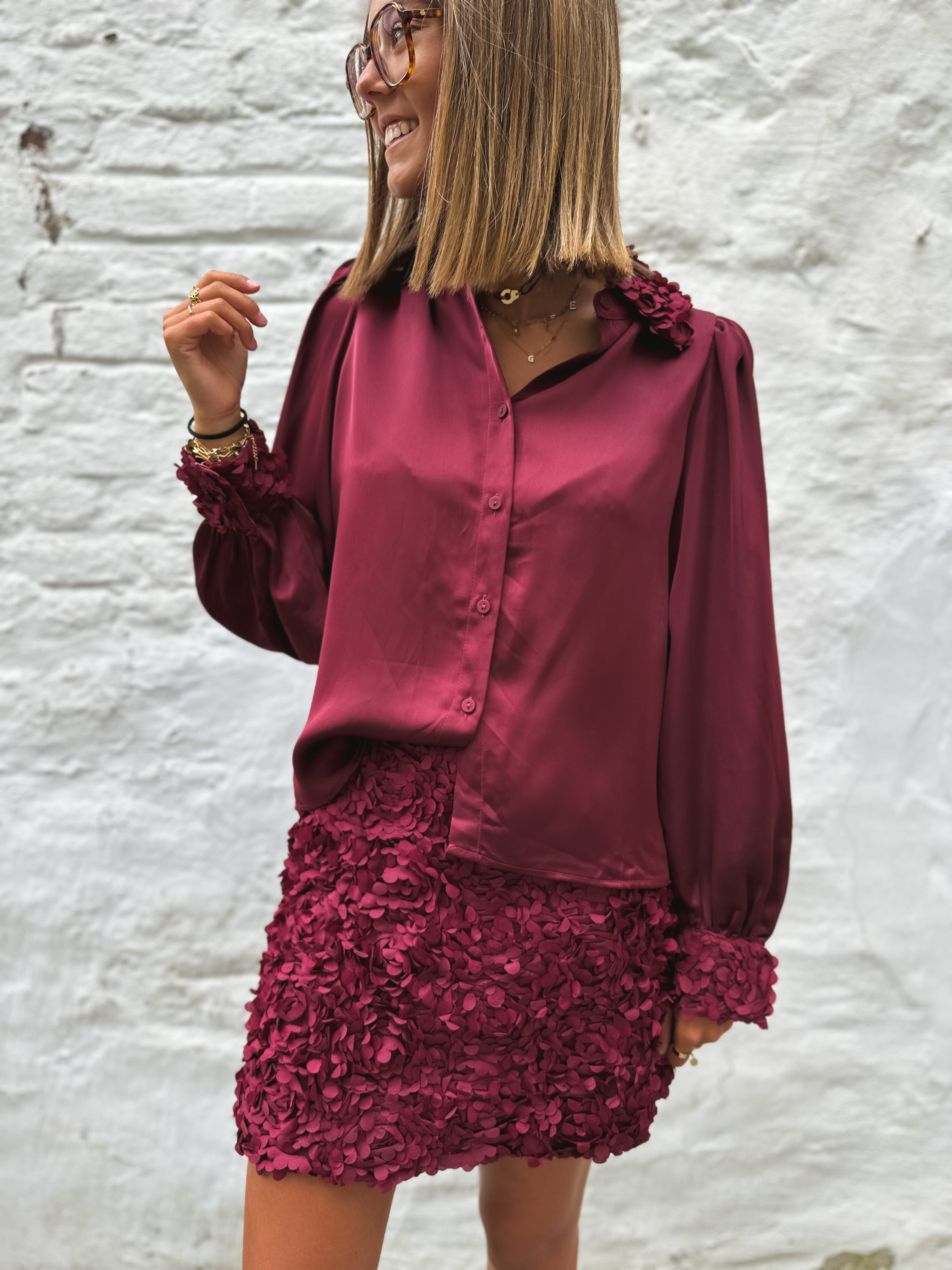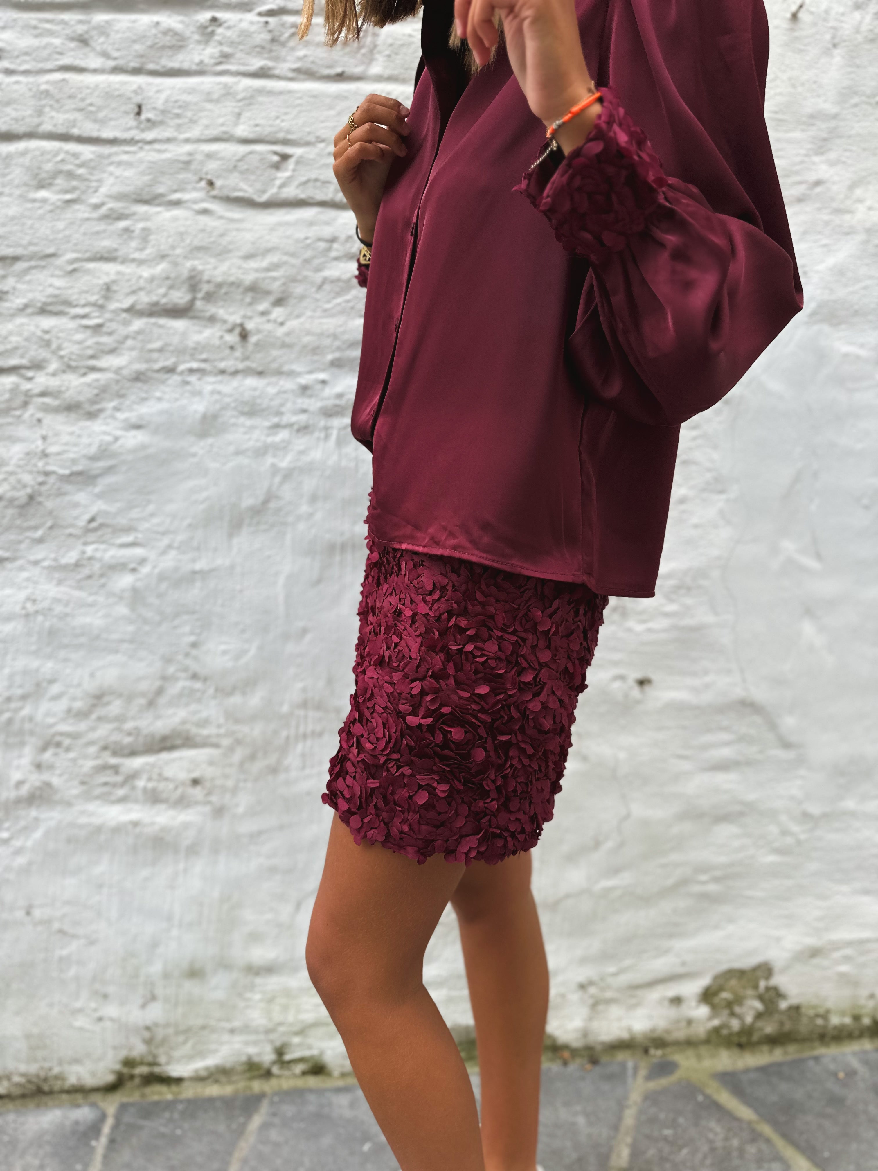 Jupe bordeaux à fleurs à coupe droite qui se ferme avec tirette. Elle est disponible en S, M ou L.