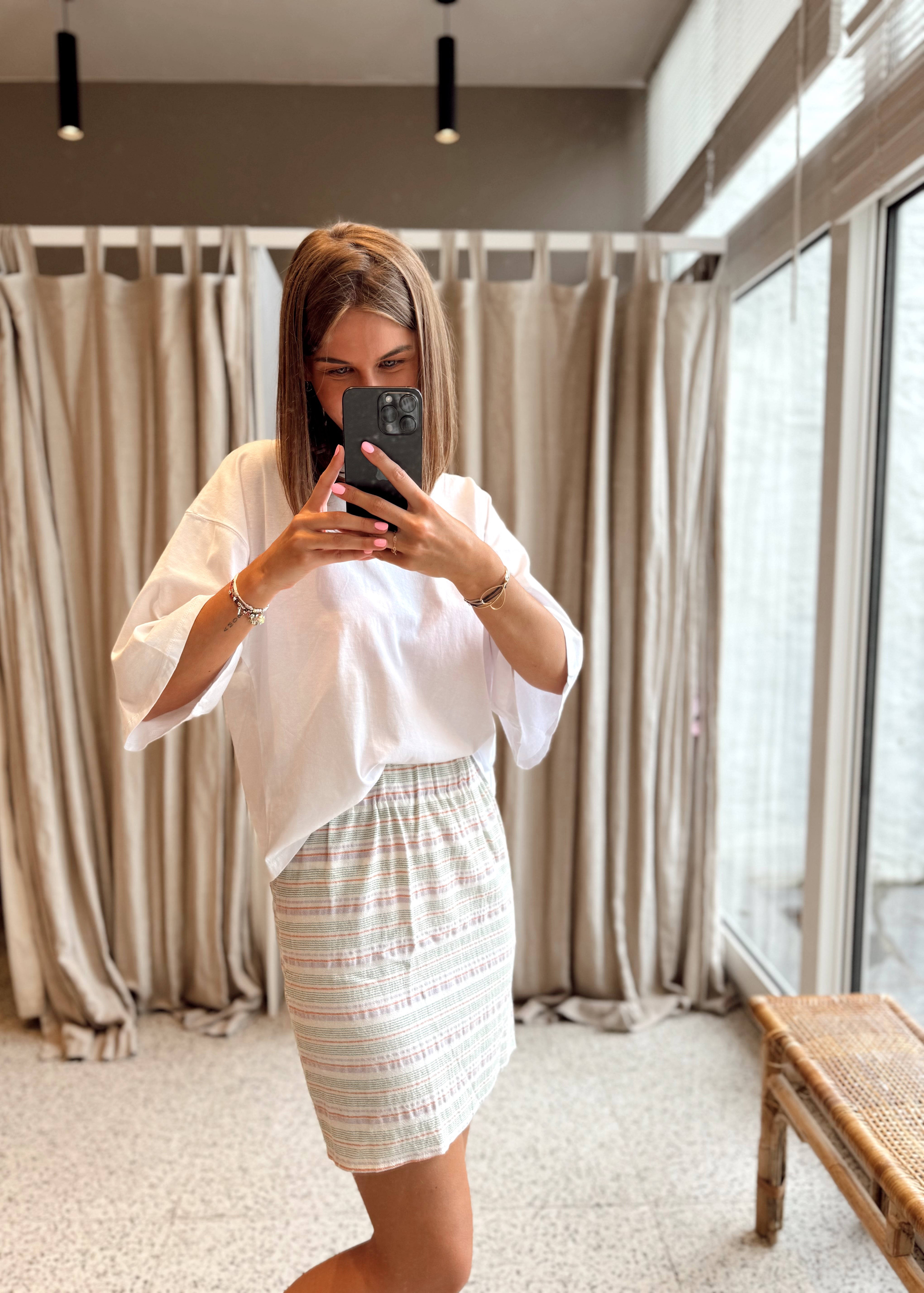 Cette jupe courte à rayures vertes et mauves, dotée d'une taille élastique, est proposée en taille unique. Confectionnée en 100 % coton, elle se lave facilement à 30 degrés, alliant confort et praticité pour un style irrésistible.