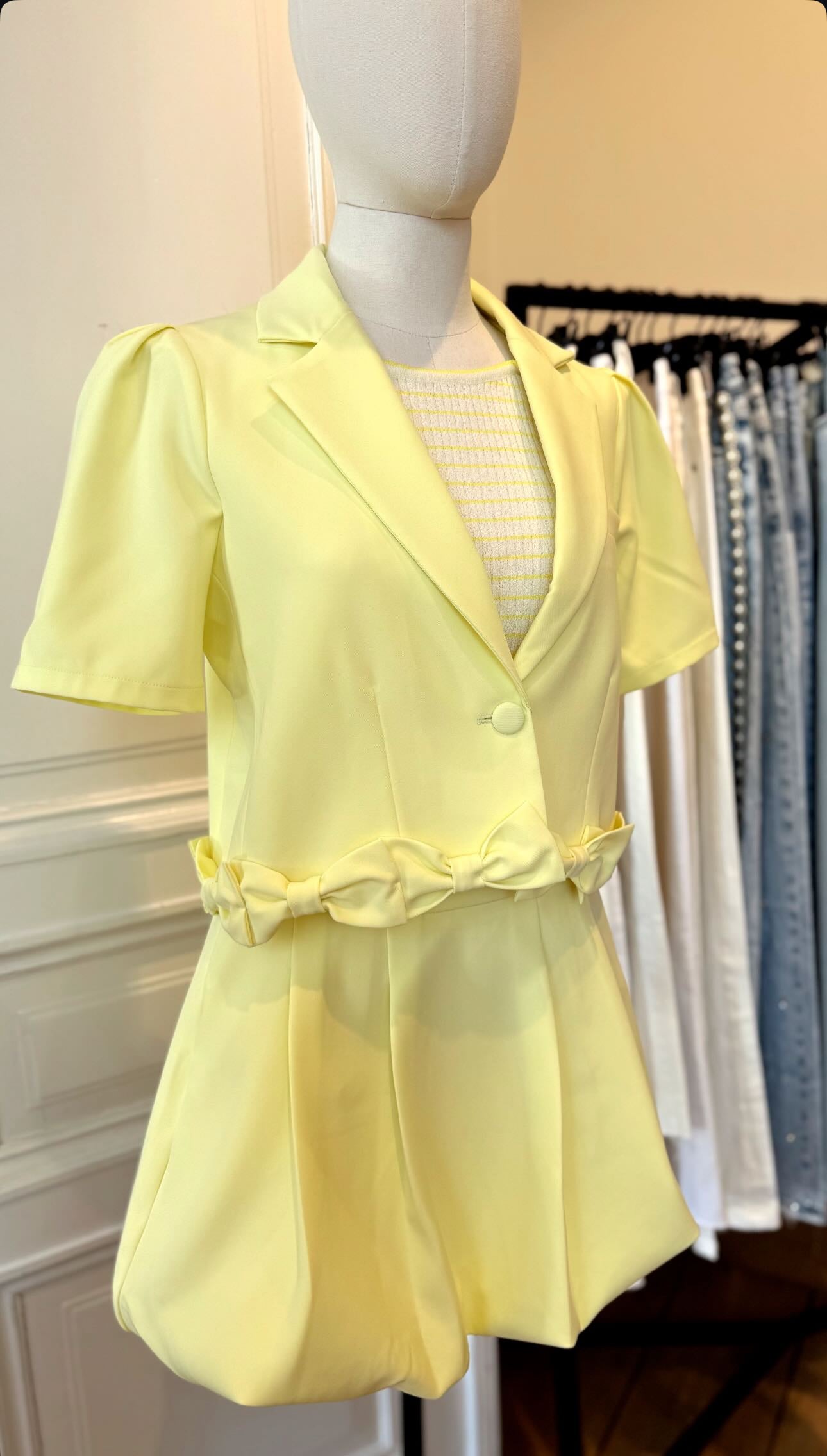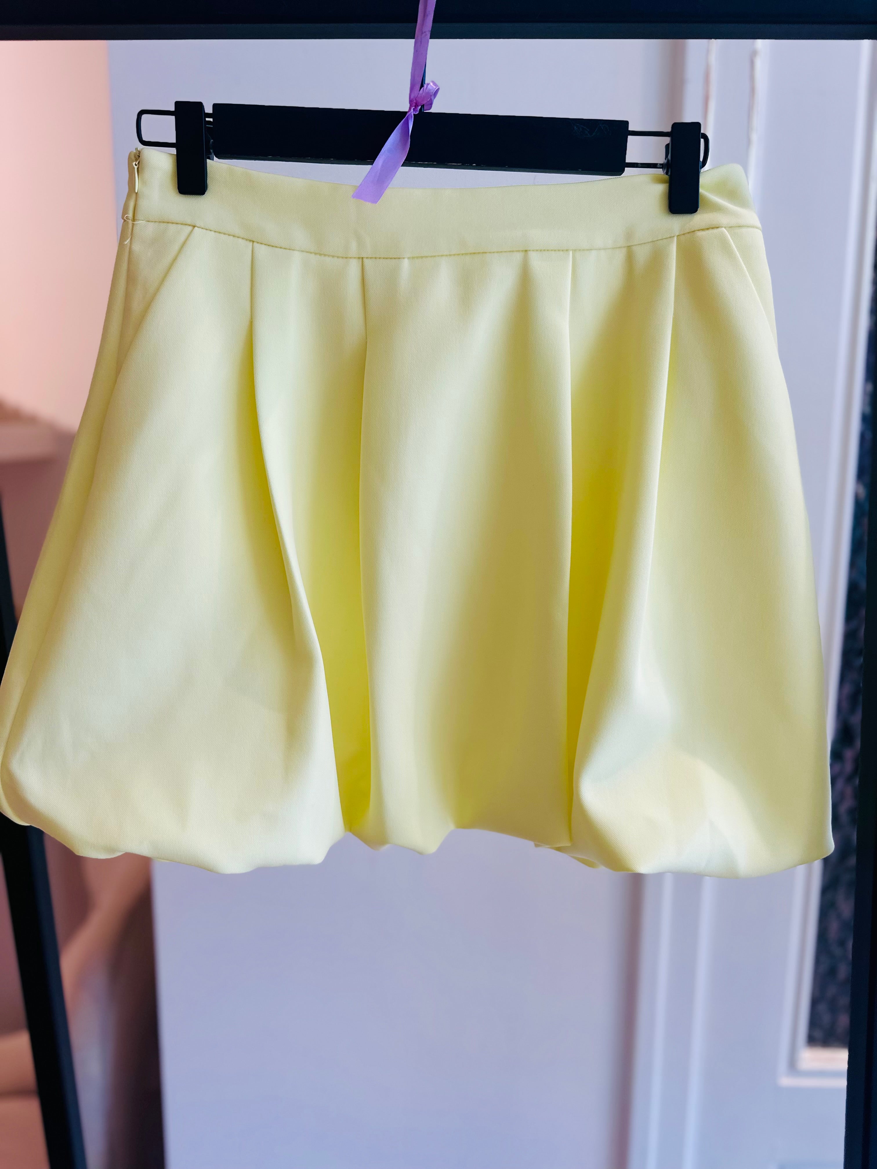 Jupe ballon jaune pale disponible en S, M ou L. Elle se ferme avec une tirette discrète.