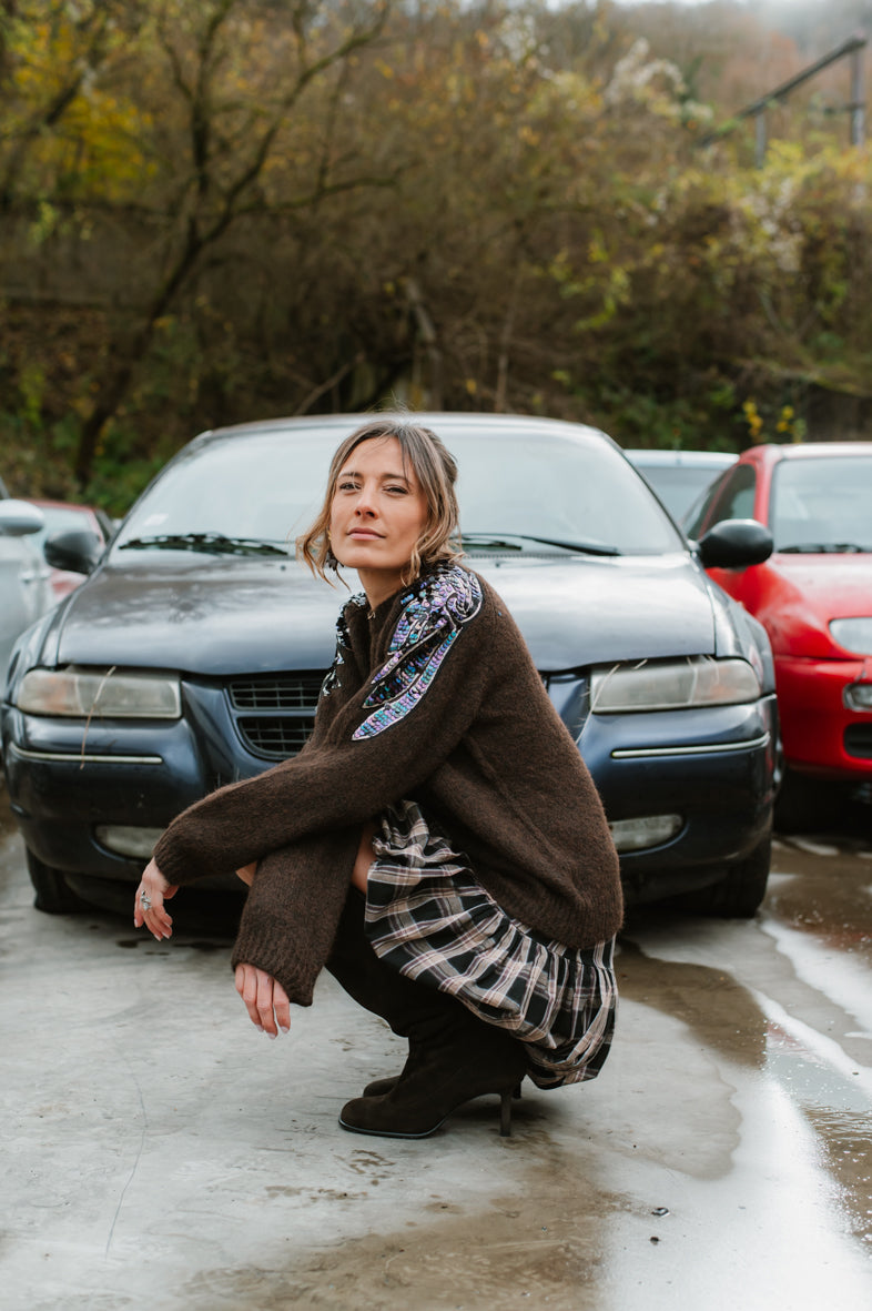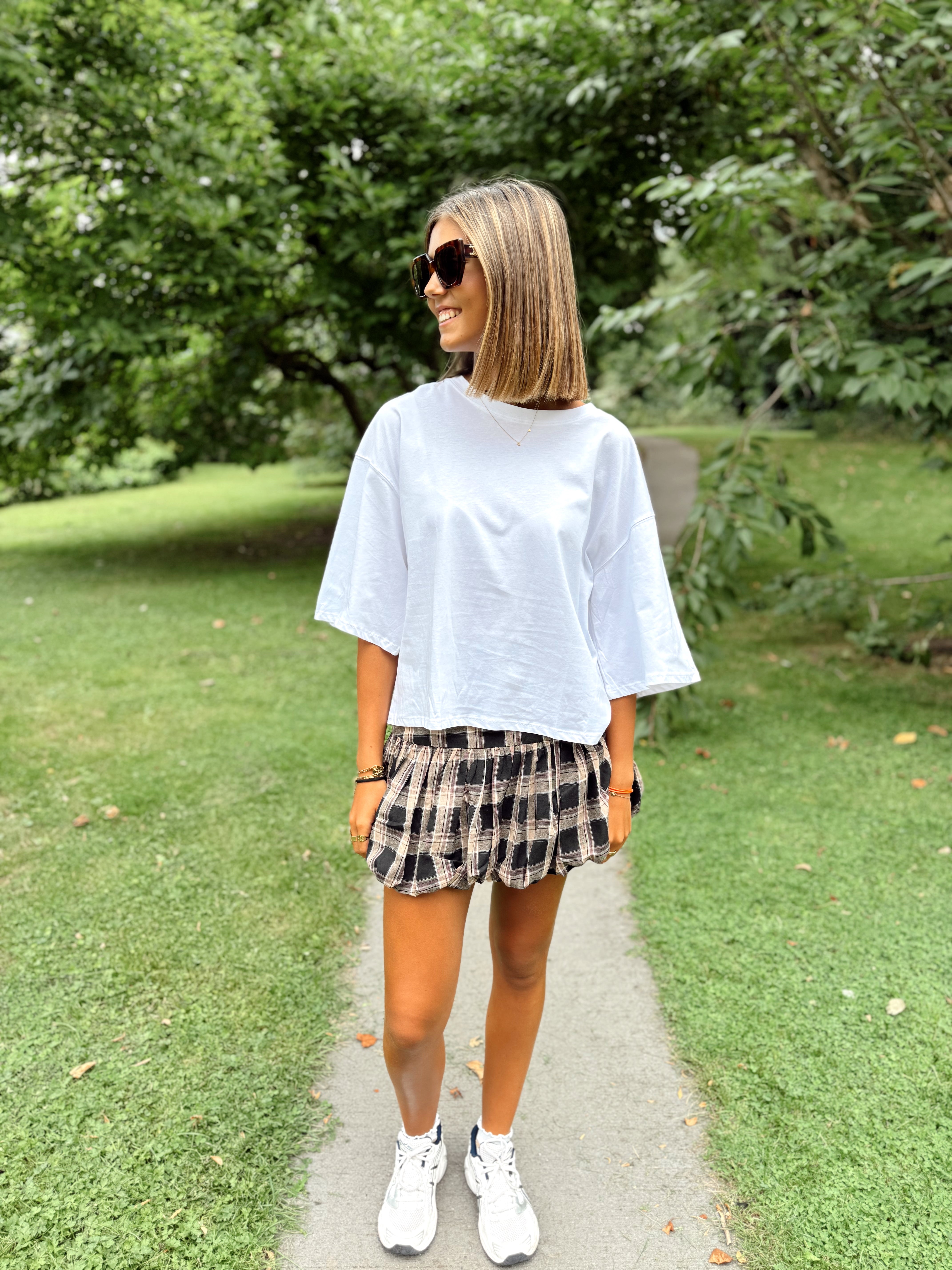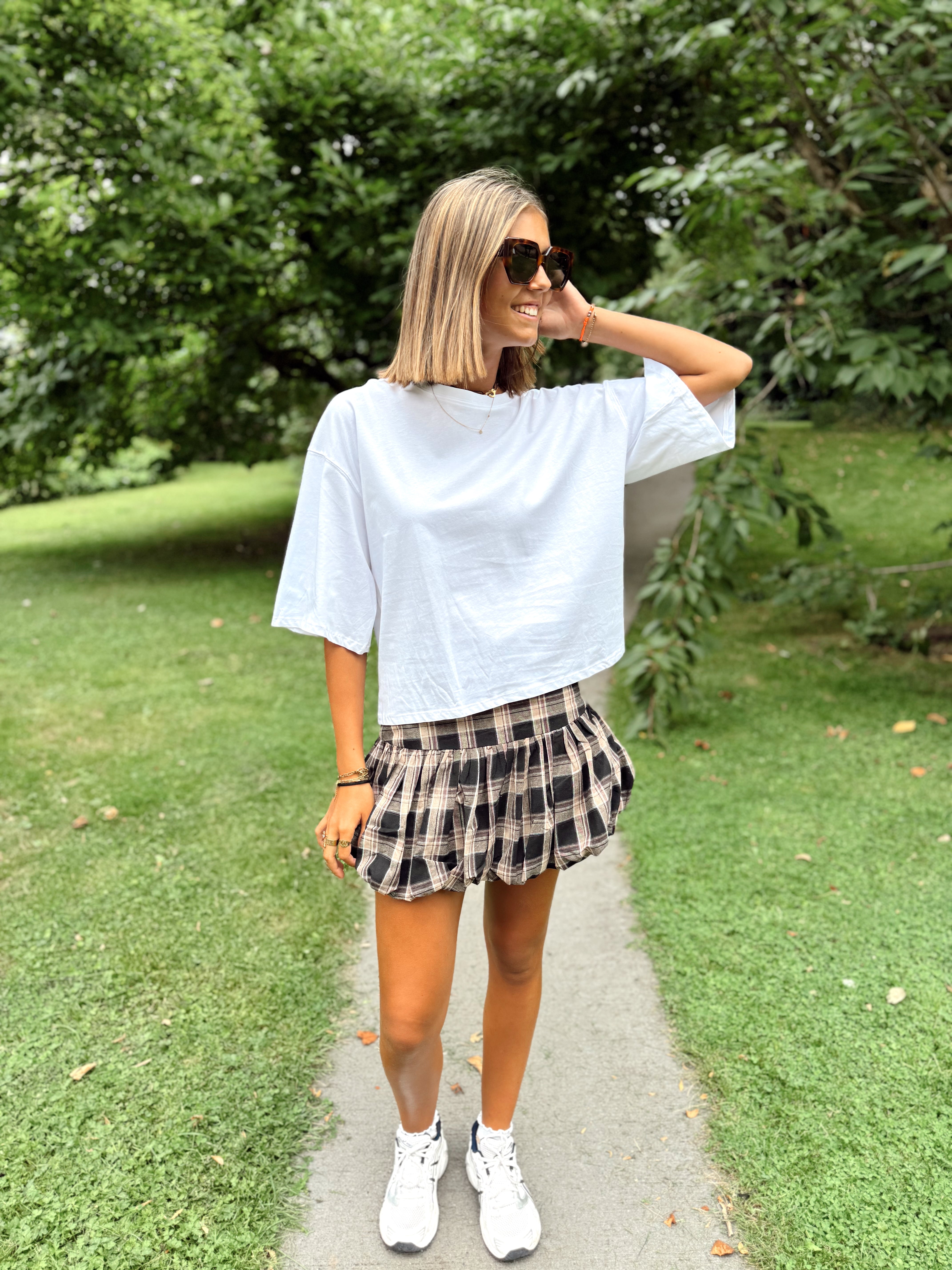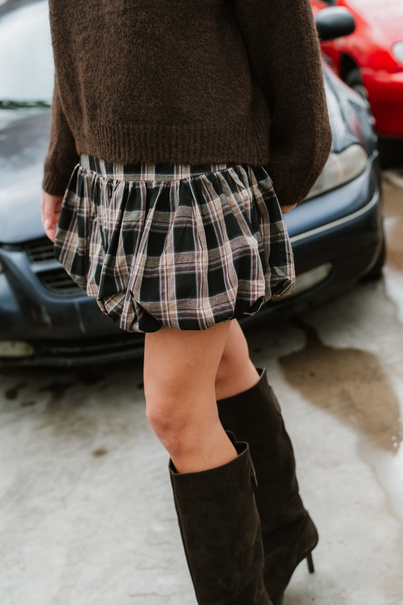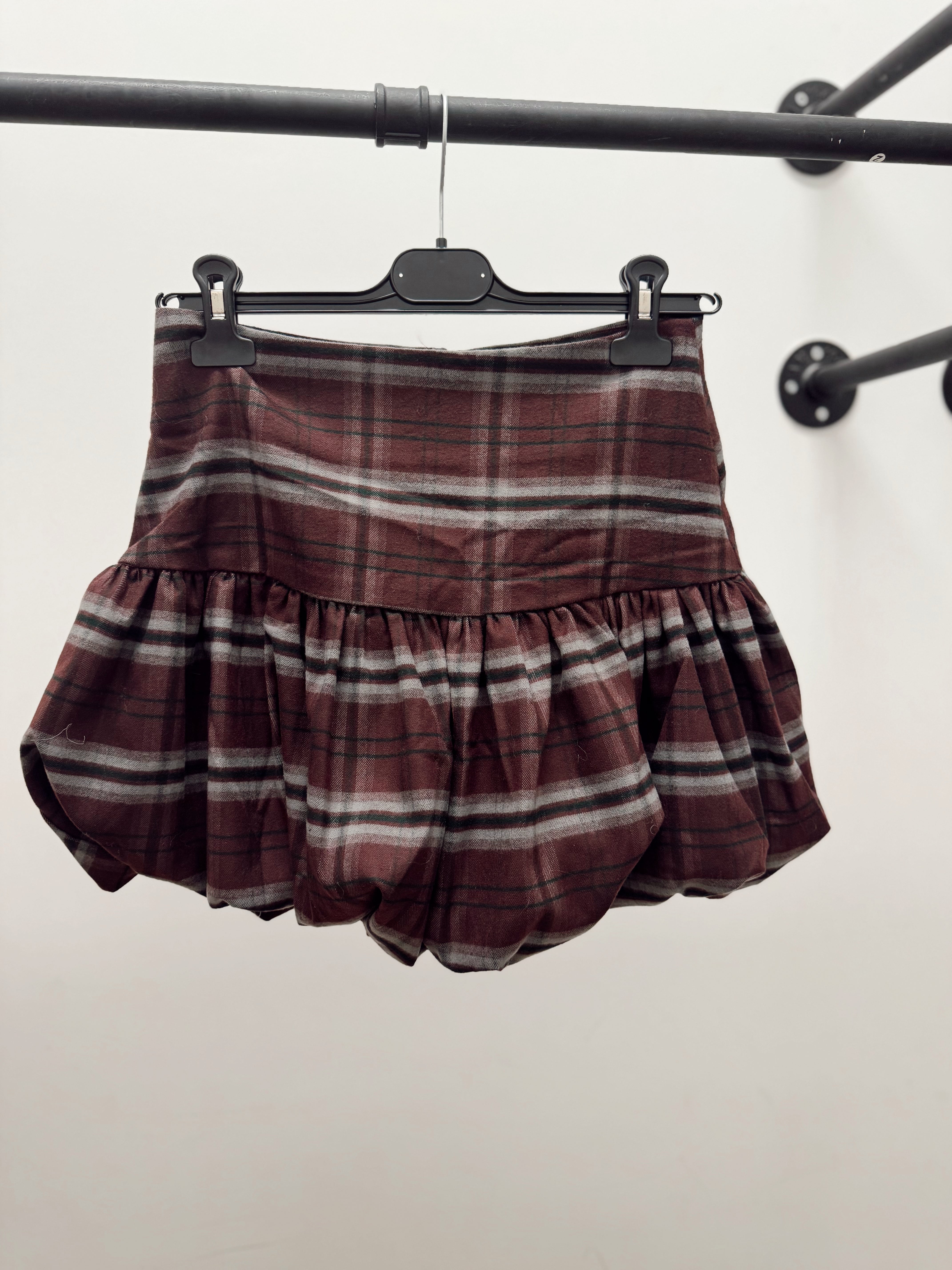 Jupe courte ballon, à carreaux dans les tons de brun, beige et noir. Cette jupe est disponible en taille S, M et L. Le mannequin mesure 1m75 et porte la taille M pour la longueur.