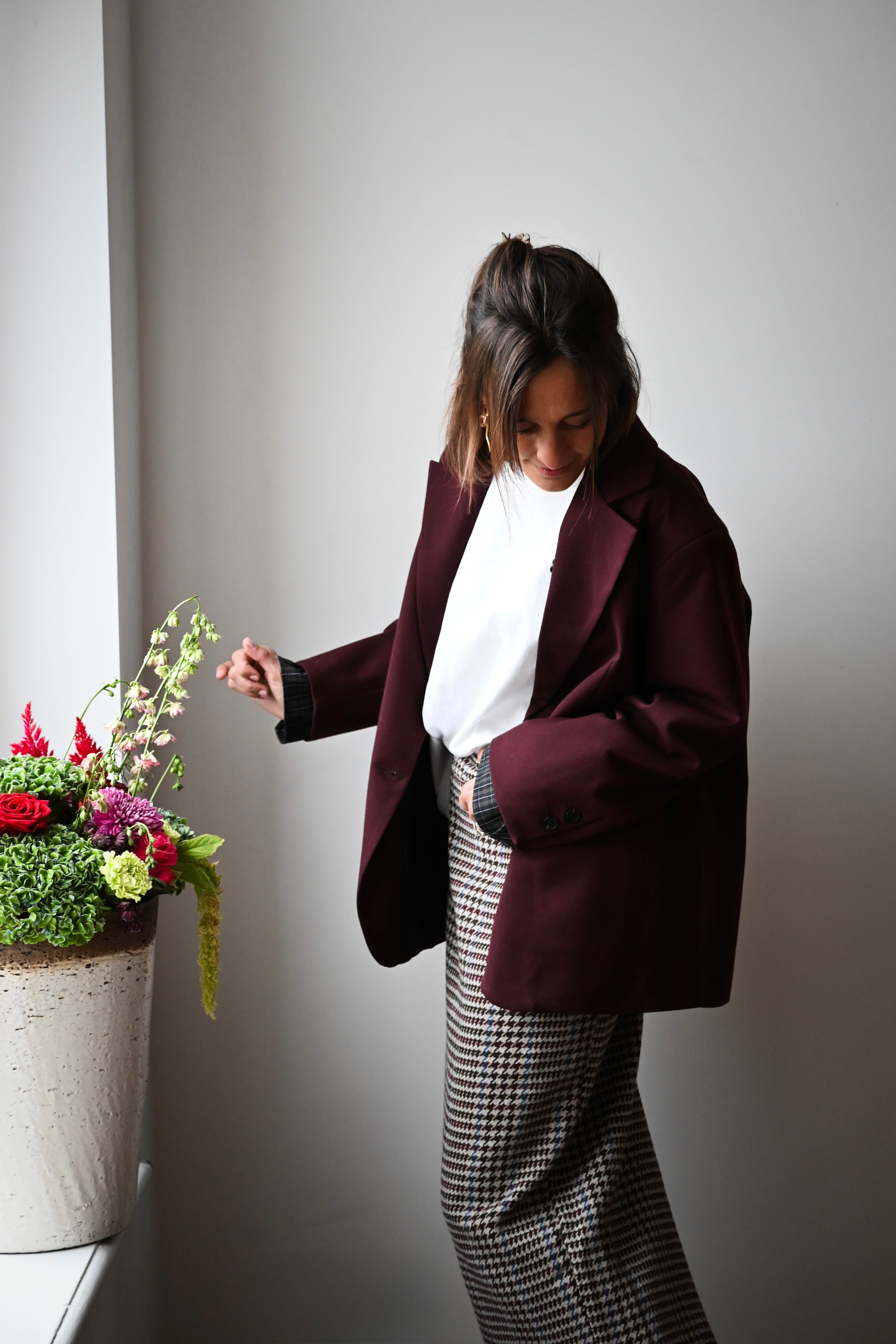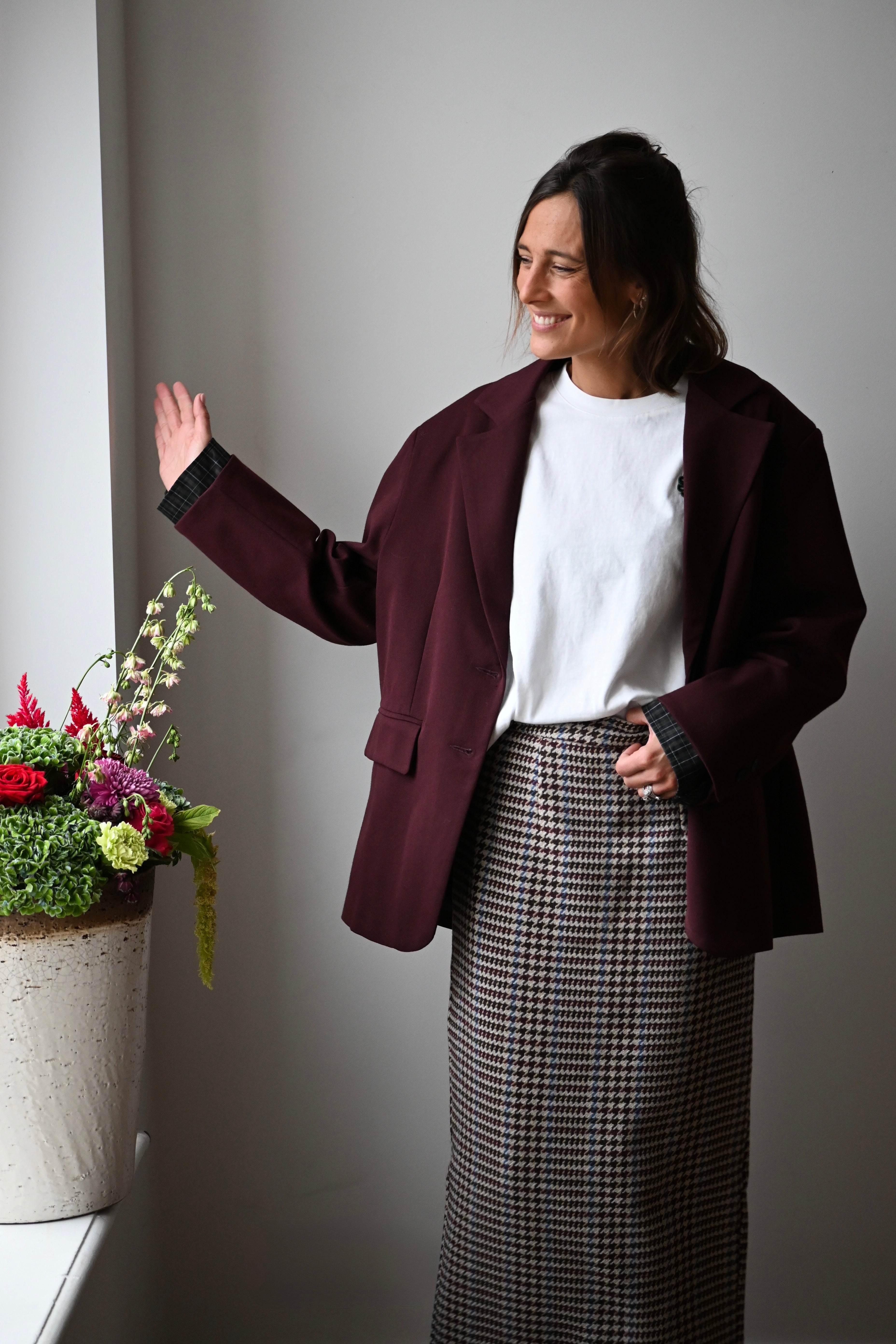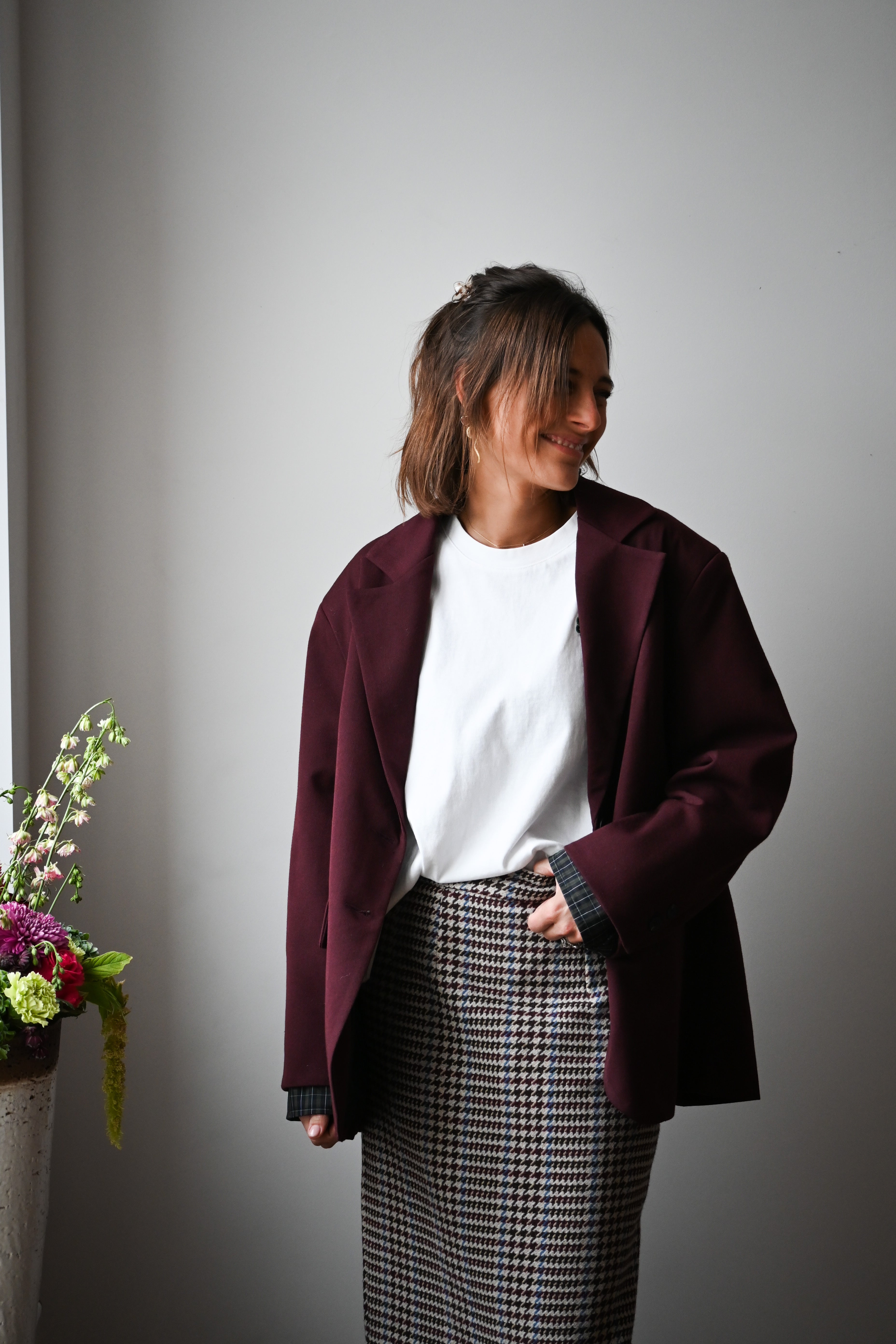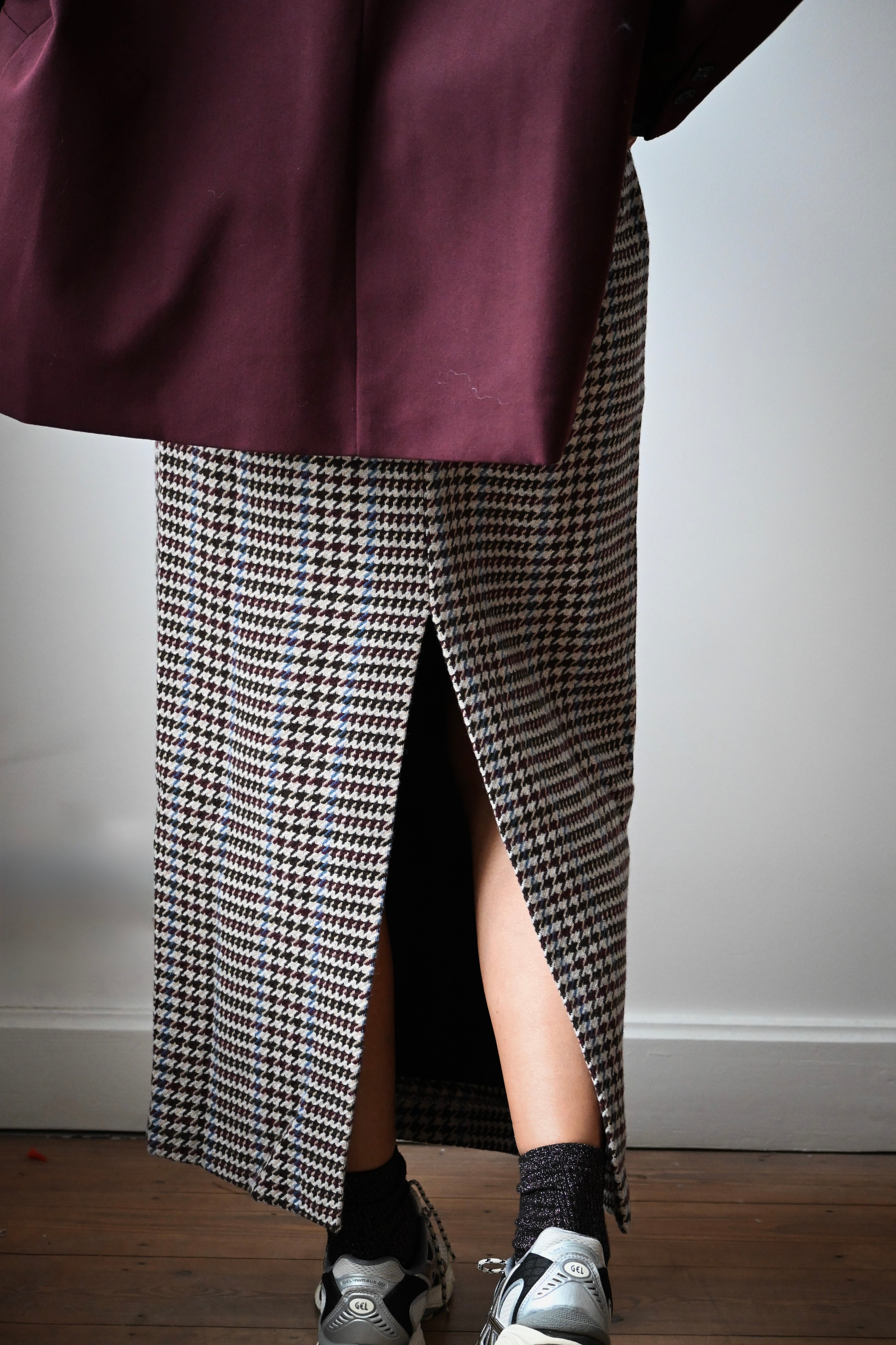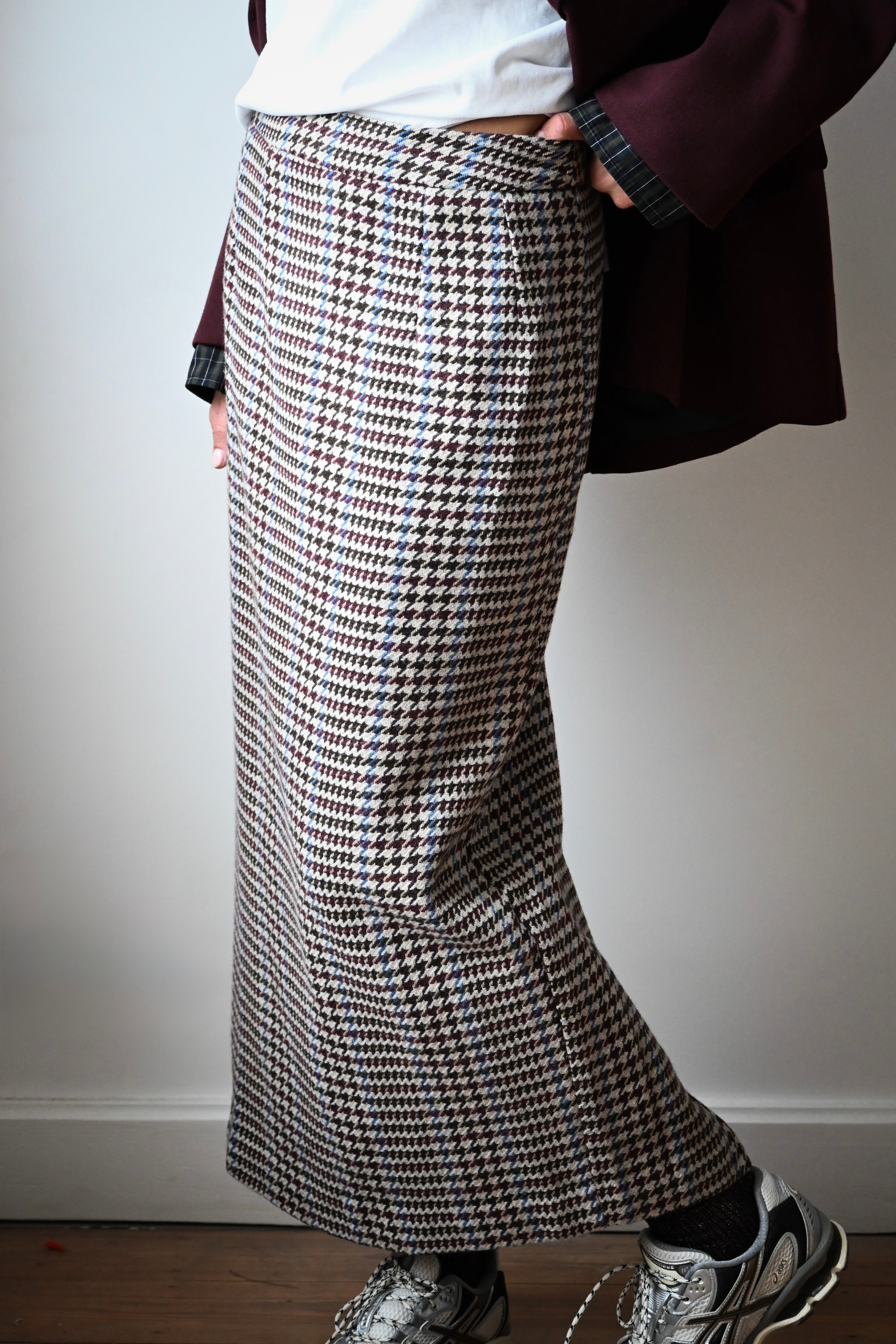 Cette jupe longue en tweed allie bordeaux, chocolat et bleu avec élégance. Sa coupe droite, agrémentée d’une fente à l’arrière, souligne la silhouette avec subtilité. Disponible en tailles S, M et L, elle s’adapte parfaitement à votre style.