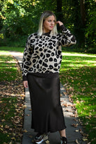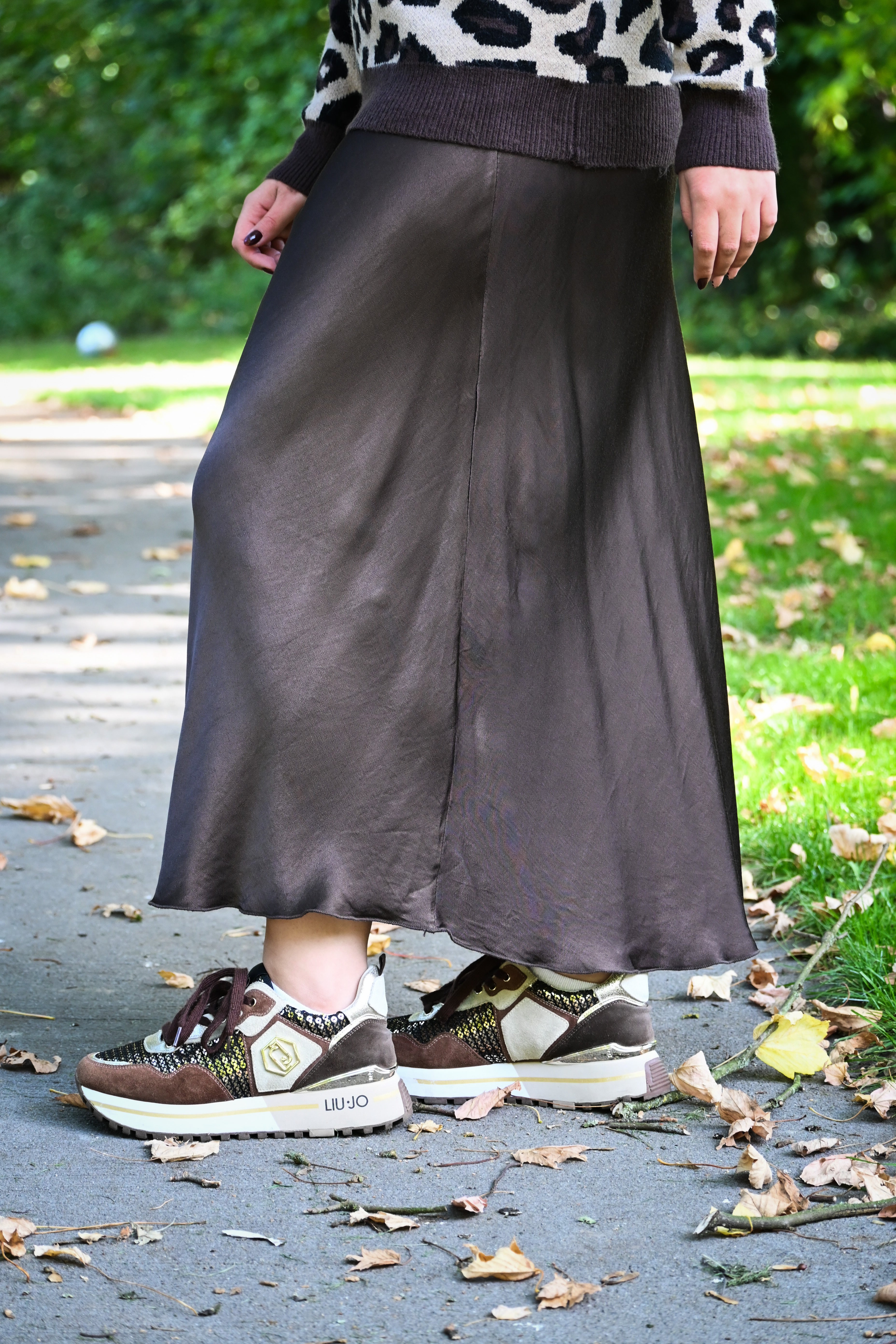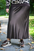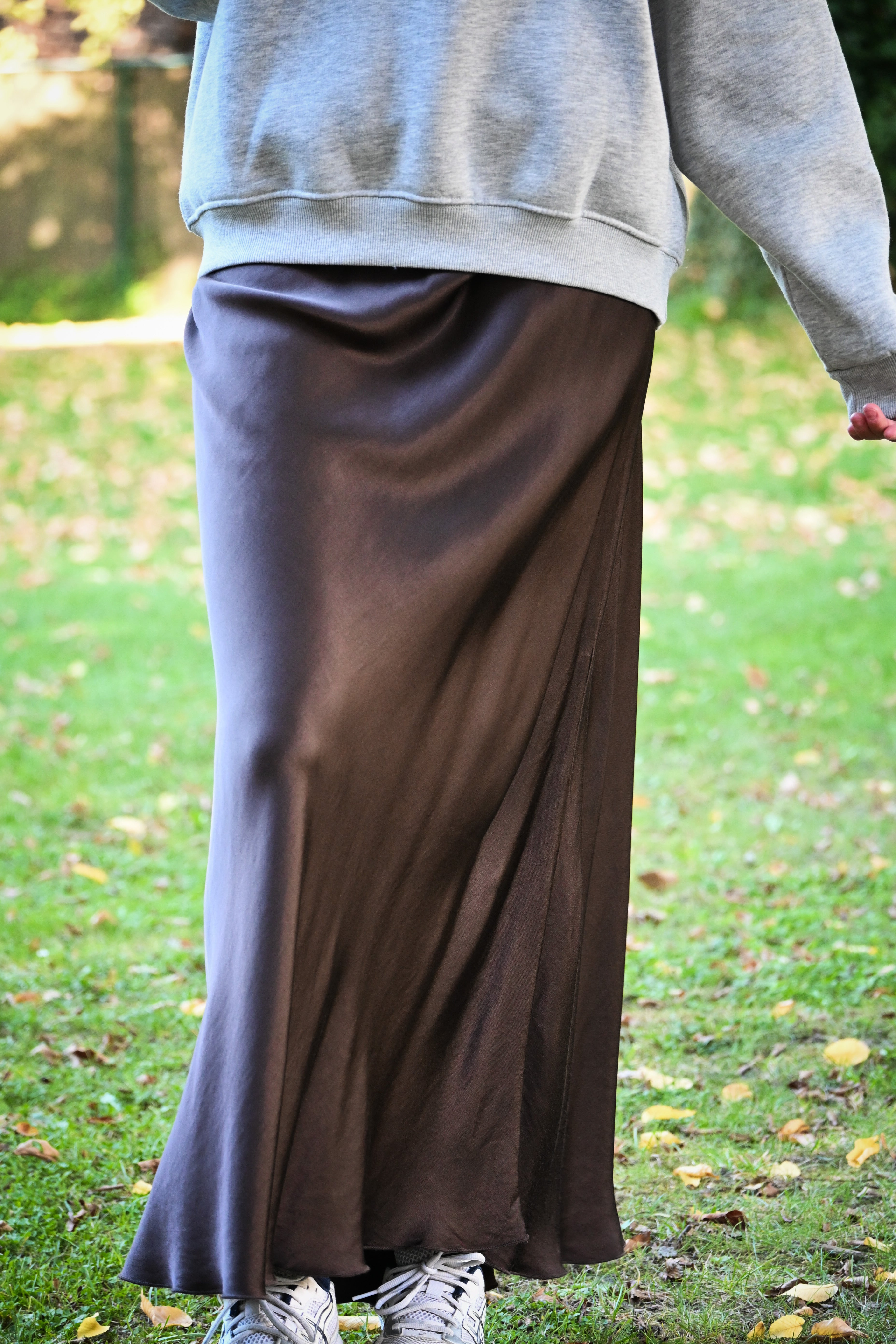 Cette jupe chocolatée en satin, dotée d'une taille élastiquée, offre une coupe unique qui s'ajuste parfaitement à toutes les morphologies grâce à son élastique pratique. Disponible en taille unique, elle allie confort et élégance avec sobriété.