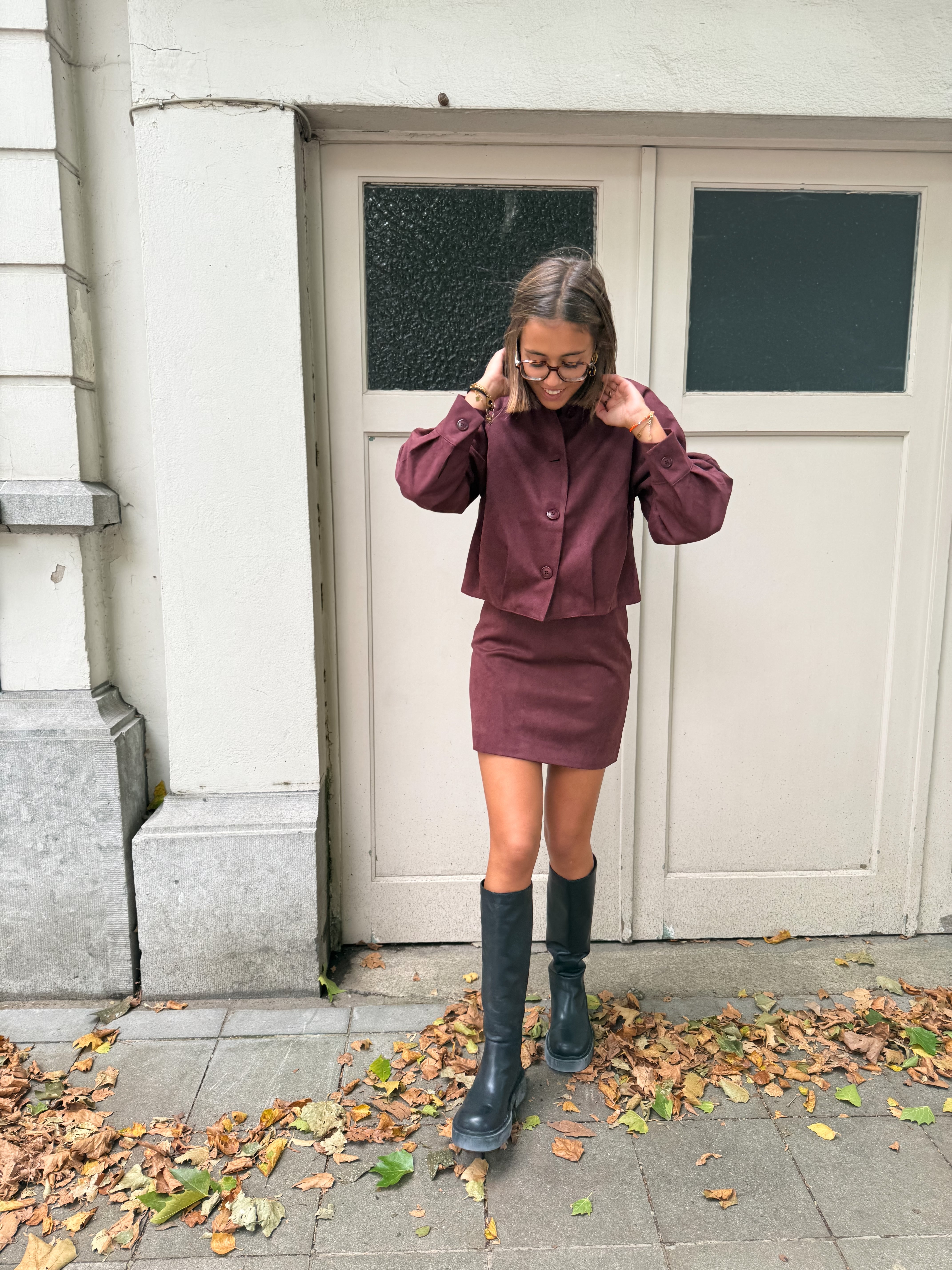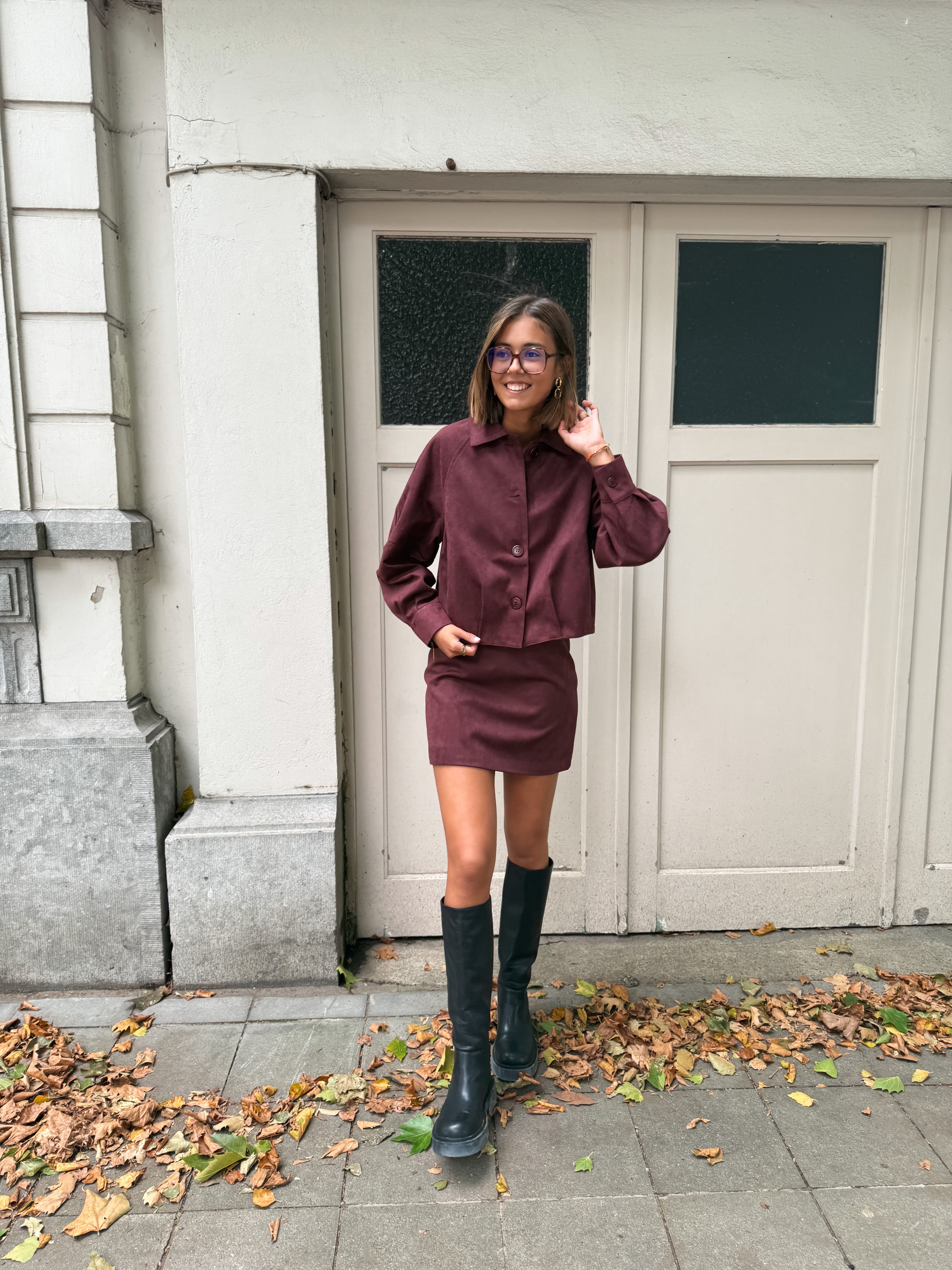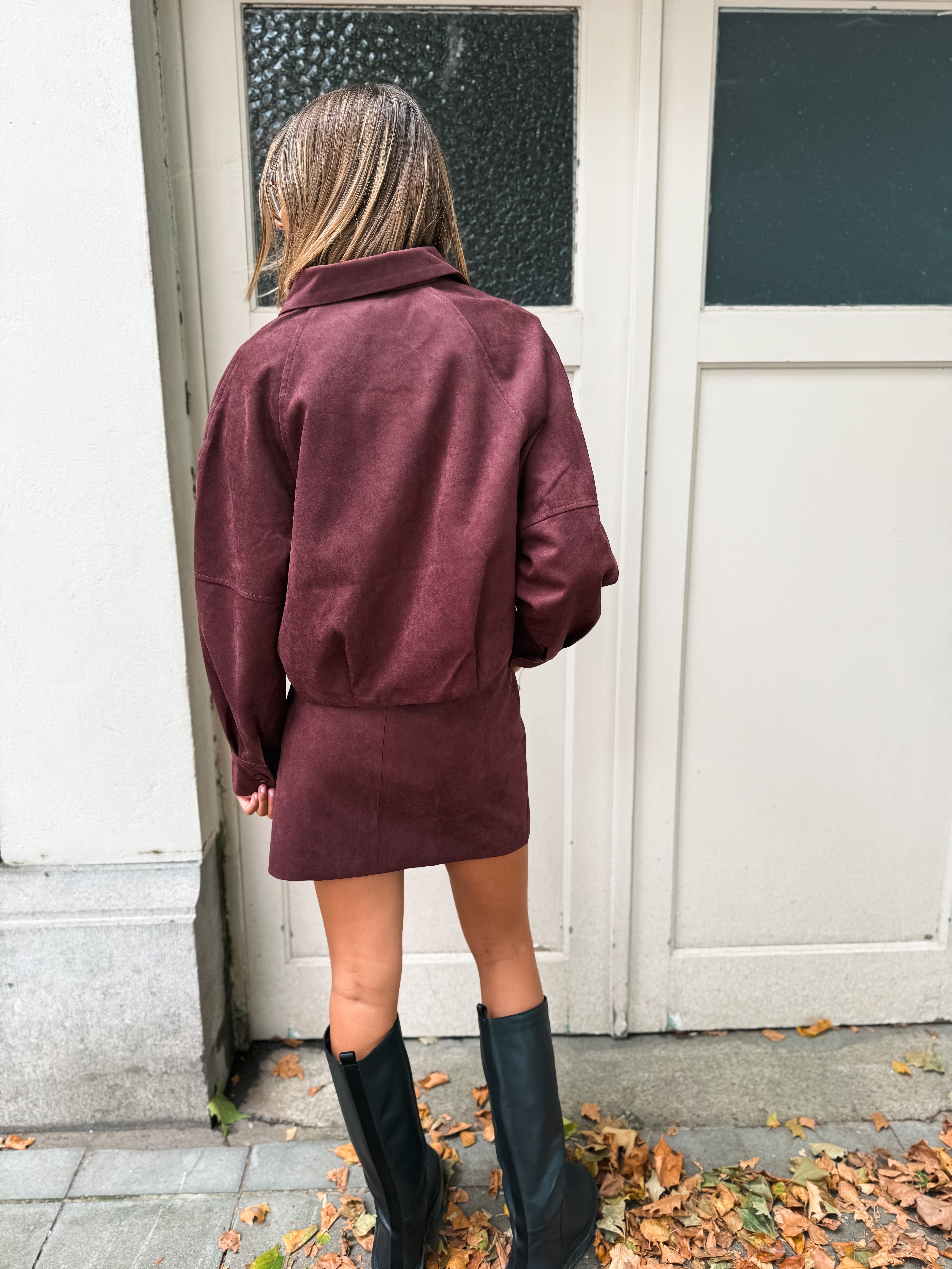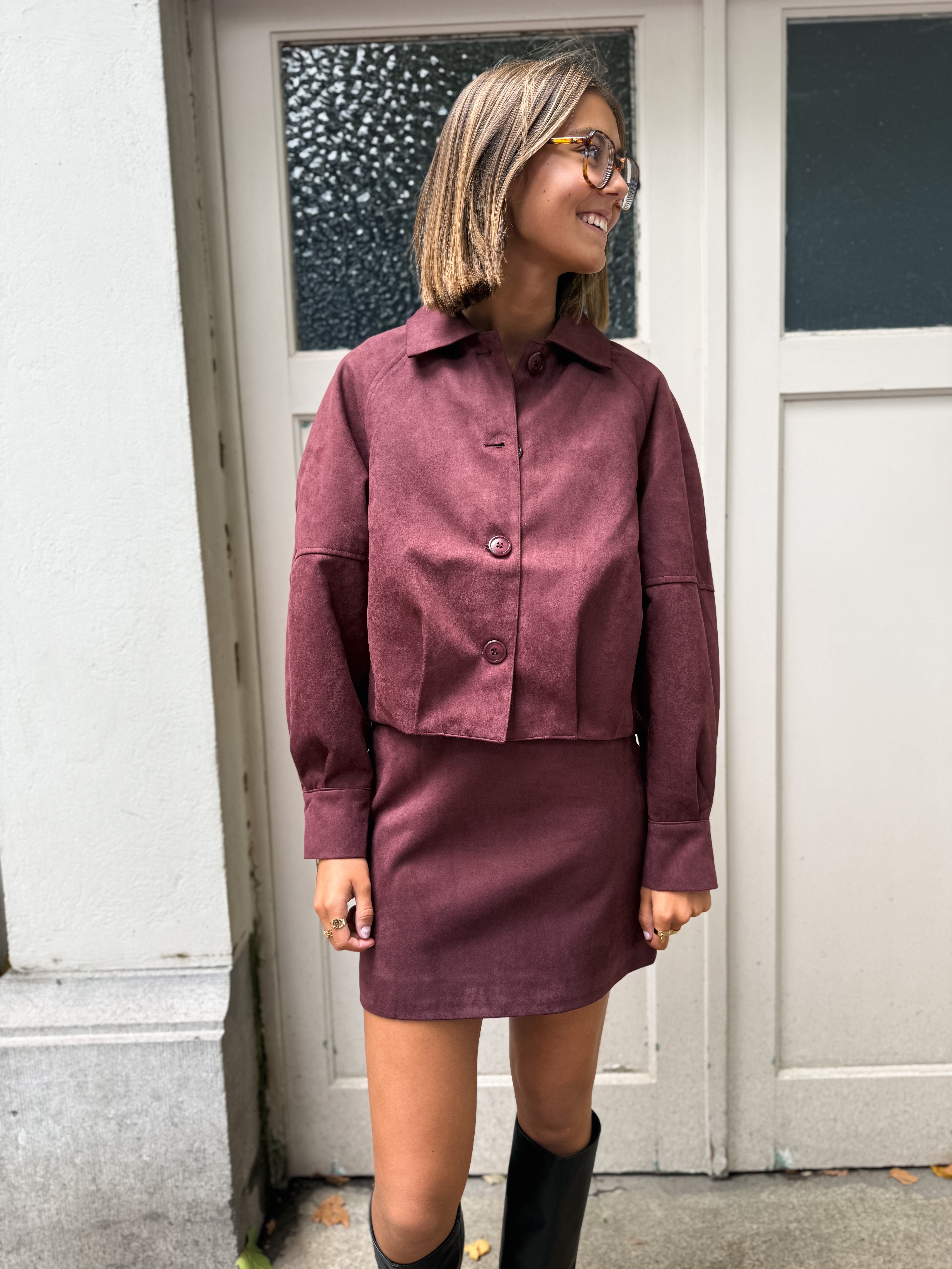 Cette jupe en suédine prune à taille haute, dotée de pinces, est proposée en tailles S, M et L. Alliant élégance et confort, elle vous garantit un look raffiné et moderne.