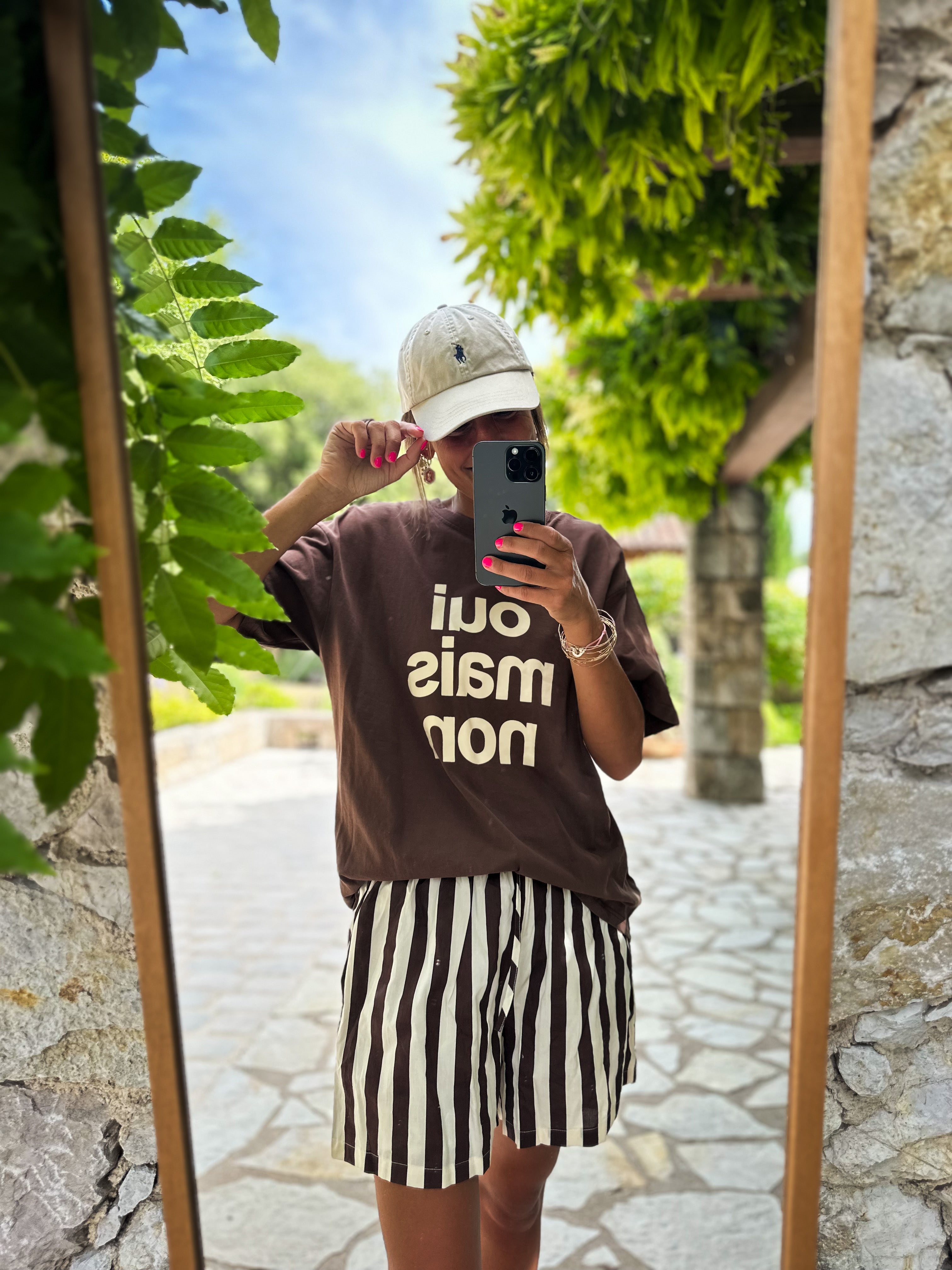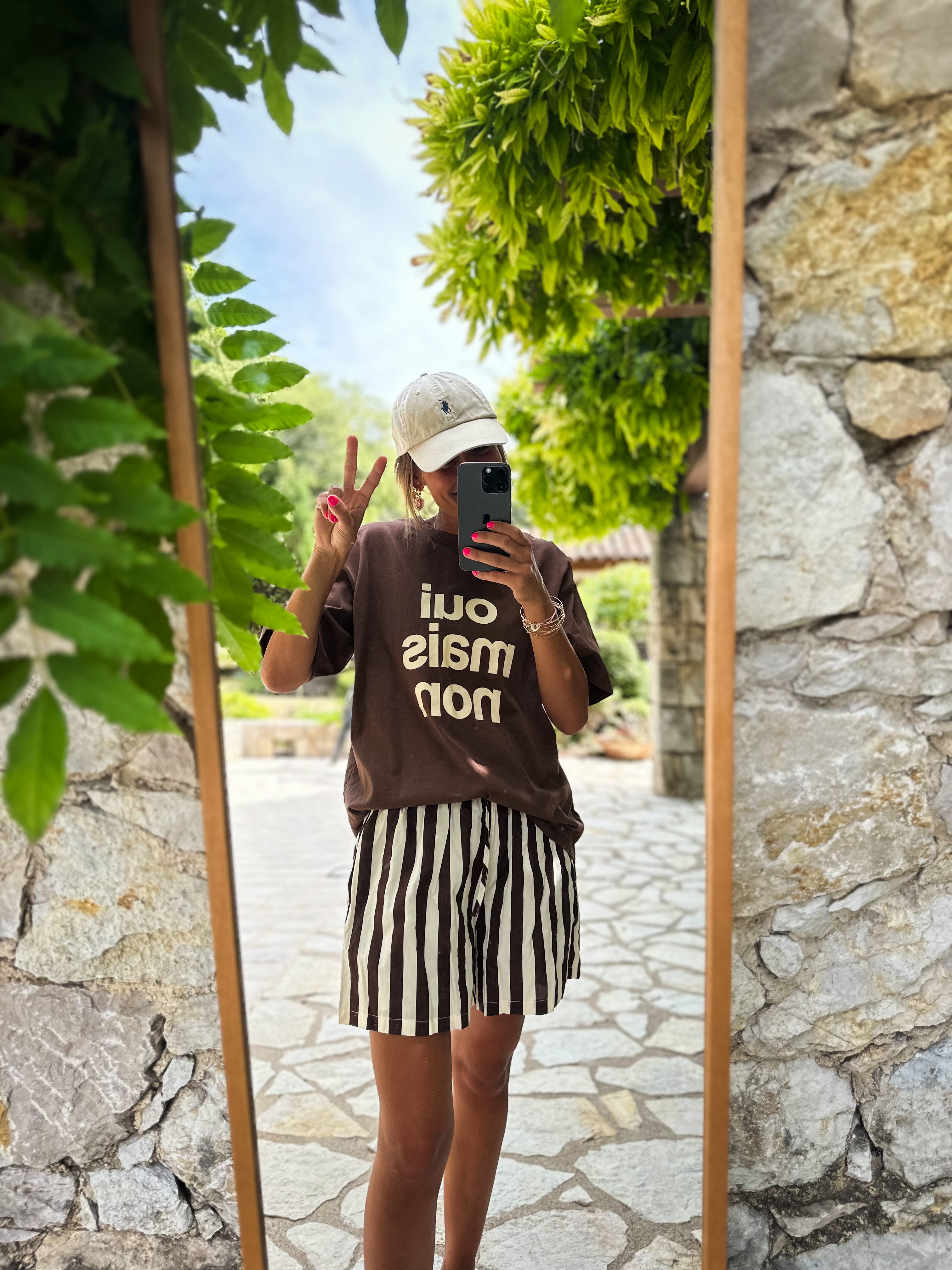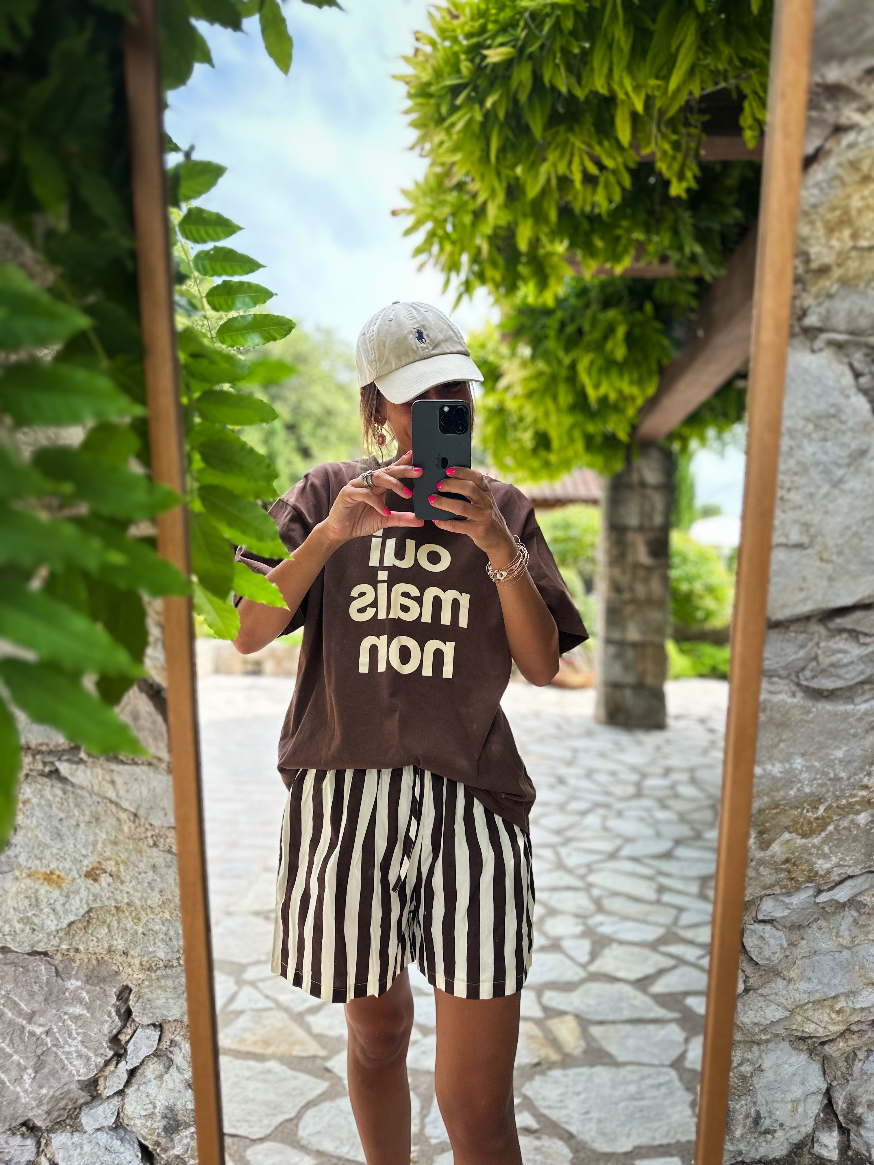 Short rayé brun et blanc, doté d’un élastique à la taille pour un ajustement parfait. Disponible en S/M ou M/L. Confectionné en 100 % coton, il se lave à la main pour préserver sa qualité.