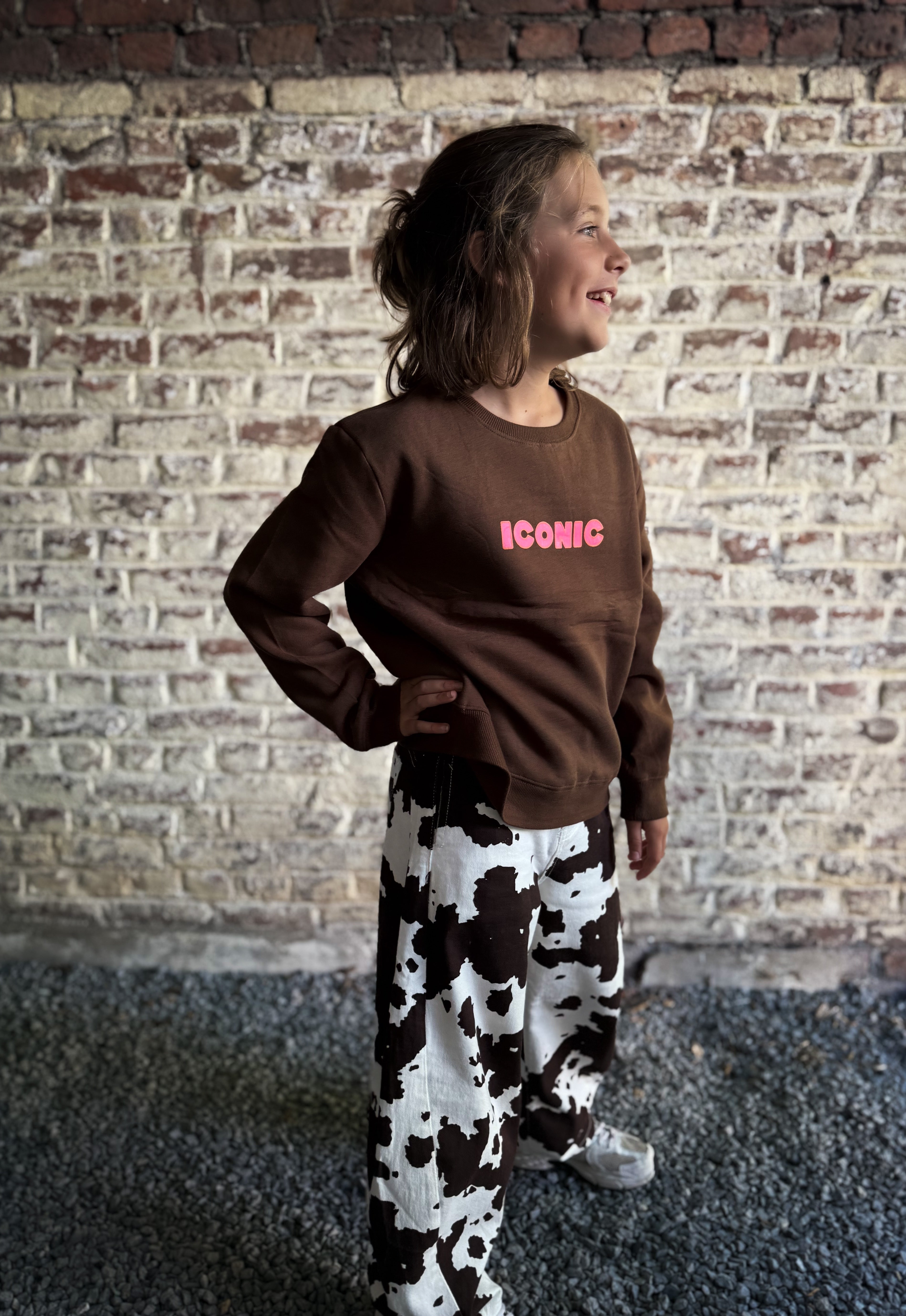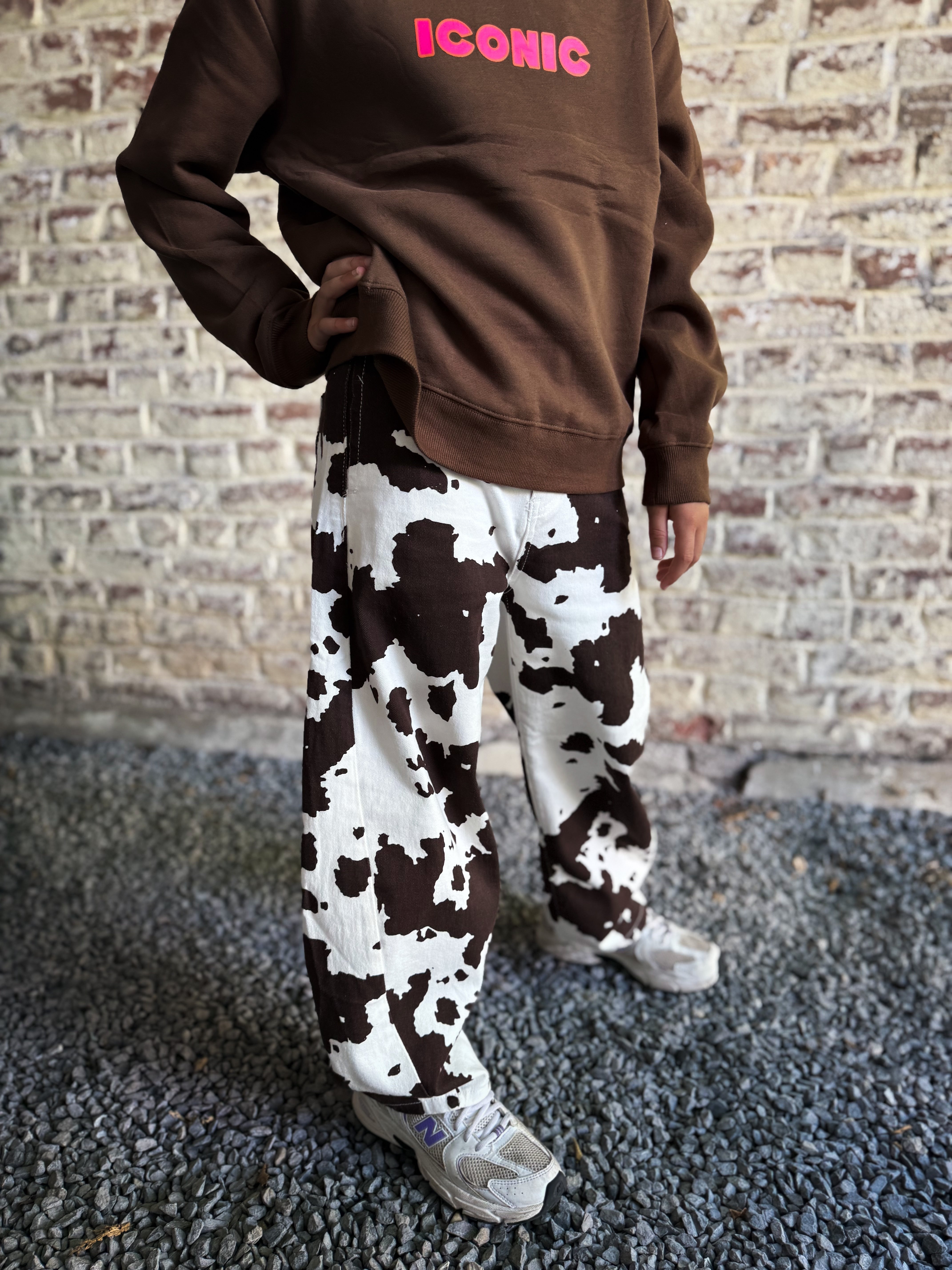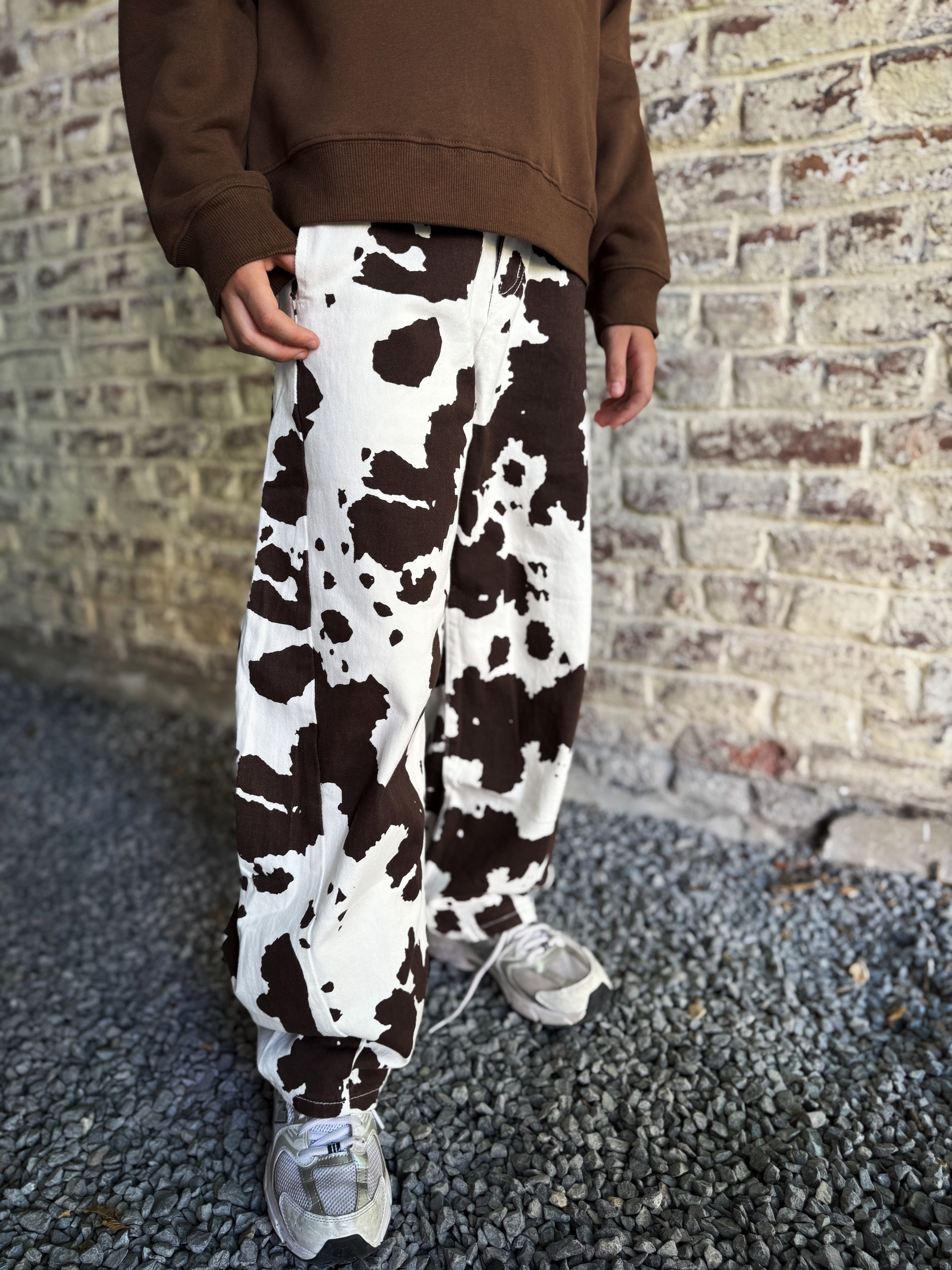 Ce jean enfant à coupe ballon, orné de motifs vache, est disponible de la taille 4 à 14 ans, offrant une touche originale tout en garantissant confort et liberté de mouvement.