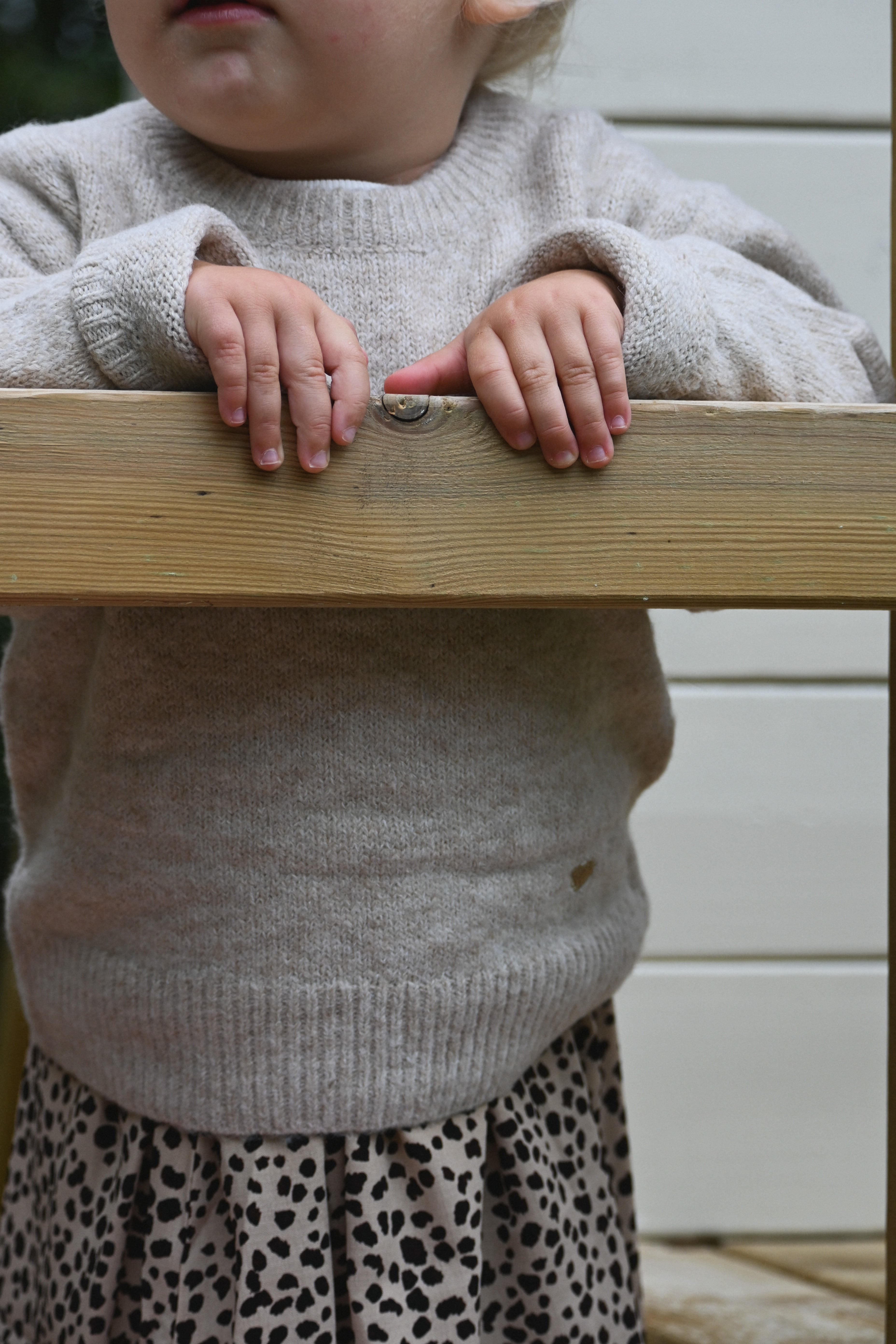 Ce pull en maille beige, à manches longues, est disponible du 2/3 ans au 12 ans. Il présente un col rond et un petit cœur doré délicat, parfait pour ajouter une touche d’élégance aux tenues des enfants.
