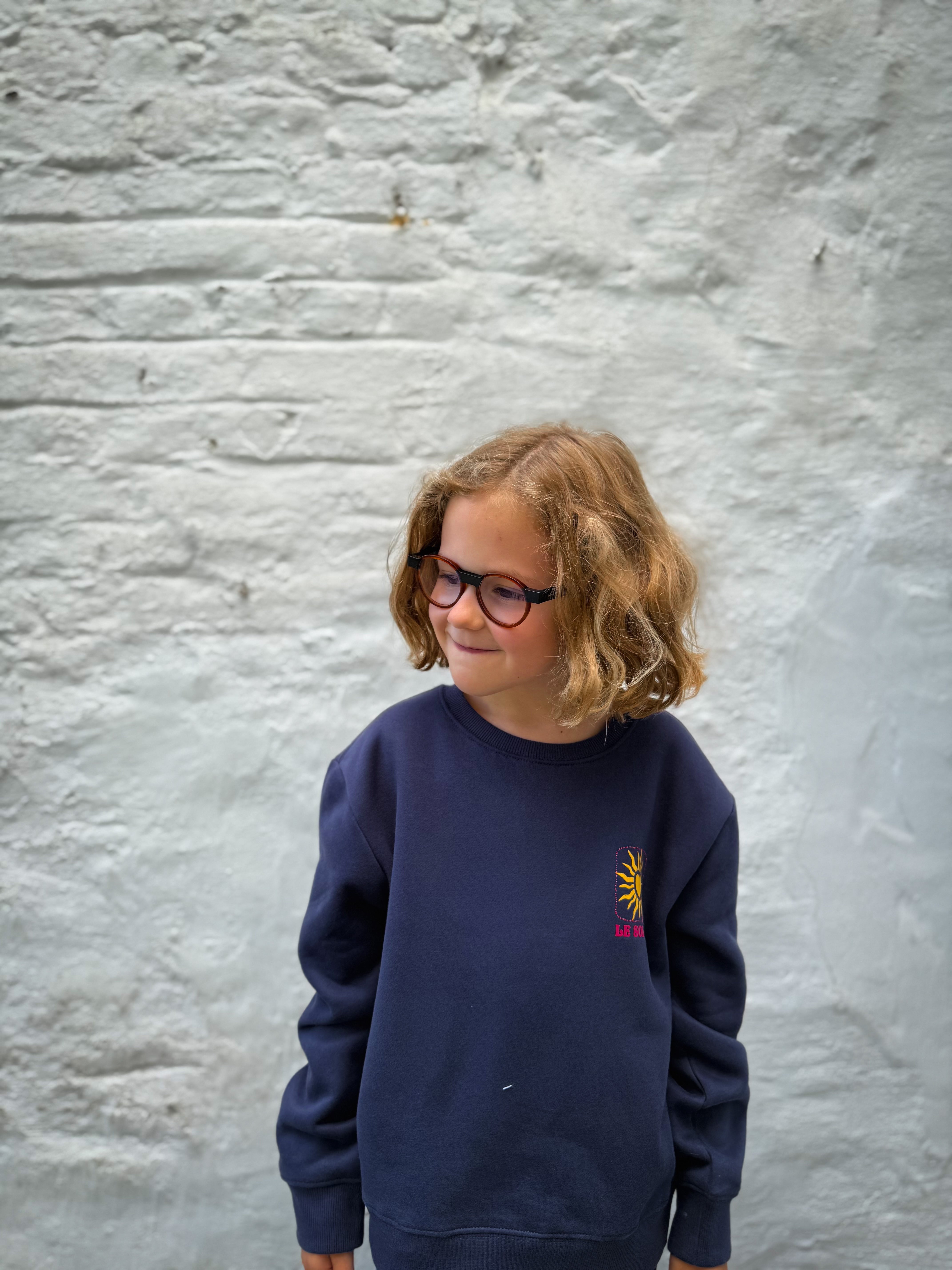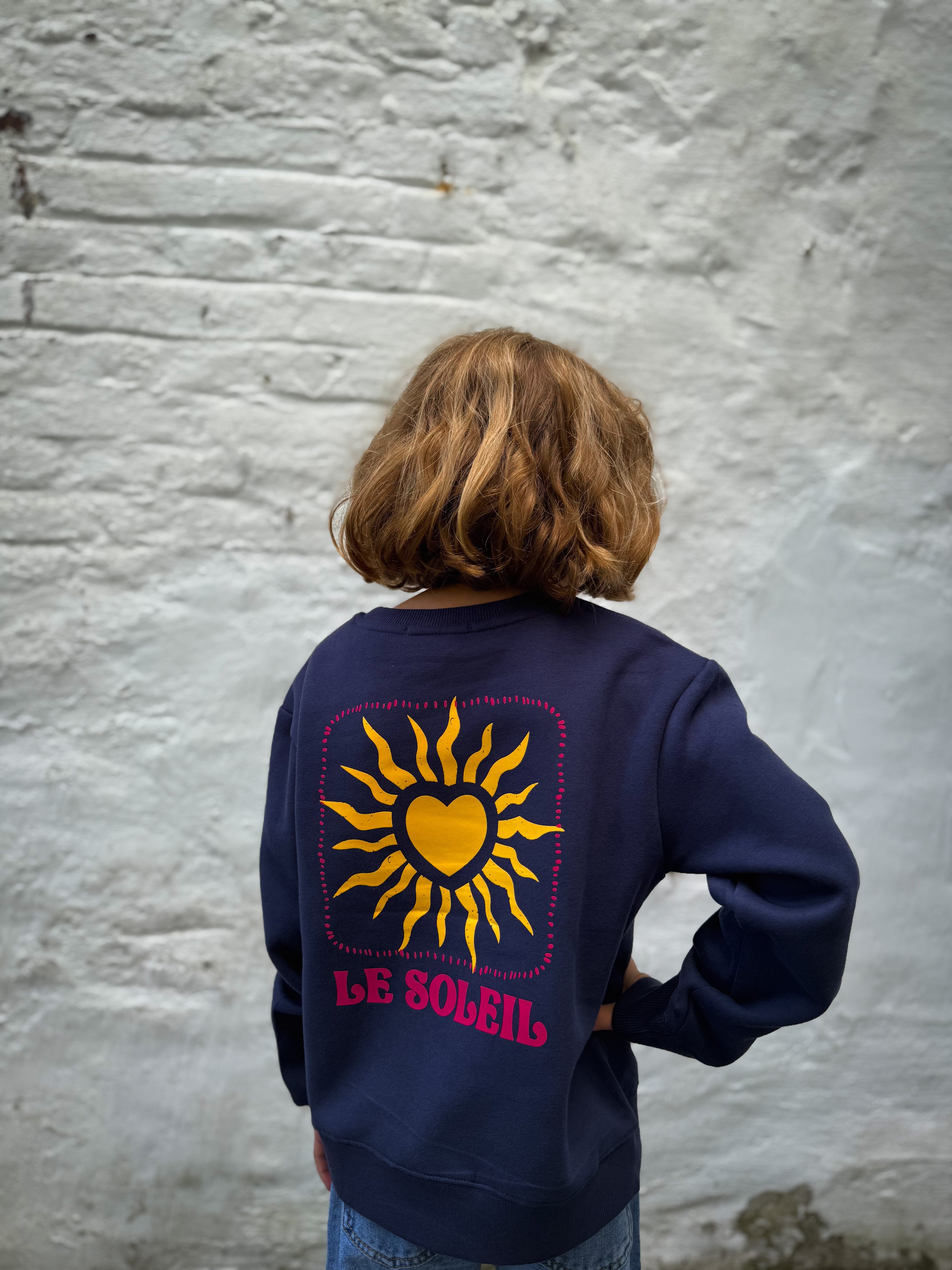 Sweat bleu marine, avec un dessin de soleil à l'avant et dans le dos. Disponible de la taille 2/3 ans à la taille 12 ans.