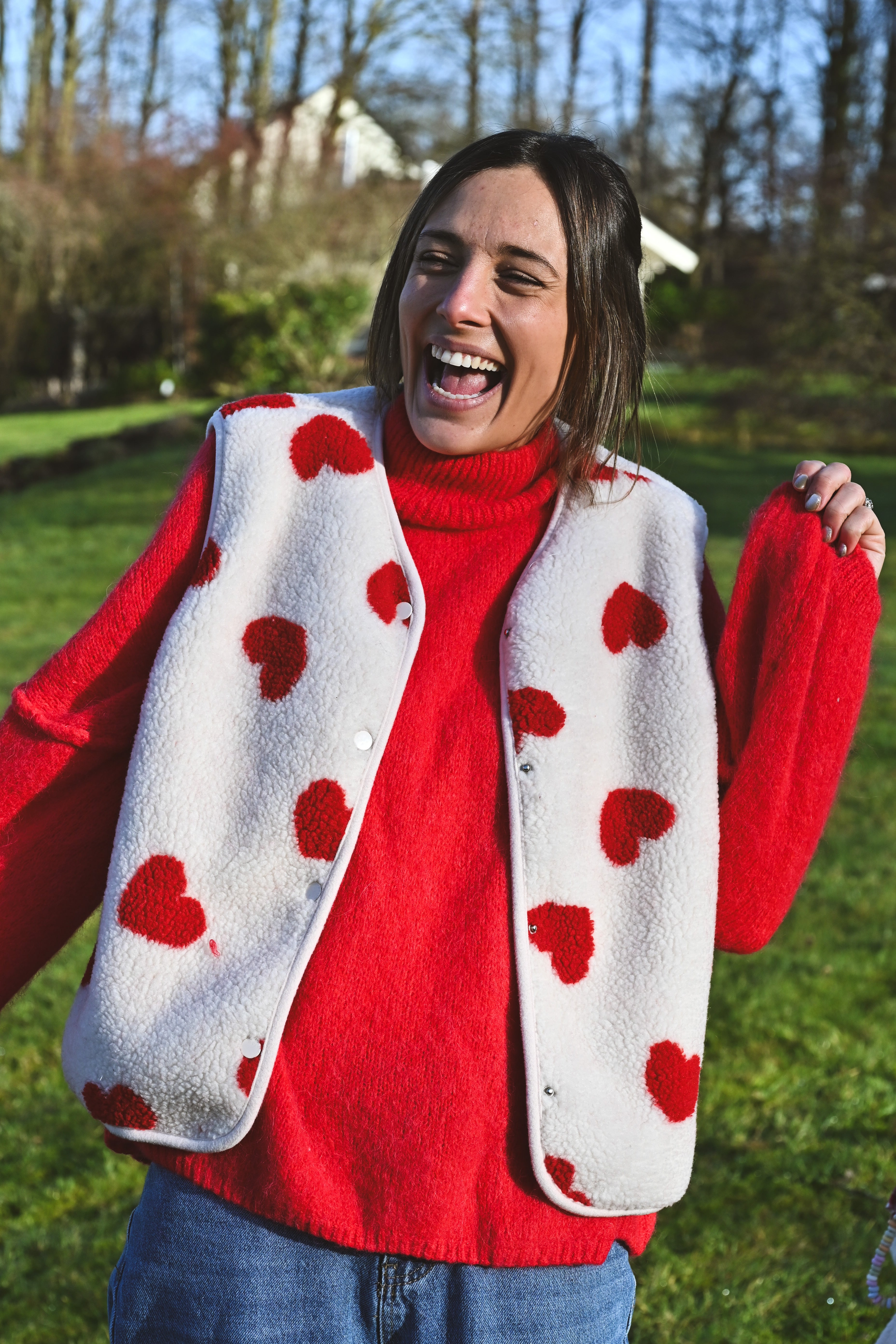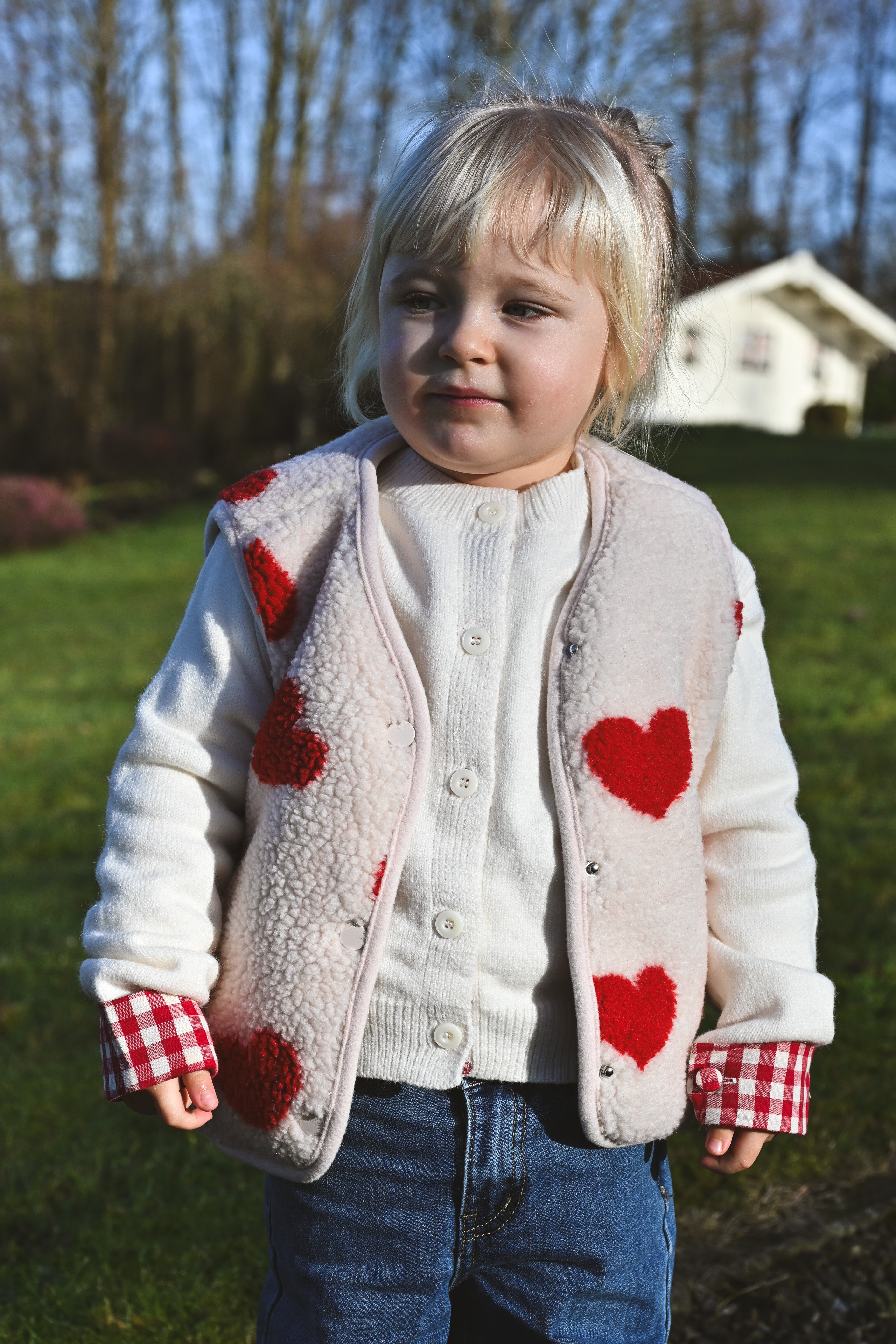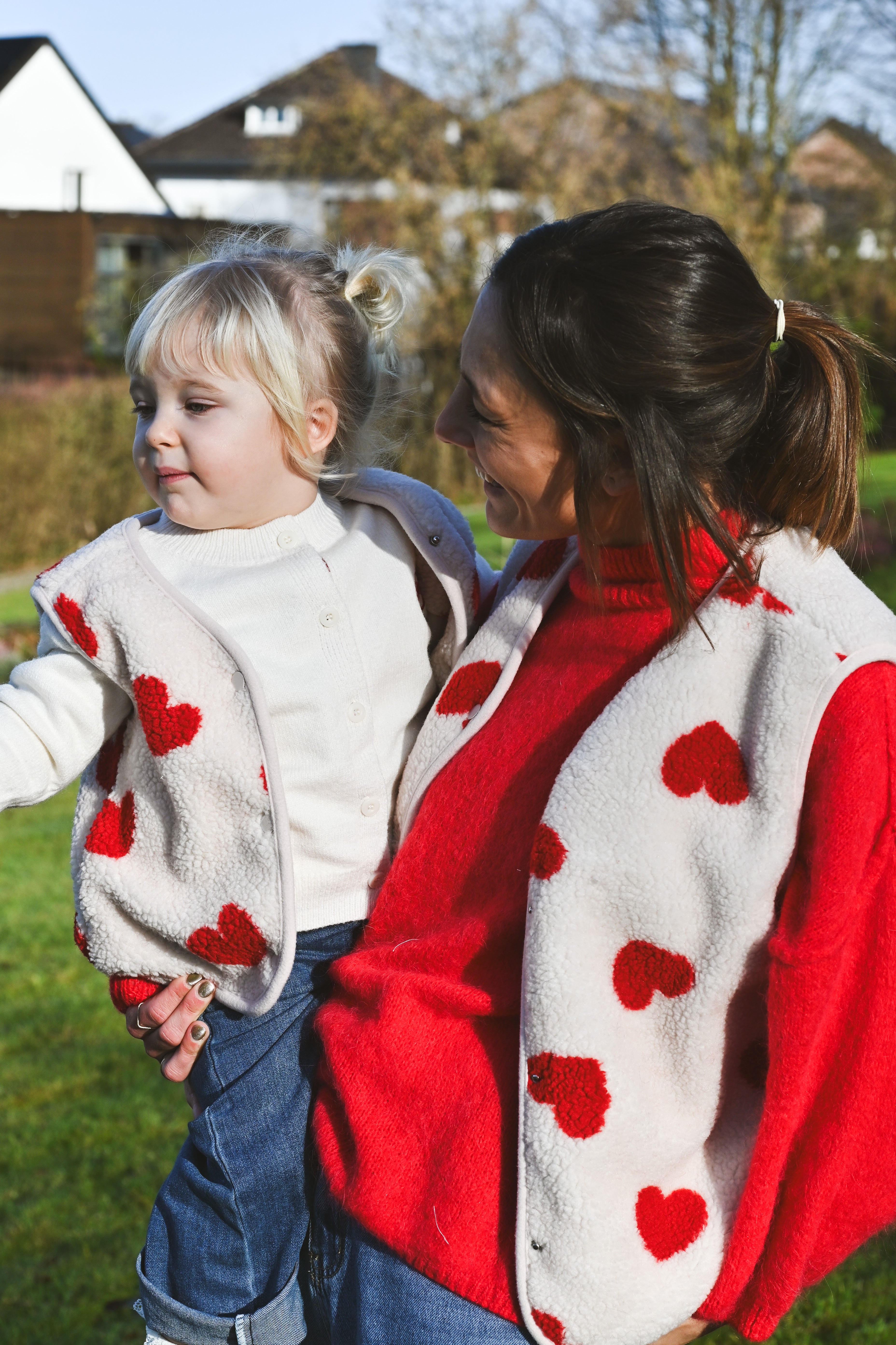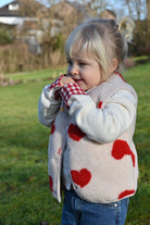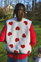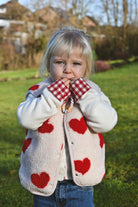 Craquez pour cette veste sans manche ultra-douce en moumoute beige ornée de cœurs rouges. Parfaite pour les enfants et les mamans qui veulent assortir leurs looks ! Confortable et tendance, elle devient l'incontournable de la garde-robe hivernale en duo.