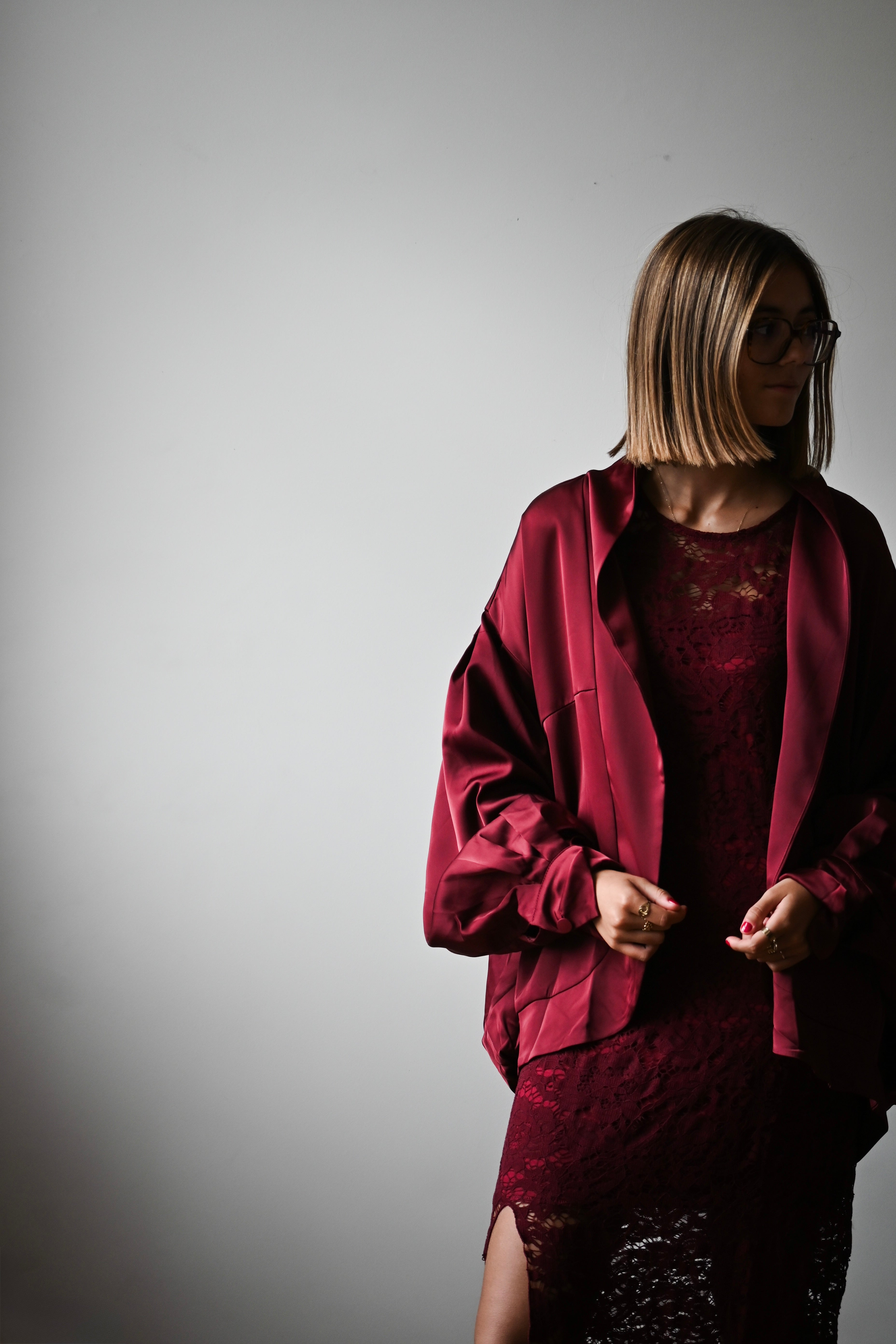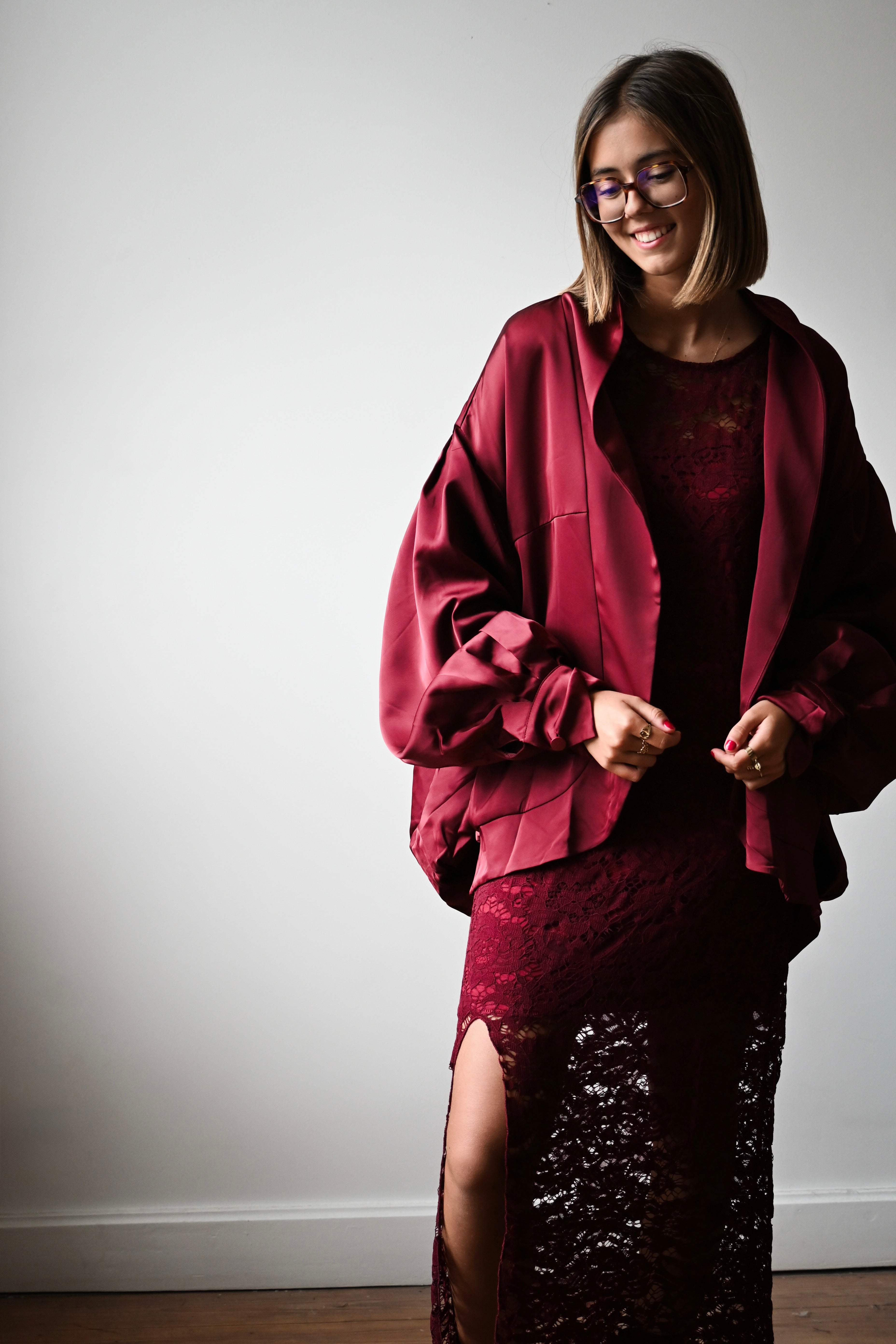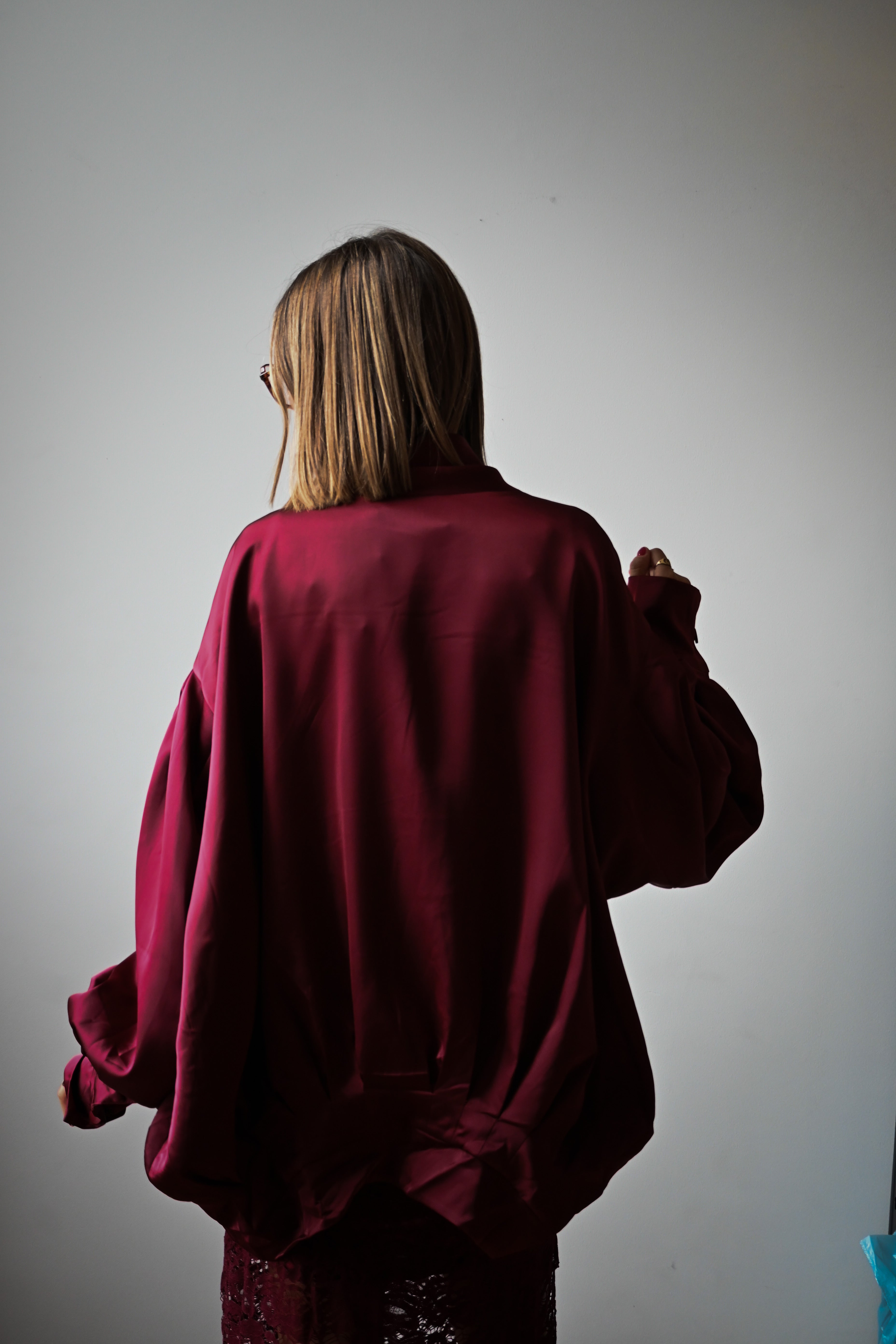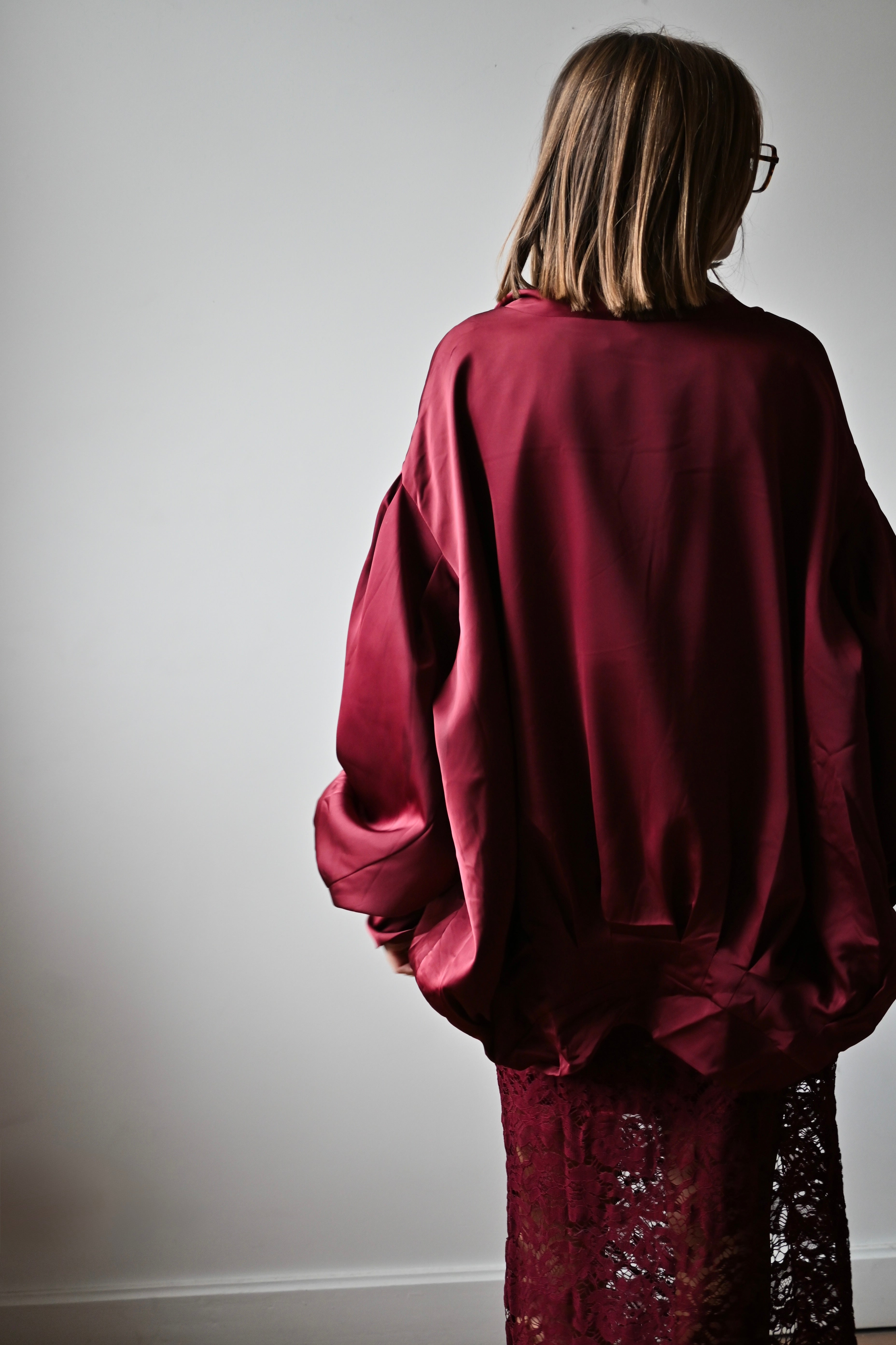 Découvrez ce bomber satiné extra-large en bordeaux, proposée en taille unique pour un look audacieux et confortable.