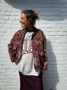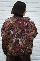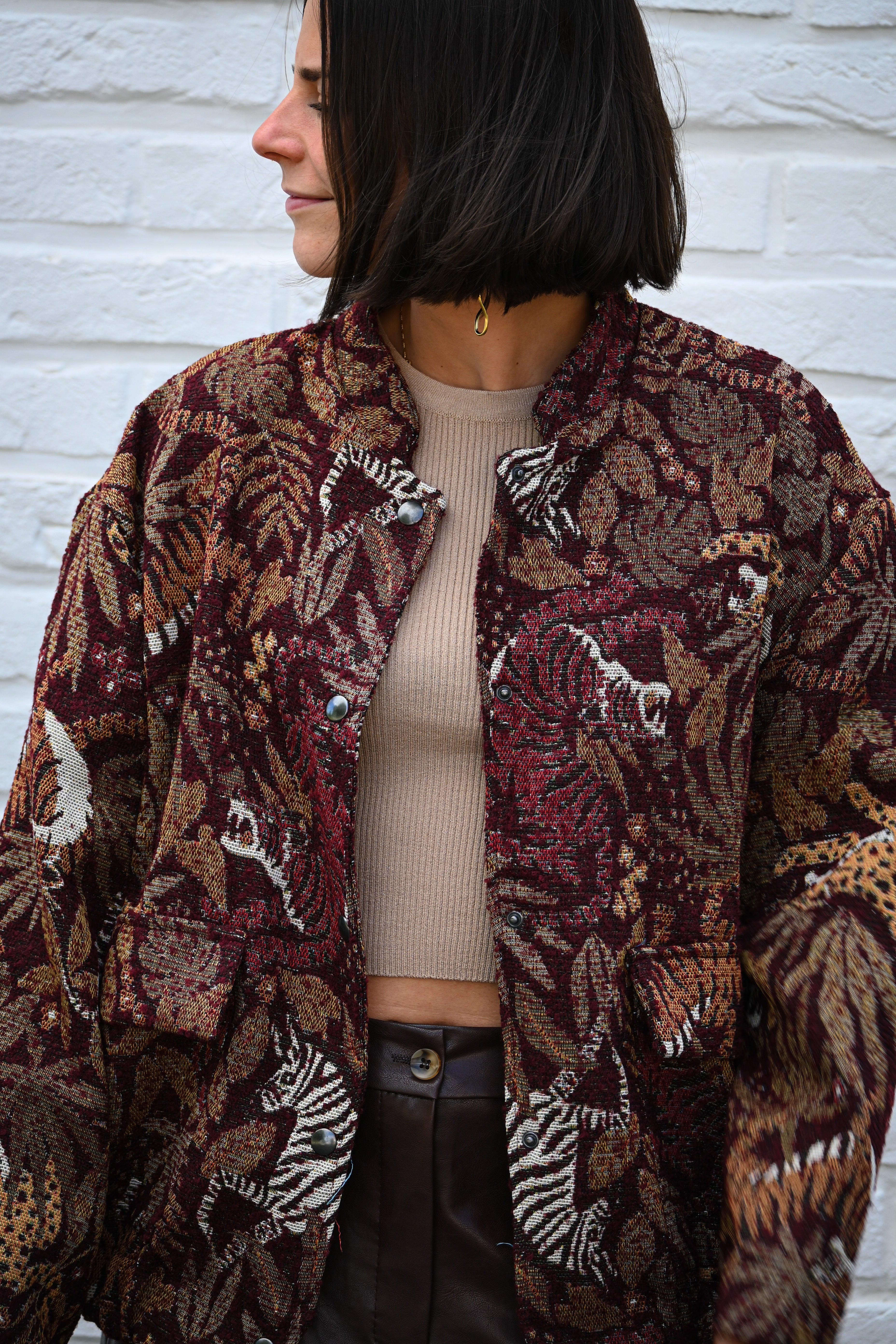 Adoptez un style audacieux avec cette veste bomber ornée d’un motif animalier et de feuilles, déclinée dans des nuances riches de bordeaux.