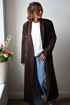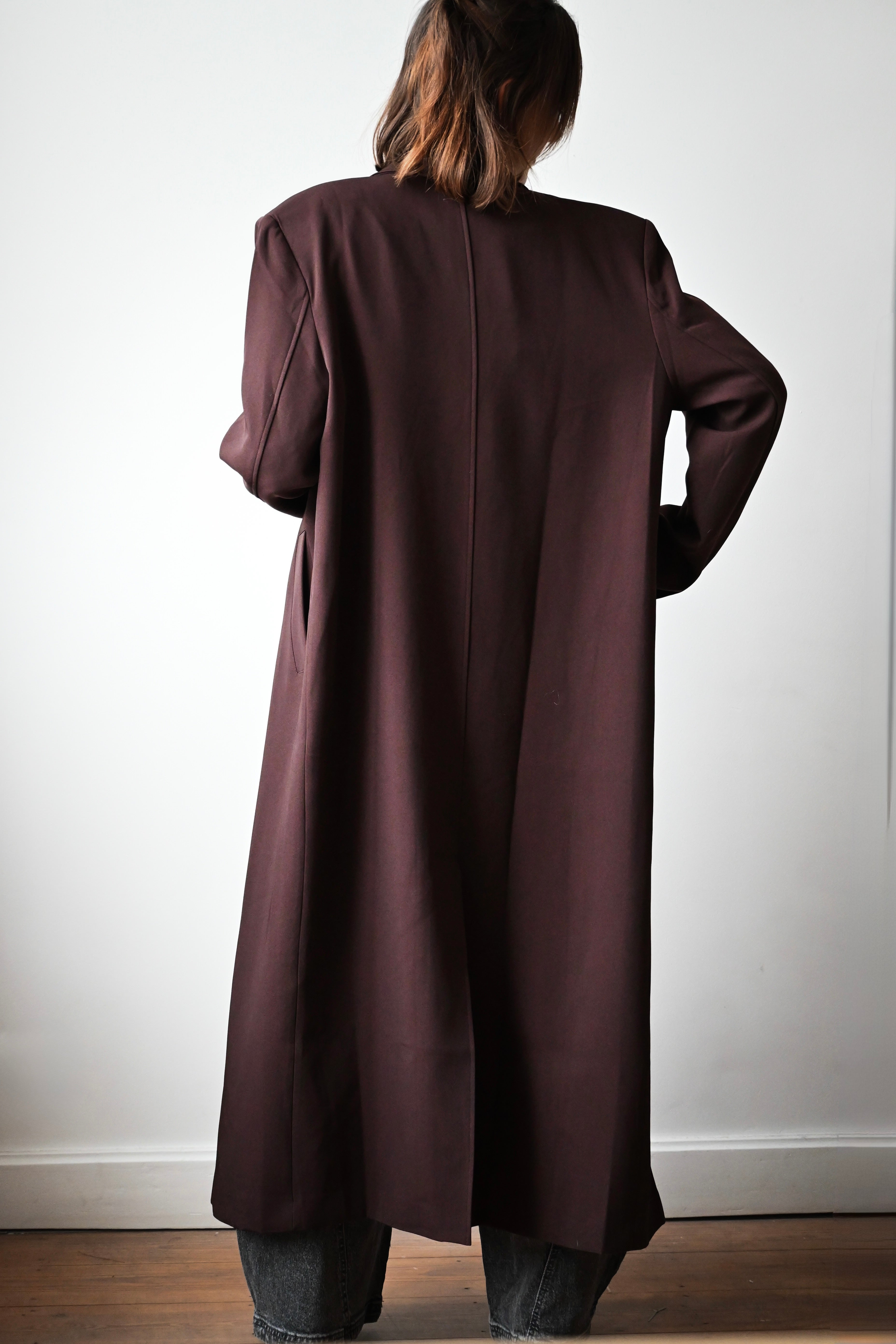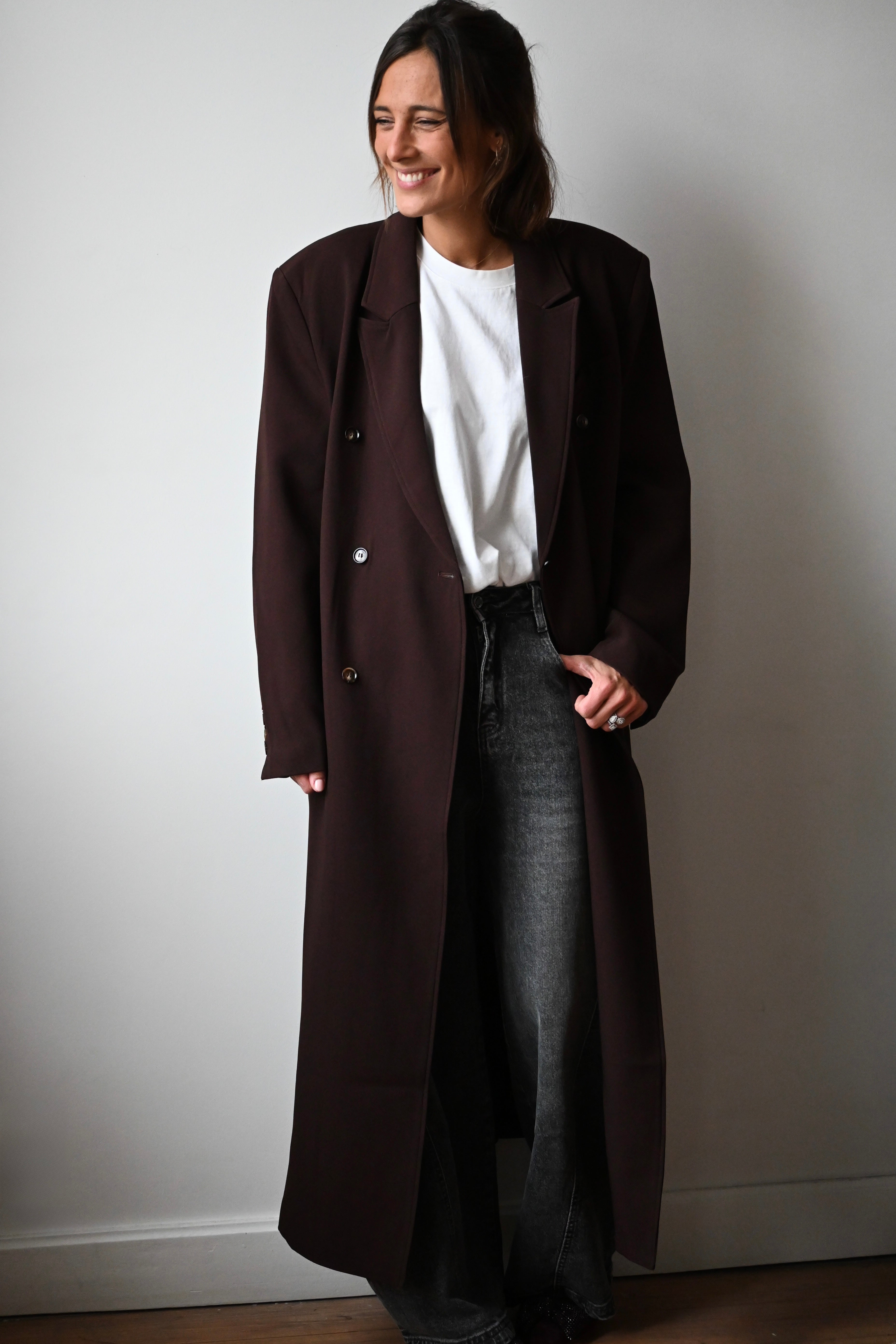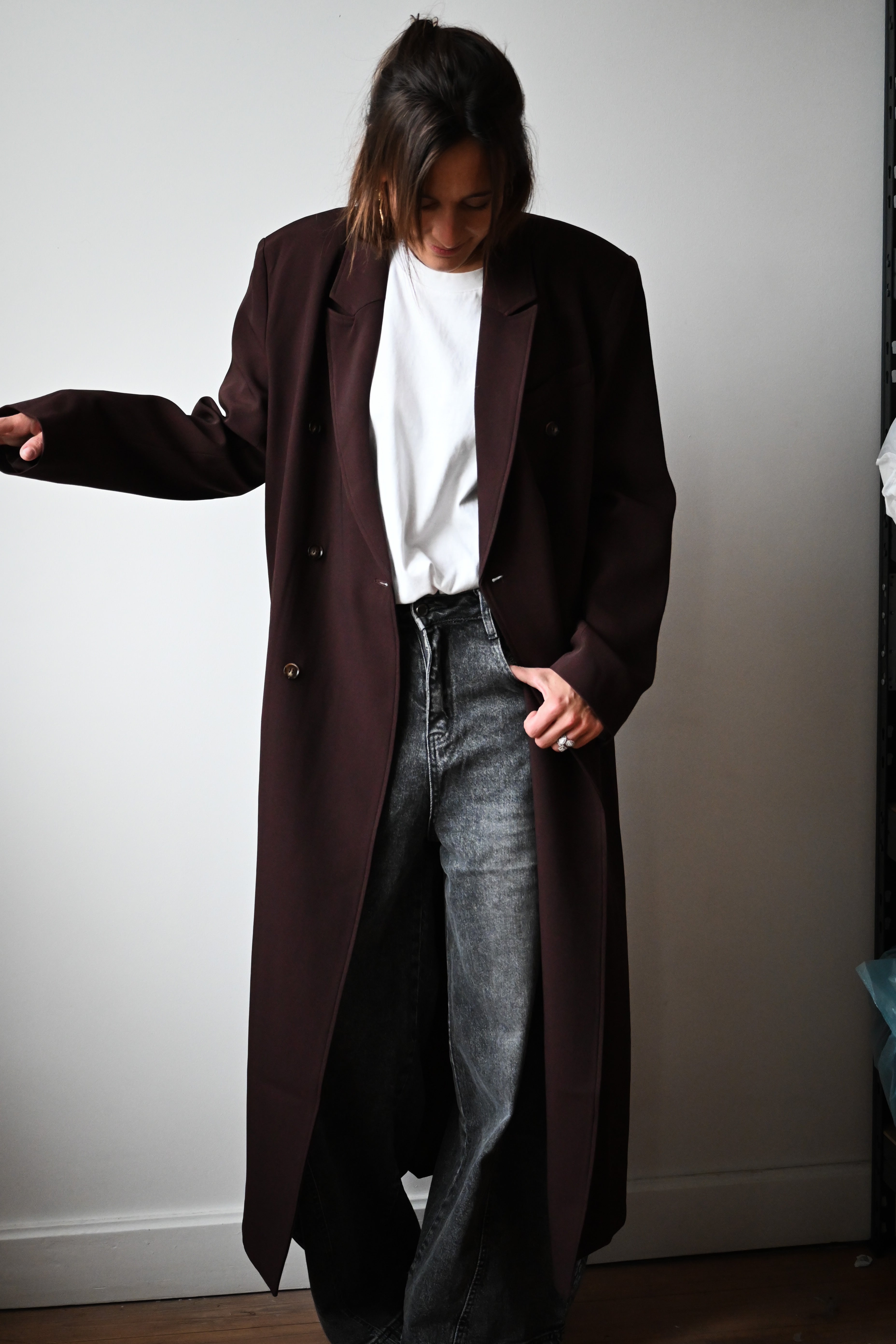 Découvrez ce manteau extra-long en tissu blazer, proposé en tailles S/M et M/L, disponible dans un élégant coloris bordeaux. Parfait pour allier style et confort avec une touche sophistiquée.