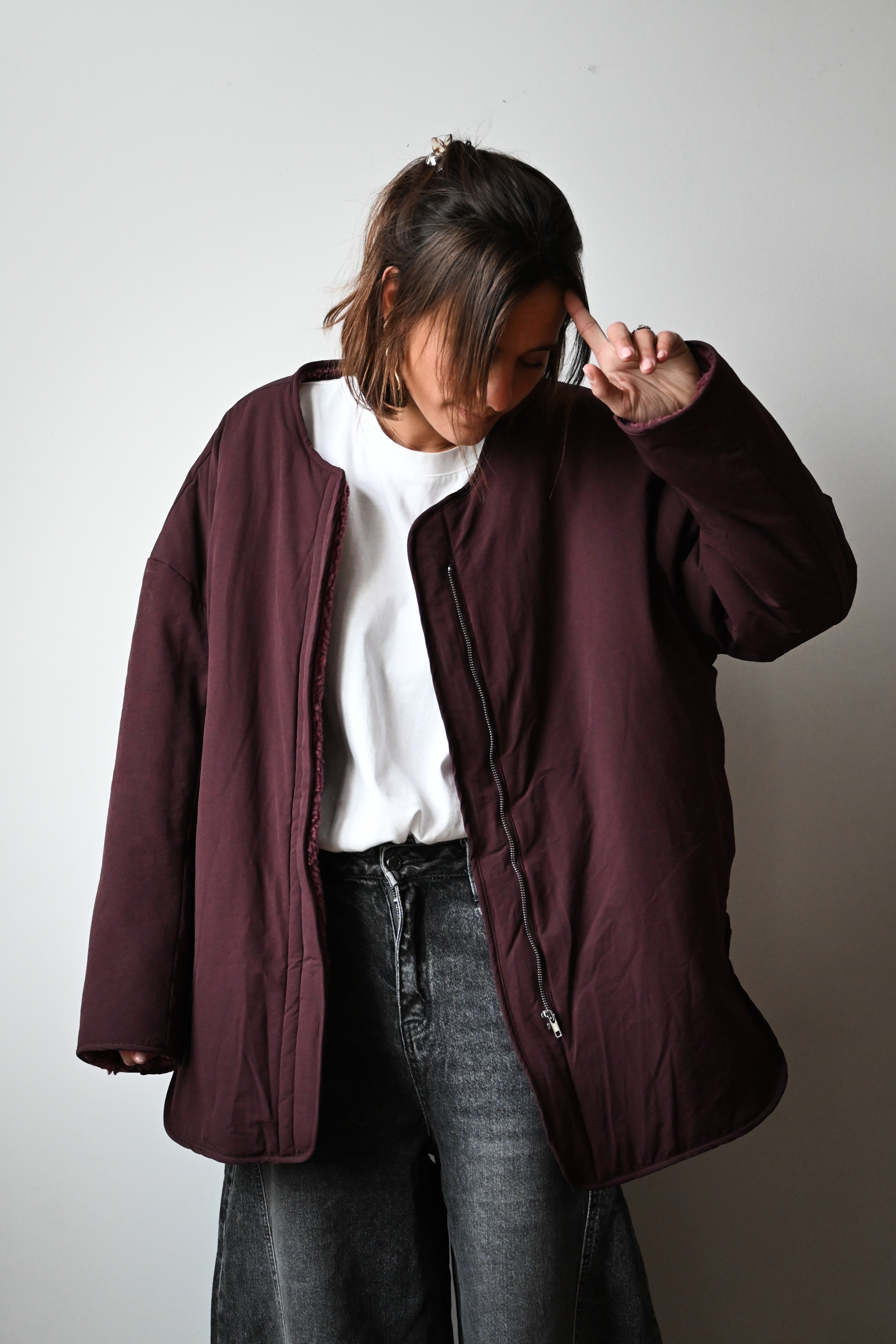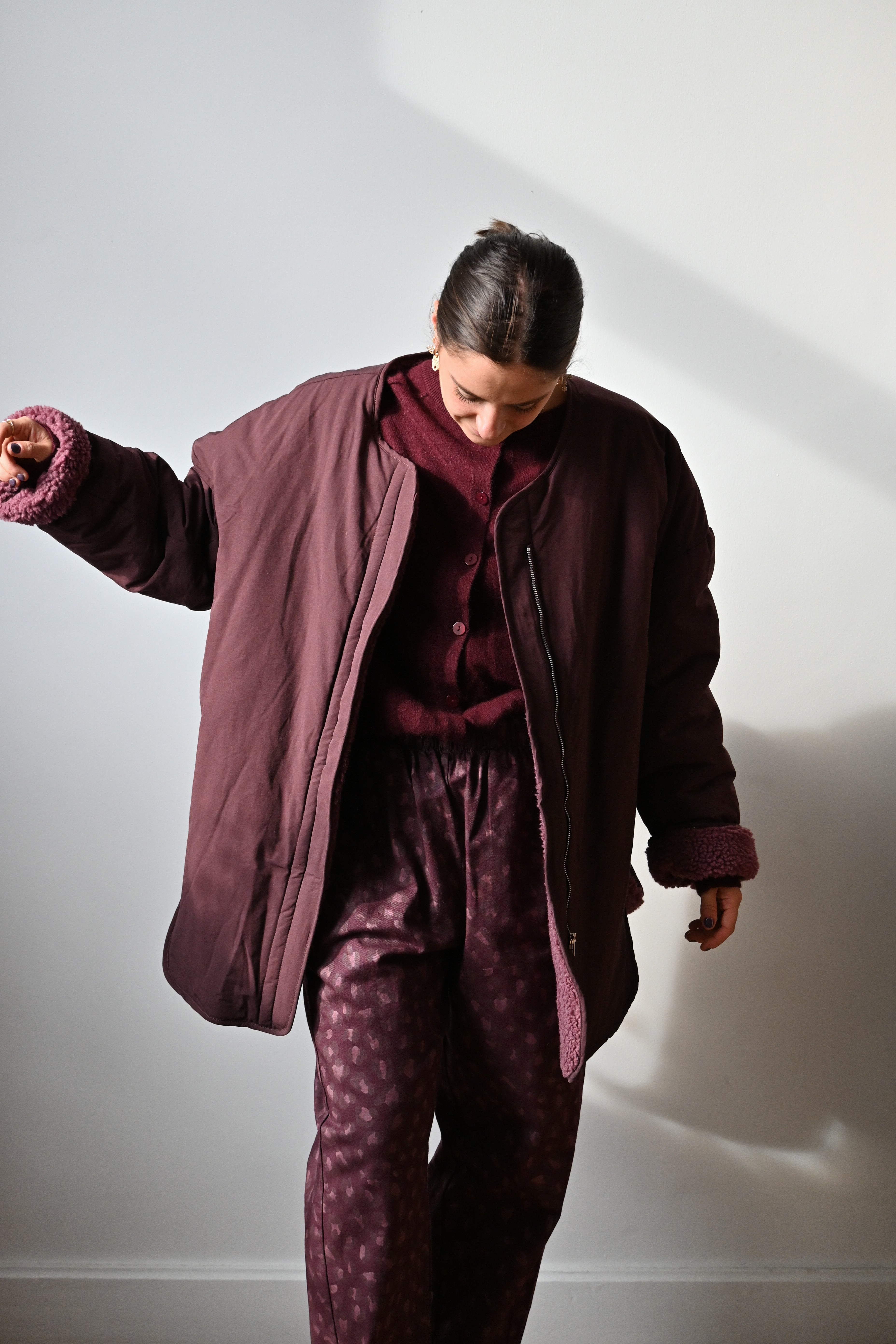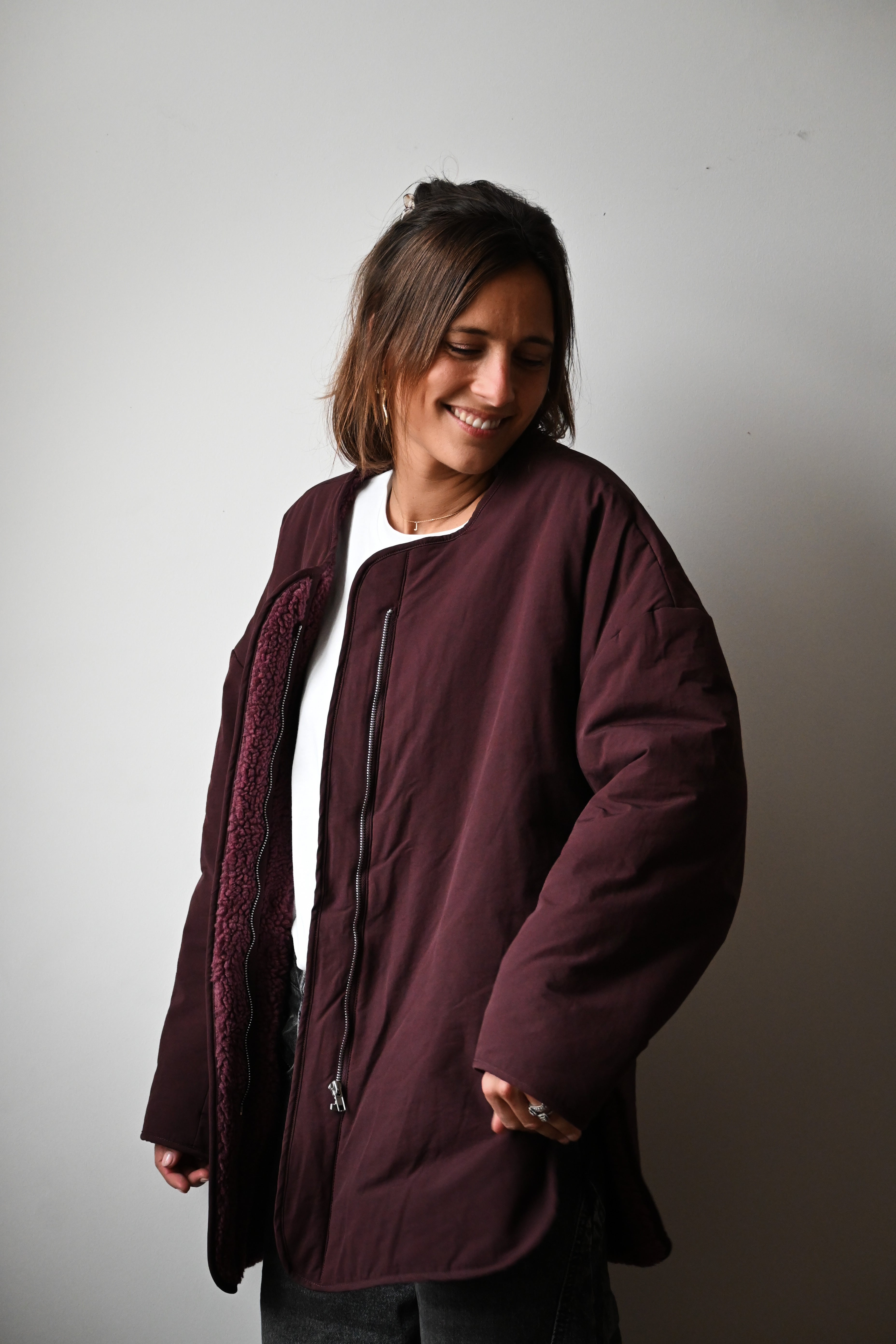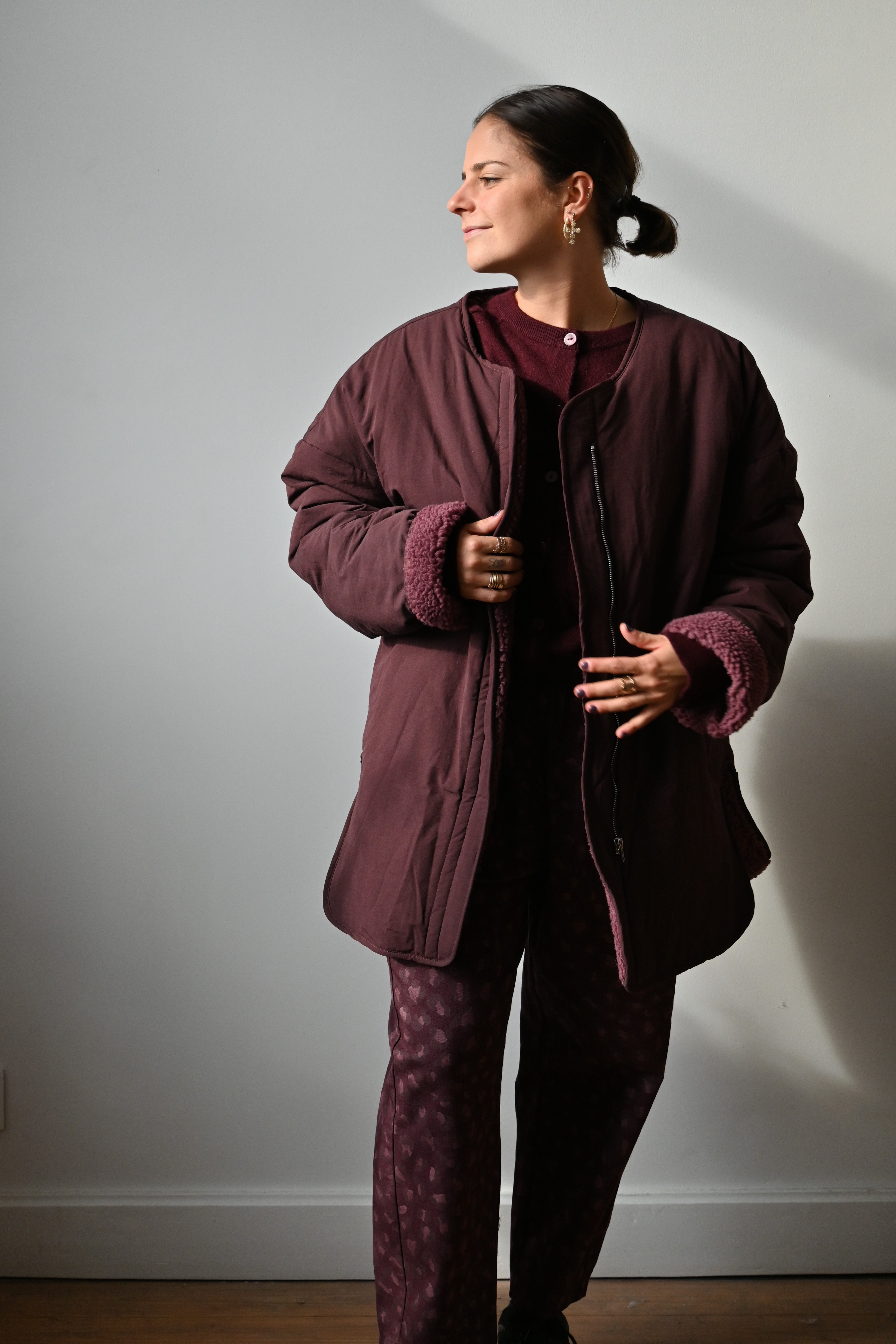Veste mi-longue bordeaux réversible avec col rond, doublée de fourrure d’un côté, proposée en tailles S/M et M/L. Cette pièce allie élégance et confort pour une allure distinguée en toute saison.