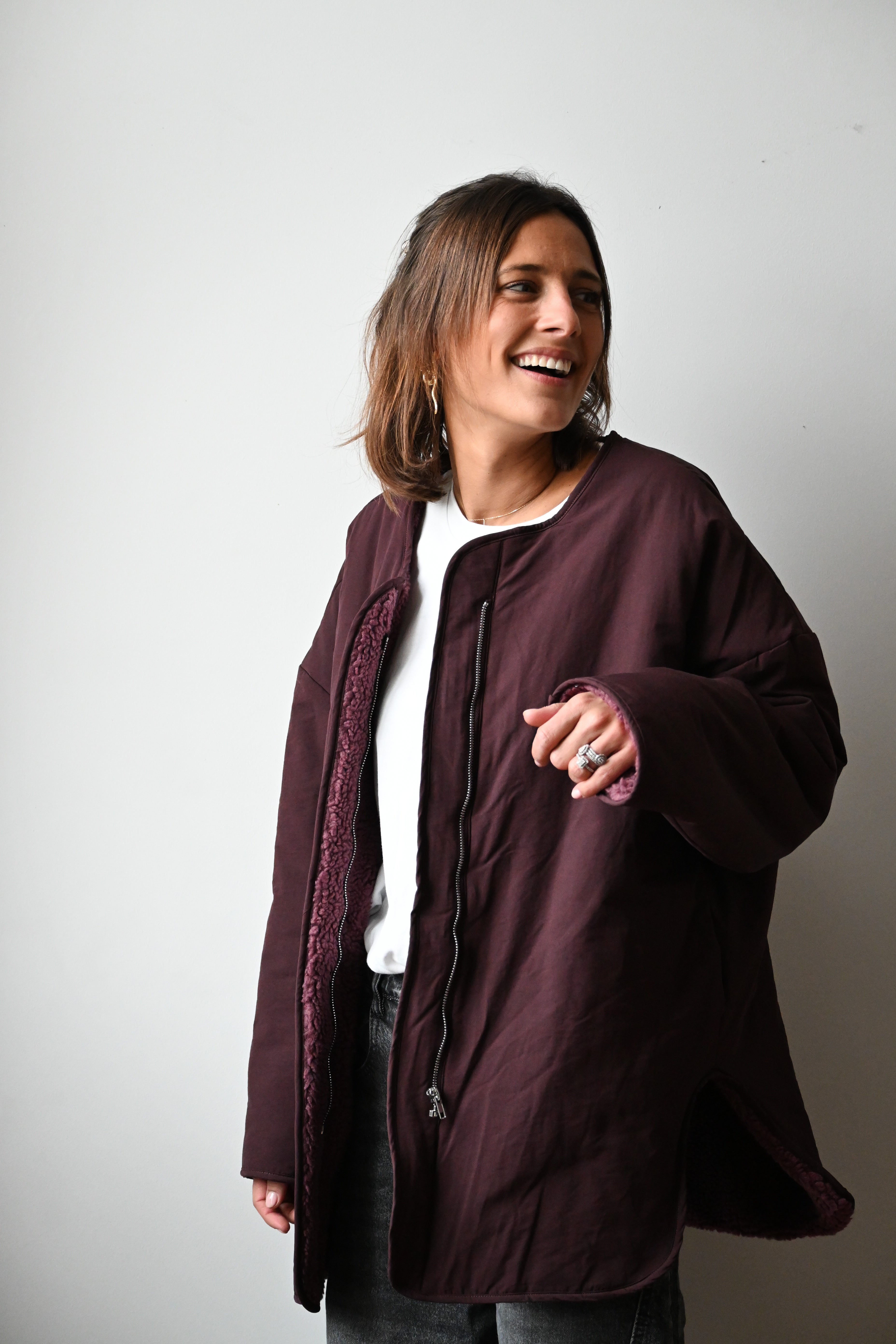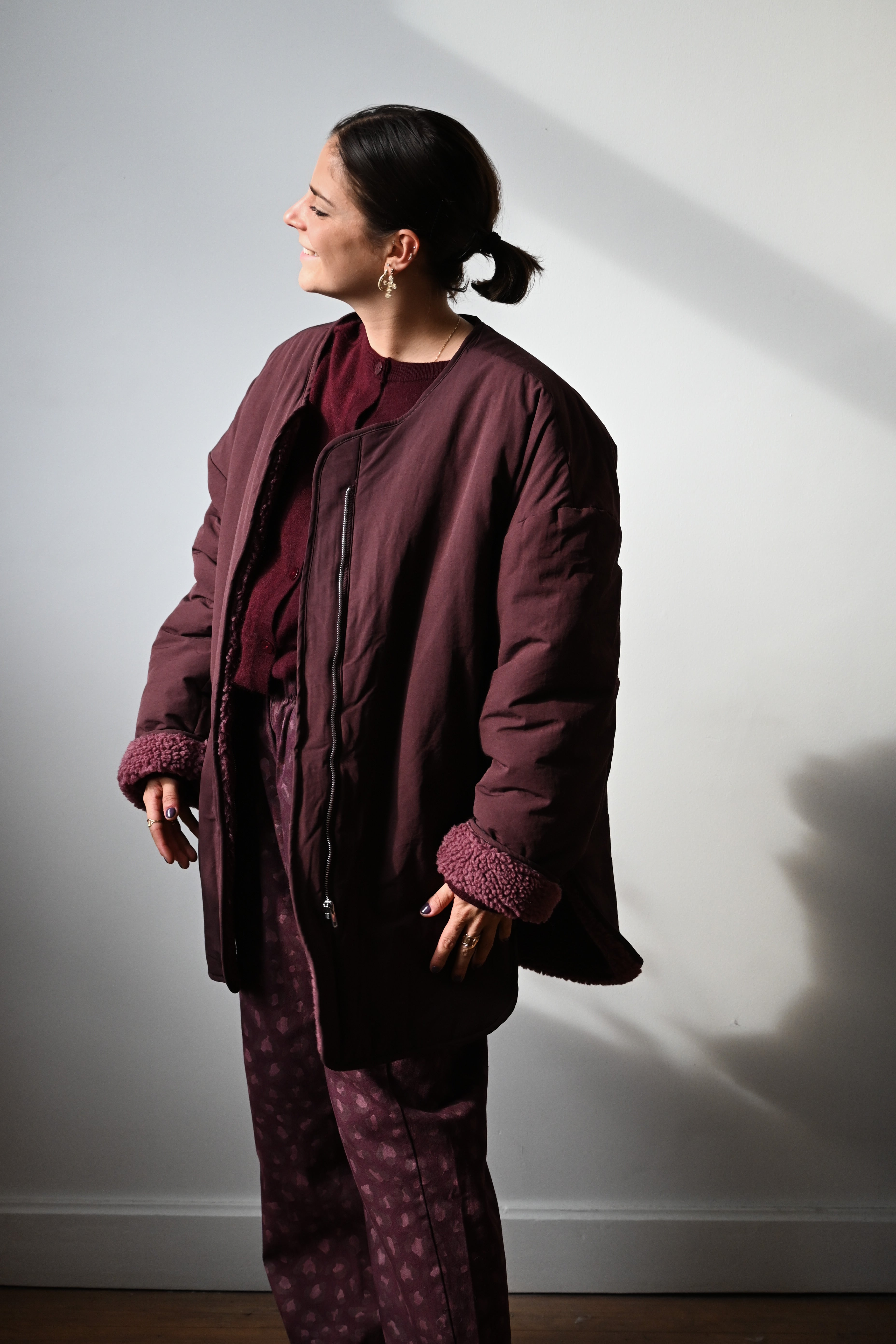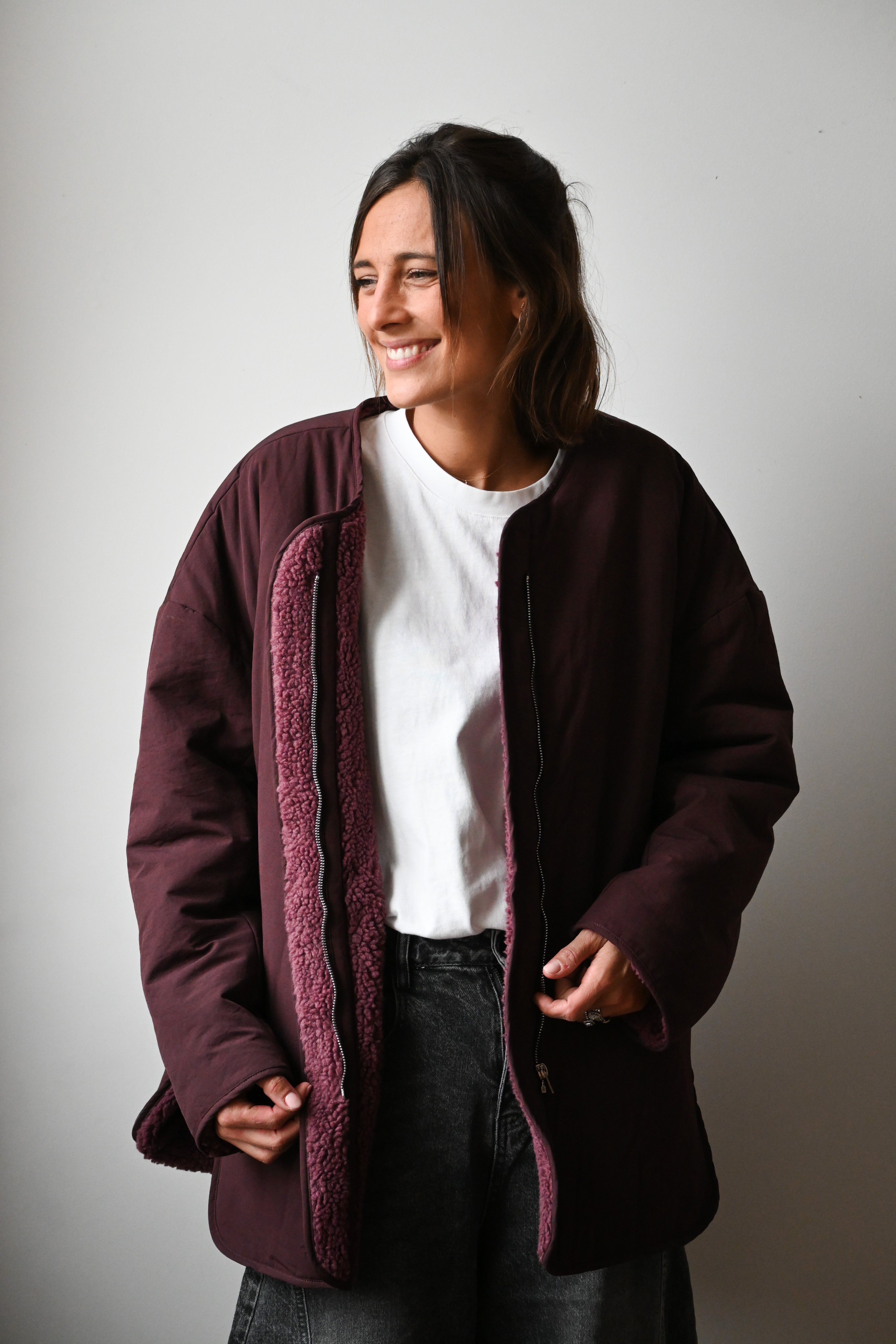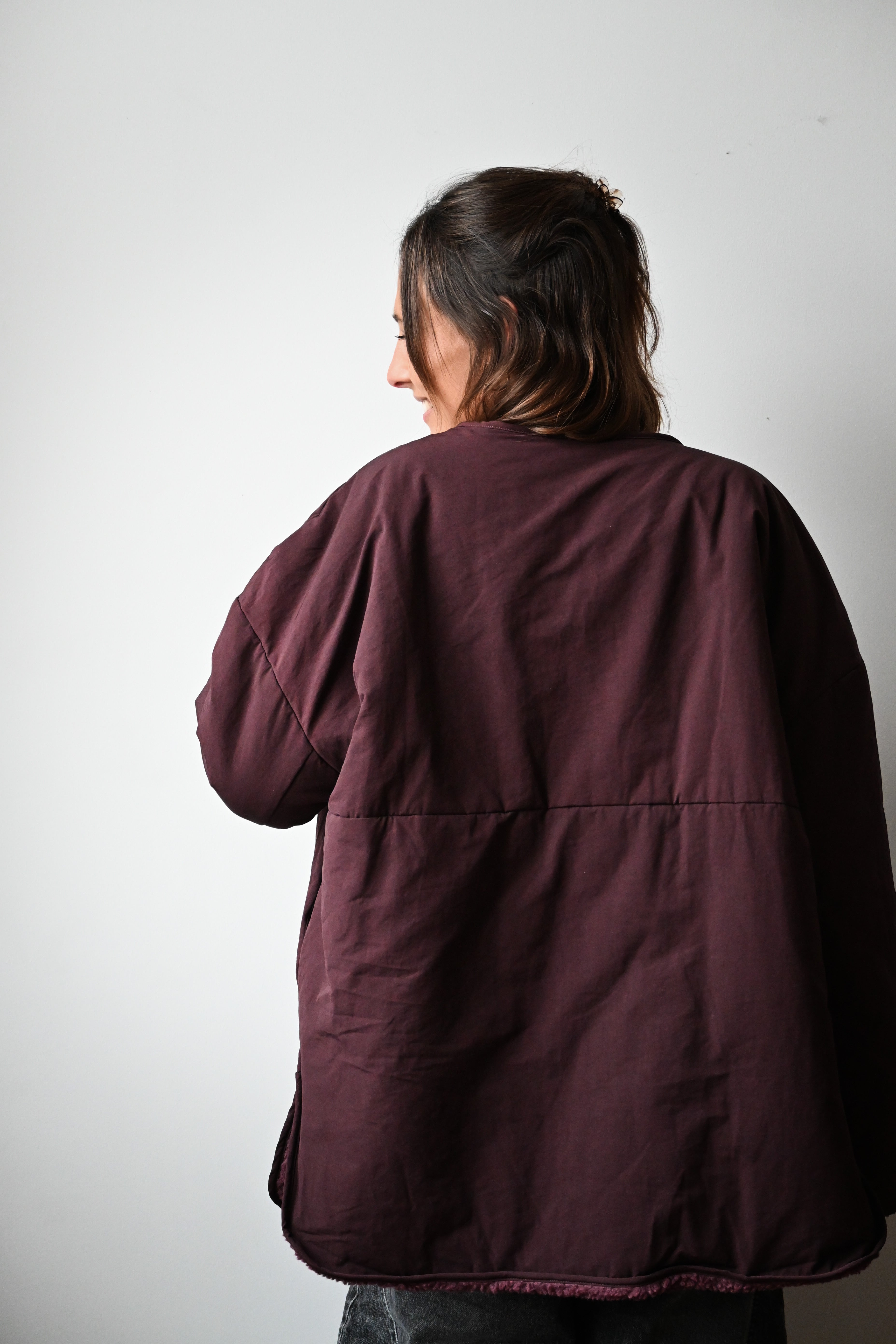 Veste mi-longue bordeaux réversible avec col rond, doublée de fourrure d’un côté, proposée en tailles S/M et M/L. Cette pièce allie élégance et confort pour une allure distinguée en toute saison.