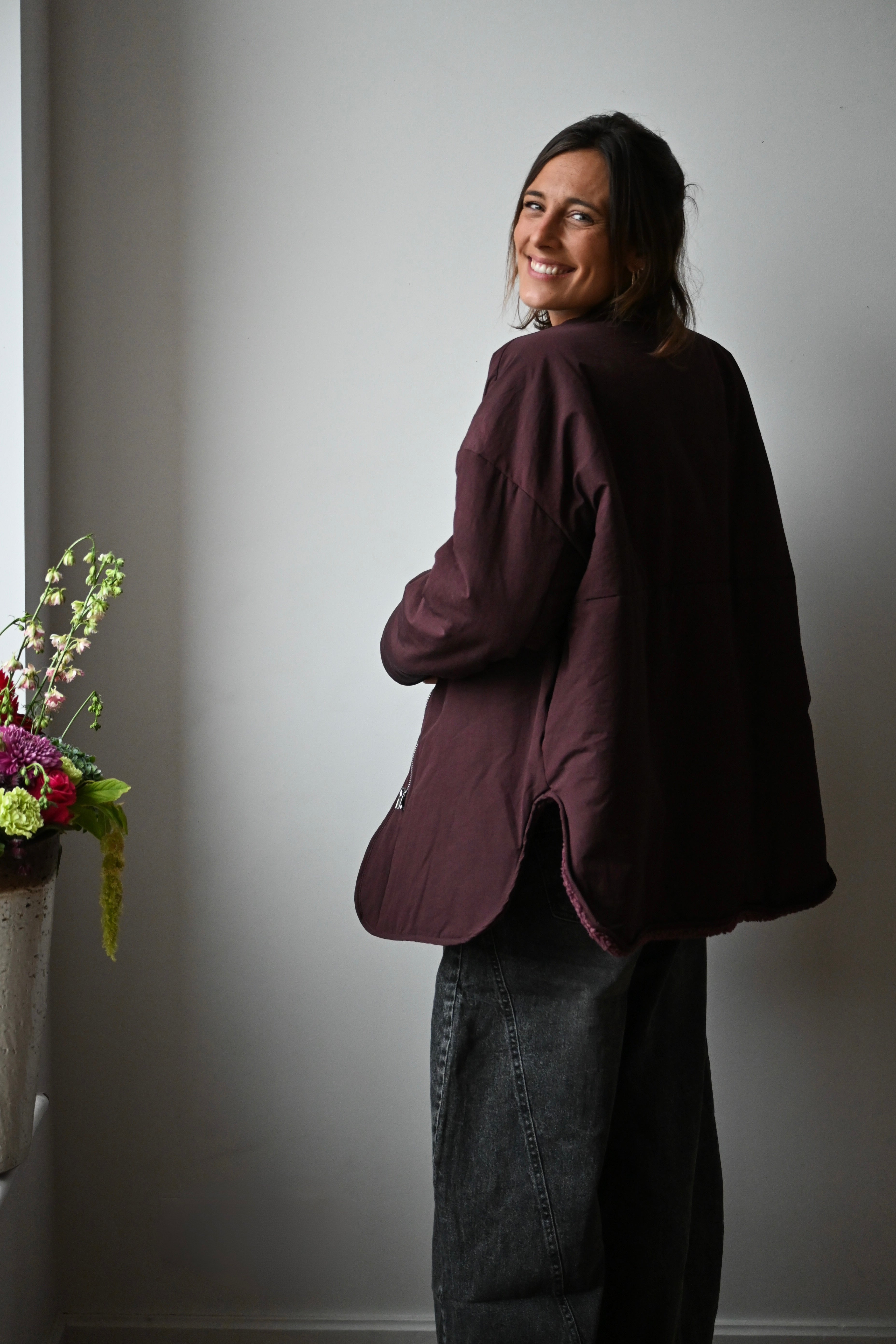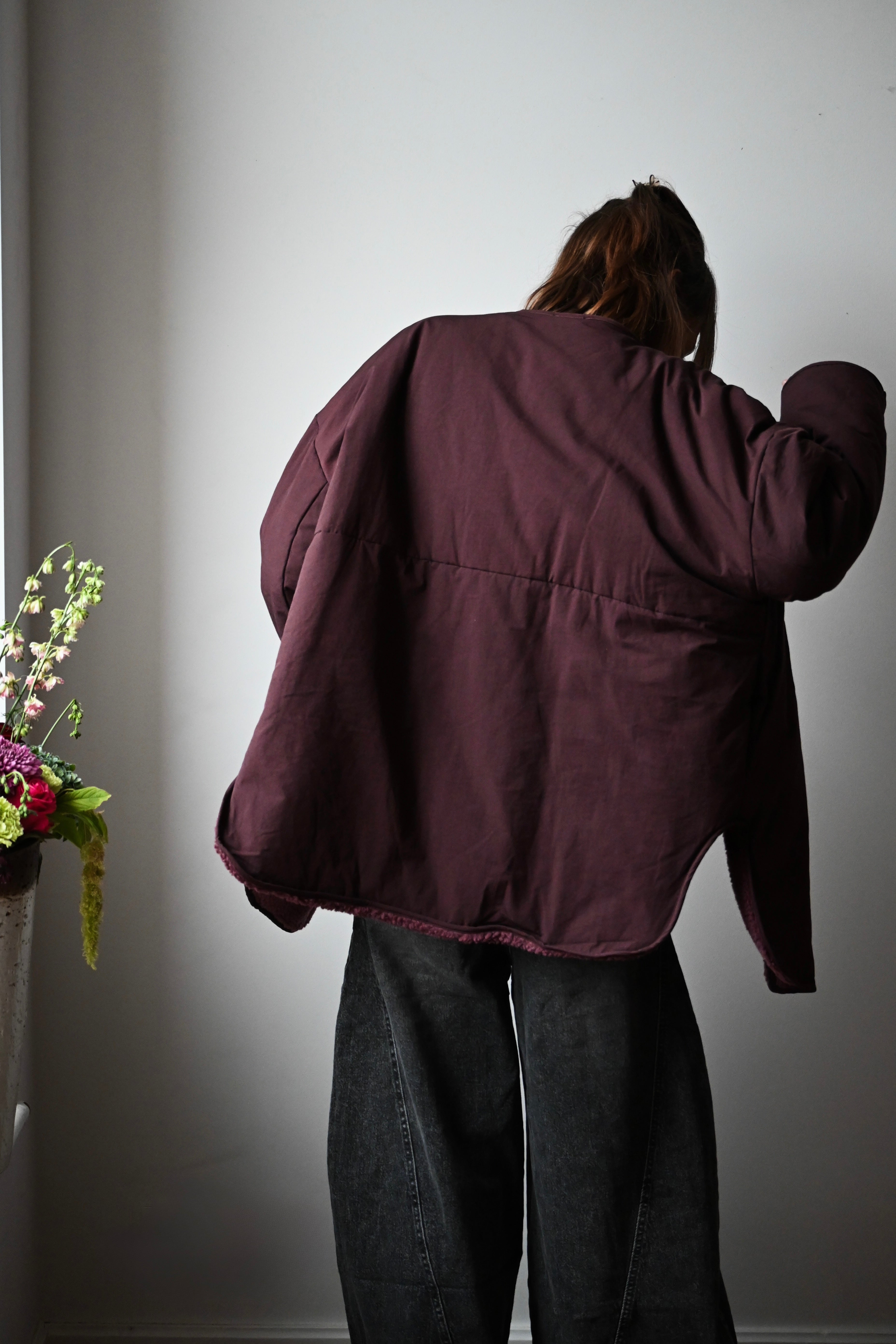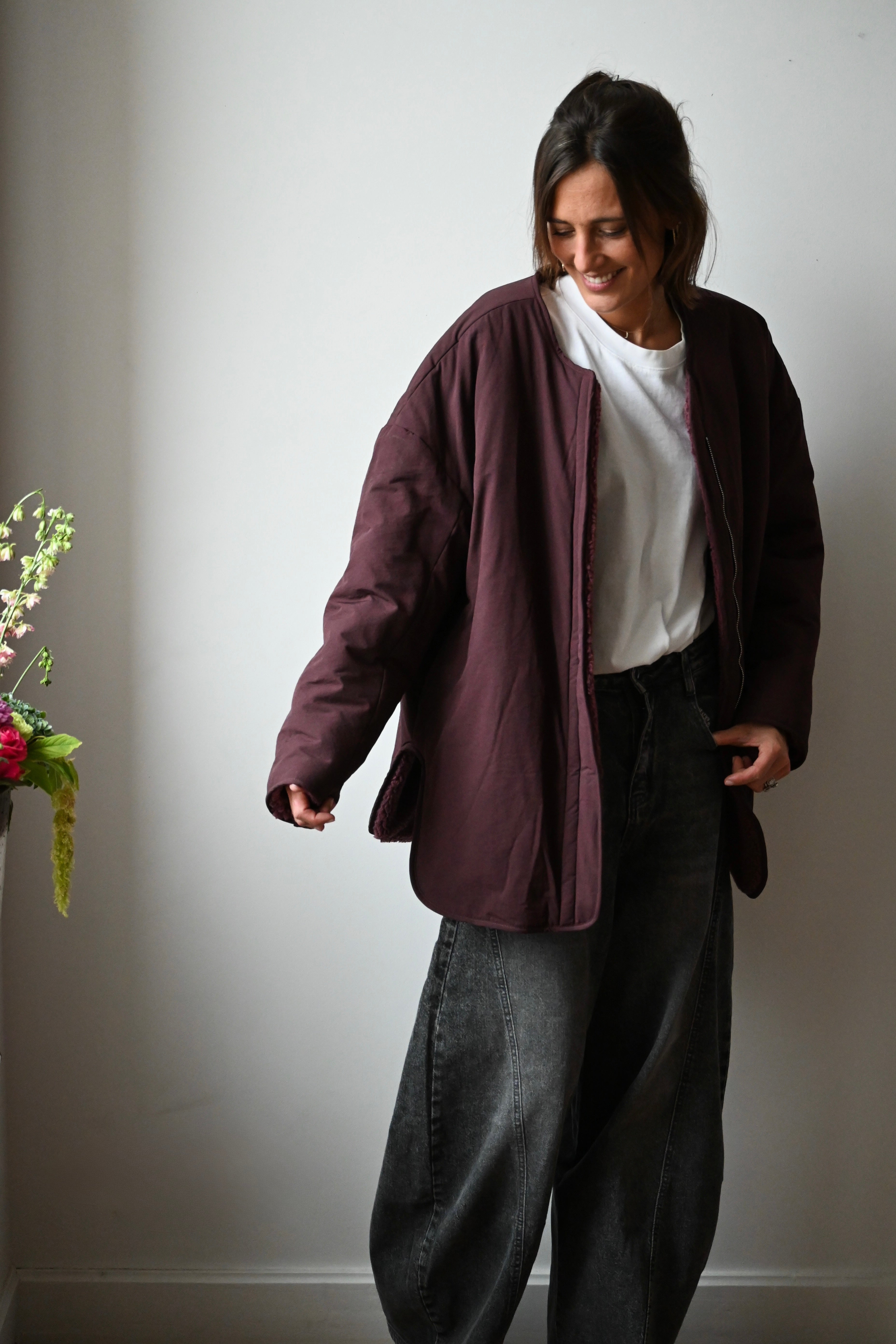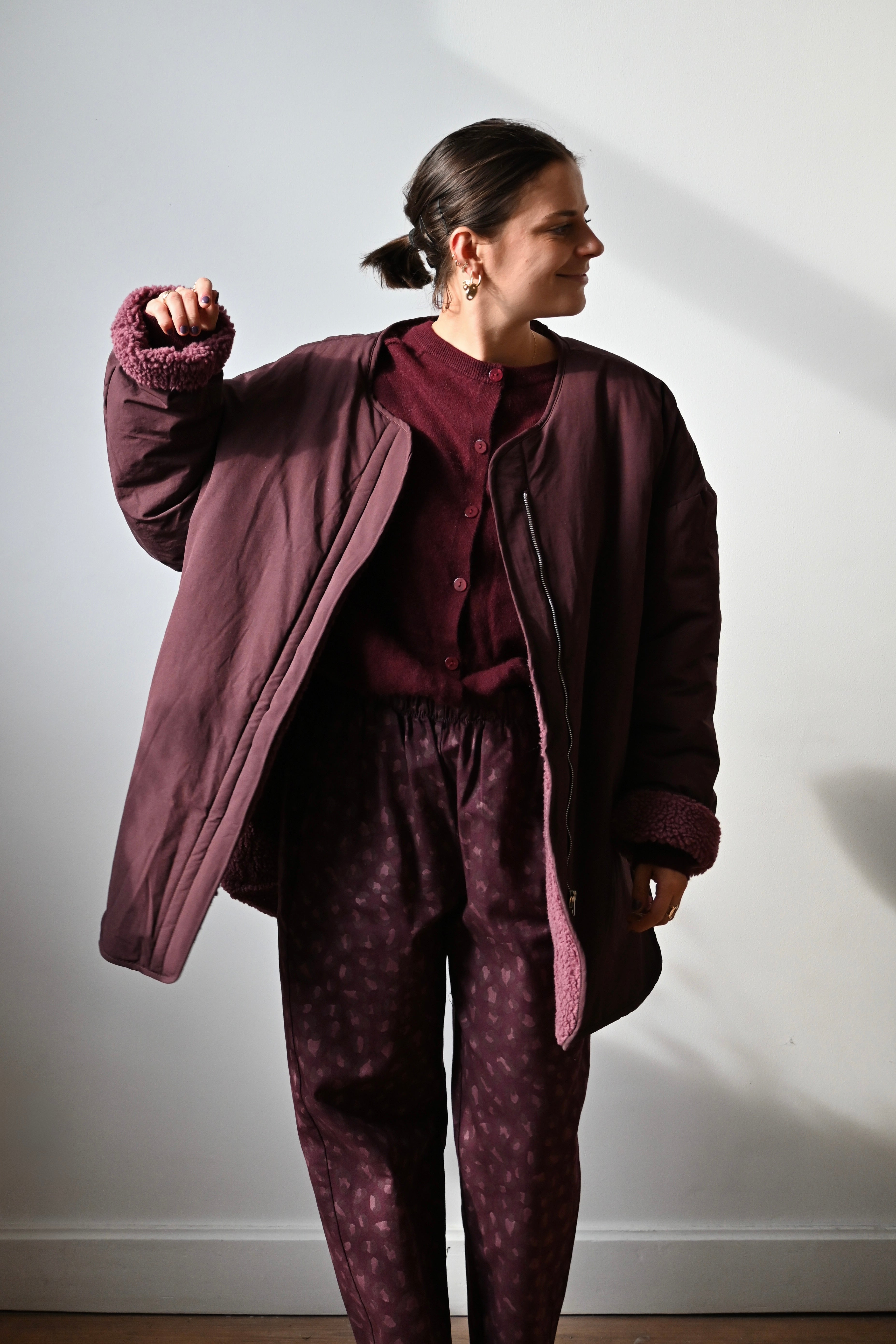 Veste mi-longue bordeaux réversible avec col rond, doublée de fourrure d’un côté, proposée en tailles S/M et M/L. Cette pièce allie élégance et confort pour une allure distinguée en toute saison.