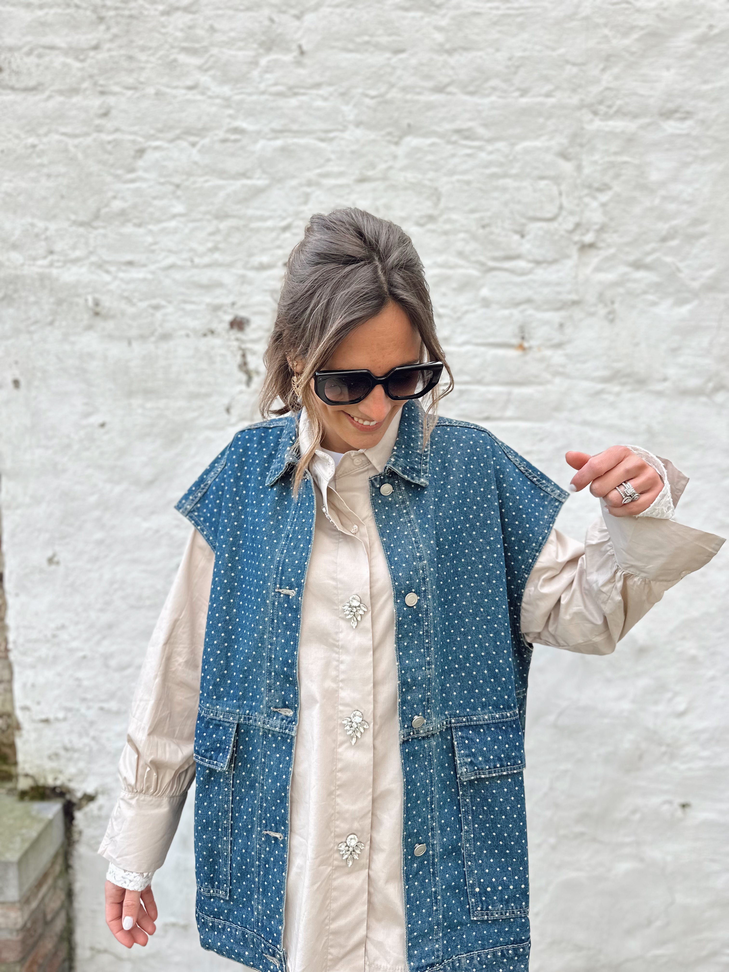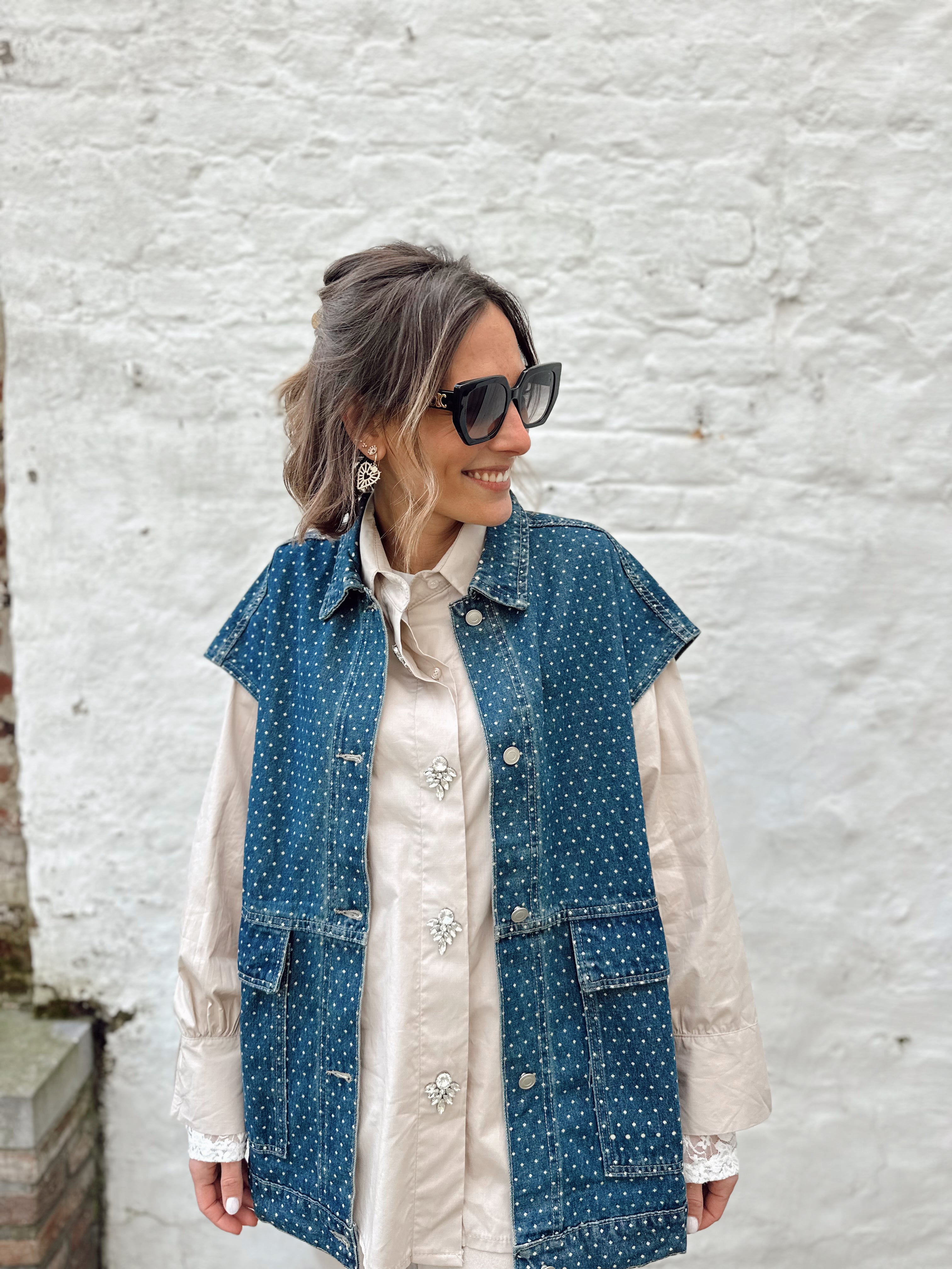 Veste sans manche en jeans, avec des points beiges. Elle est oversize et est disponible en taille S/M ou en taille M/L.