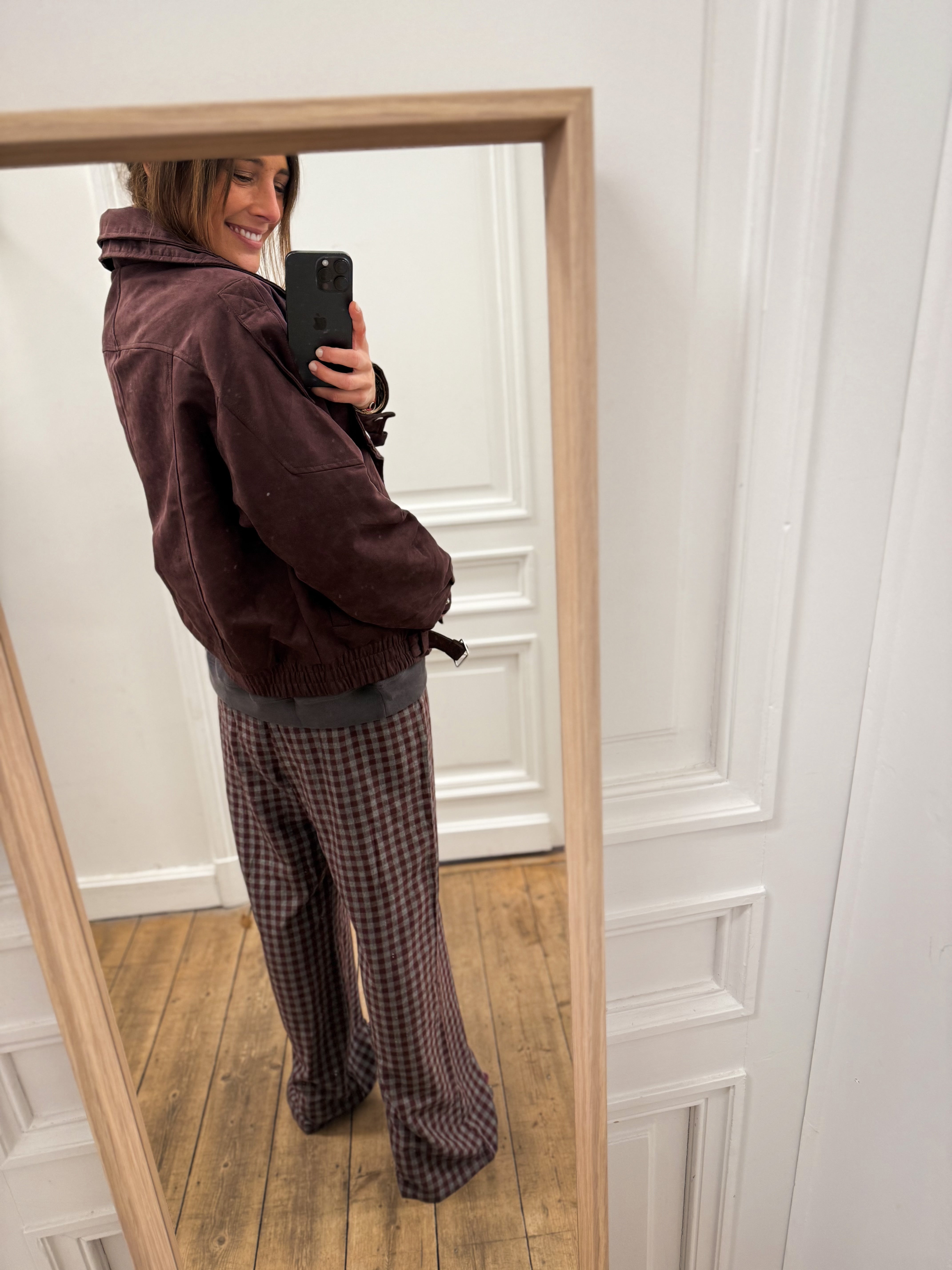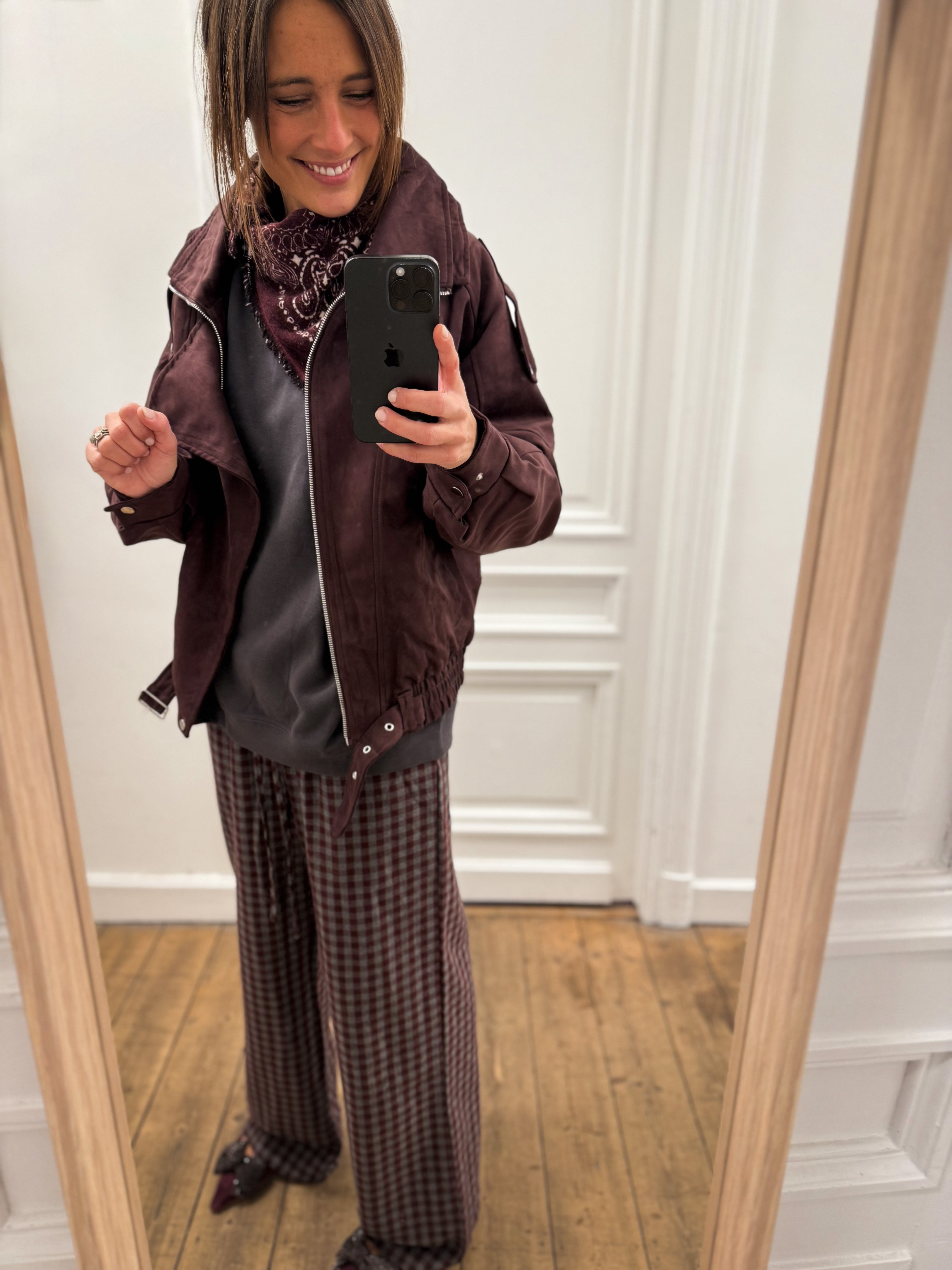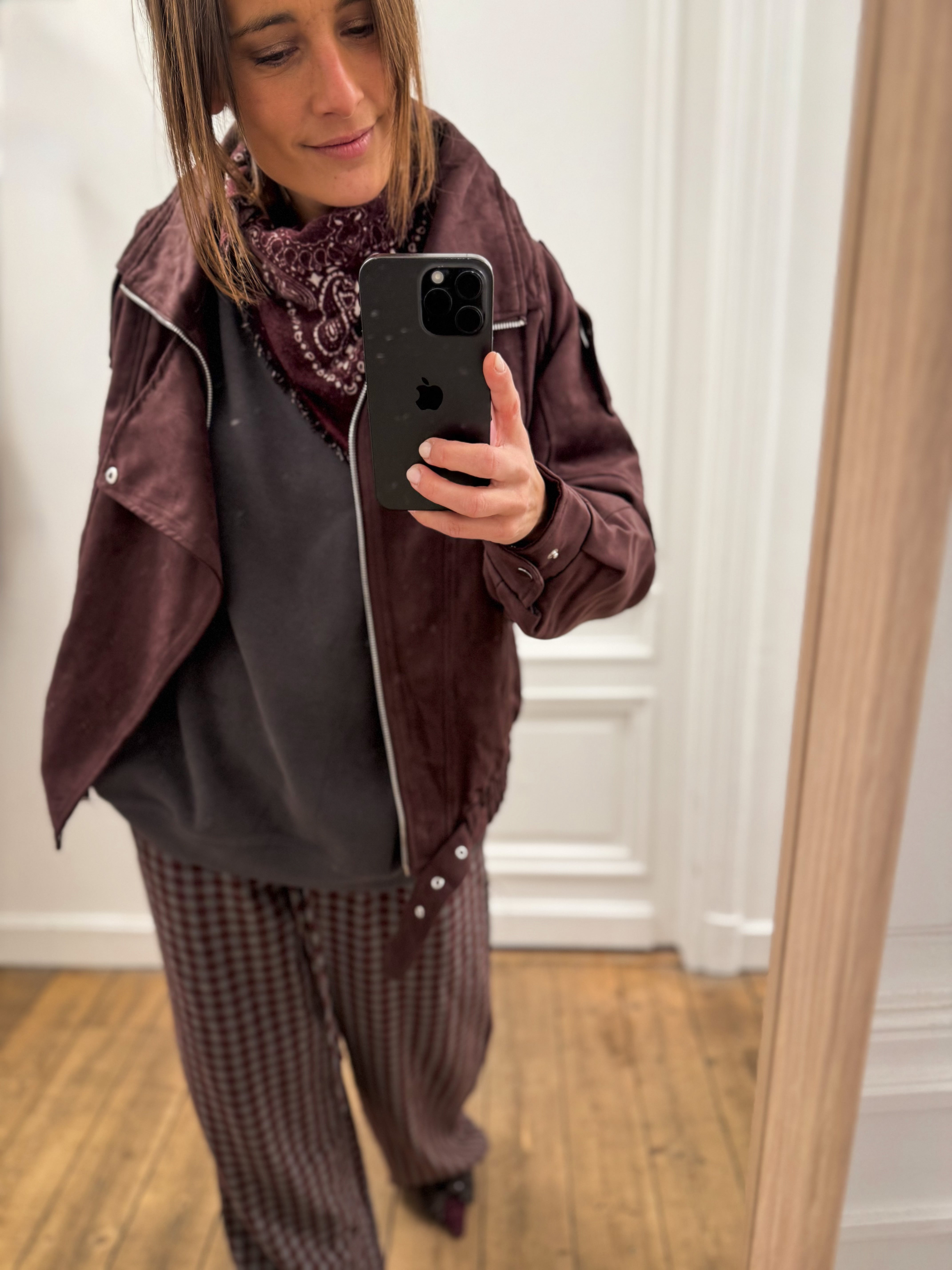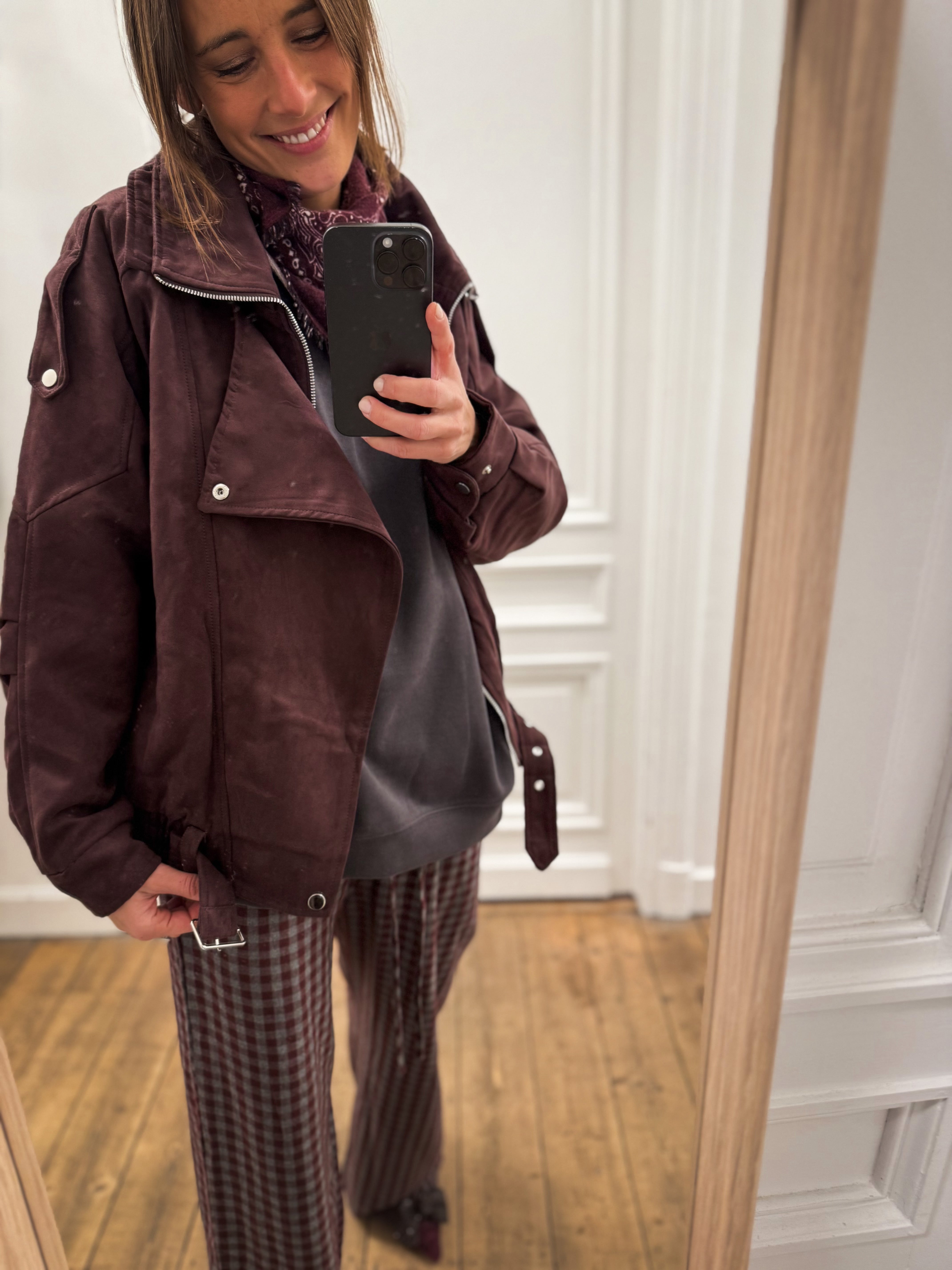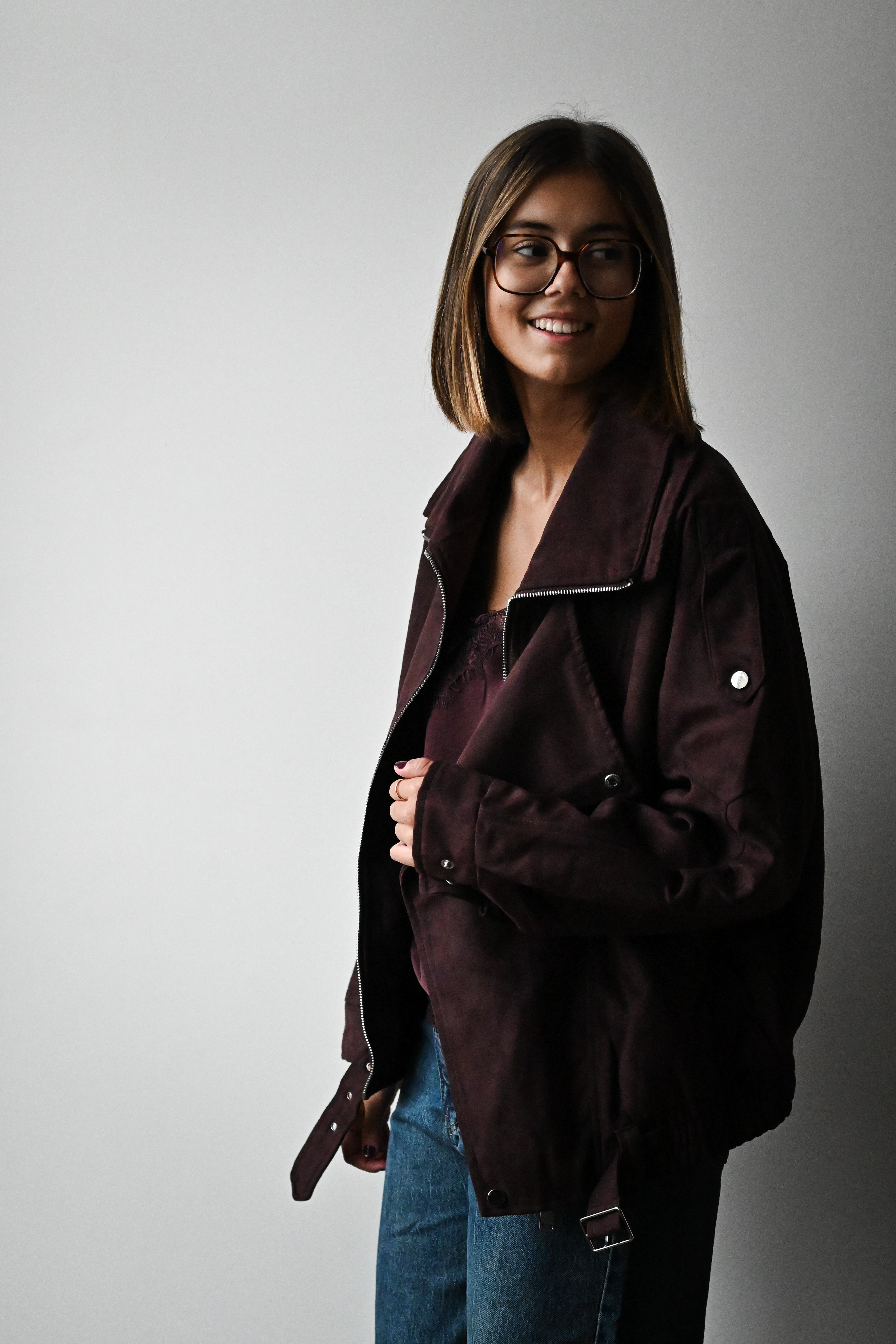 Cette veste courte prune, ajustée à la taille façon bomber, s'inspire du style perfecto avec ses manches bouffantes. Disponible en tailles S, M et L, elle allie élégance et confort pour sublimer votre allure.