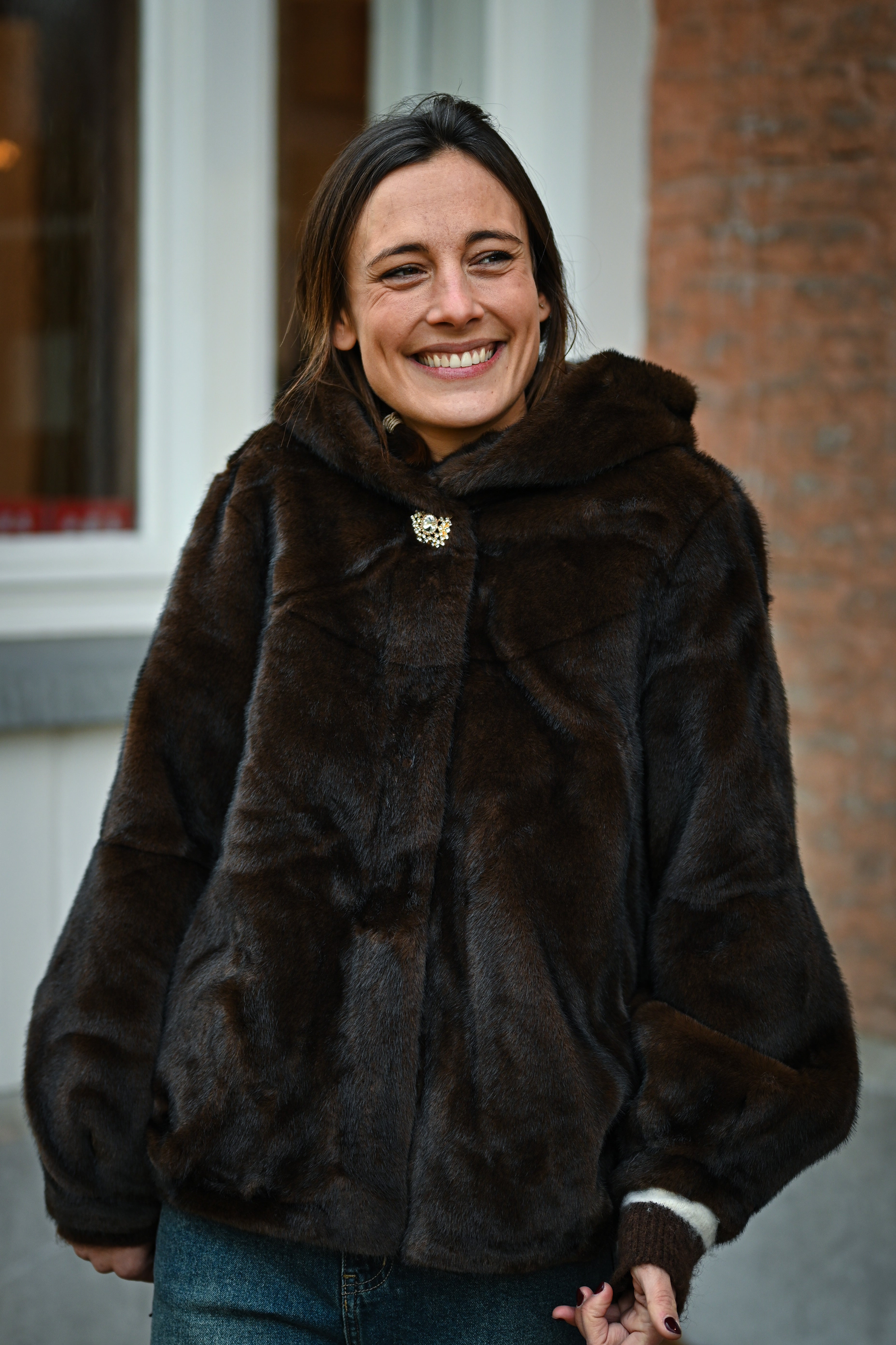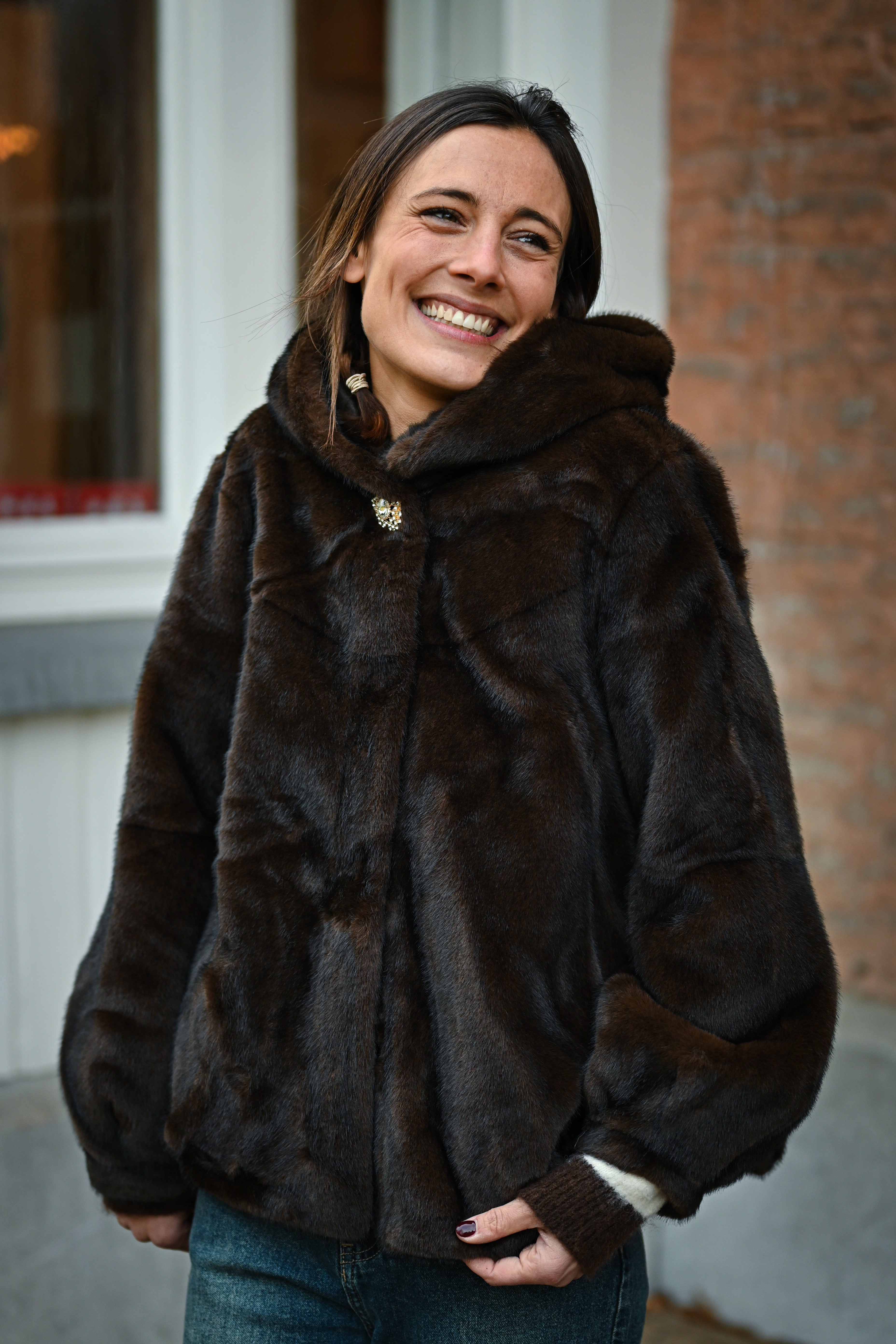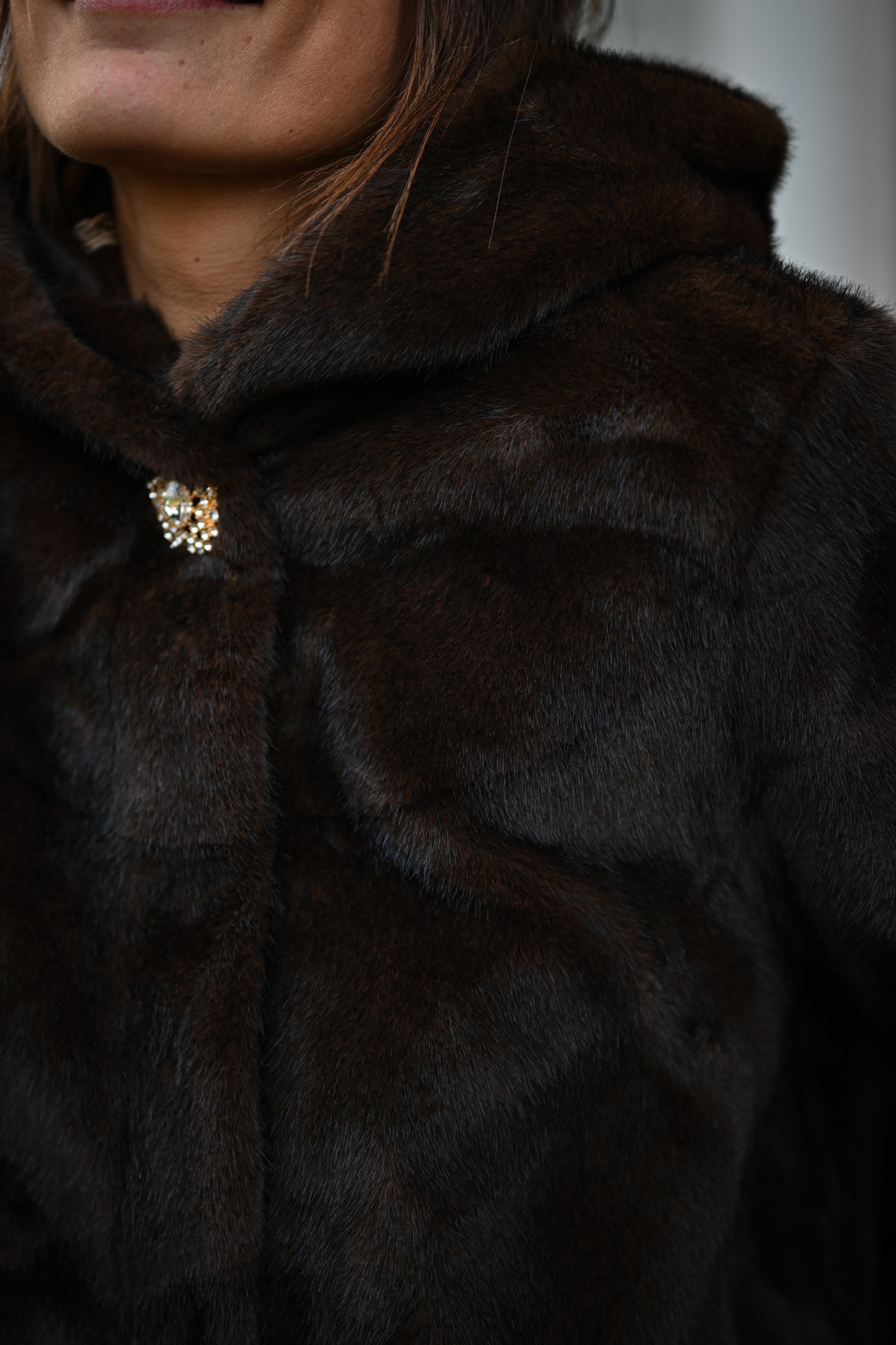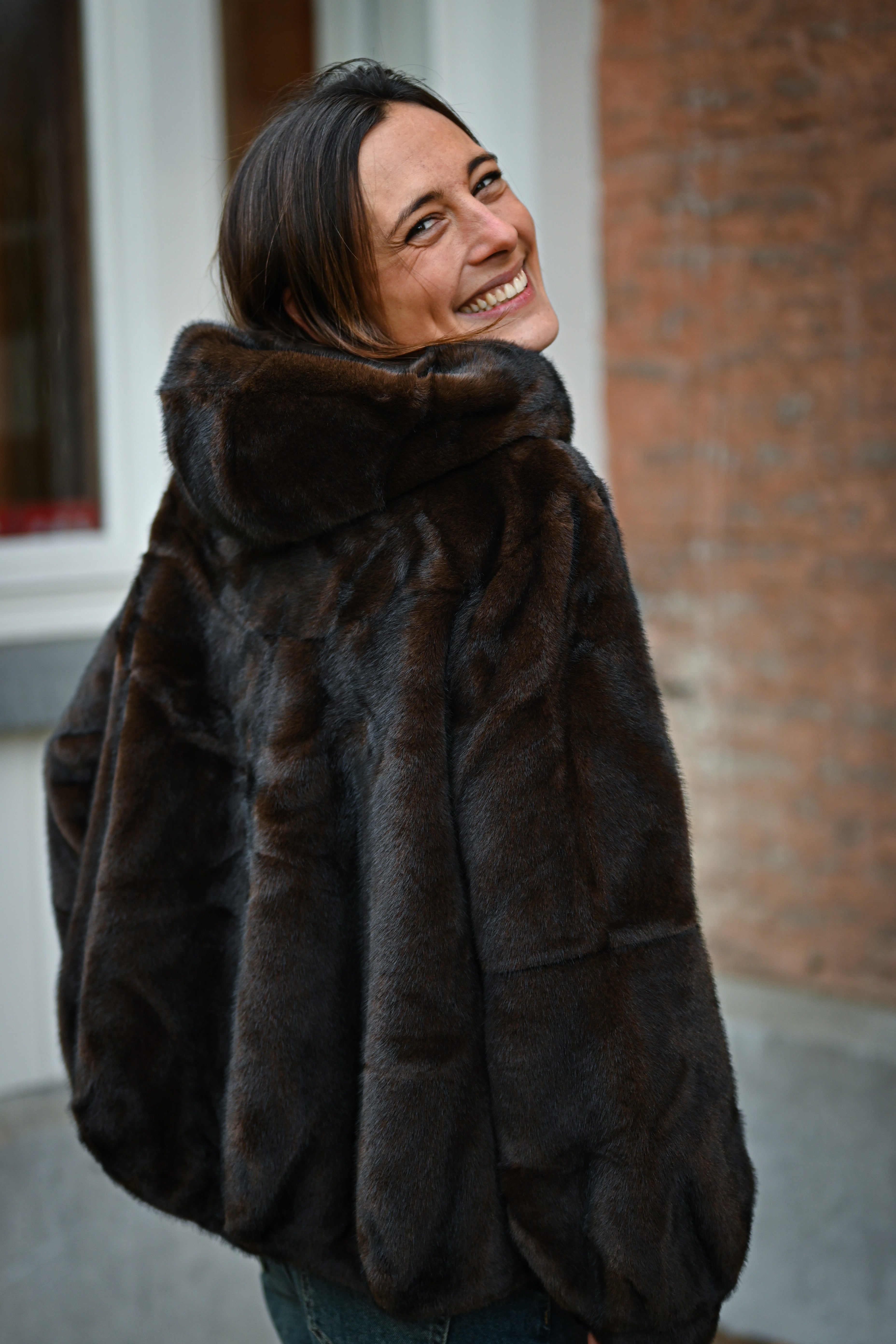 La Veste CALYPSO allie fourrure luxueuse et design raffiné. Son bouton en pierre brillante capte tous les regards, tandis que la capuche offre protection et style. Disponible en S/M et M/L pour un confort sur mesure.
