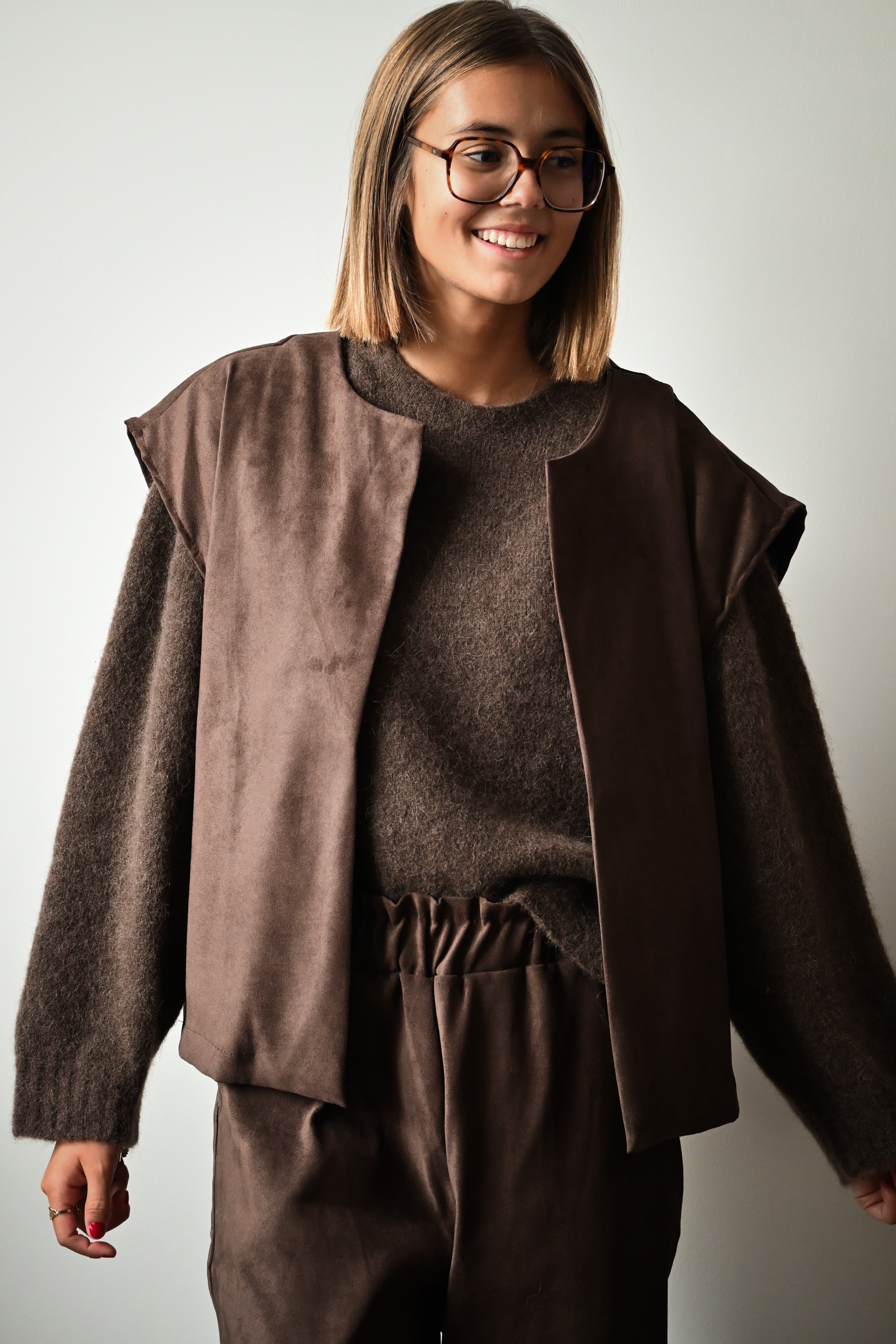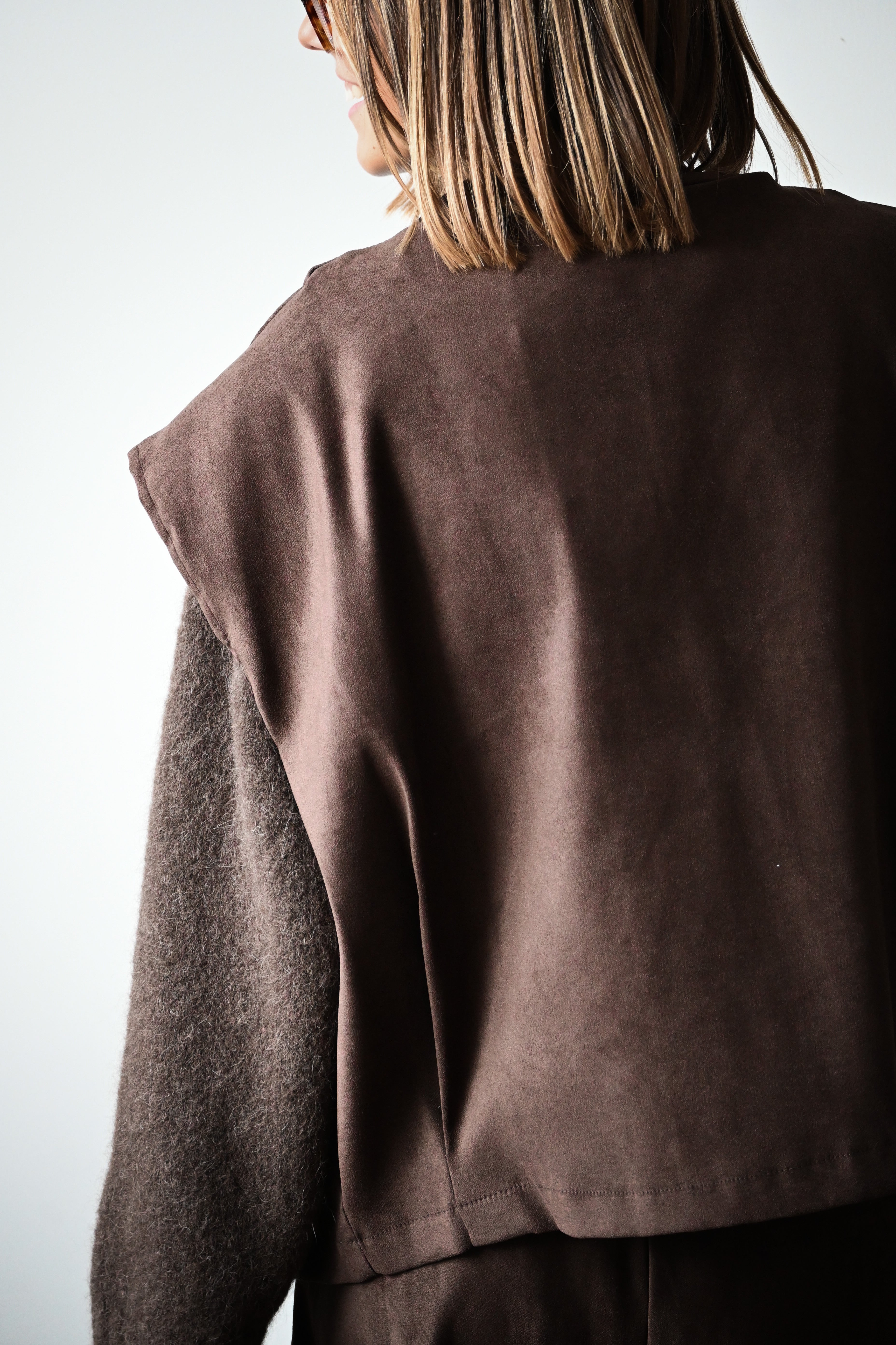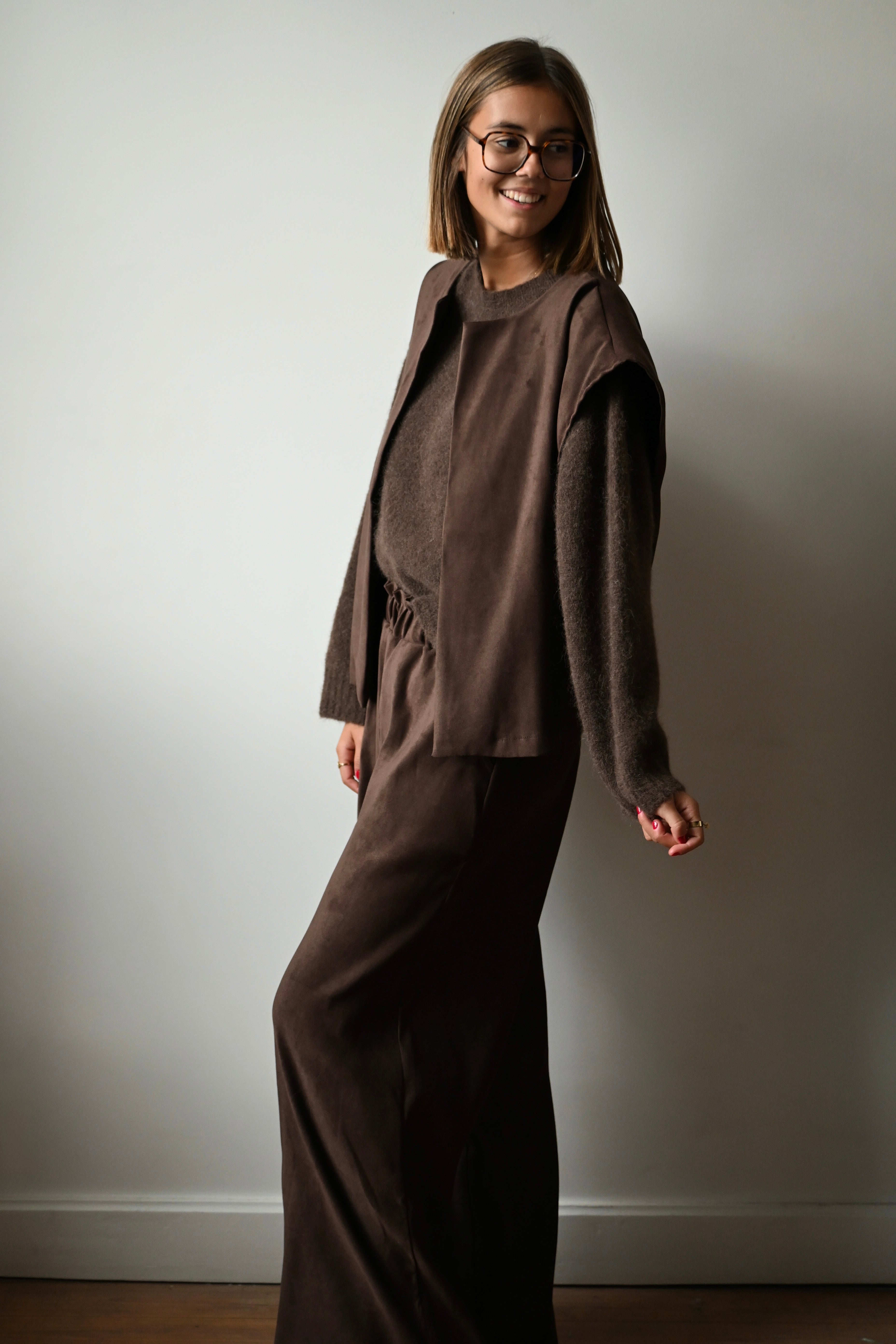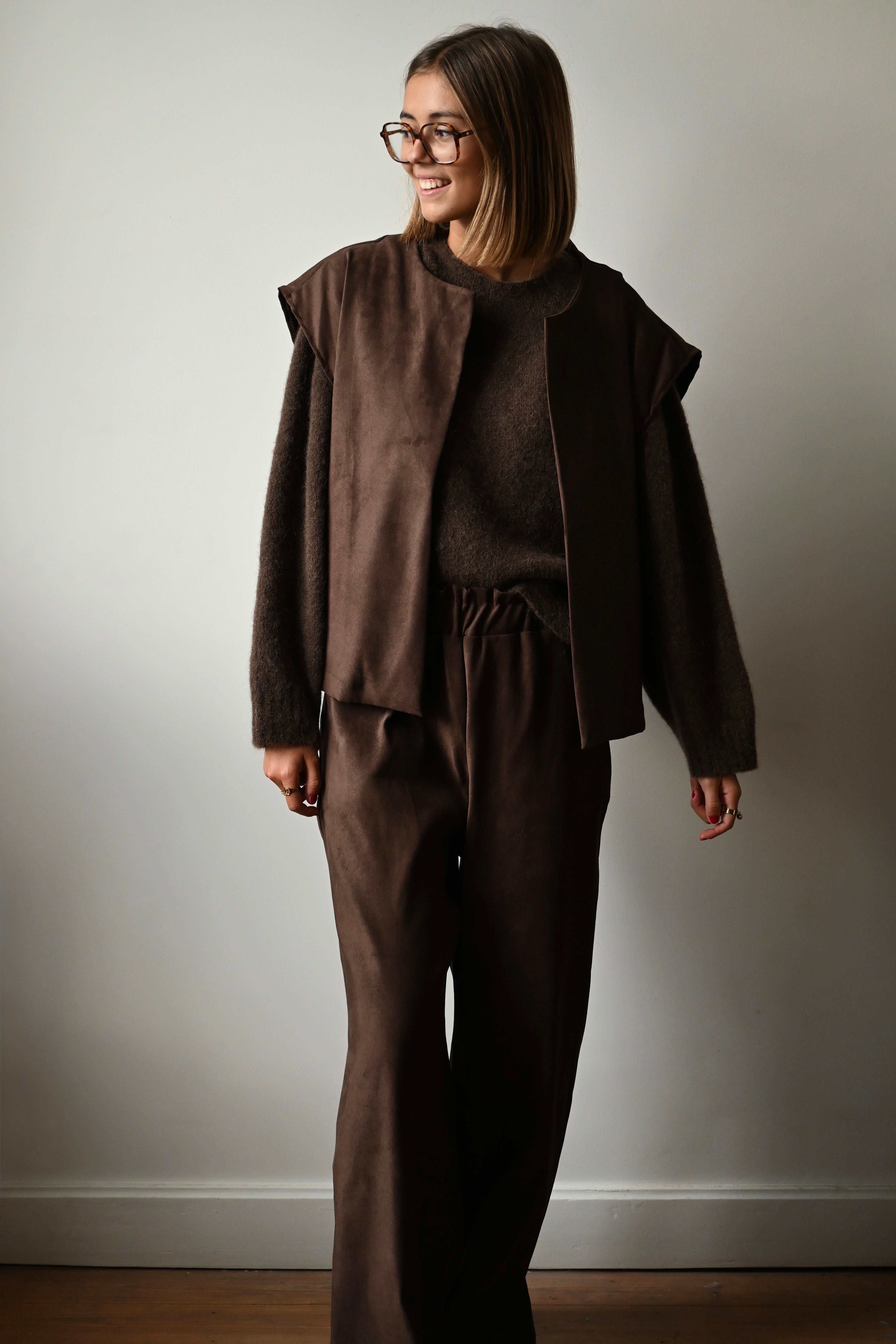 Cette veste sans manches en suédine disponible en prune et en chocolat, proposée en taille unique, est conçue pour s'ajuster parfaitement à toutes les morphologies, offrant ainsi un style polyvalent et confortable.