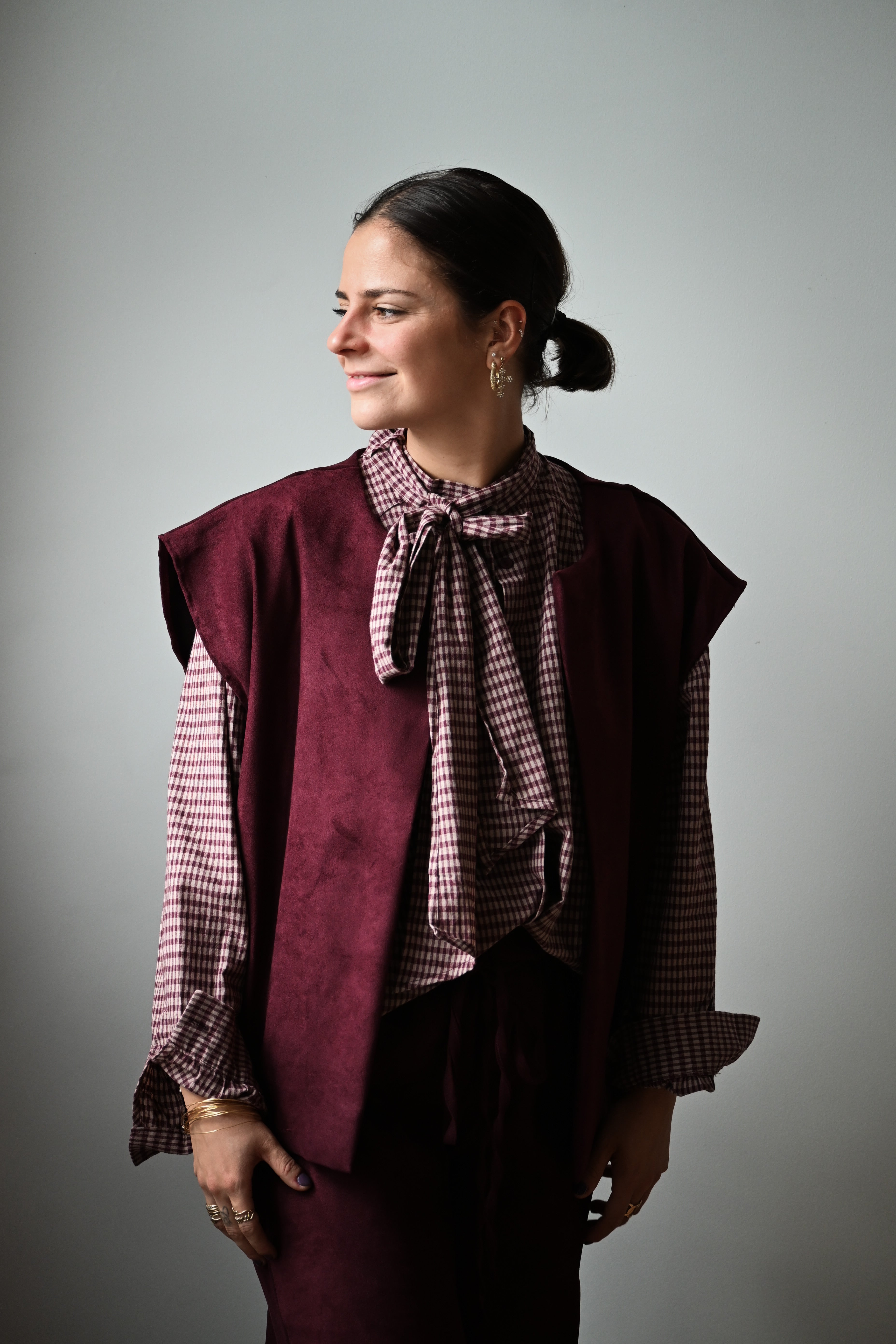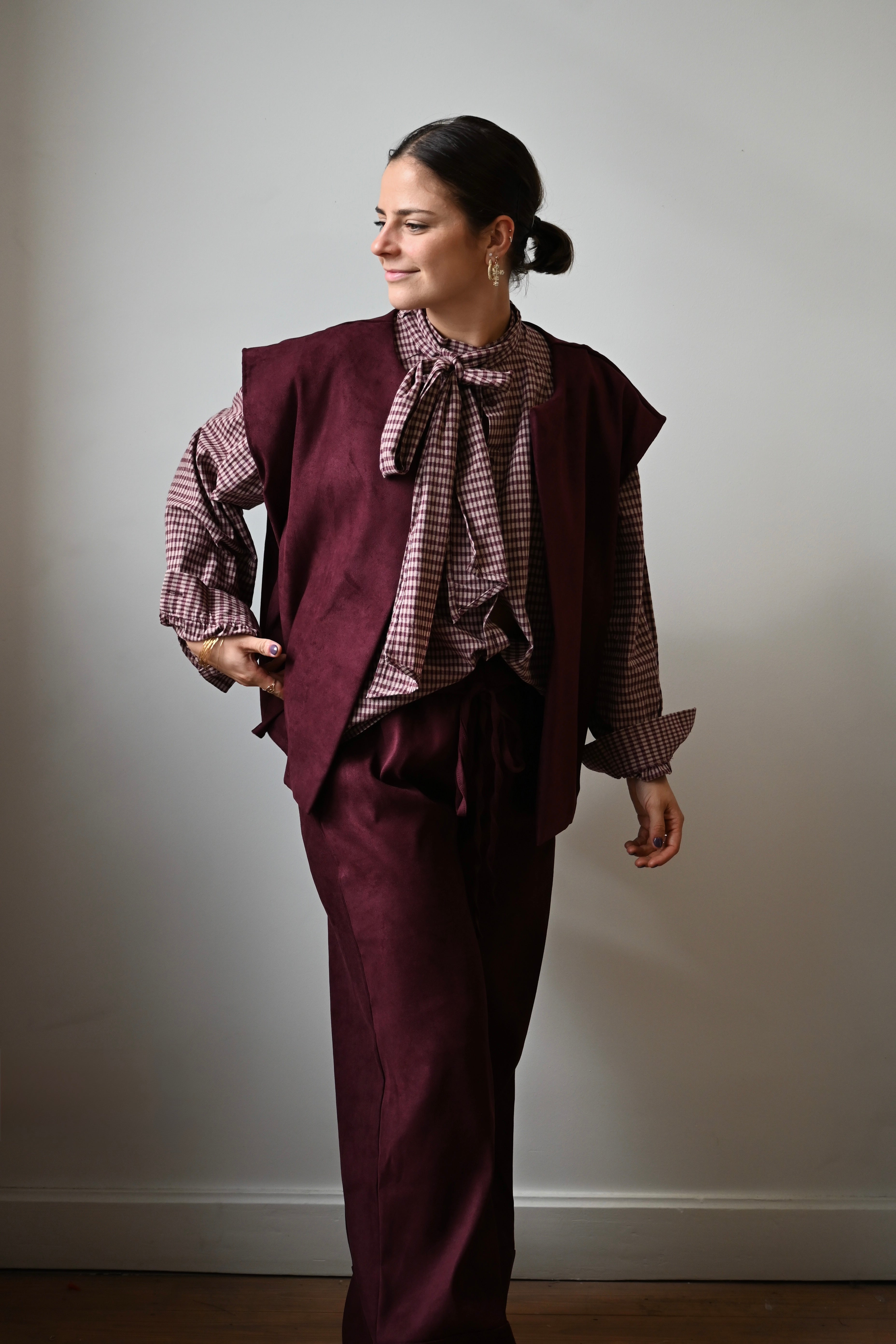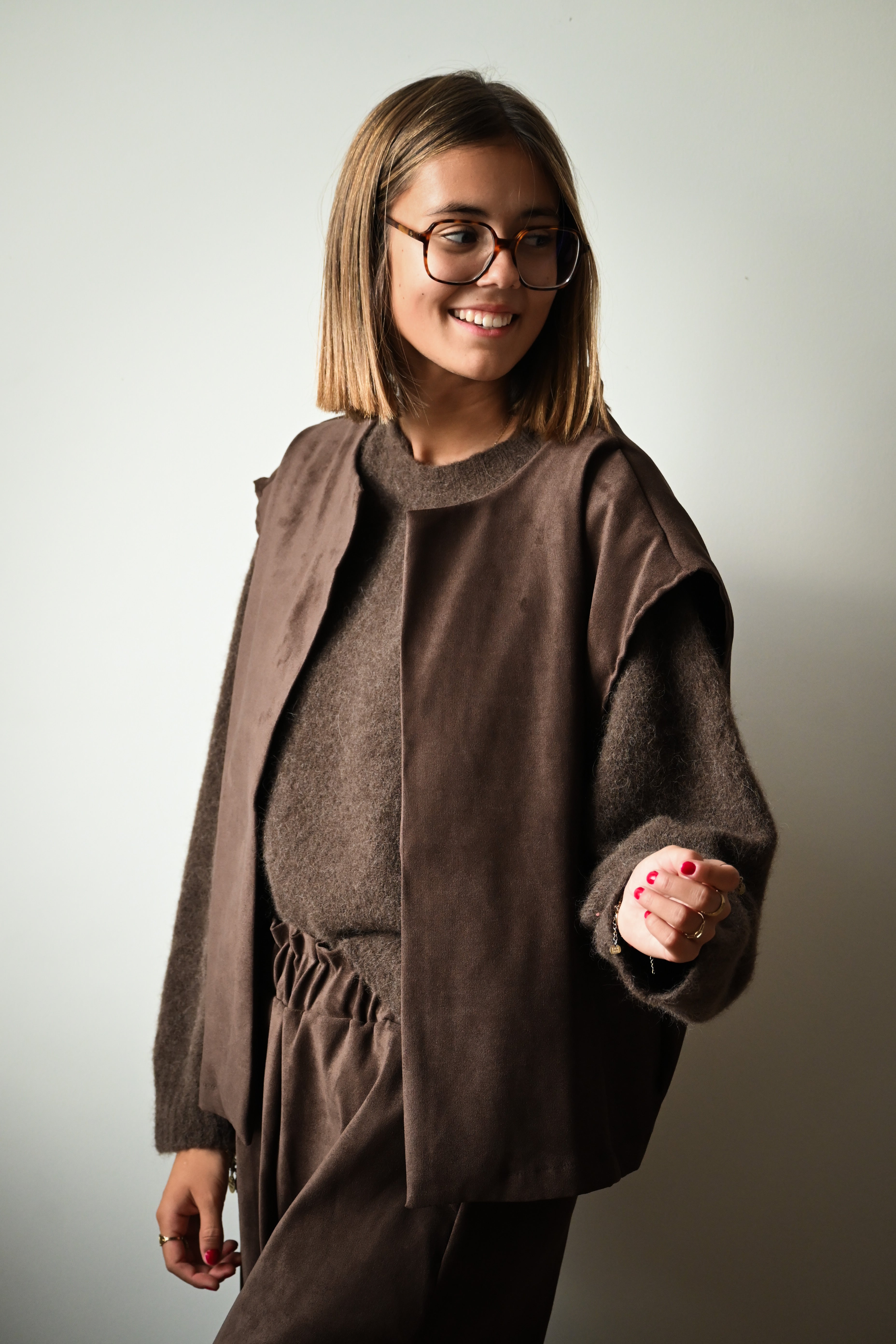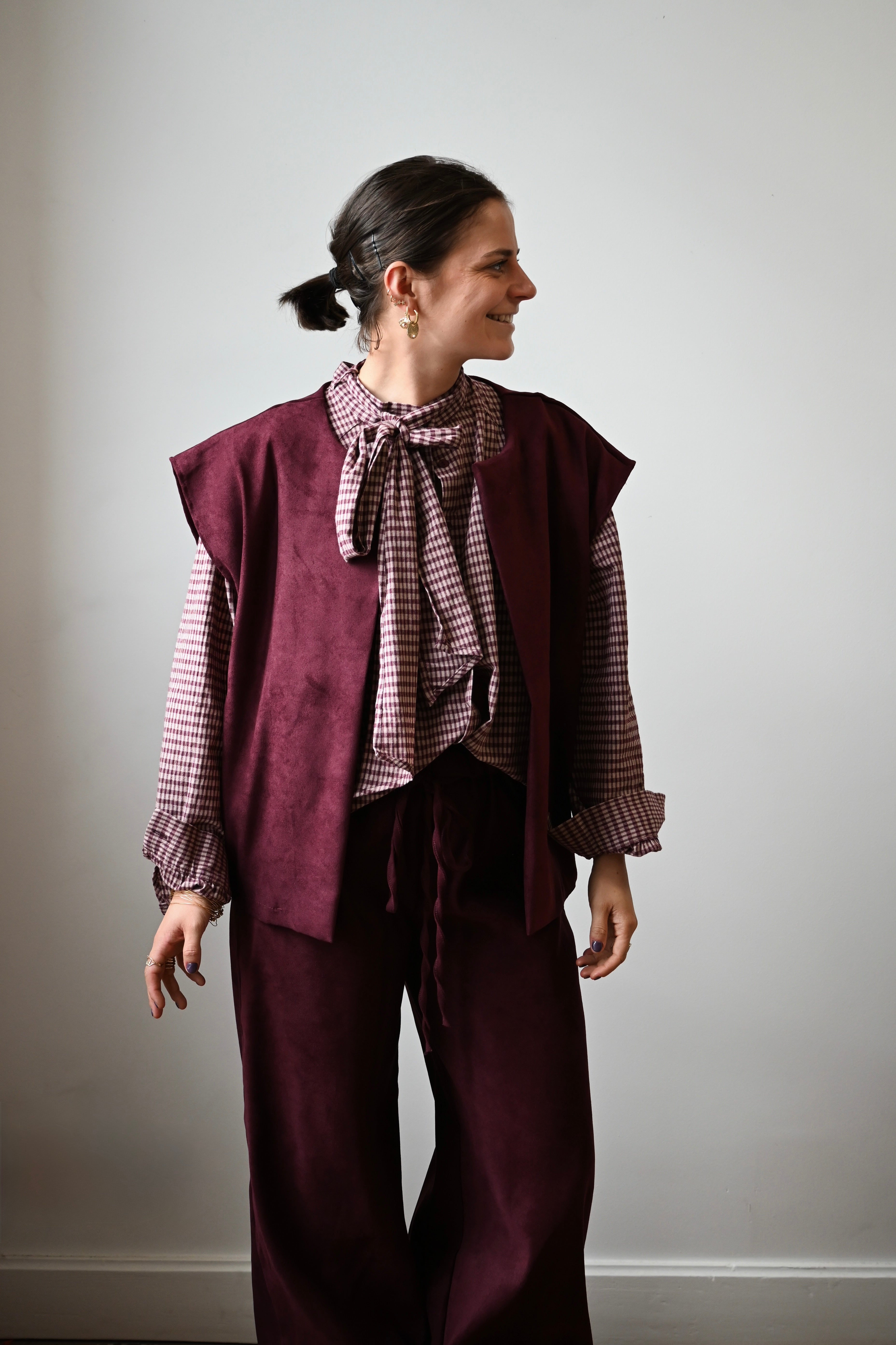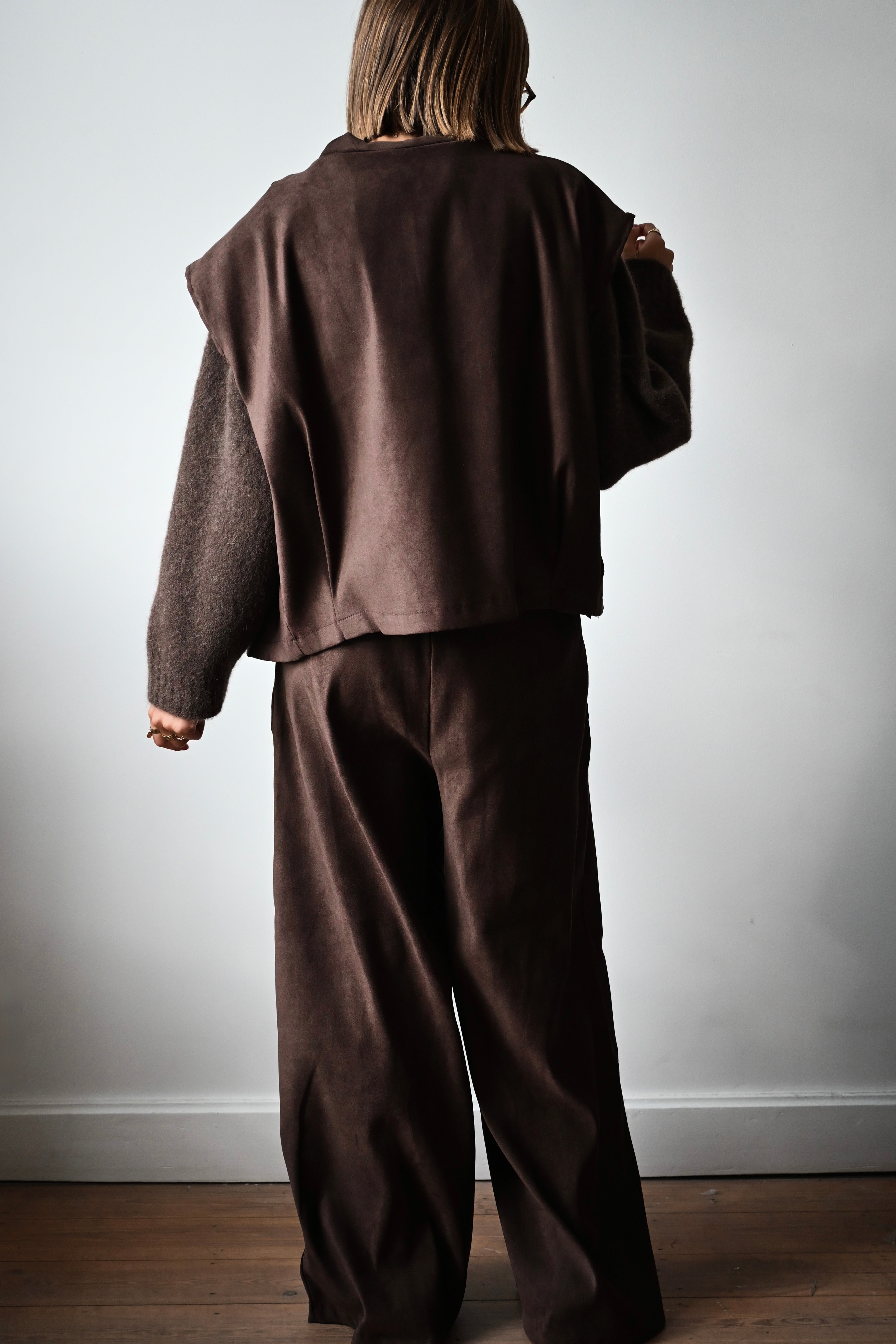 Cette veste sans manches en suédine disponible en prune et en chocolat, proposée en taille unique, est conçue pour s'ajuster parfaitement à toutes les morphologies, offrant ainsi un style polyvalent et confortable.