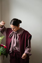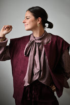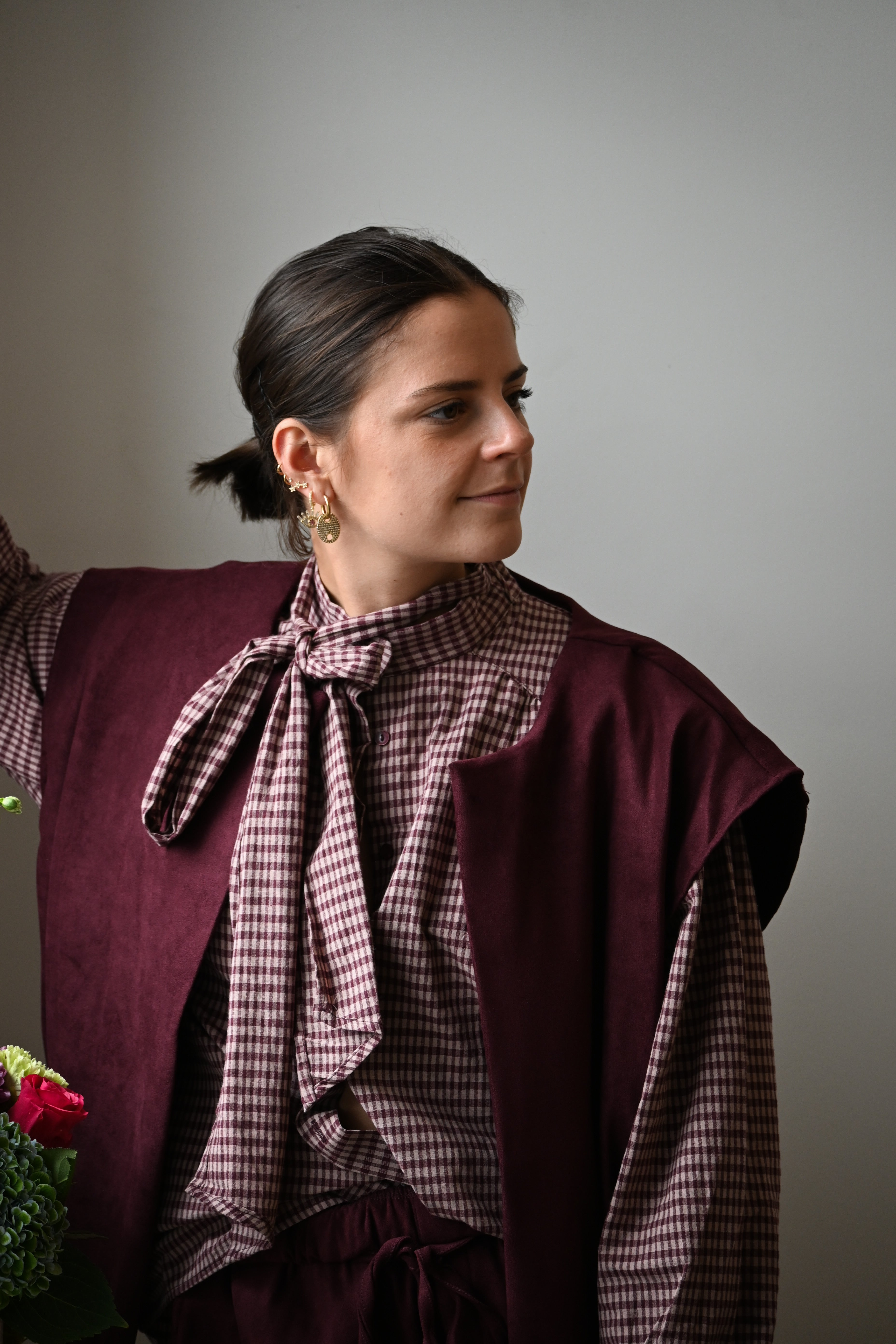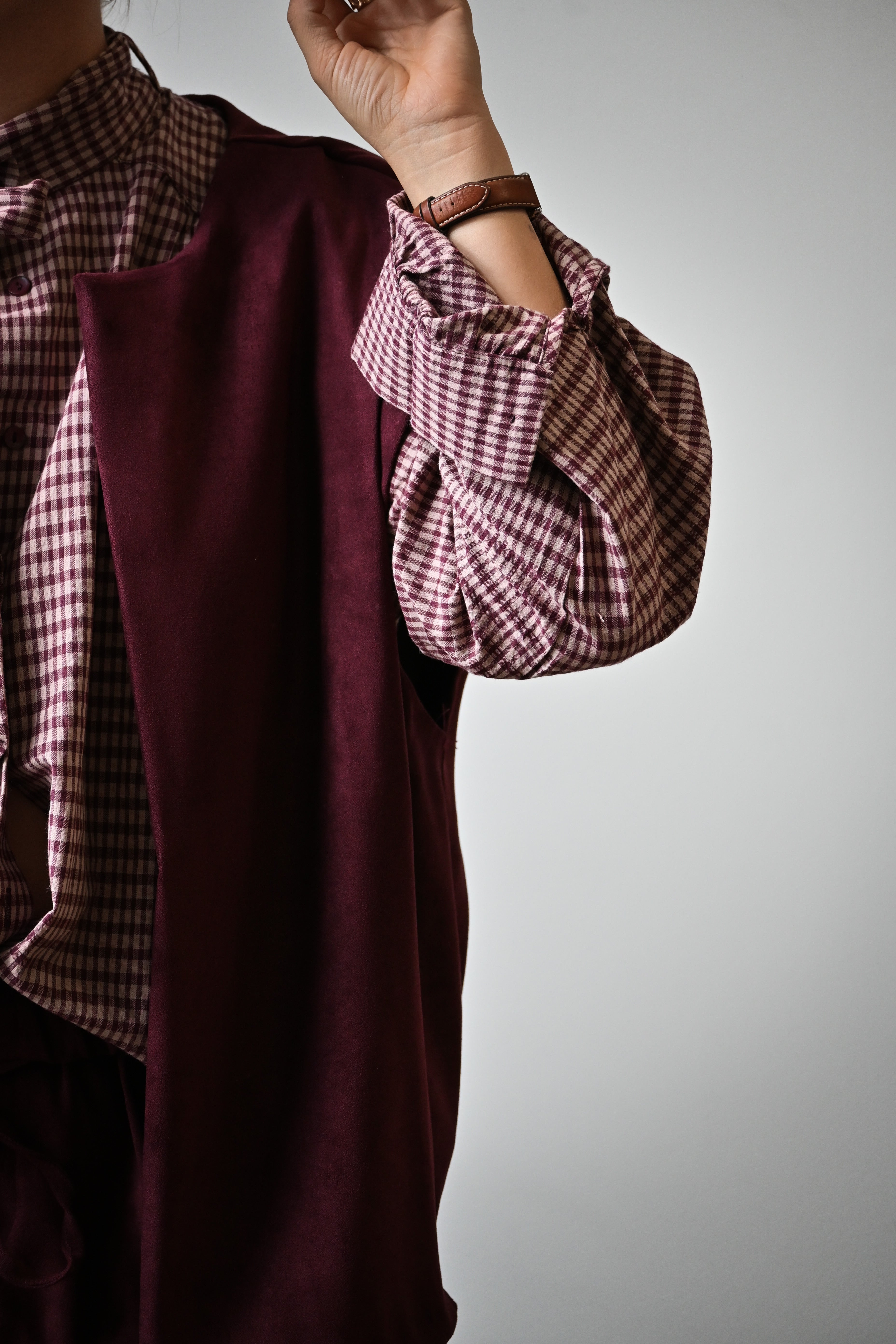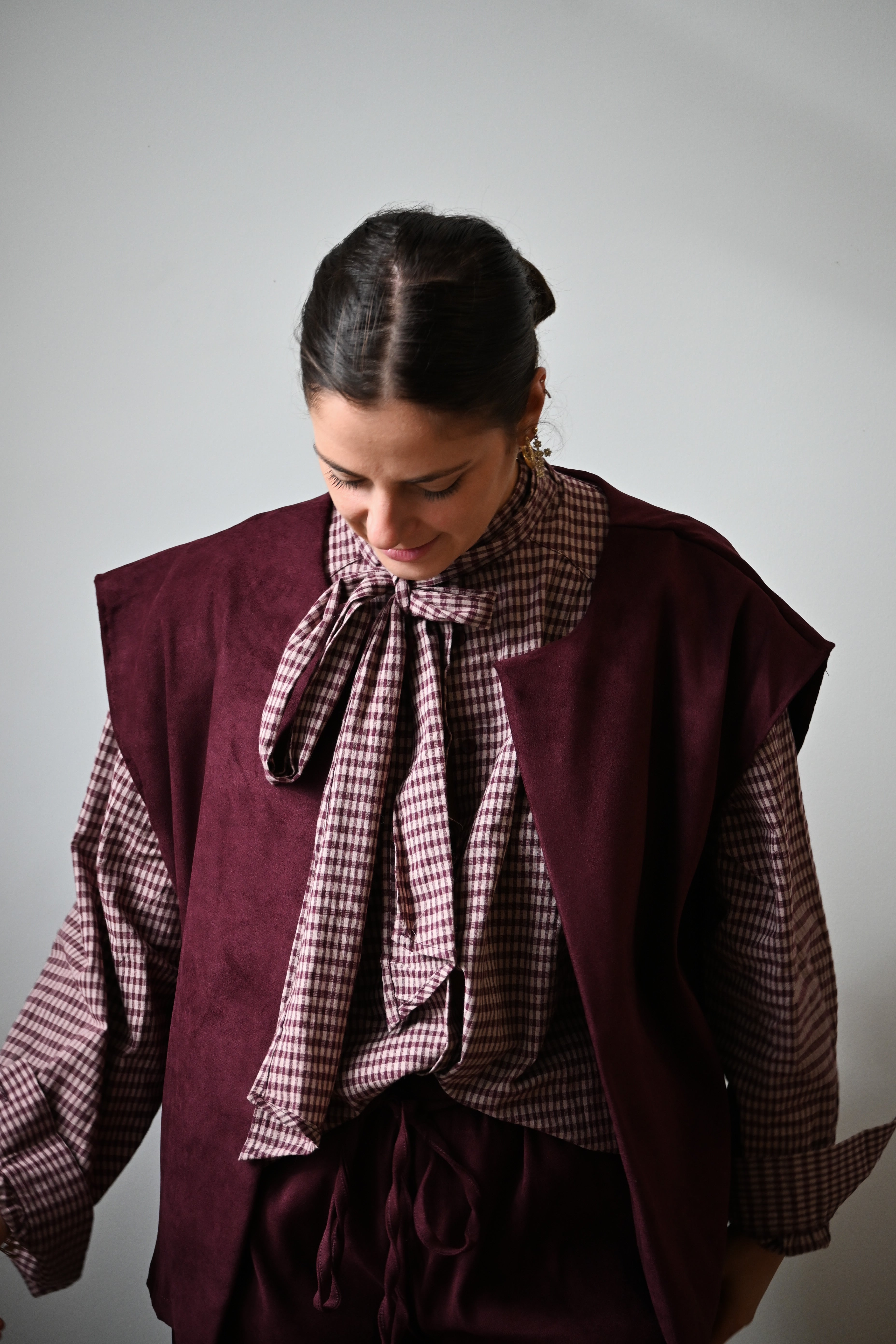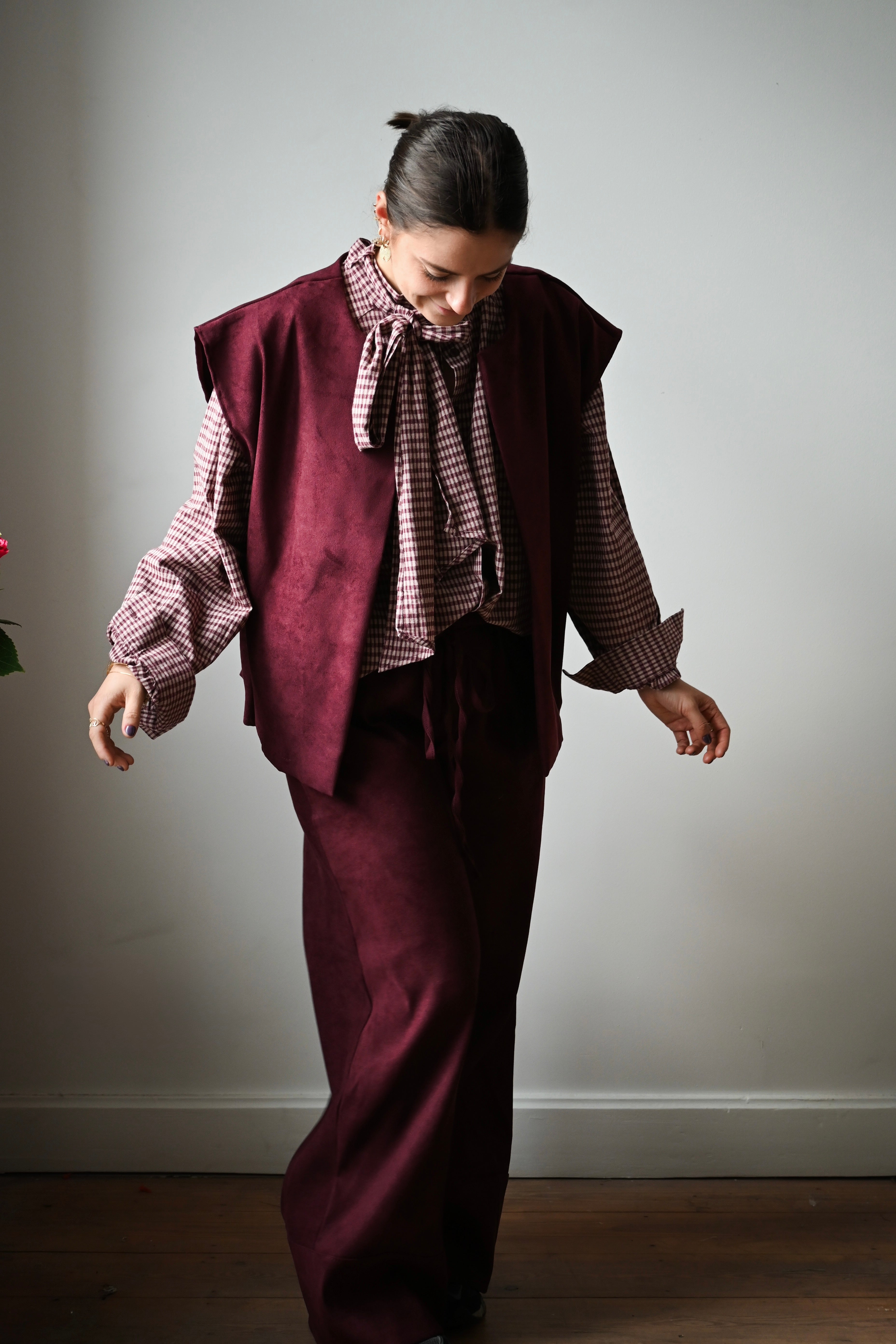 Cette veste sans manches en suédine disponible en prune et en chocolat, proposée en taille unique, est conçue pour s'ajuster parfaitement à toutes les morphologies, offrant ainsi un style polyvalent et confortable.