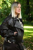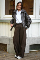 Cette veste en simili cuir chocolat se distingue par sa coupe ajustée grâce à un élastique à la base et une ceinture. Disponible en tailles S/M et M/L, elle allie style et confort pour sublimer votre silhouette.