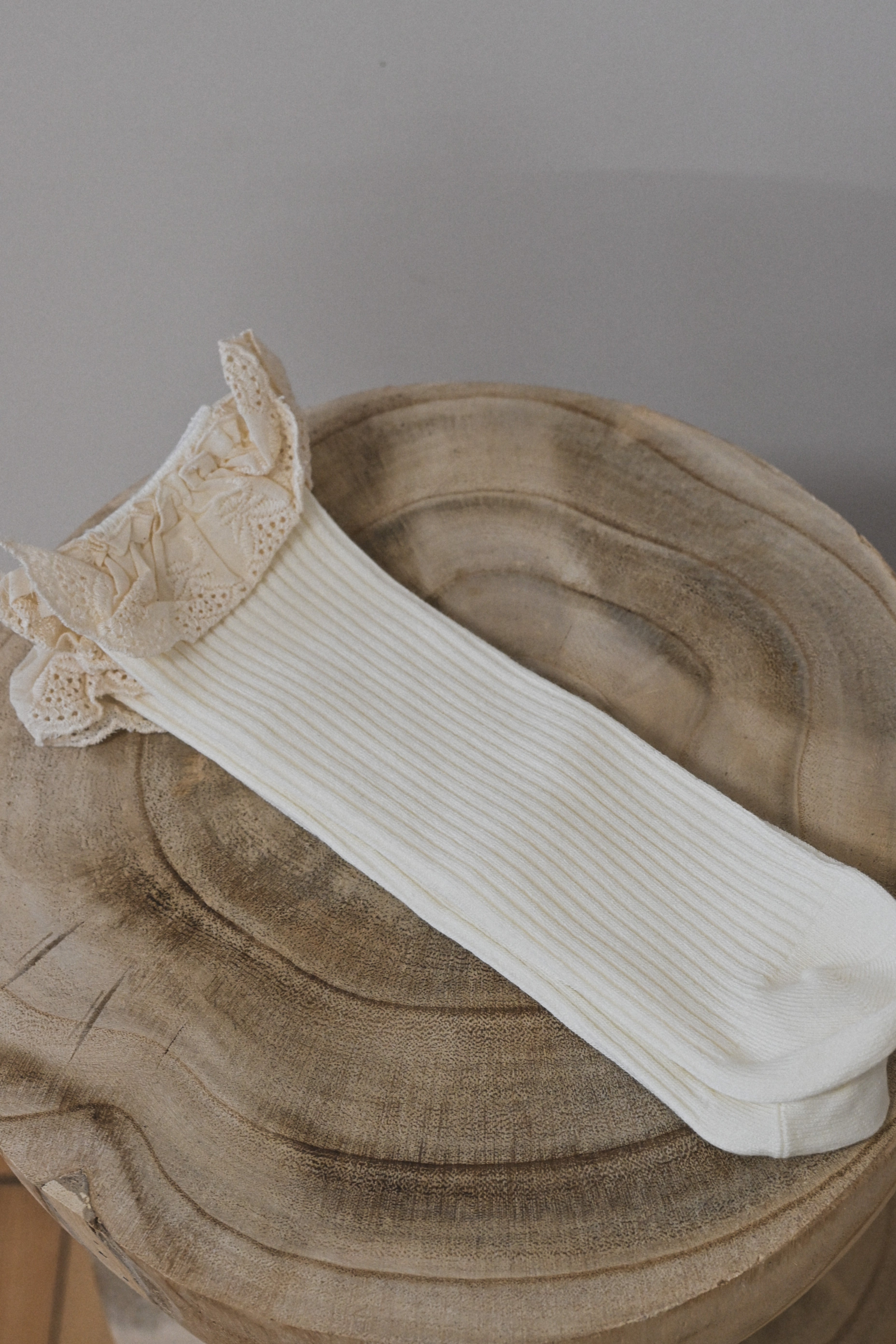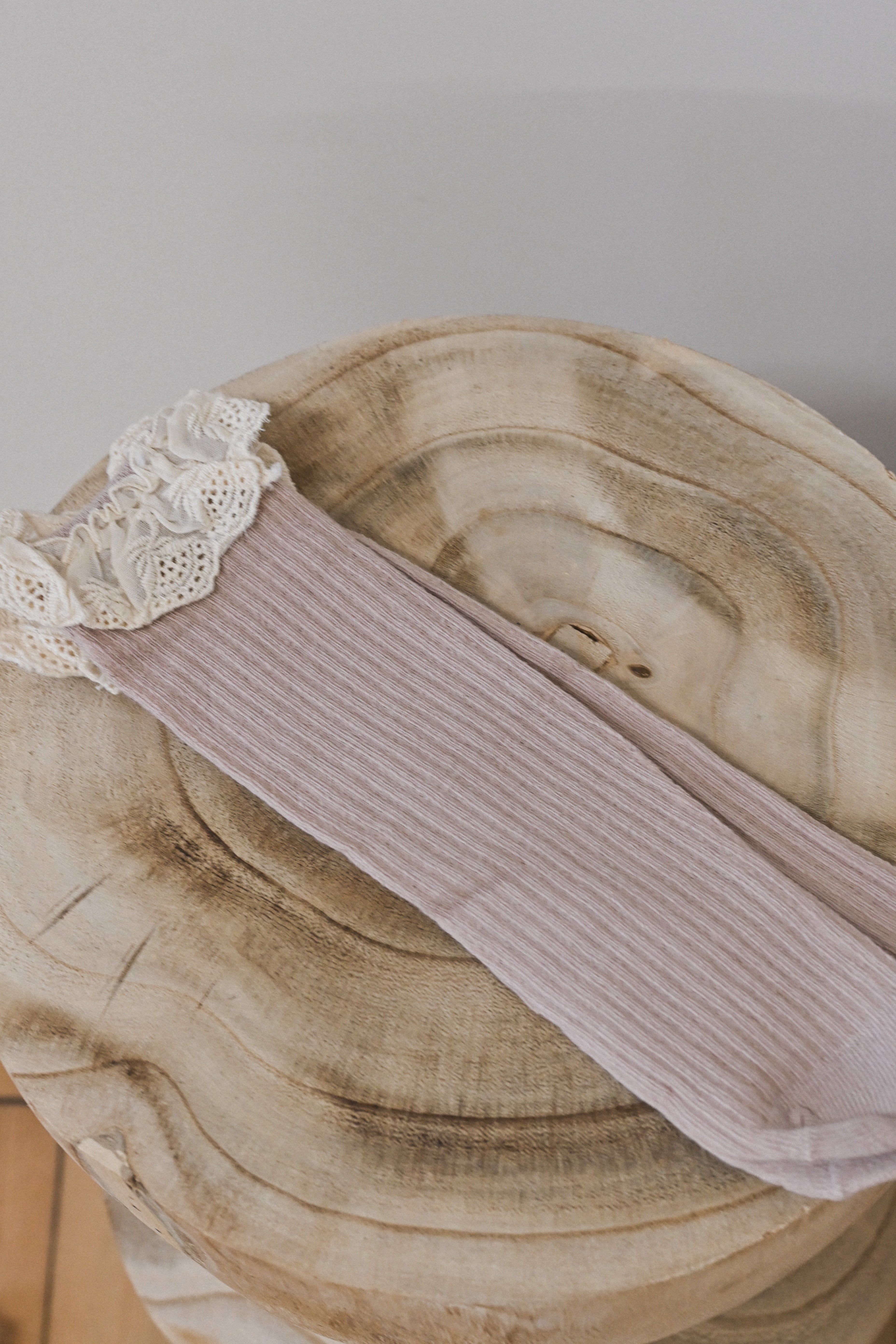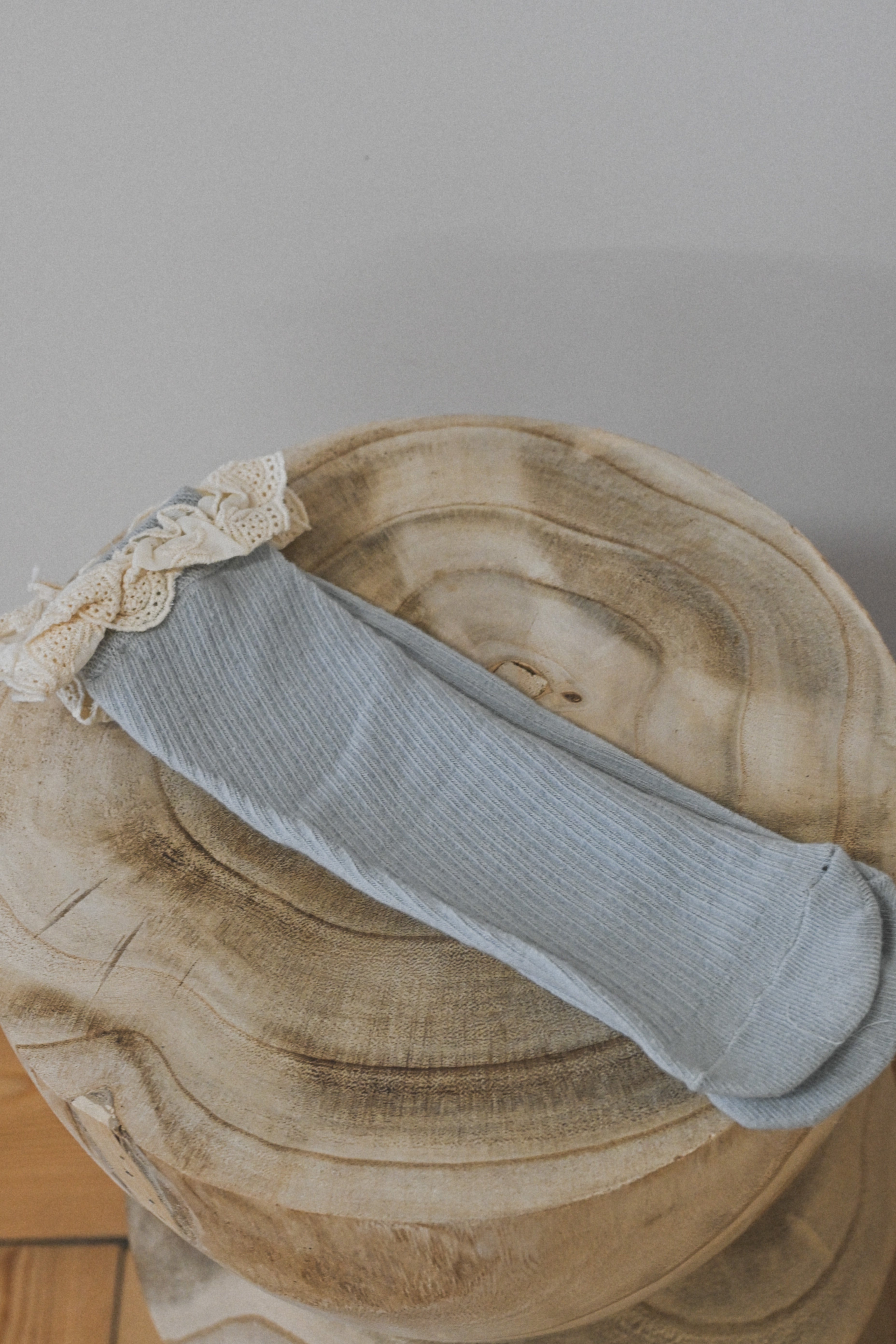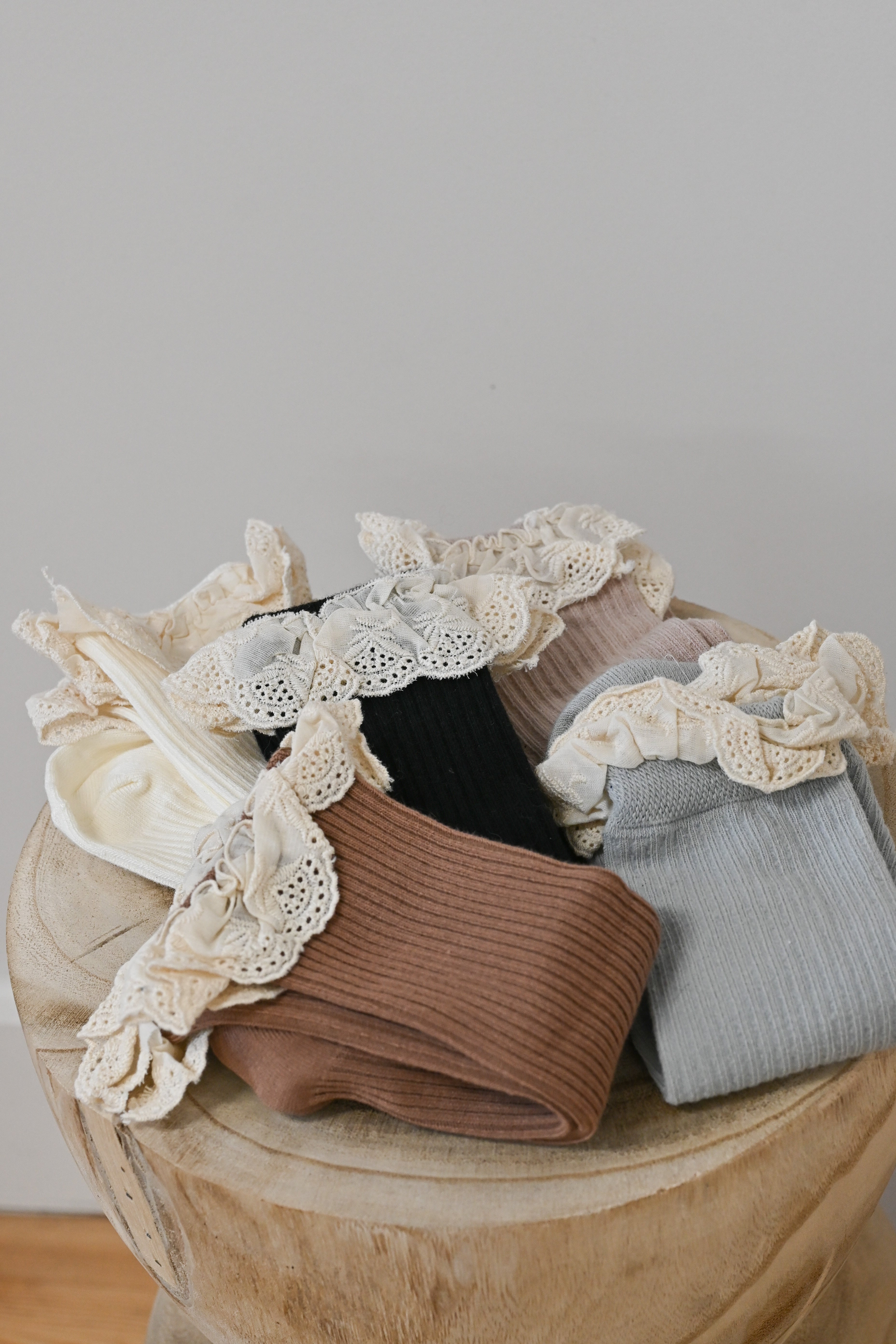 Ces chaussettes hautes pour enfants, ornées de délicate dentelle, se déclinent en plusieurs teintes élégantes : camel, beige clair, gris et beige foncé, pour un style aussi charmant que confortable.