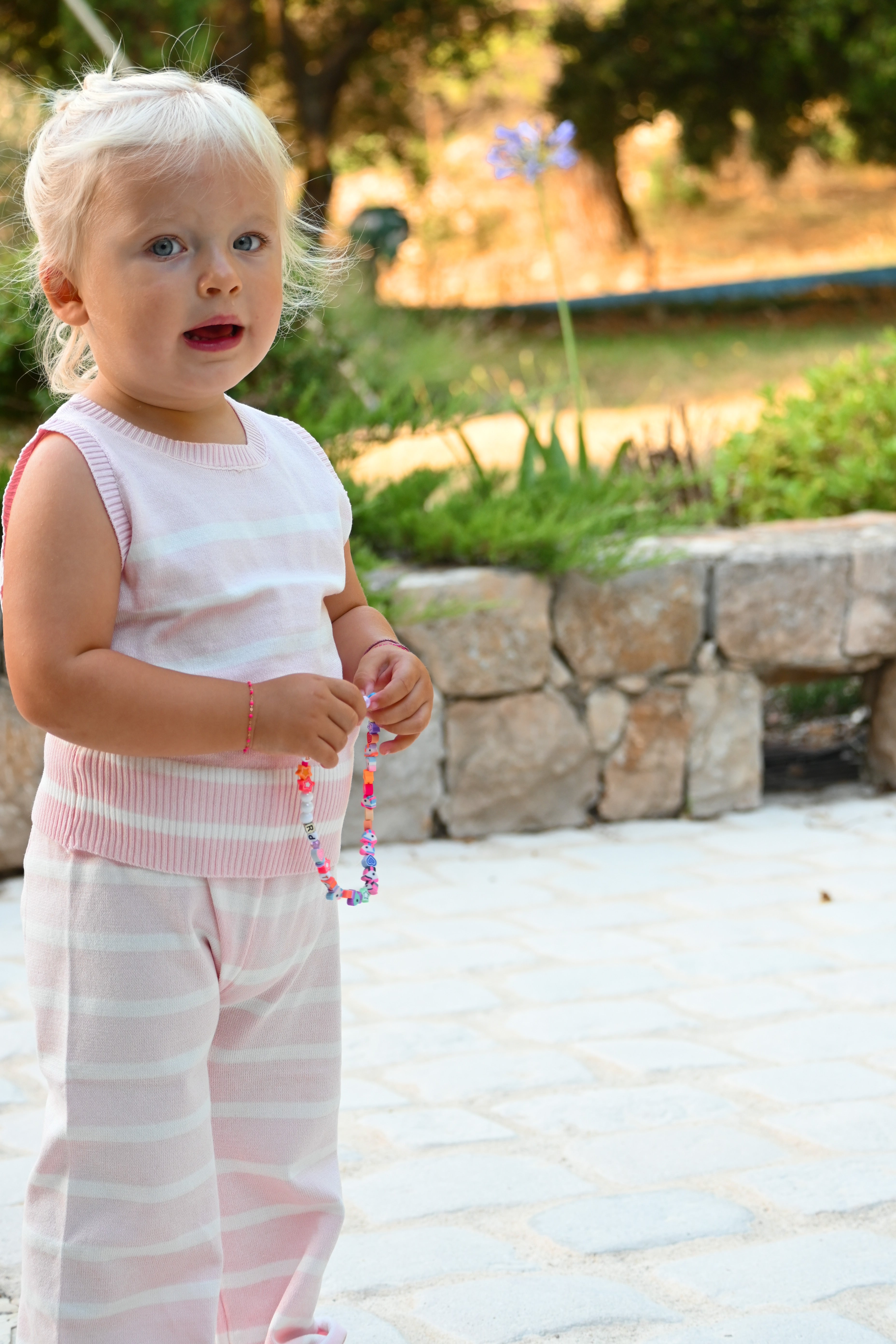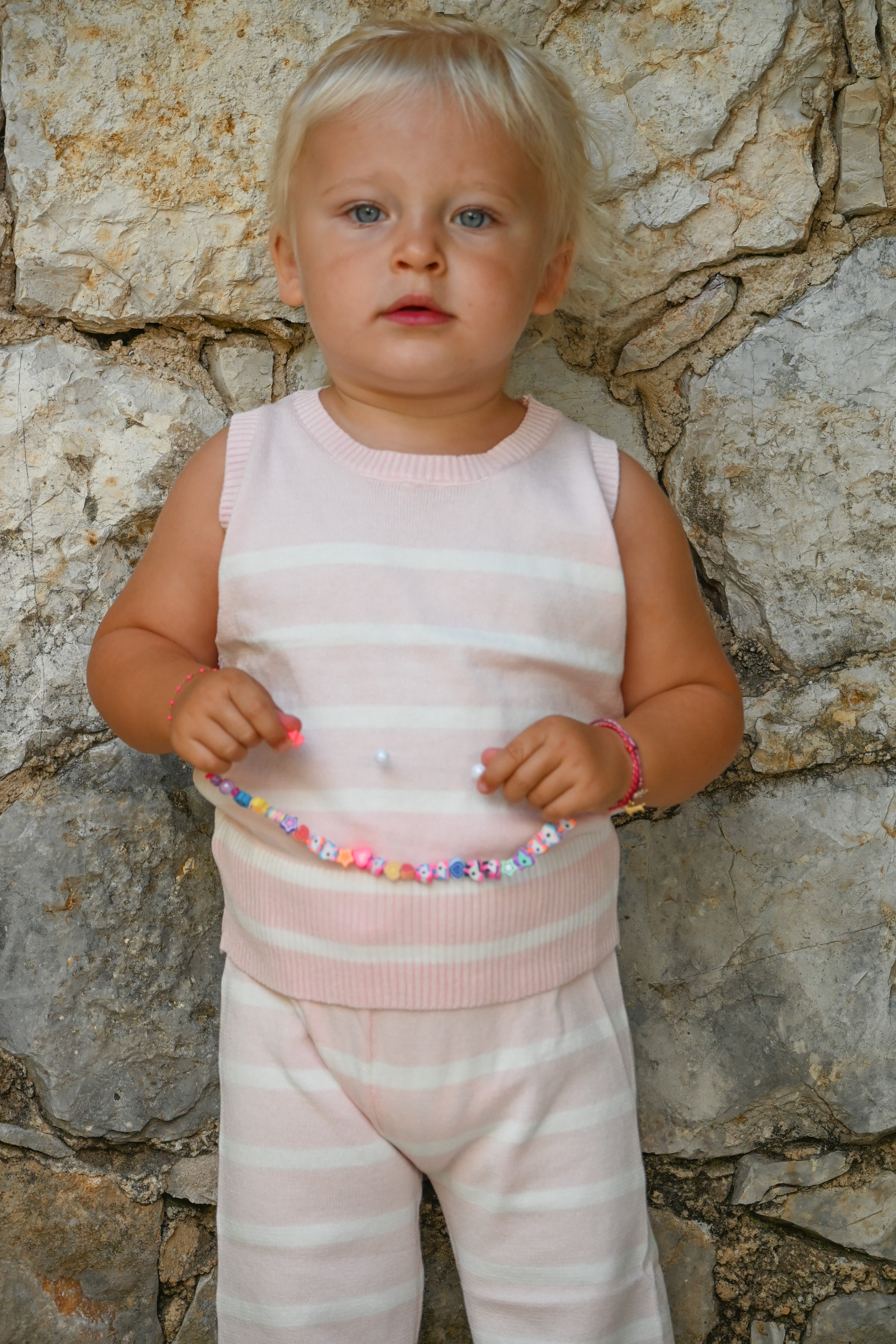 Découvrez l'ensemble JULIETTE, composé d'un pantalon et d'un t-shirt rose pâle ornés de fines lignes blanches. La taille élastiquée assure un confort optimal tout au long de la journée pour vos mini.