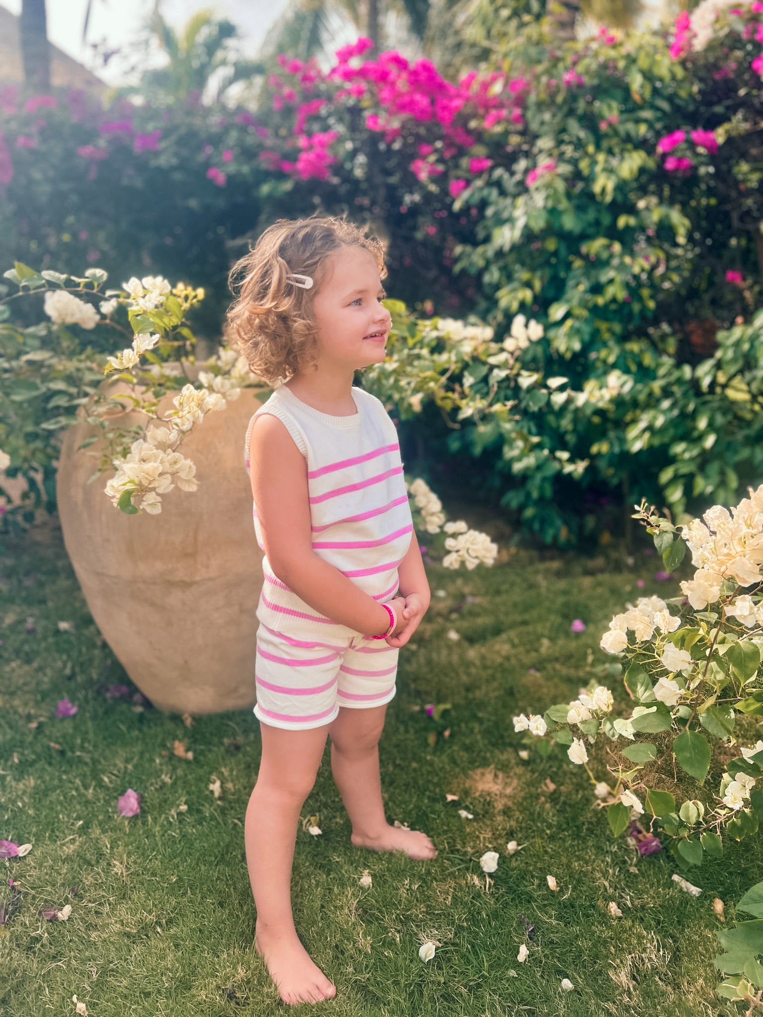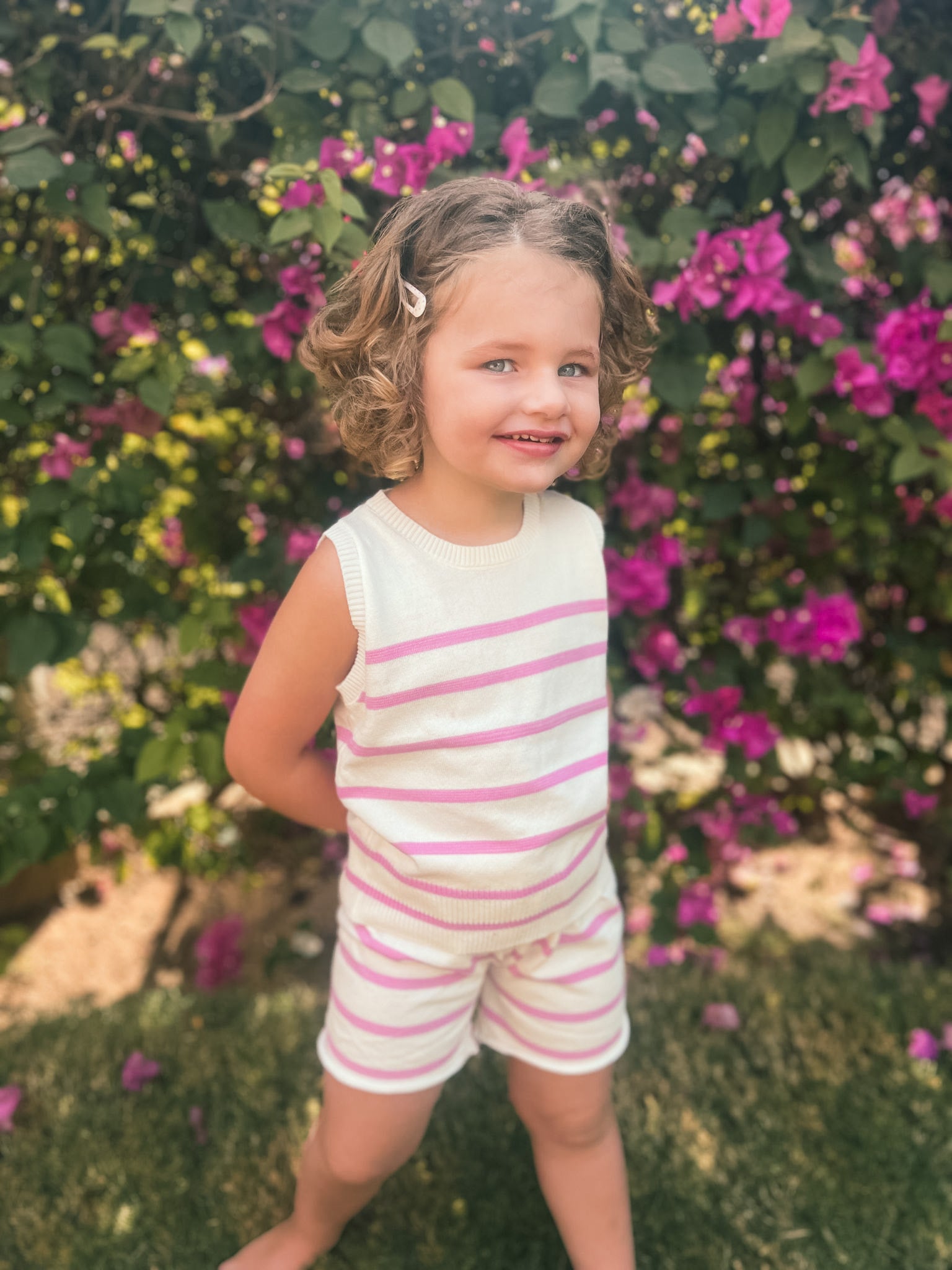 Ensemble short et top ligné rose et blanc. Disponible de la taille 4 ans à la taille 14 ans.