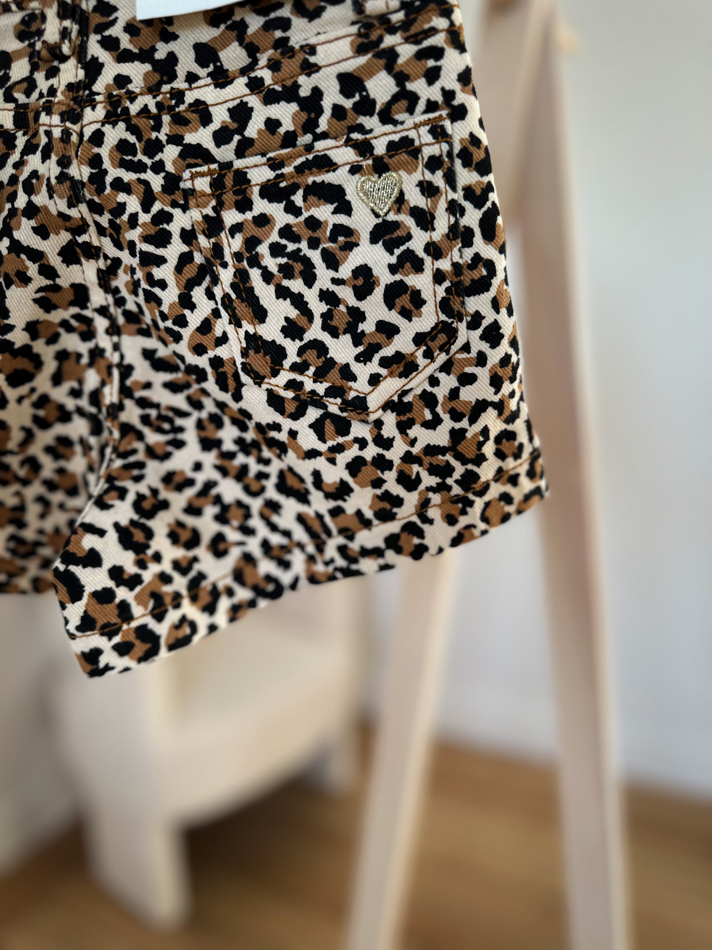 Short pour enfant imprimé léopard. Il se ferme avec un bouton et possibilité de le resserrer de l'intérieur . La matière est semblable à un jeans.