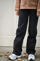 Ce jean noir orné de strass présente une coupe droite avec une taille haute pour un style élégant. Il se distingue par un cœur rouge brodé sur la poche arrière. Disponible en tailles 4, 6, 8, 10 et 12 ans, ce pantalon allie confort et originalité pour les enfants.