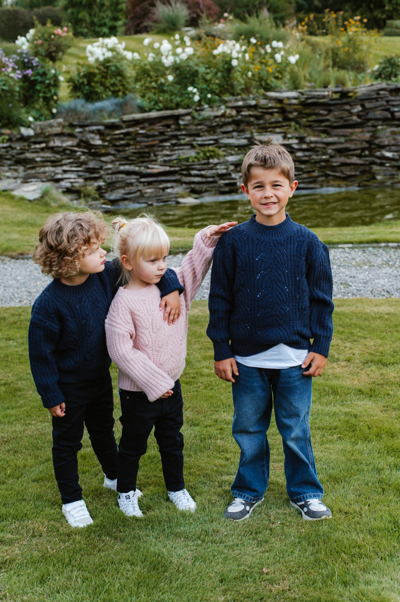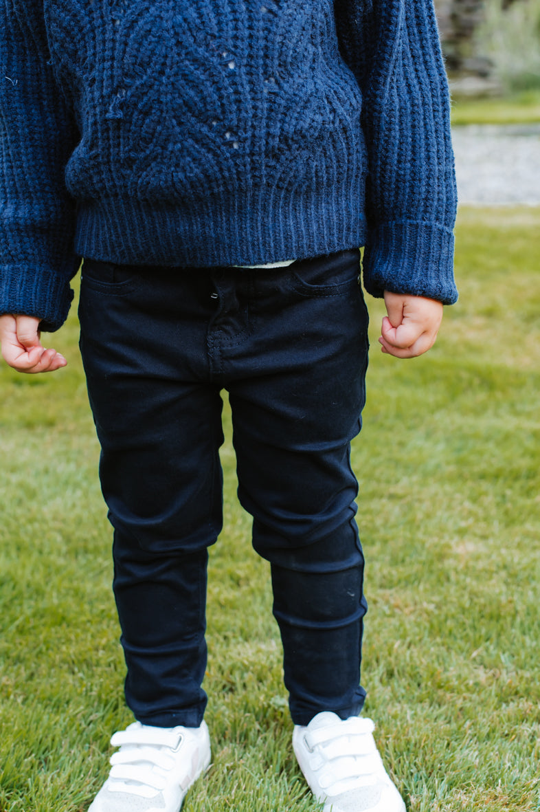 Jeans slim bleu très foncé. Réglable à la taille. Disponible en taille 2 ans, 4 ans, 6 ans, 8 ans, 10 ans, 12 ans.