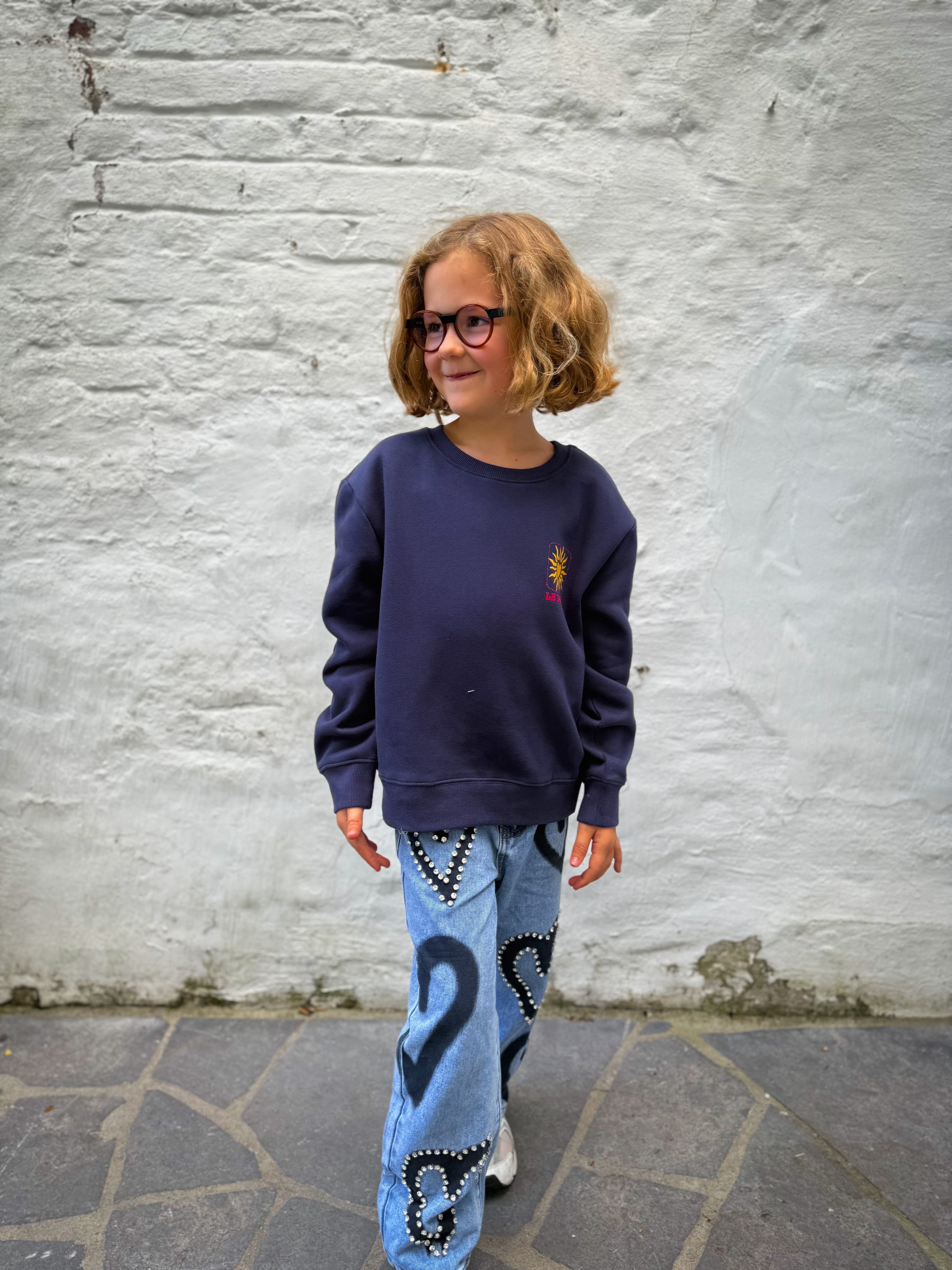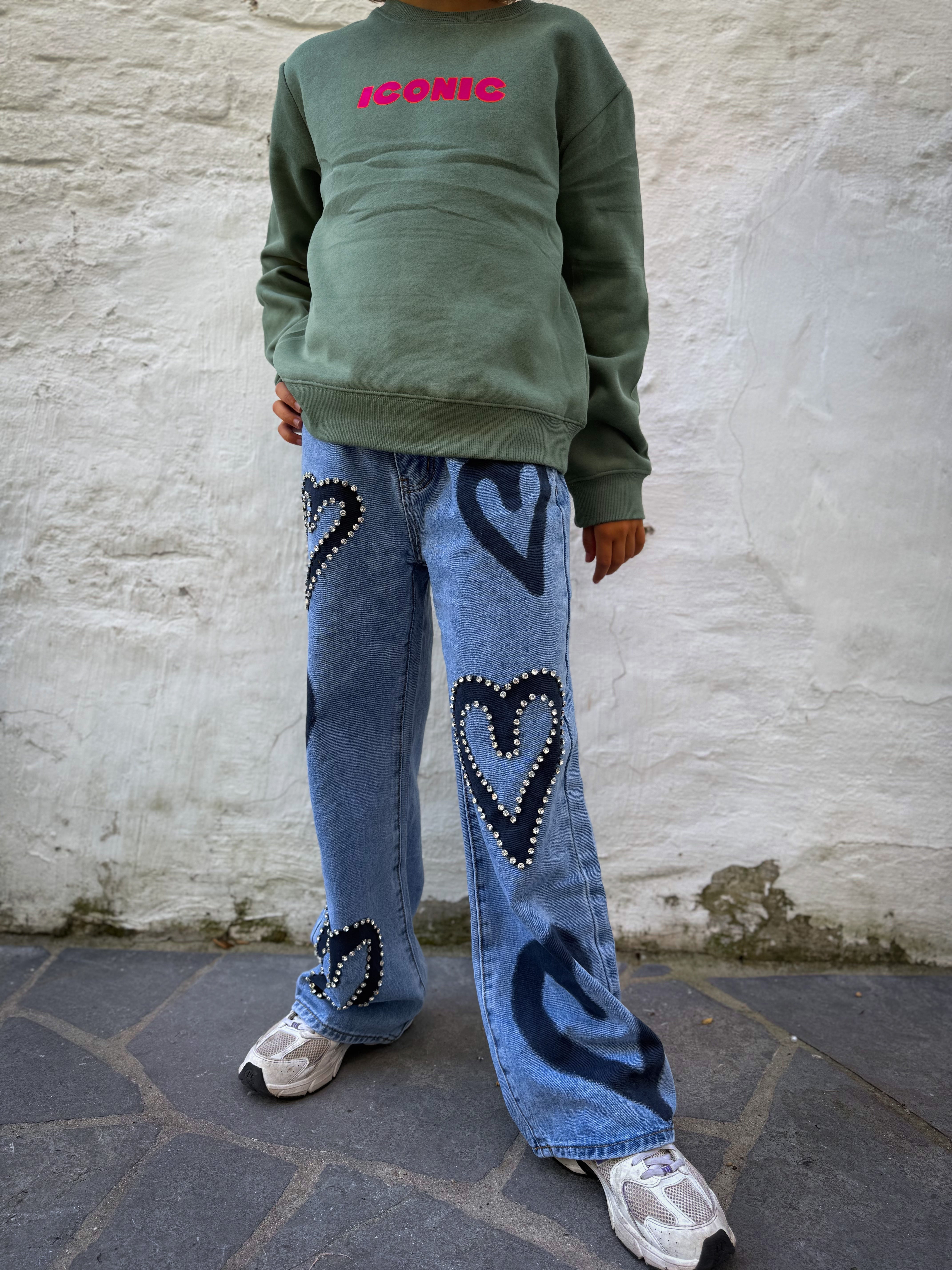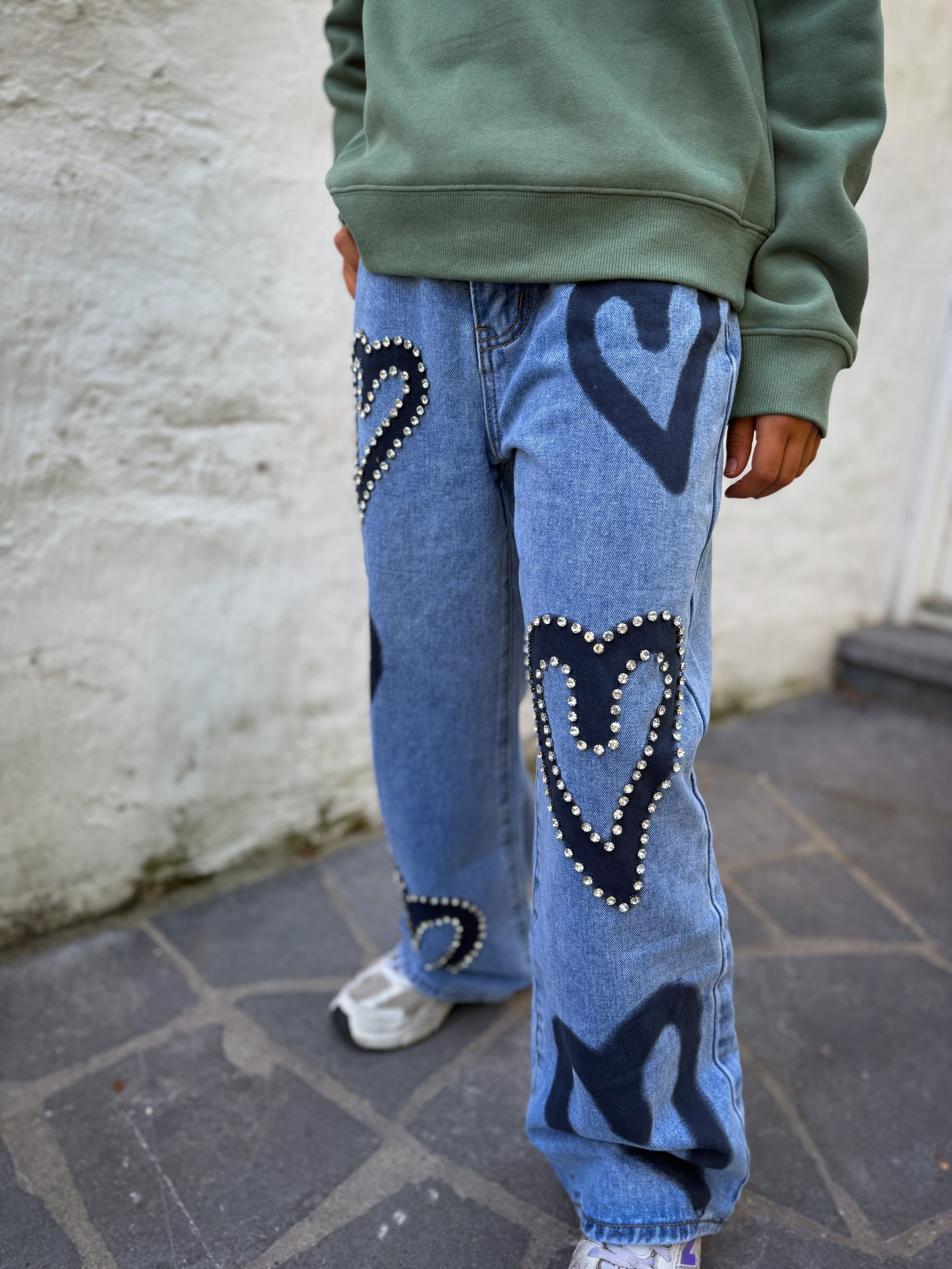 Jeans enfant en toile bleu décorés de cœurs bleus, dont l'un est orné de strass, disponibles du 4 ans au 14 ans.