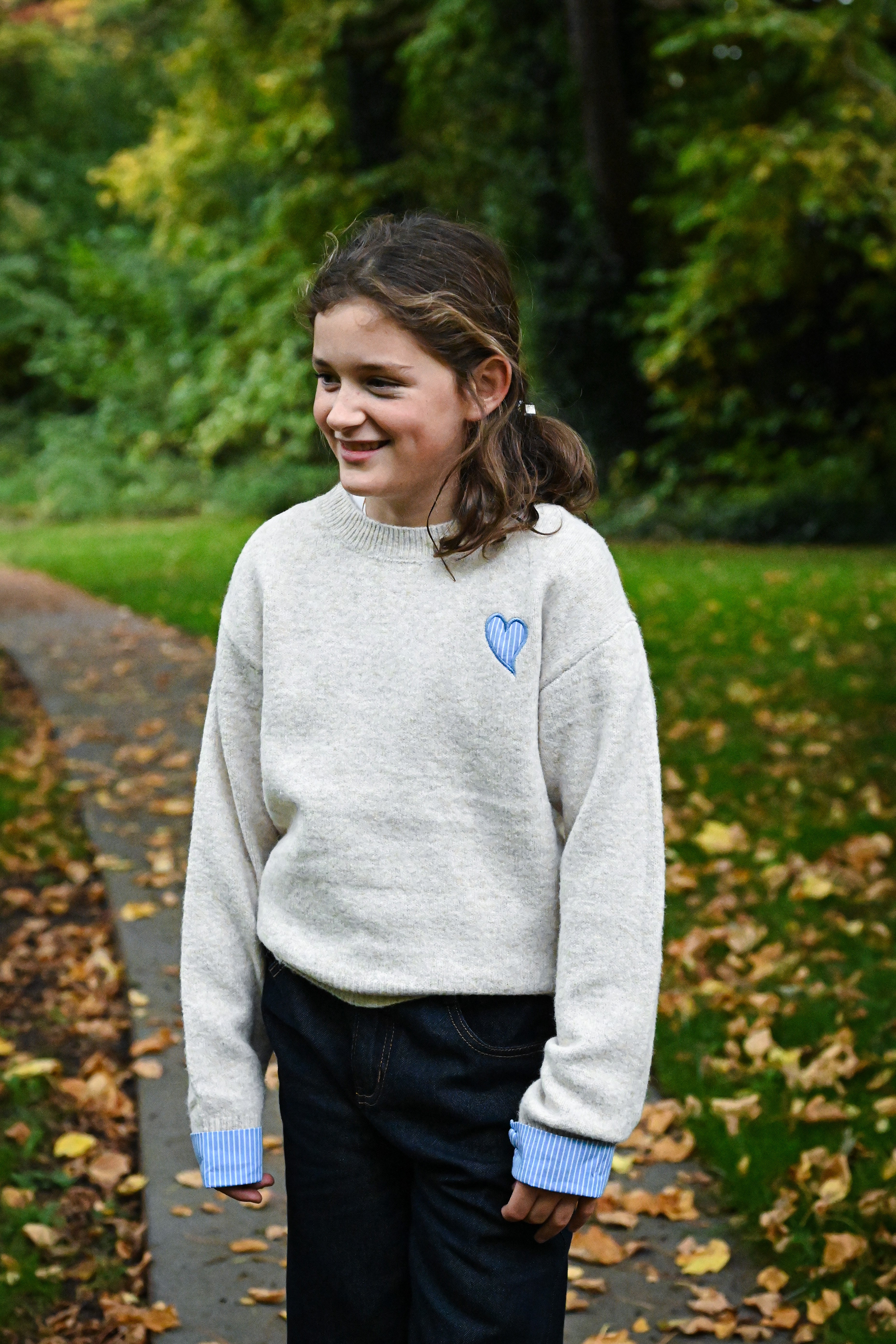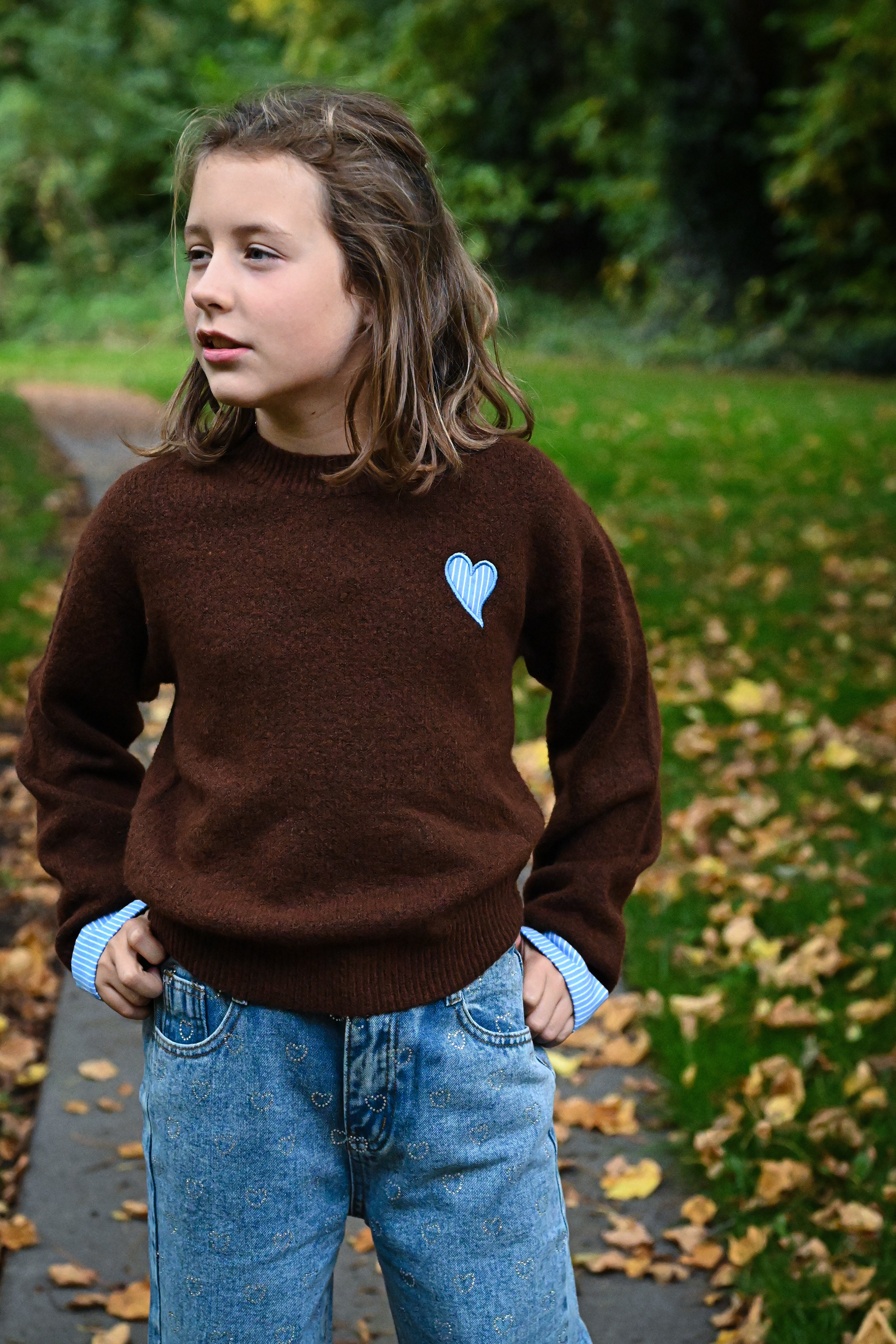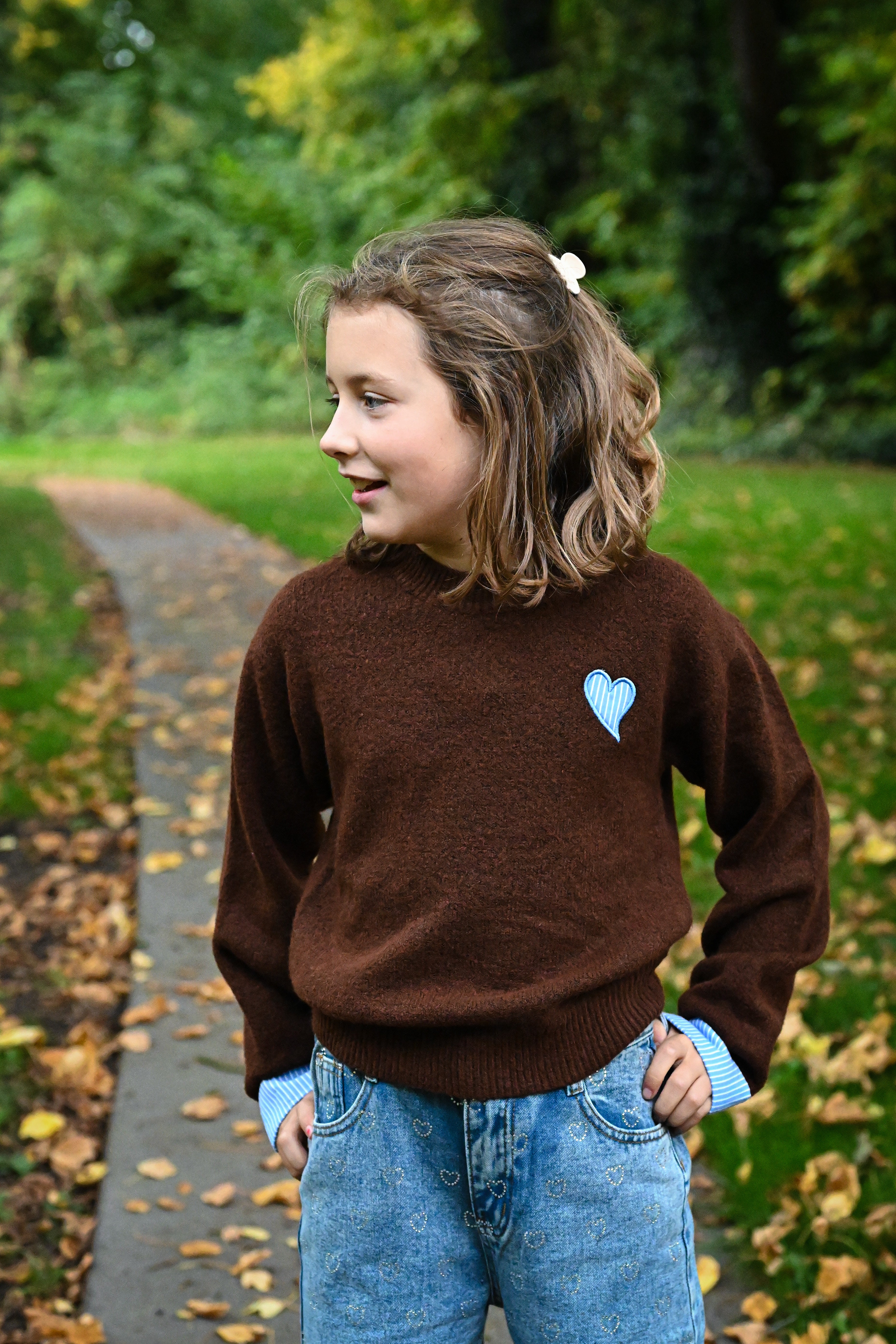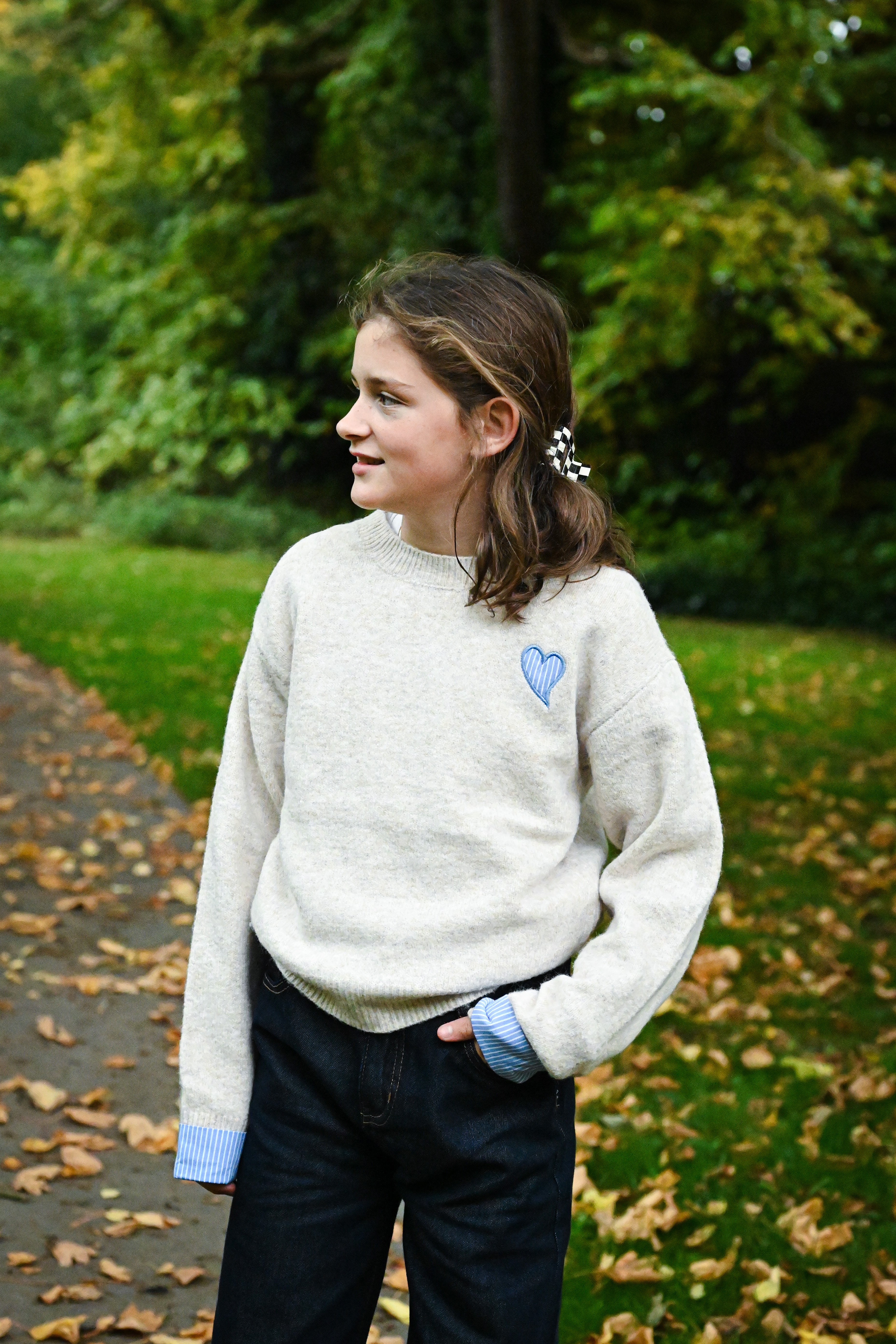 Disponible en beige clair ou chocolat, ce pull mini ALIX, conçu en maille toute douce, s’adresse aux enfants de 4 à 14 ans. Il affiche un motif cœur bleu avec un liseré blanc sur la poitrine, tandis que les manches finissent par une touche chemise bleue rayée blanche agrémentée d’un petit bouton, alliant confort et style avec élégance.