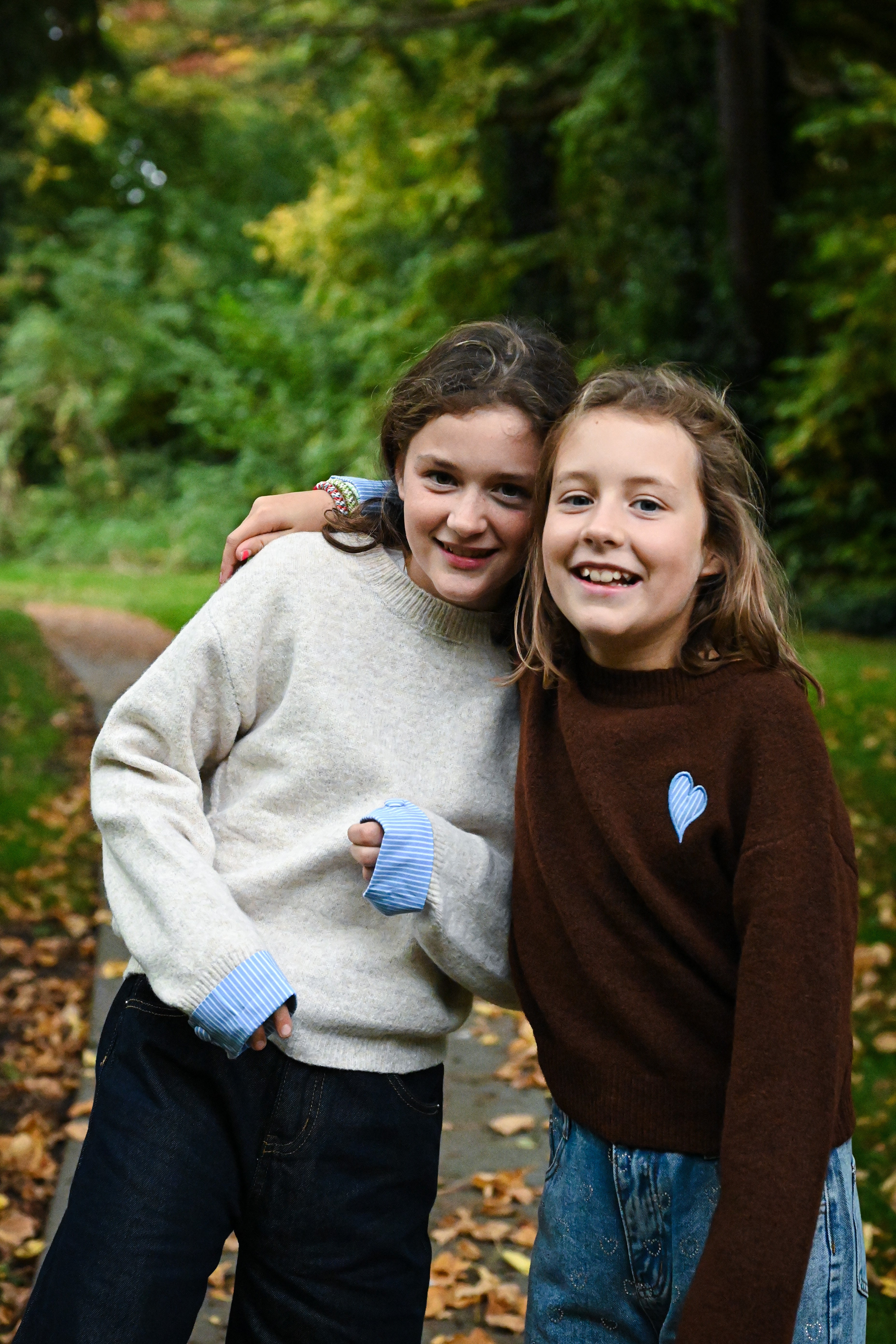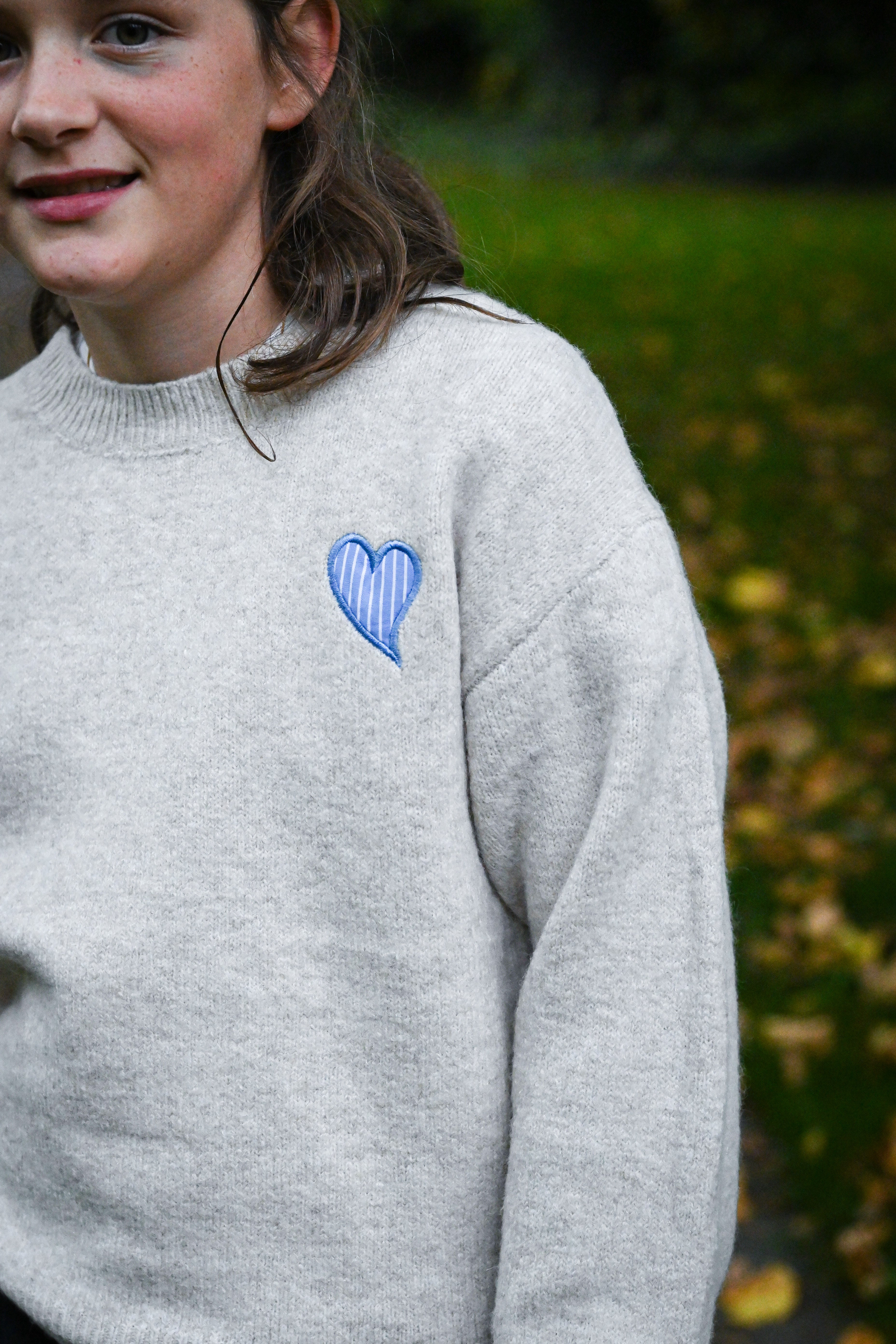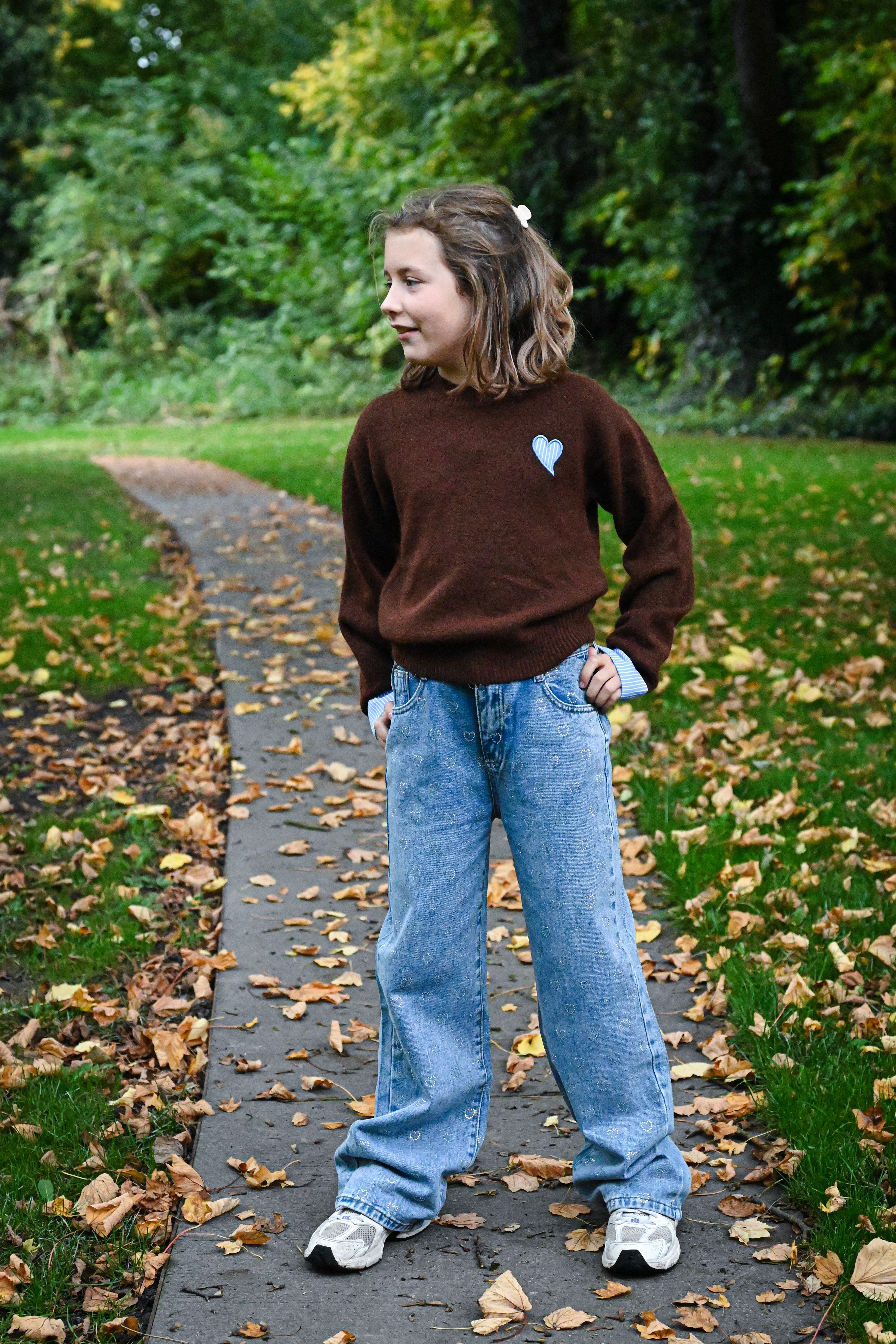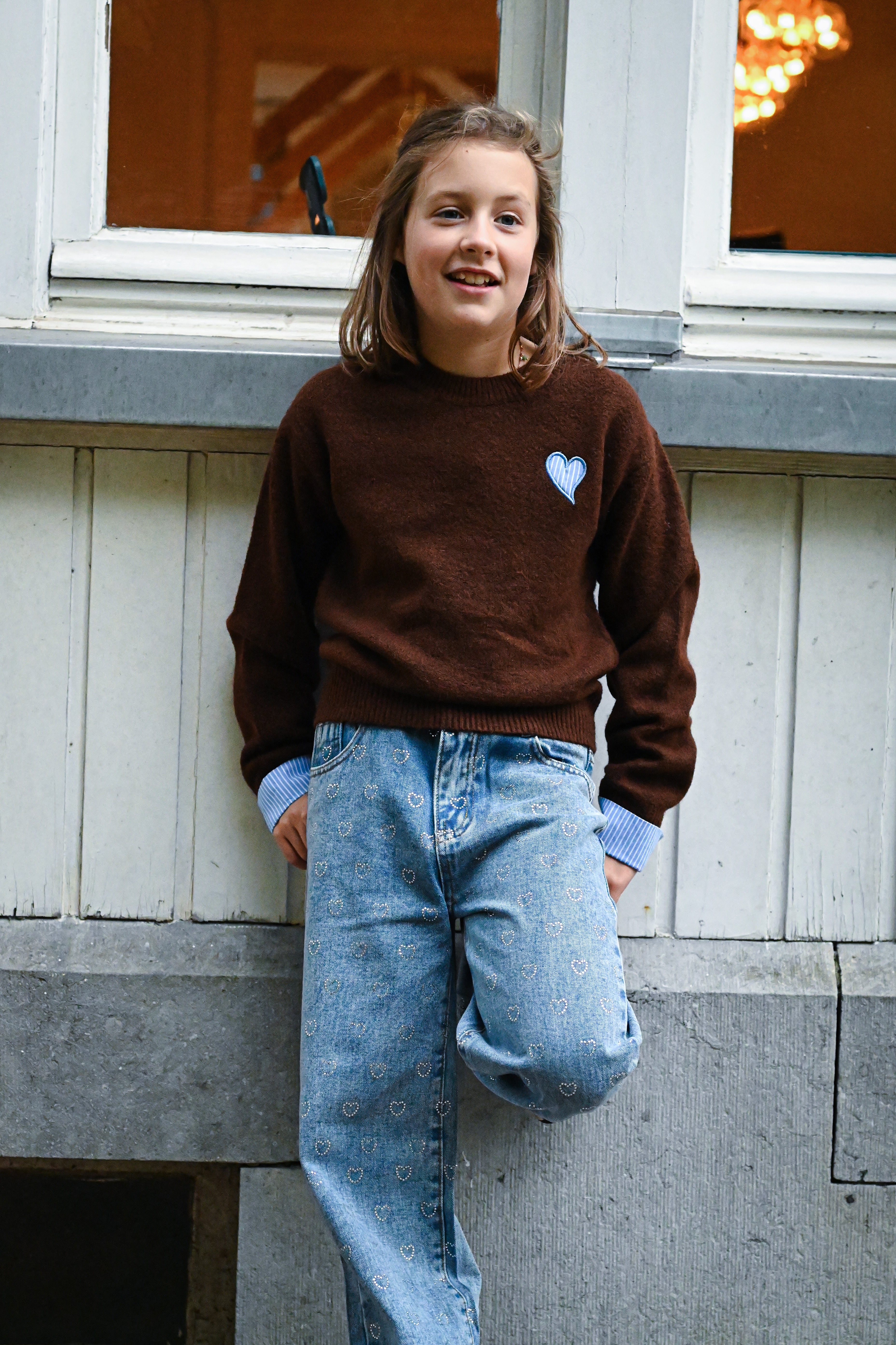 Disponible en beige clair ou chocolat, ce pull mini ALIX, conçu en maille toute douce, s’adresse aux enfants de 4 à 14 ans. Il affiche un motif cœur bleu avec un liseré blanc sur la poitrine, tandis que les manches finissent par une touche chemise bleue rayée blanche agrémentée d’un petit bouton, alliant confort et style avec élégance.