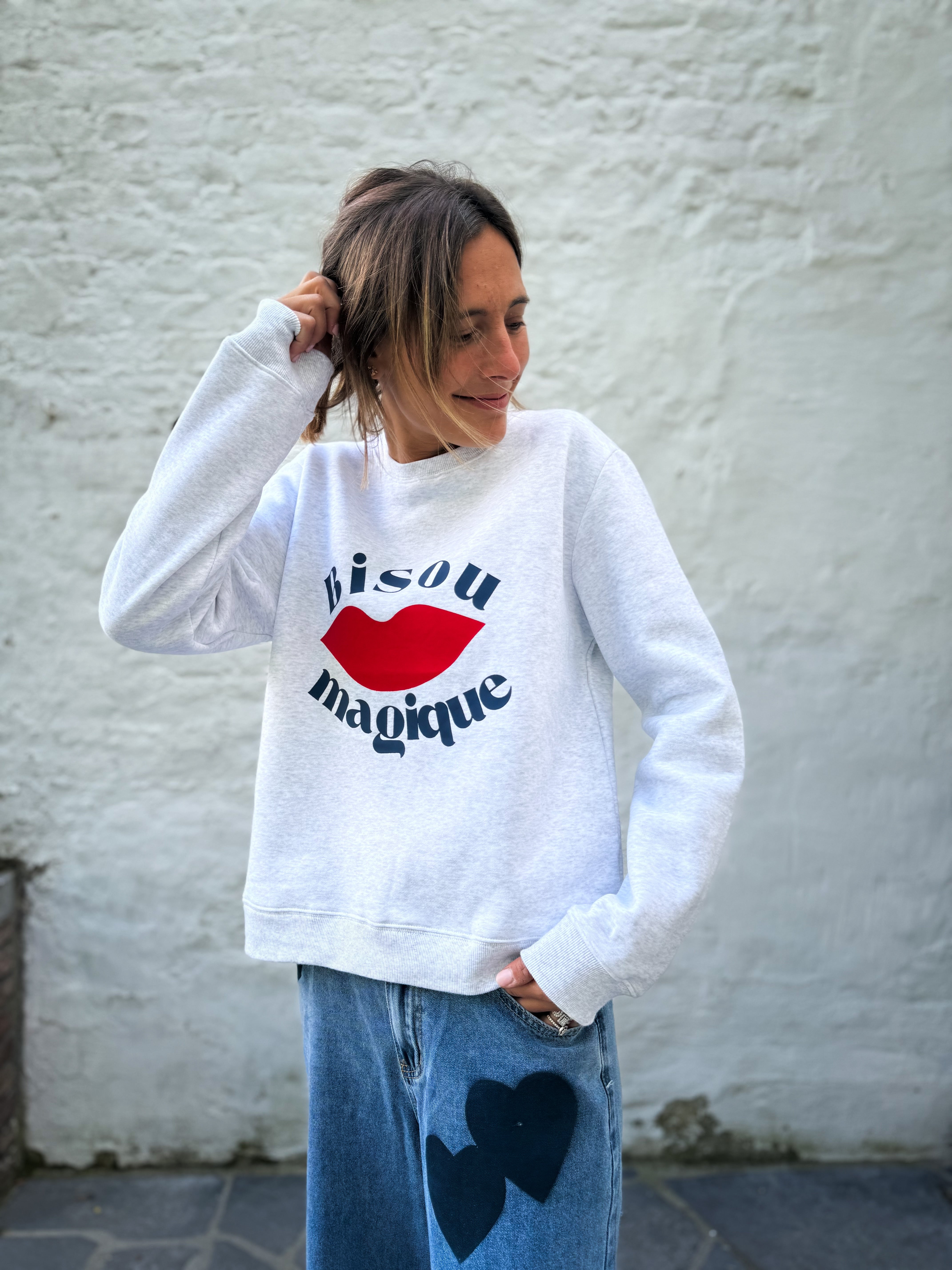 Sweat gris clair à col rond, orné de l’inscription « bisou magique » sur le devant. Ce modèle à manches longues est proposé dans les tailles allant de S à XL, idéal pour accompagner les adultes avec style et confort.