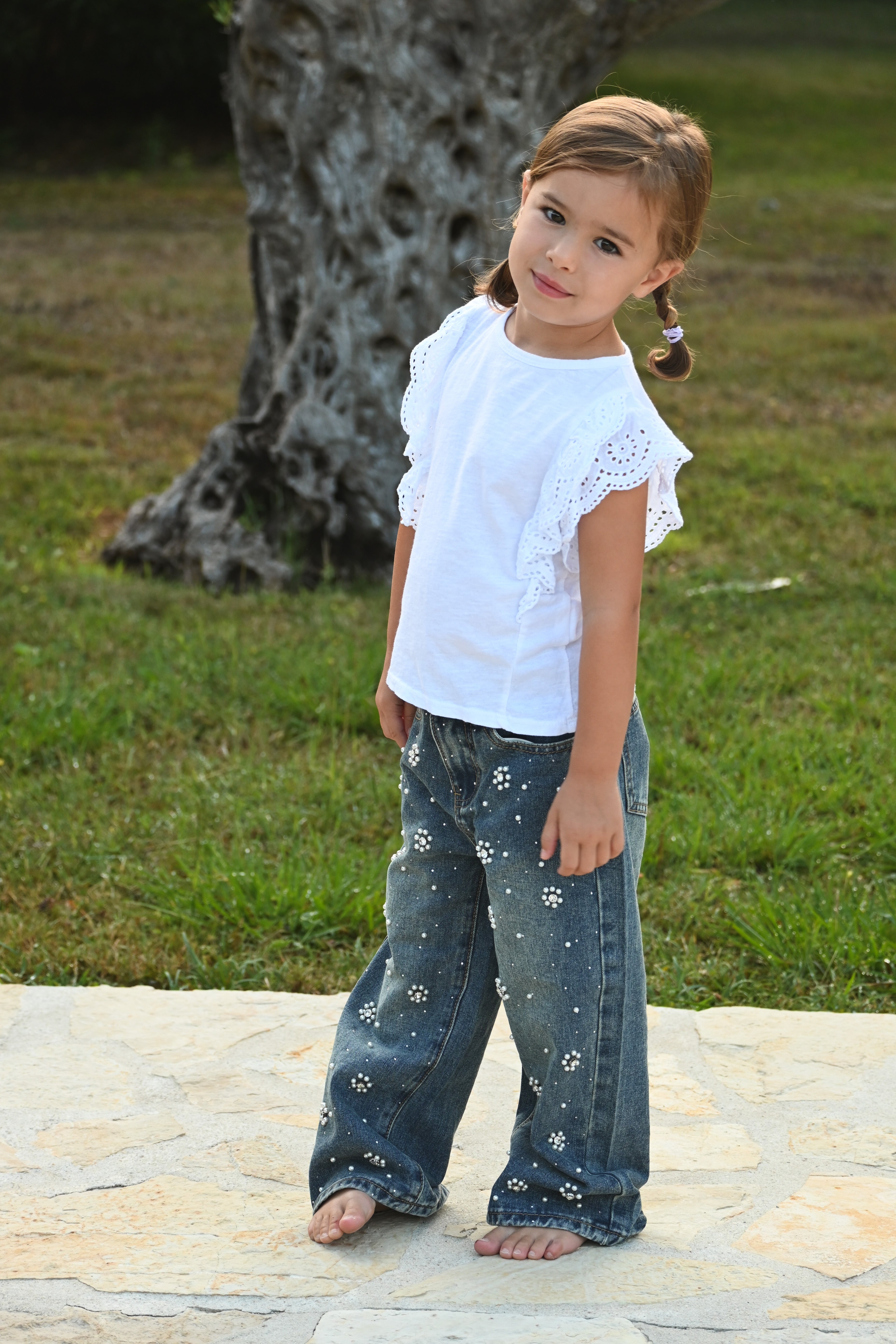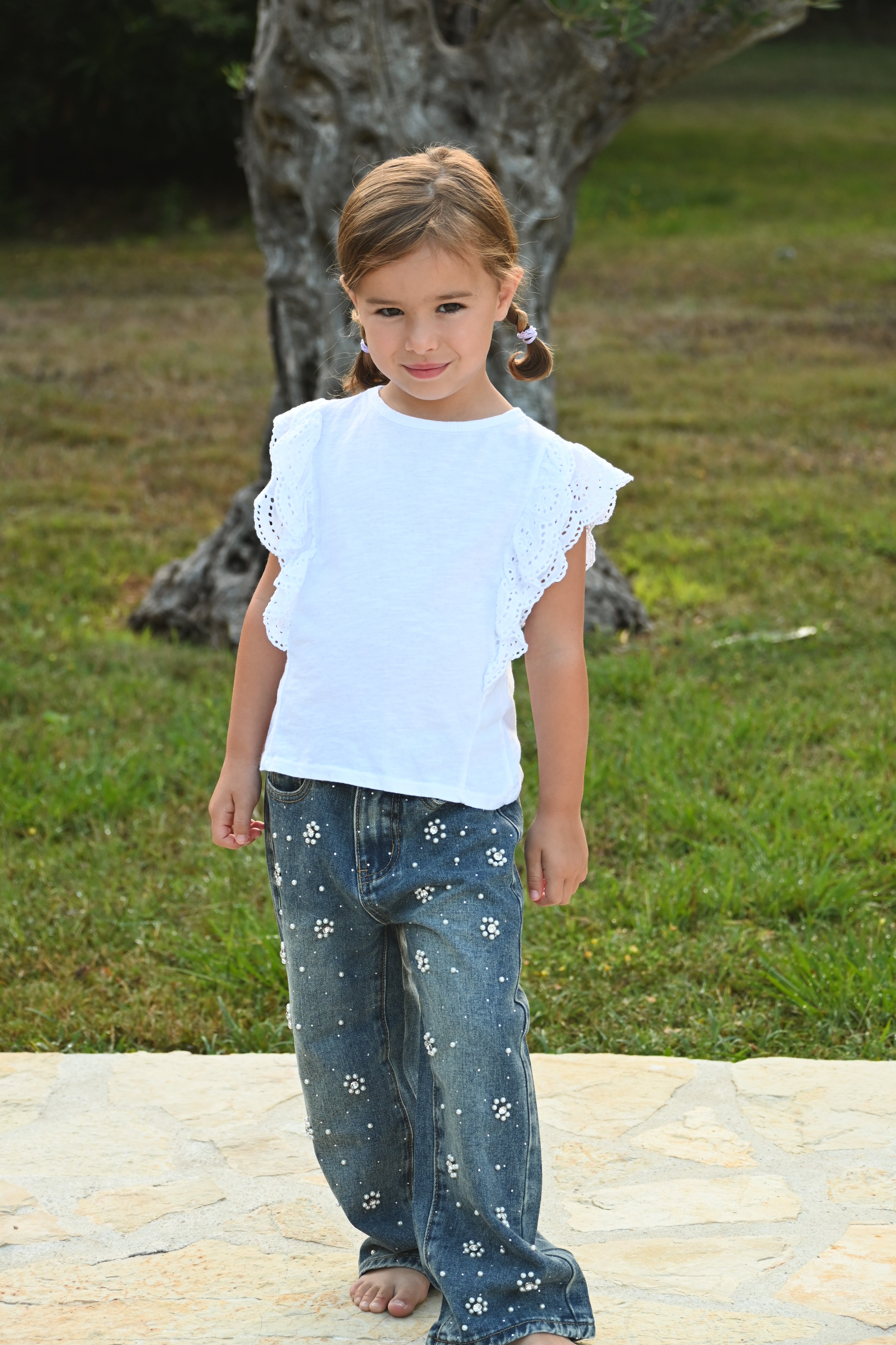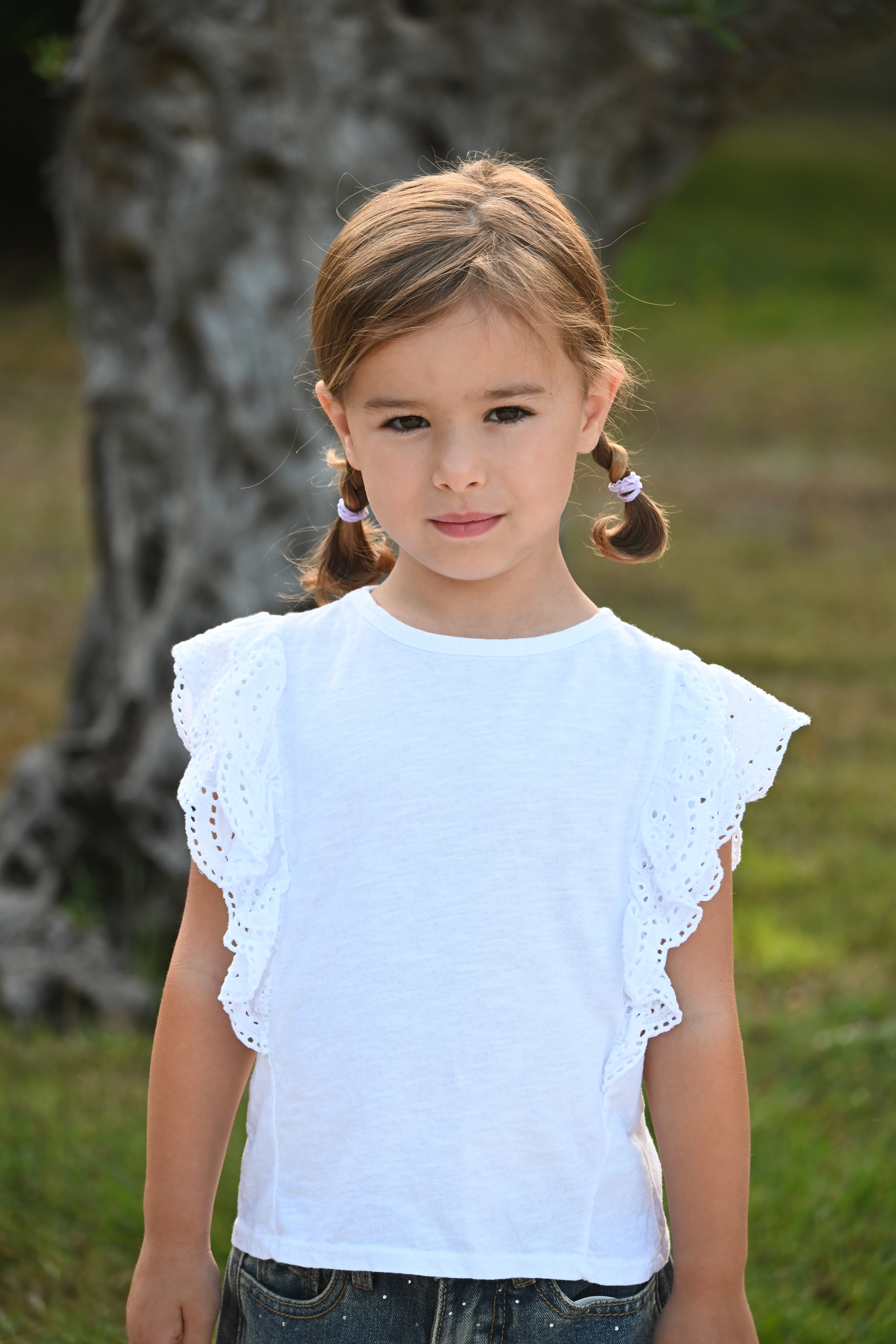 Ce t-shirt blanc simple est orné de délicats volants en dentelle sur les épaules. Disponible du 4 au 14 ans, il est confectionné en 100 % coton pour un confort optimal. Lavable à 30 degrés, il allie douceur et praticité pour les enfants.