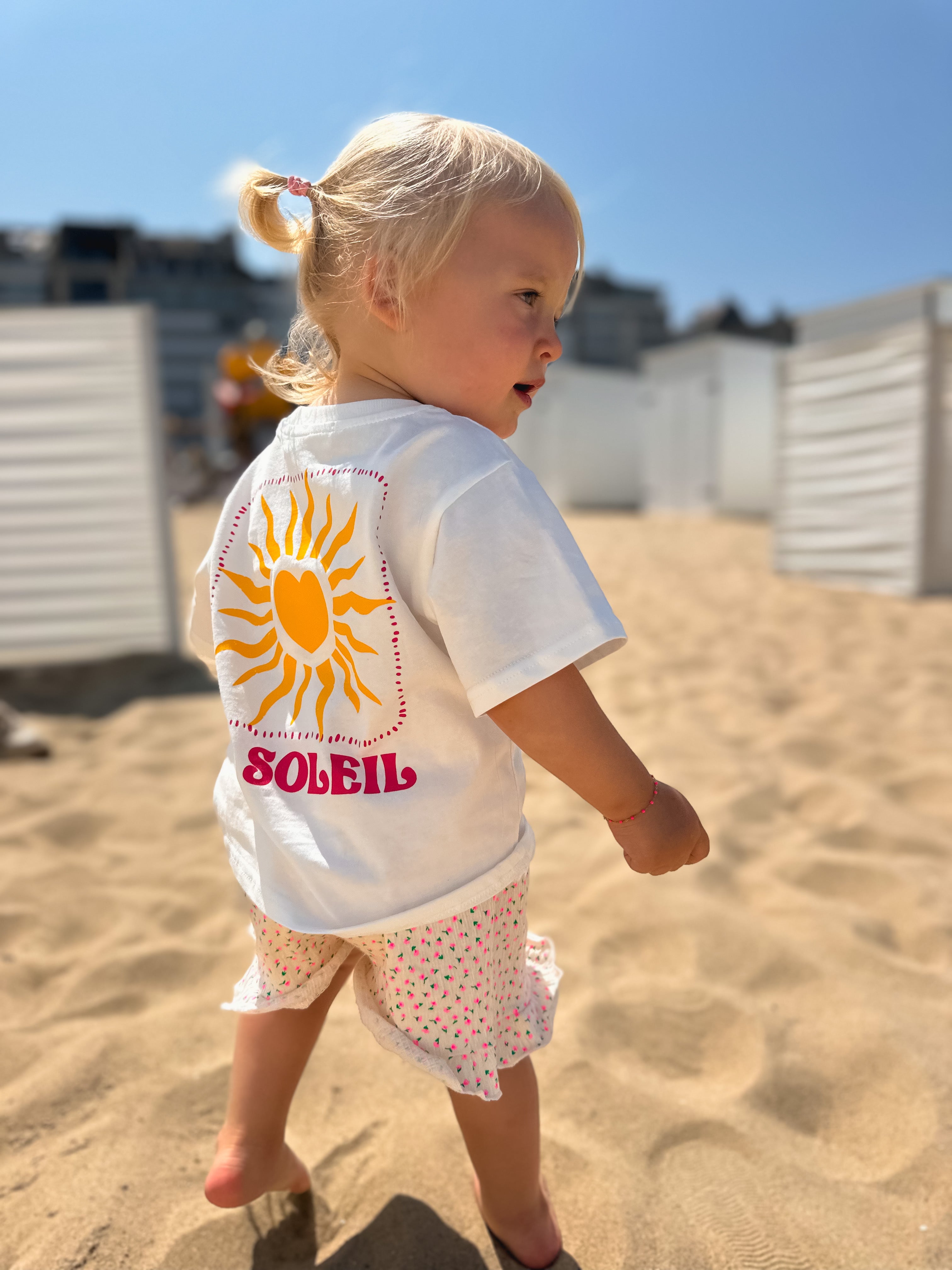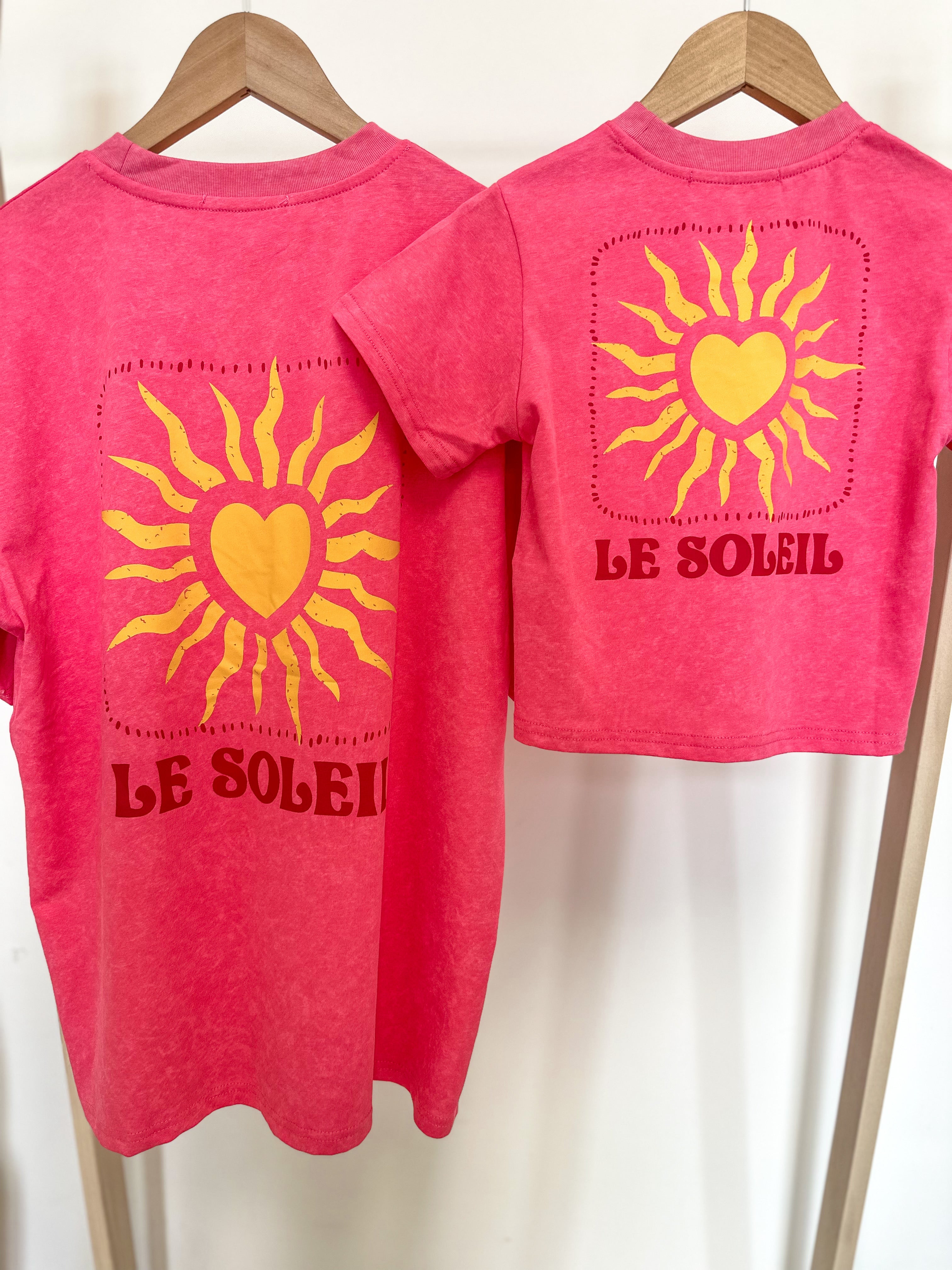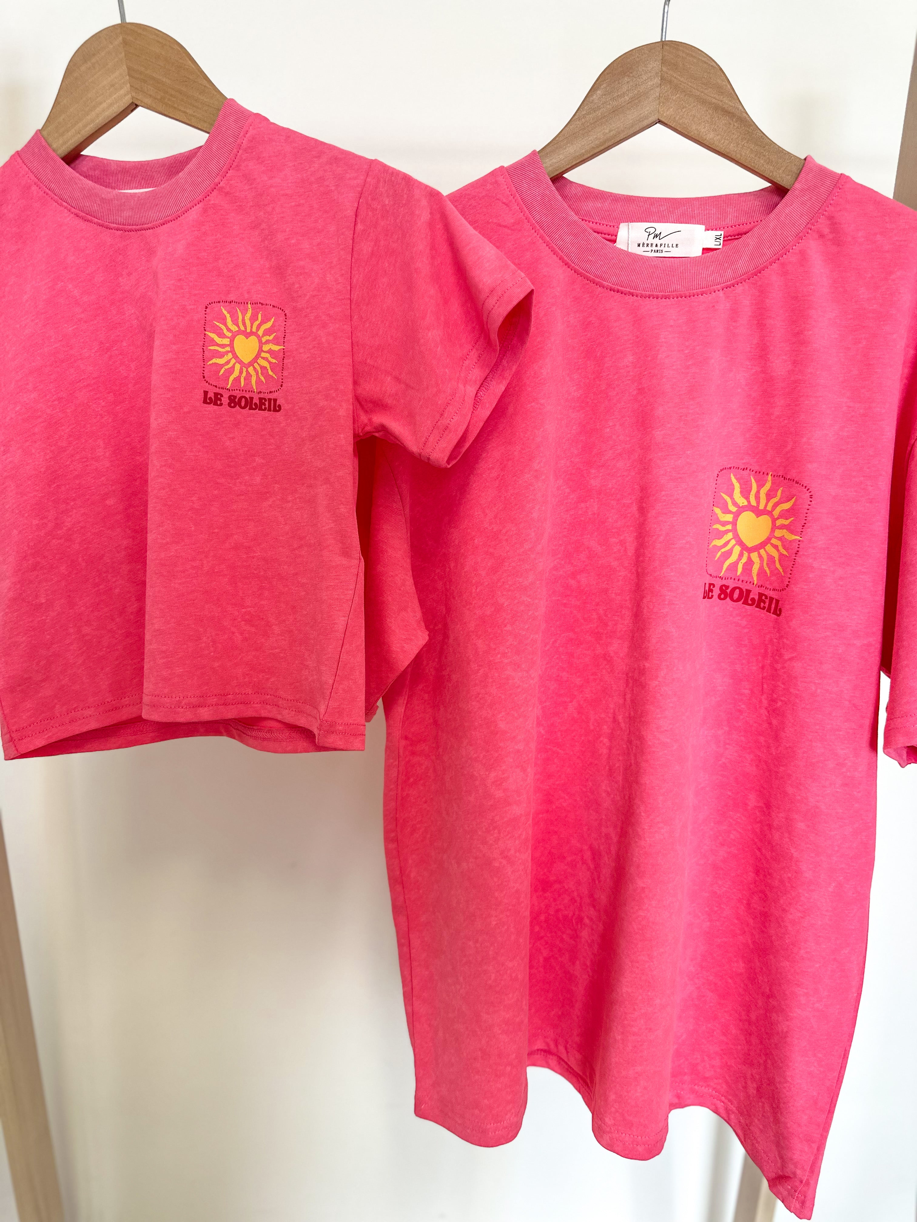 T-shirt rose, avec un dessin de soleil à l'avant et dans le dos. Disponible de la taille 2/3 ans à la taille 12 ans.