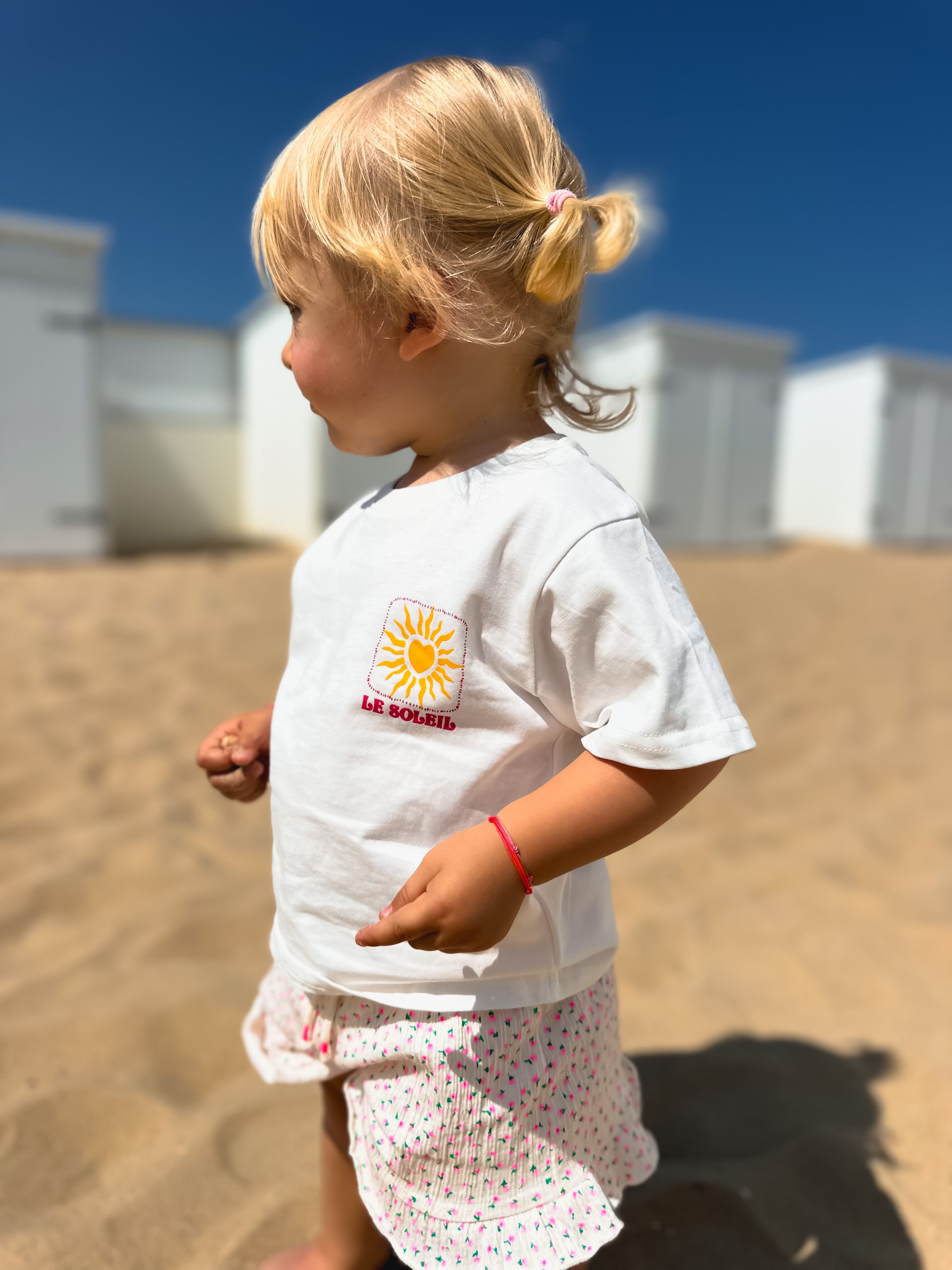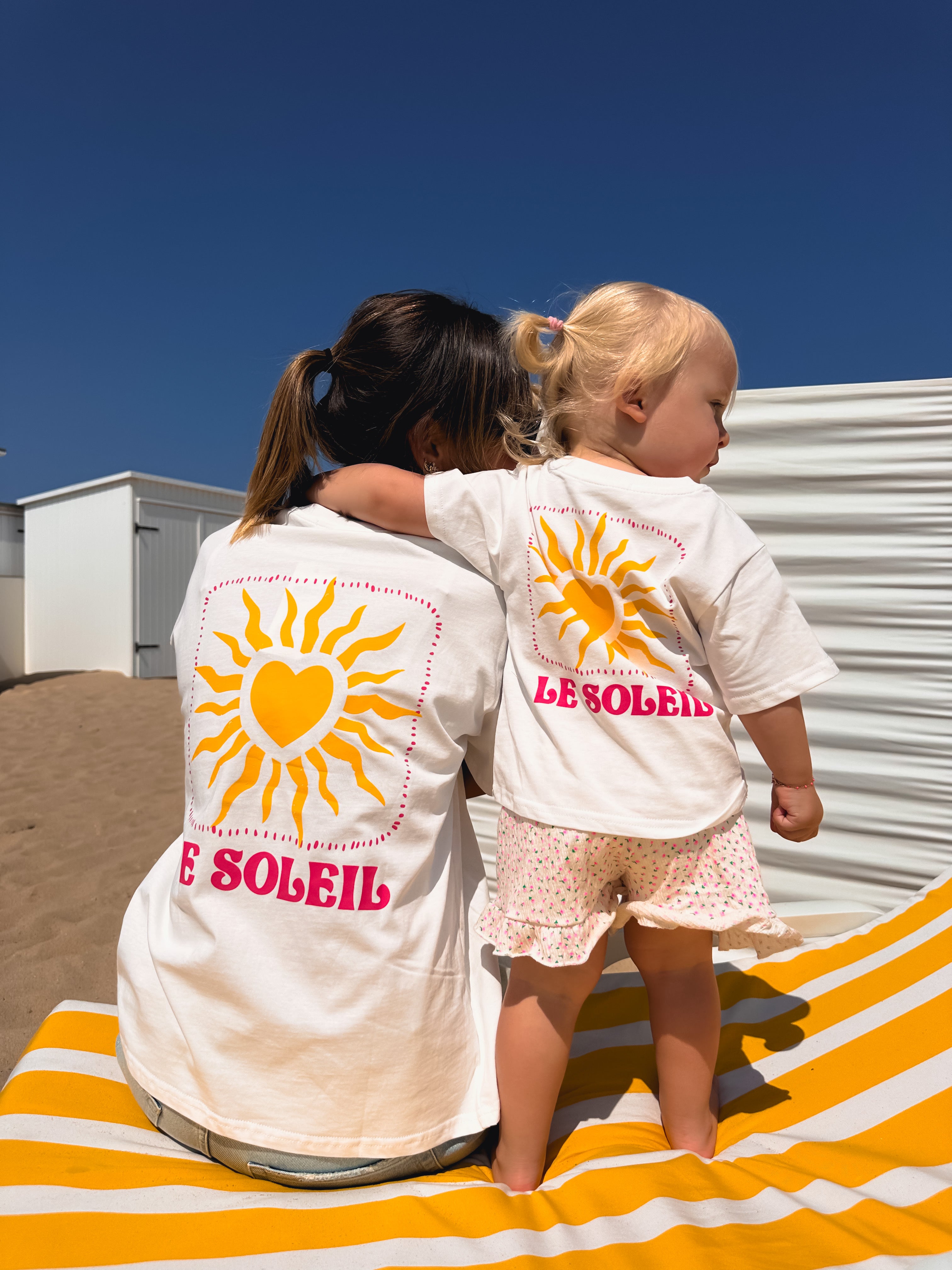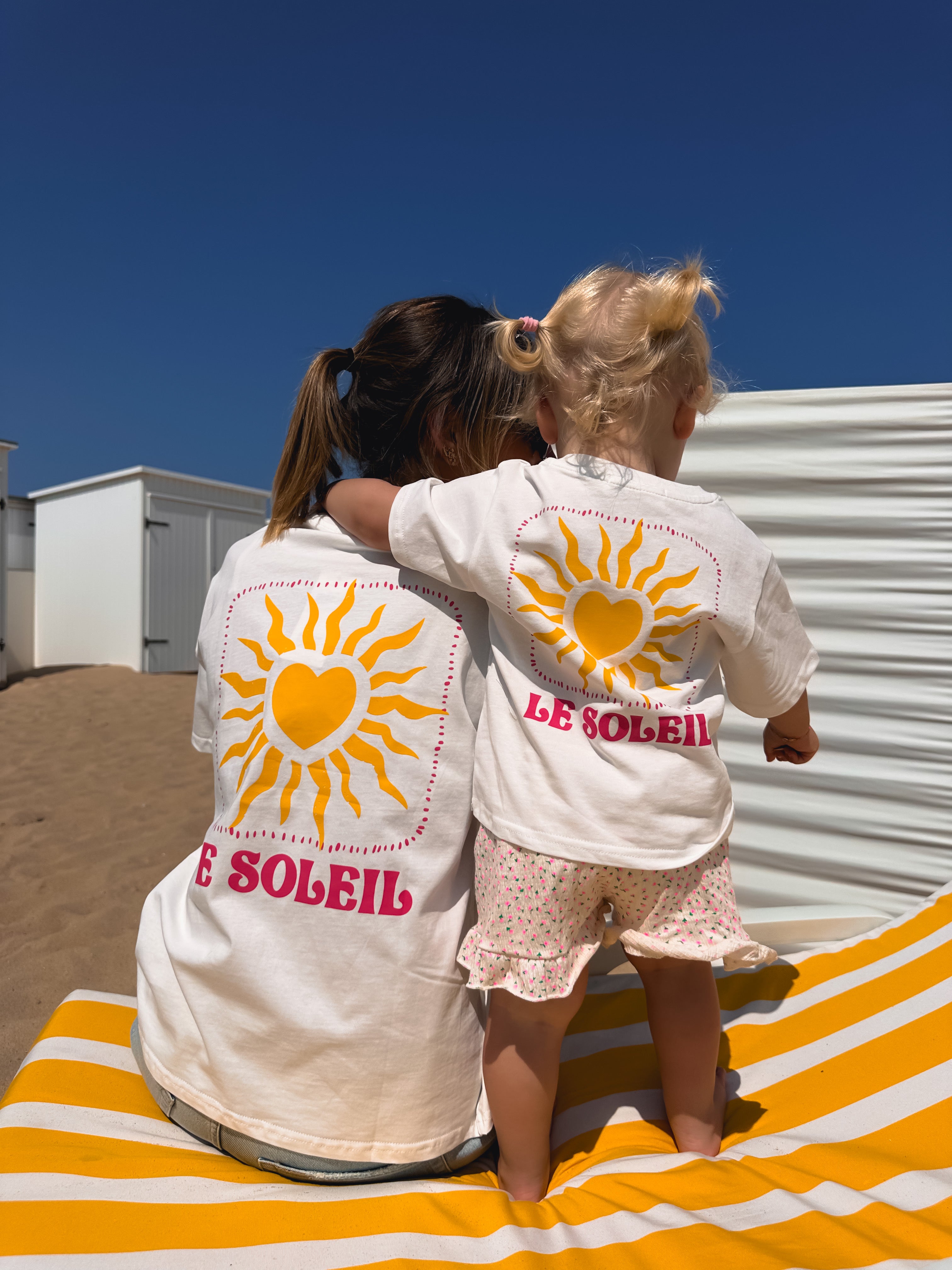 T-shirt rose, avec un dessin de soleil à l'avant et dans le dos. Disponible de la taille 2/3 ans à la taille 12 ans.