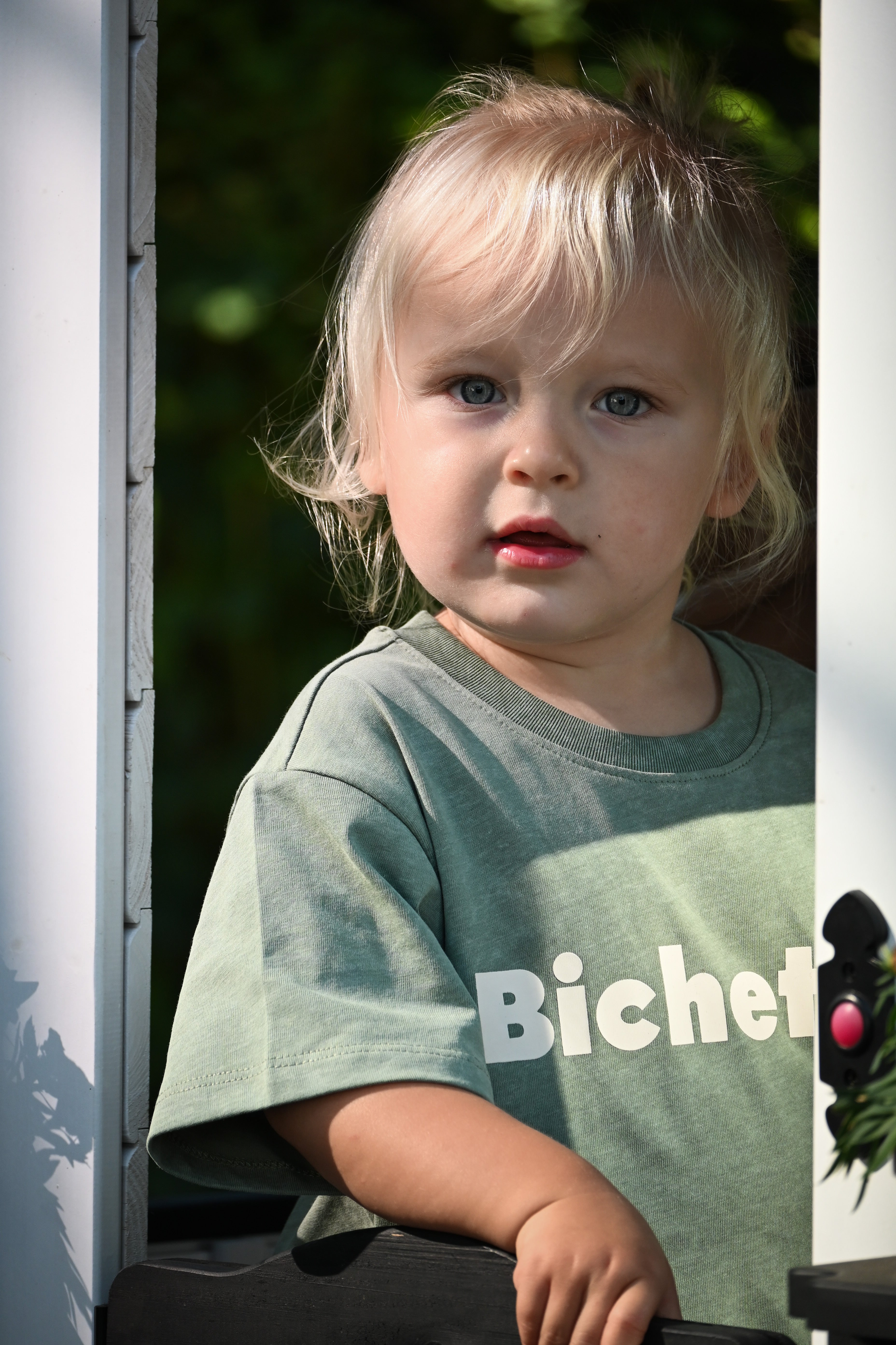 T-shirt vert avec inscription "Bichette" en blanc. Disponible en taille 2/3 ans, 4 ans, 6 ans, 8 ans, 10 ans et 12 ans.