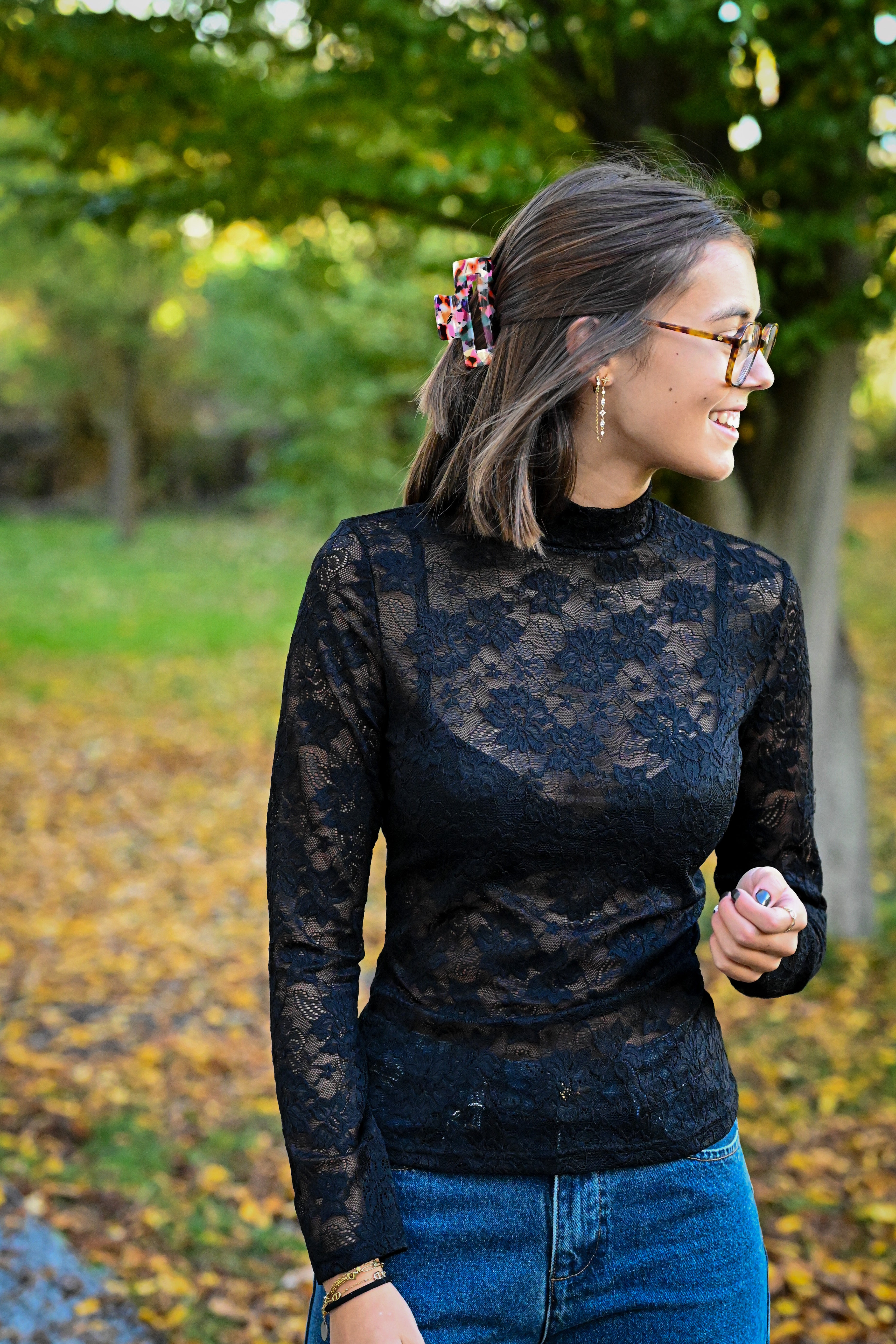 La blouse ADRIA. Vêtue de dentelle délicate, elle séduira par ses manches longues gracieuses et son col montant qui encadre parfaitement le visage. Disponible en trois tailles (S, M, L), elle s'adapte à chaque morphologie pour vous offrir un confort optimal et une allure irrésistible, idéale pour affirmer votre élégance au quotidien.