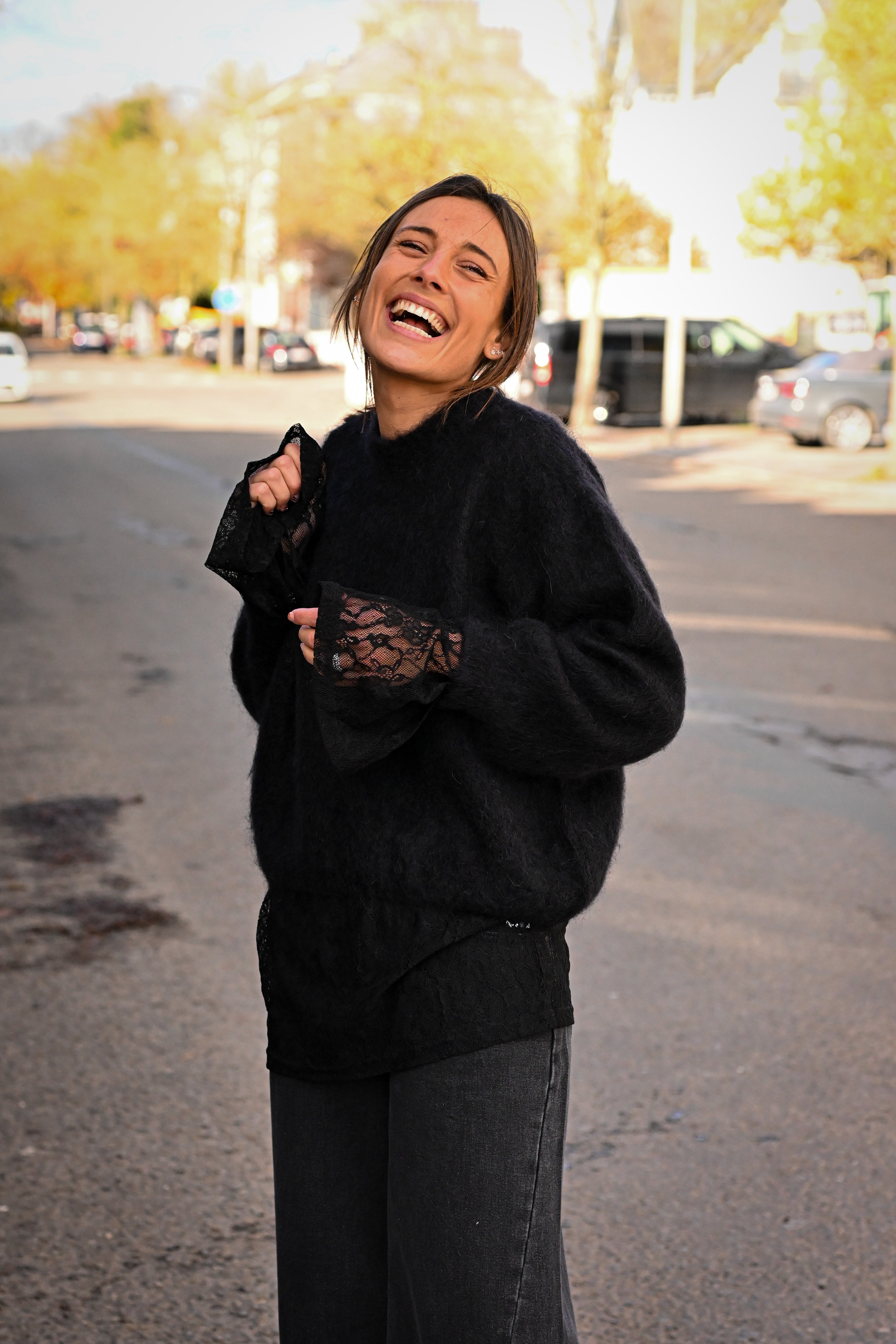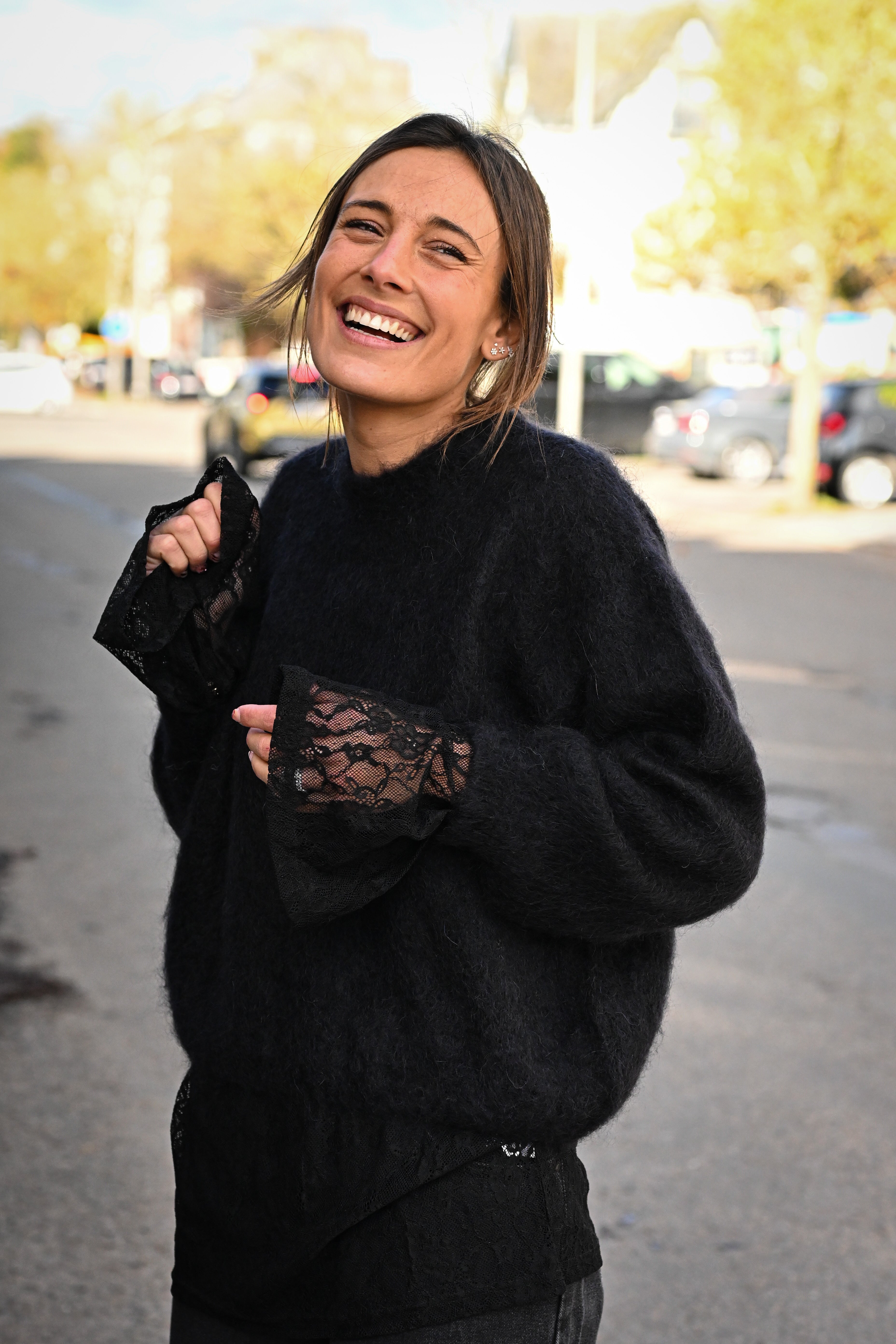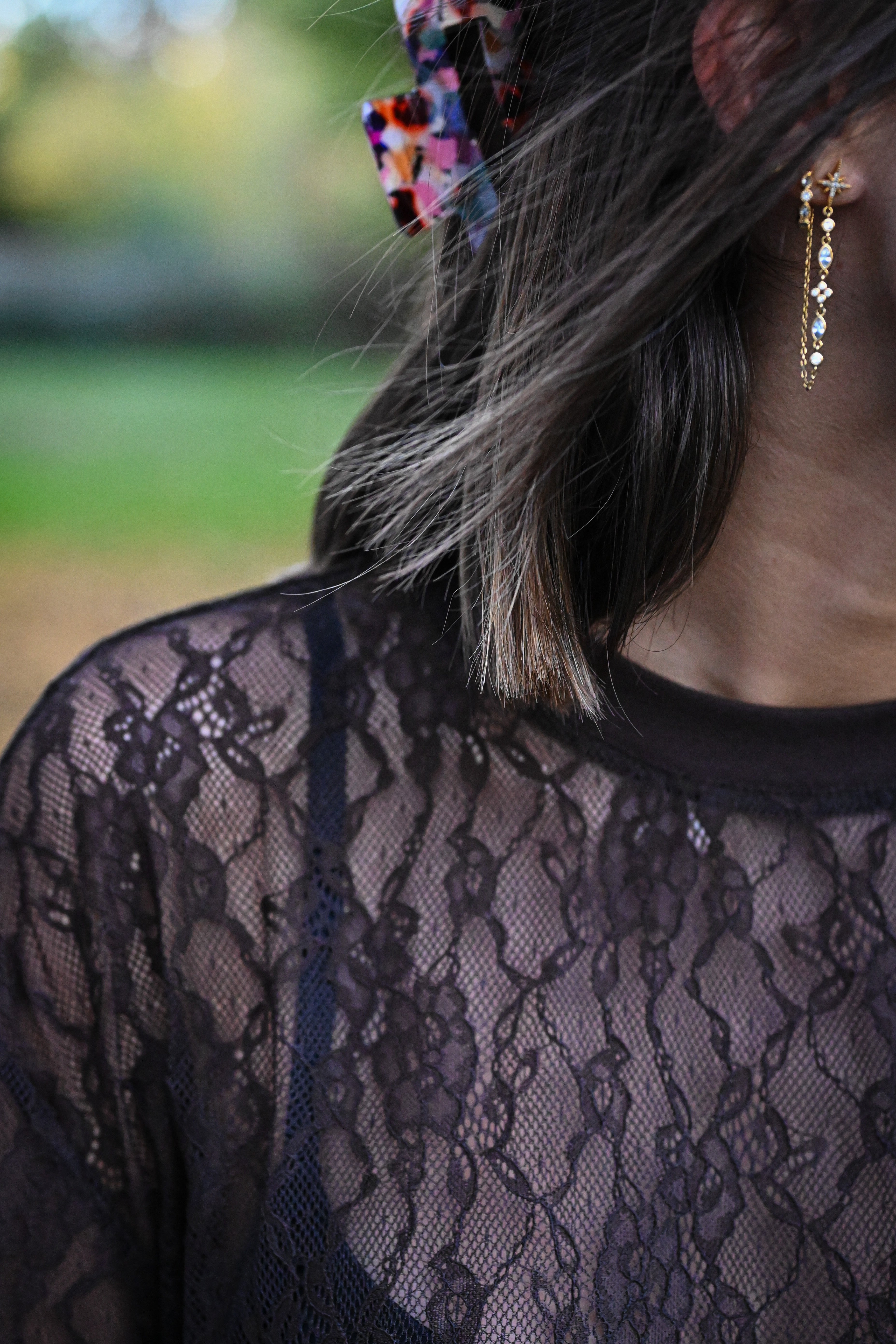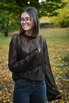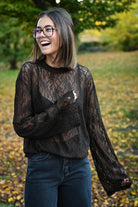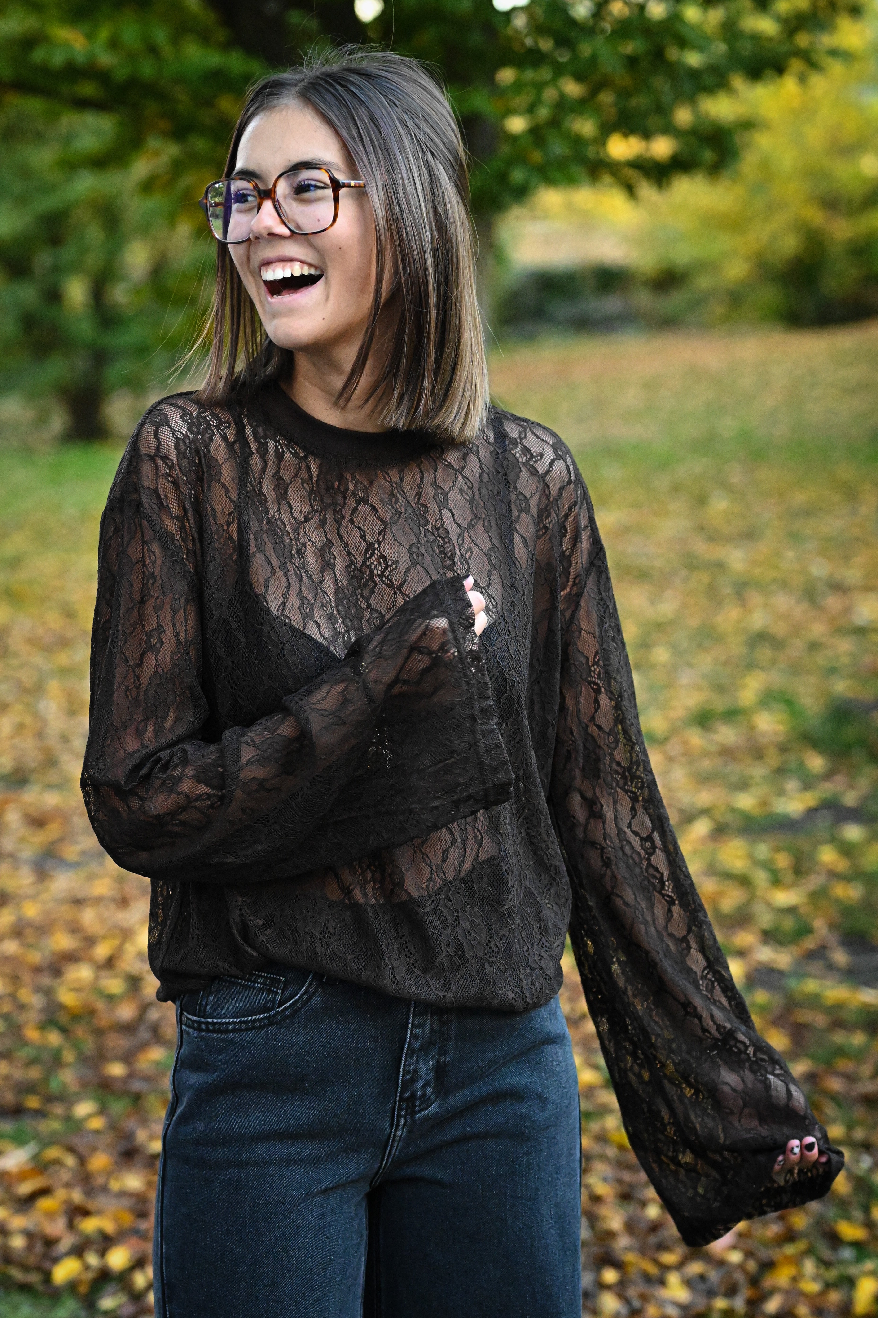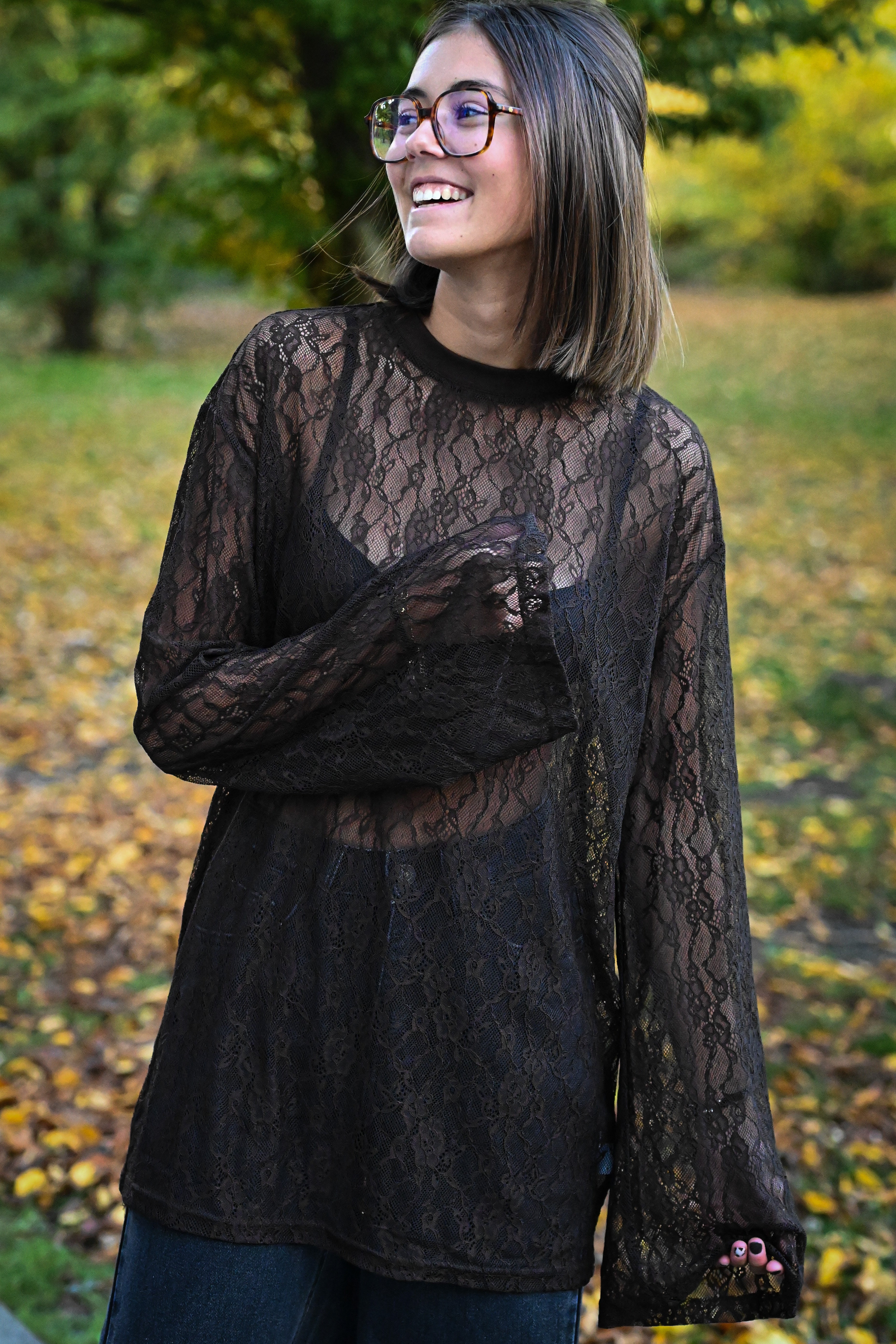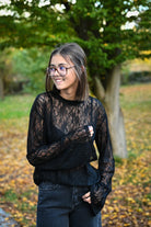 Blouse noire à manches longues en dentelle dotée d'une transparence subtile et d'un col rond classique. Coupe épurée en taille unique, cette pièce incontournable allie élégance et polyvalence pour un style raffiné au quotidien.