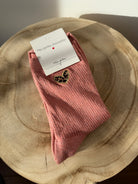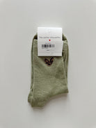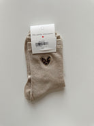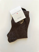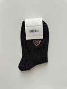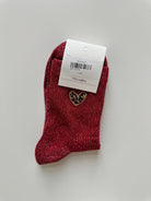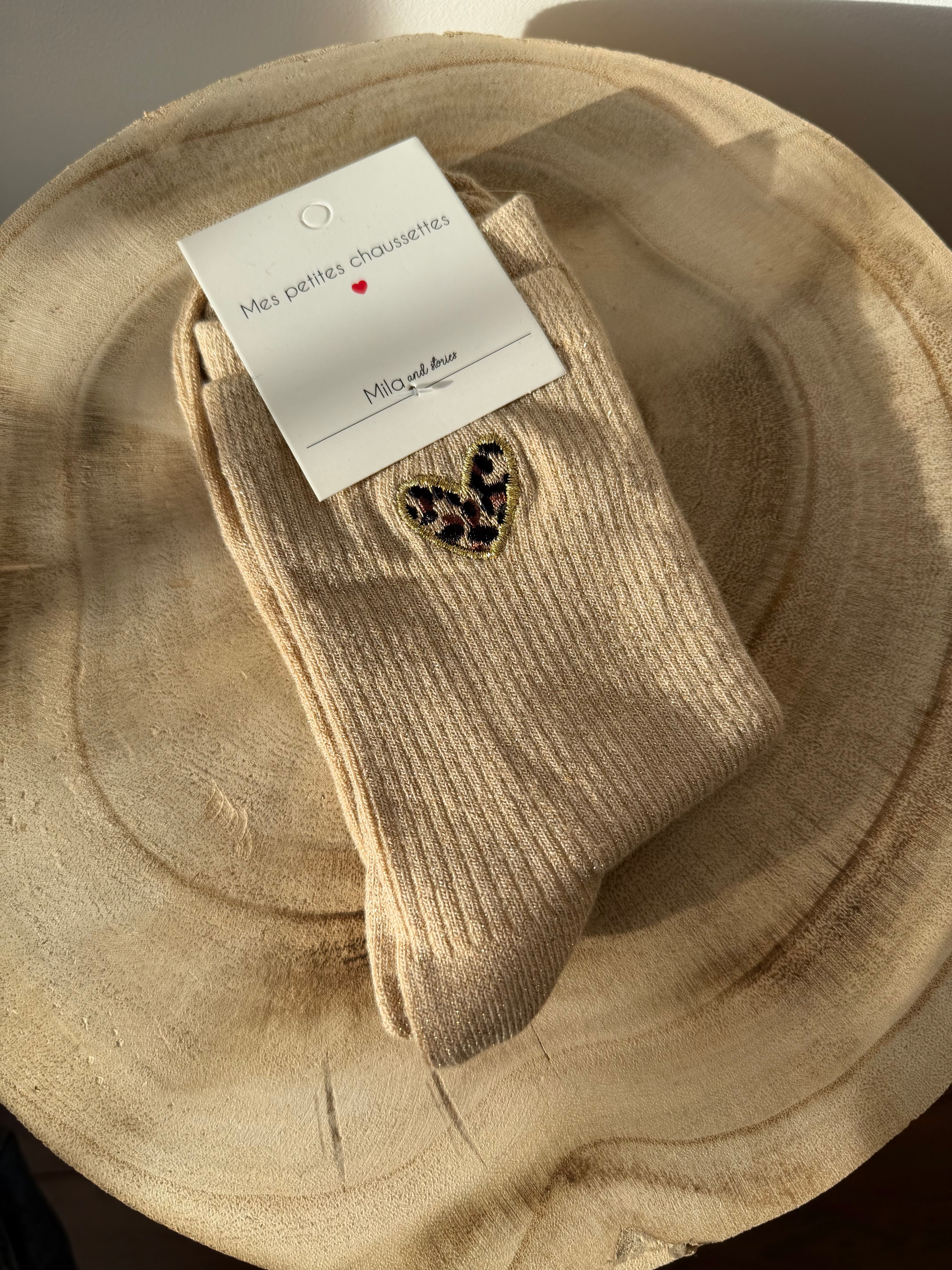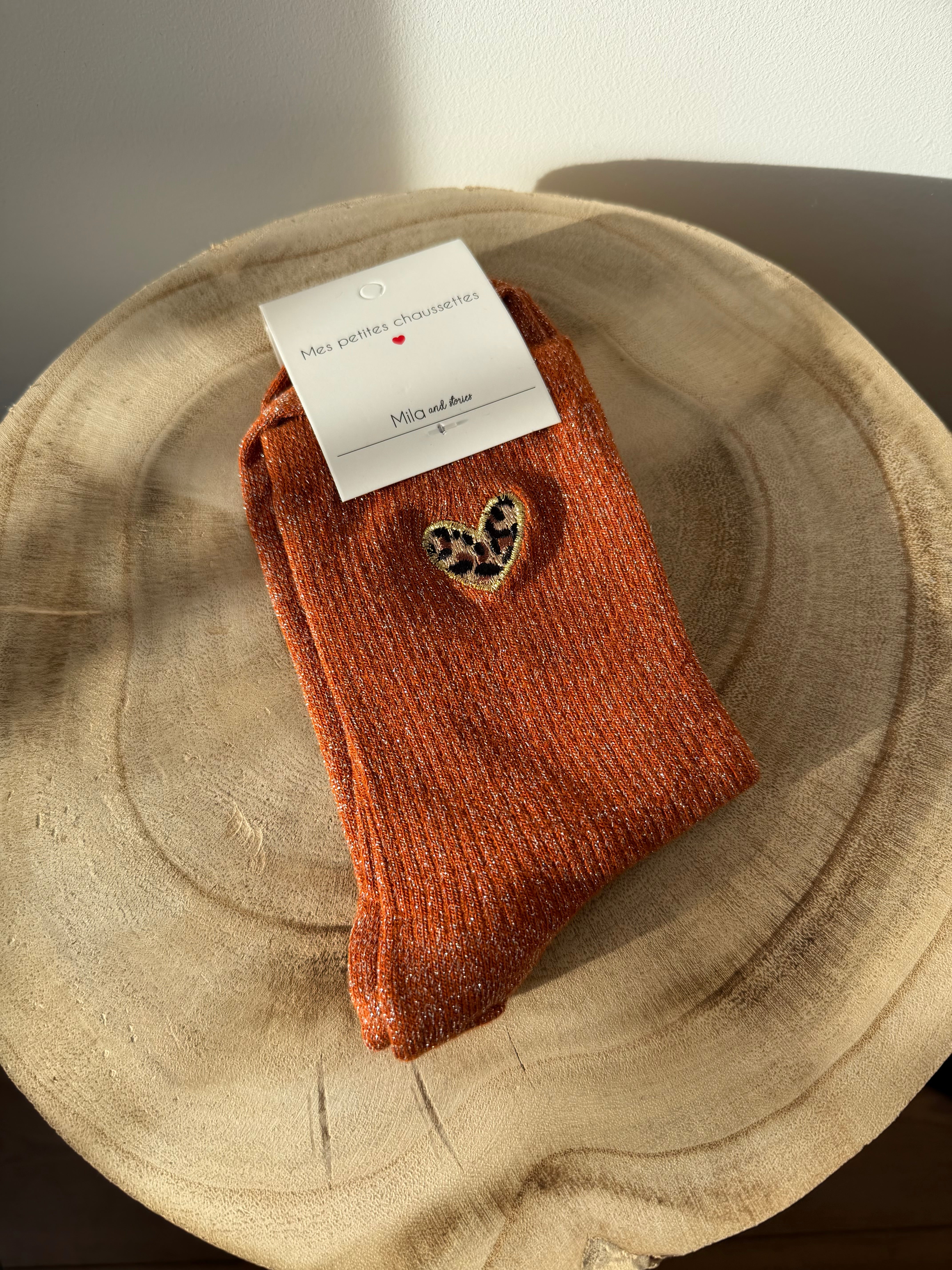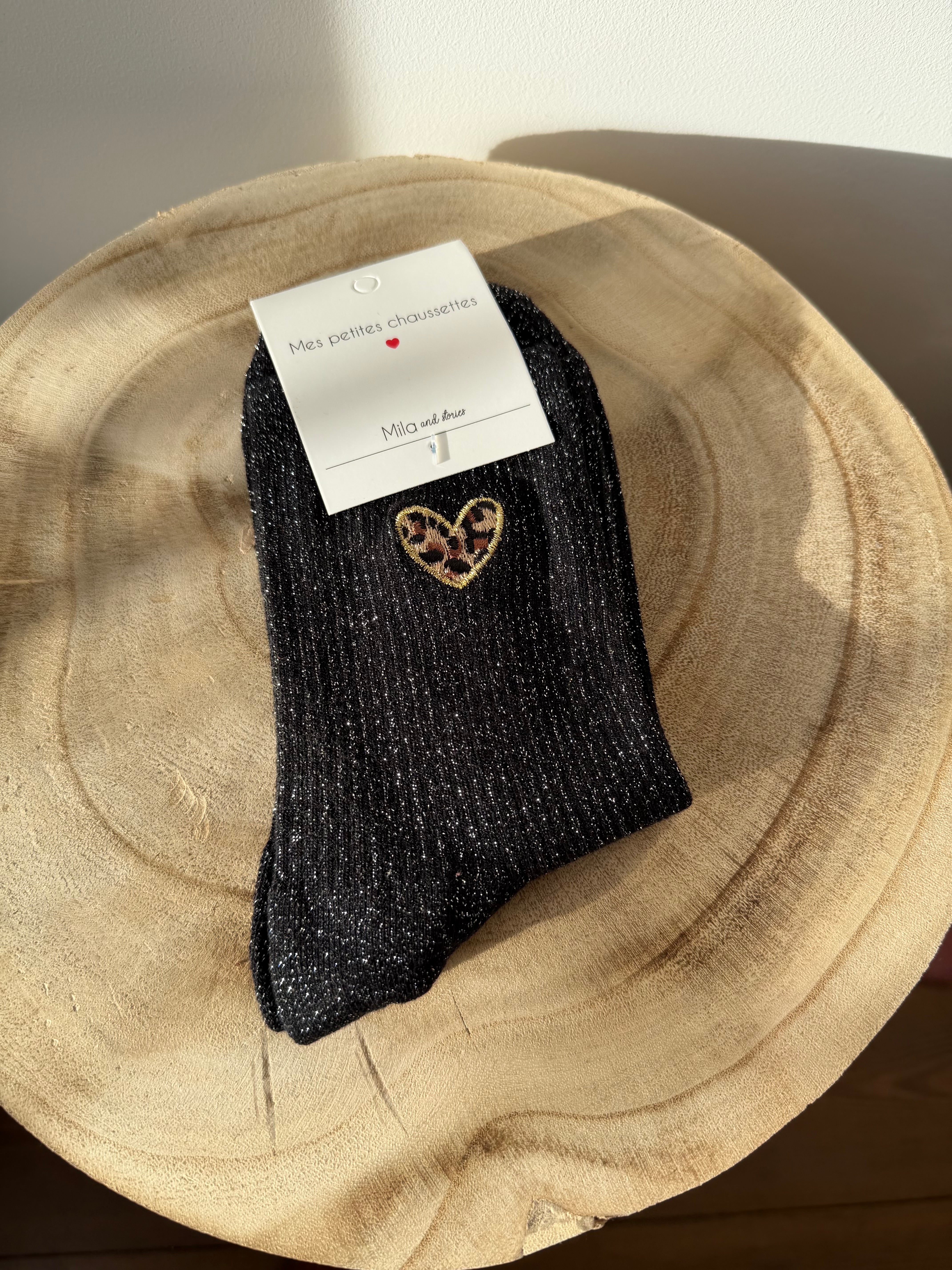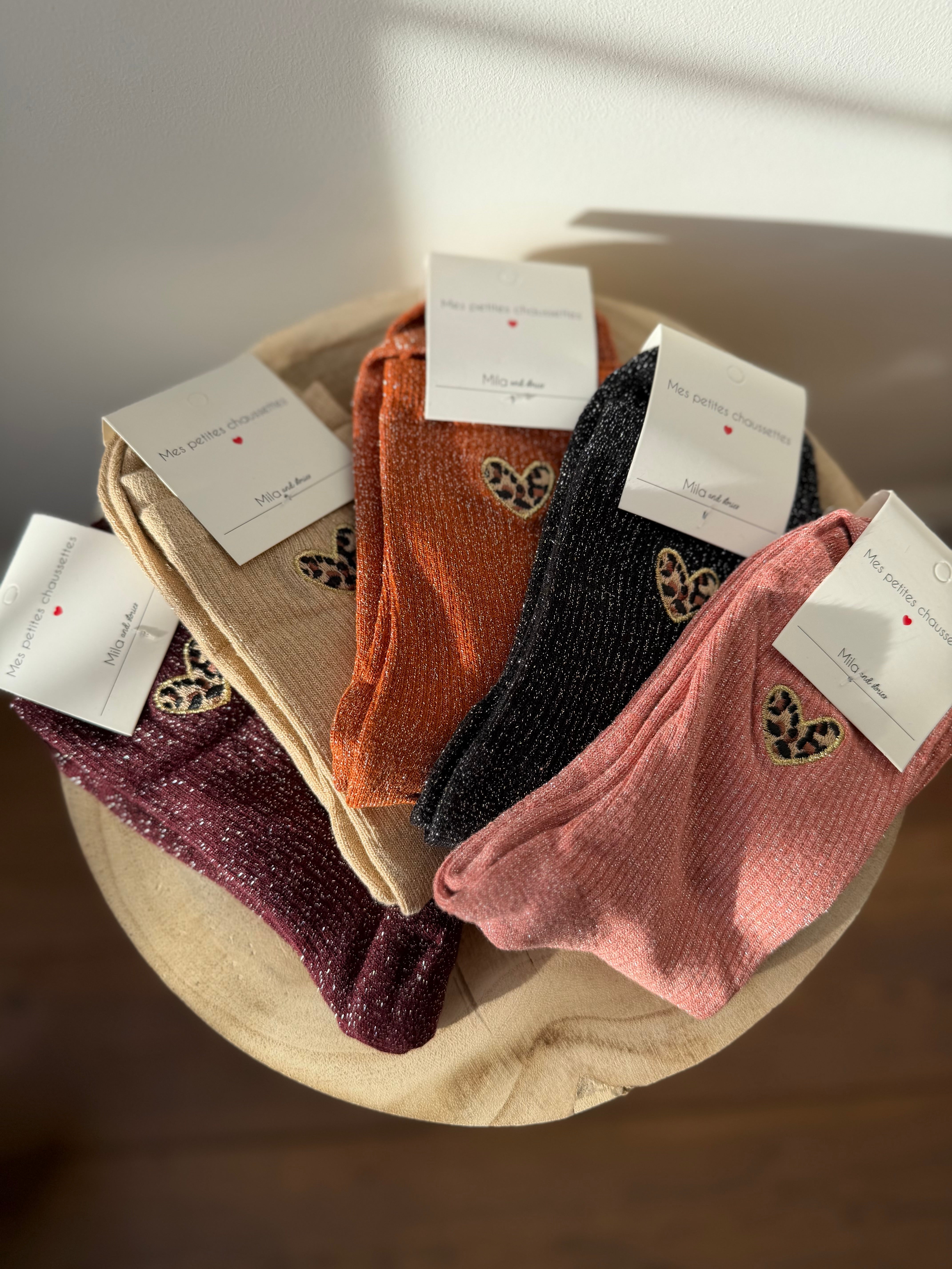 Chaussettes à paillettes disponibles en noir, bordeaux, orange, brun et gris avec un cœur léopard.